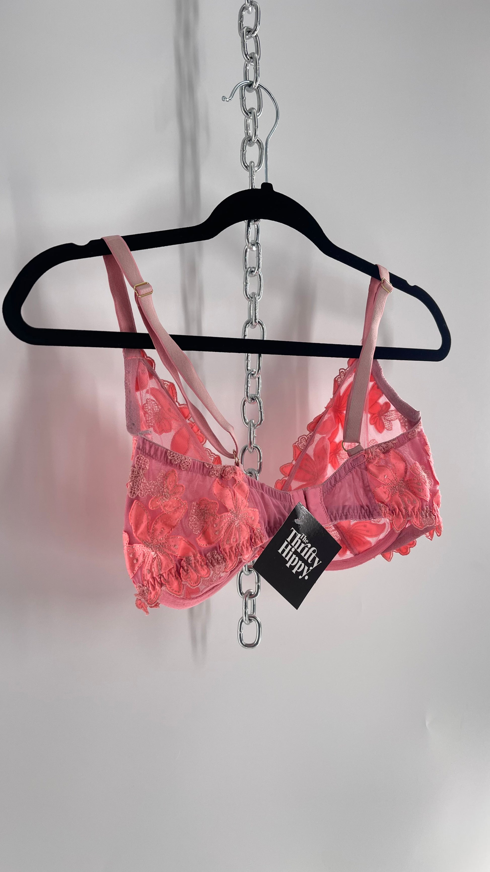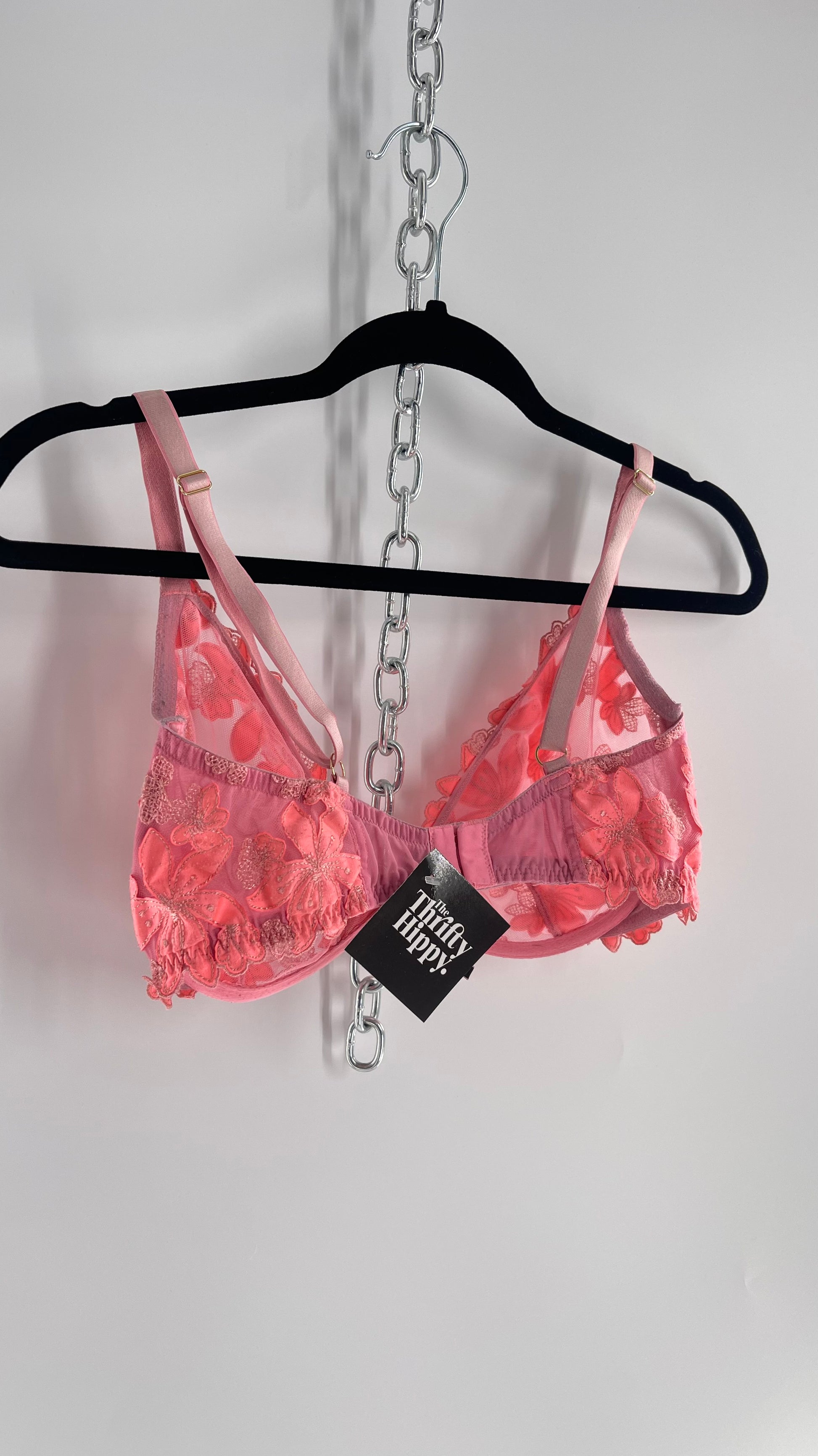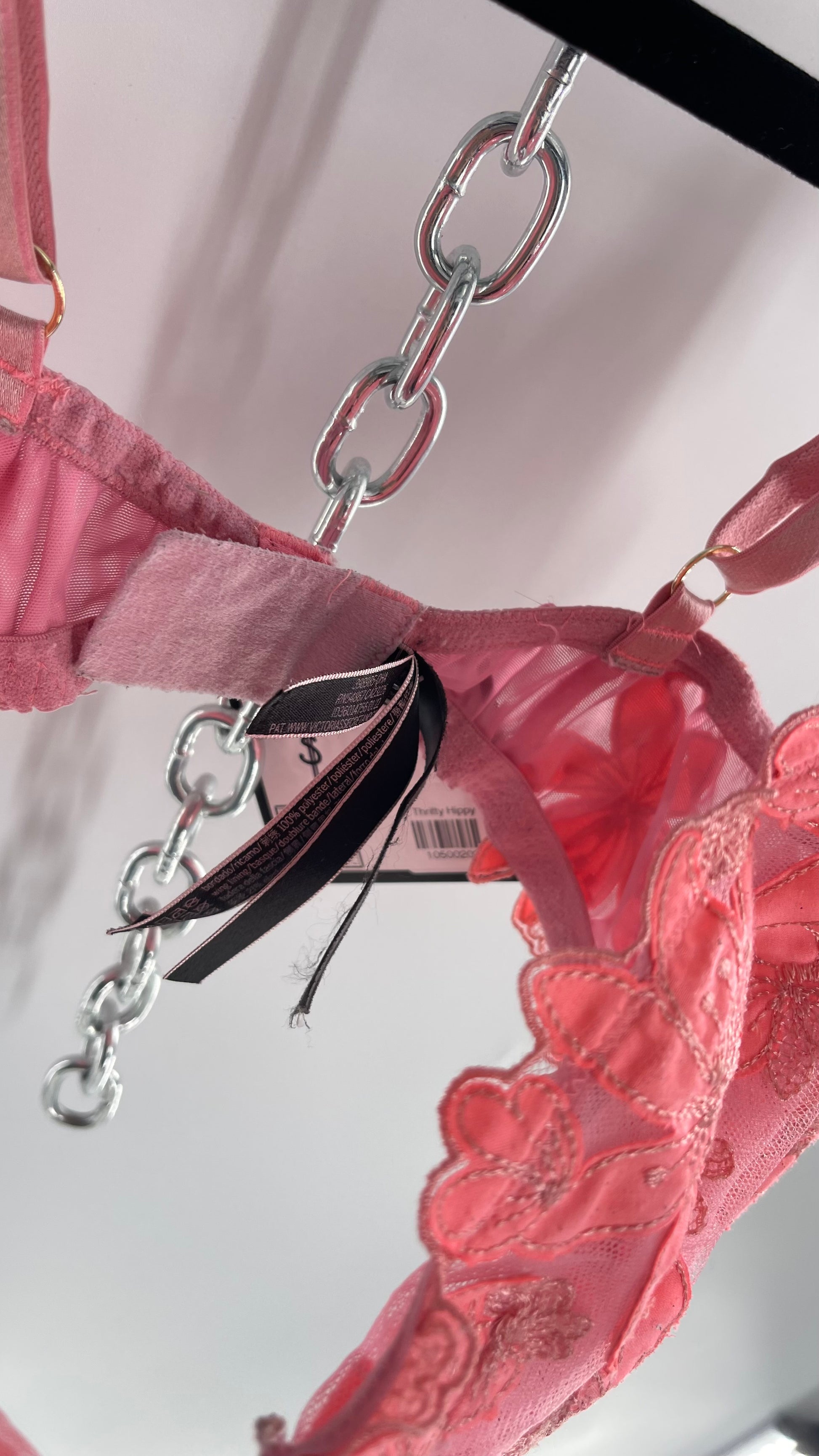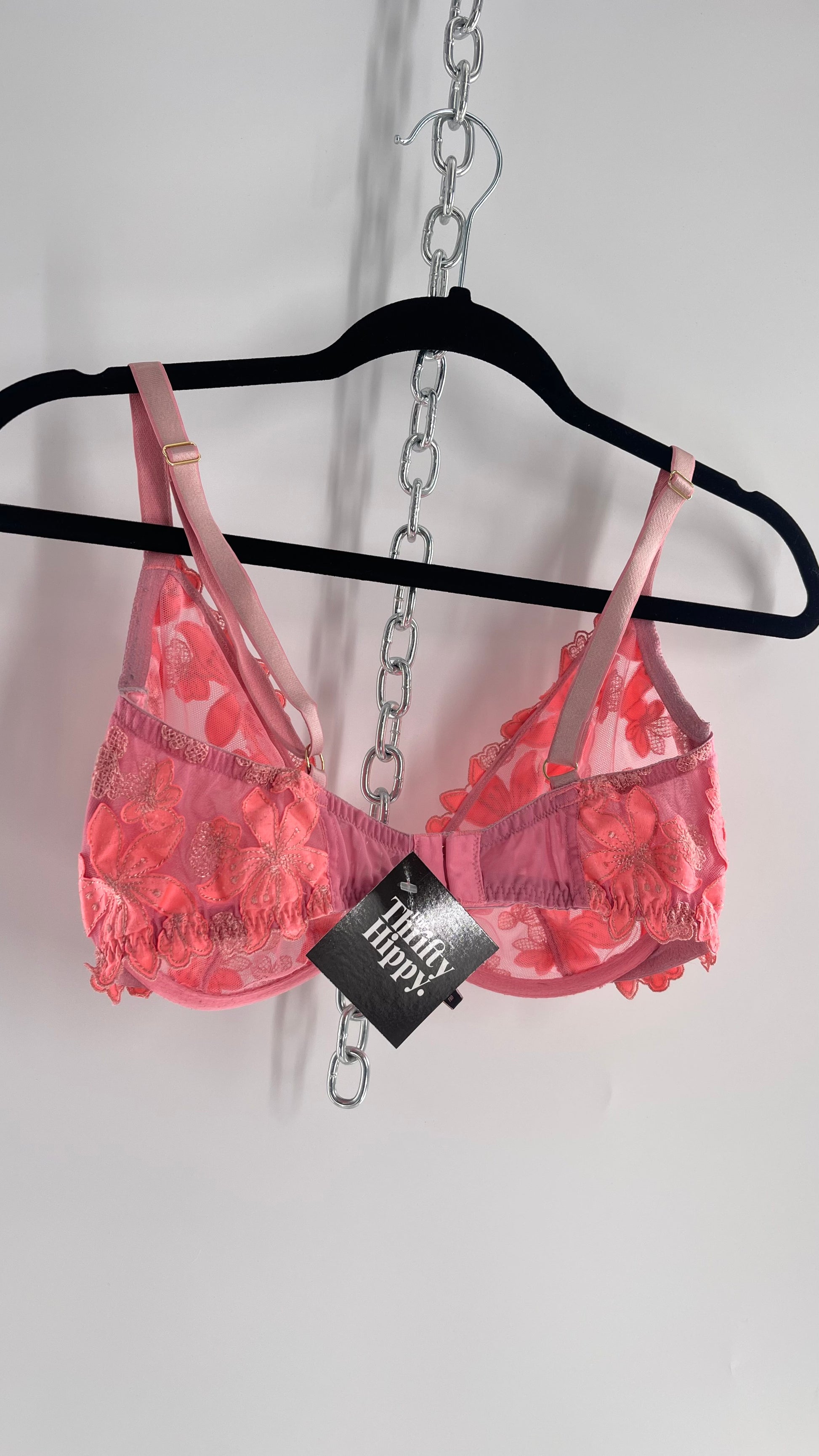 Vintage Victorias Secret Neon Pink Mesh Bra with Floral Appliqués (36DDD)