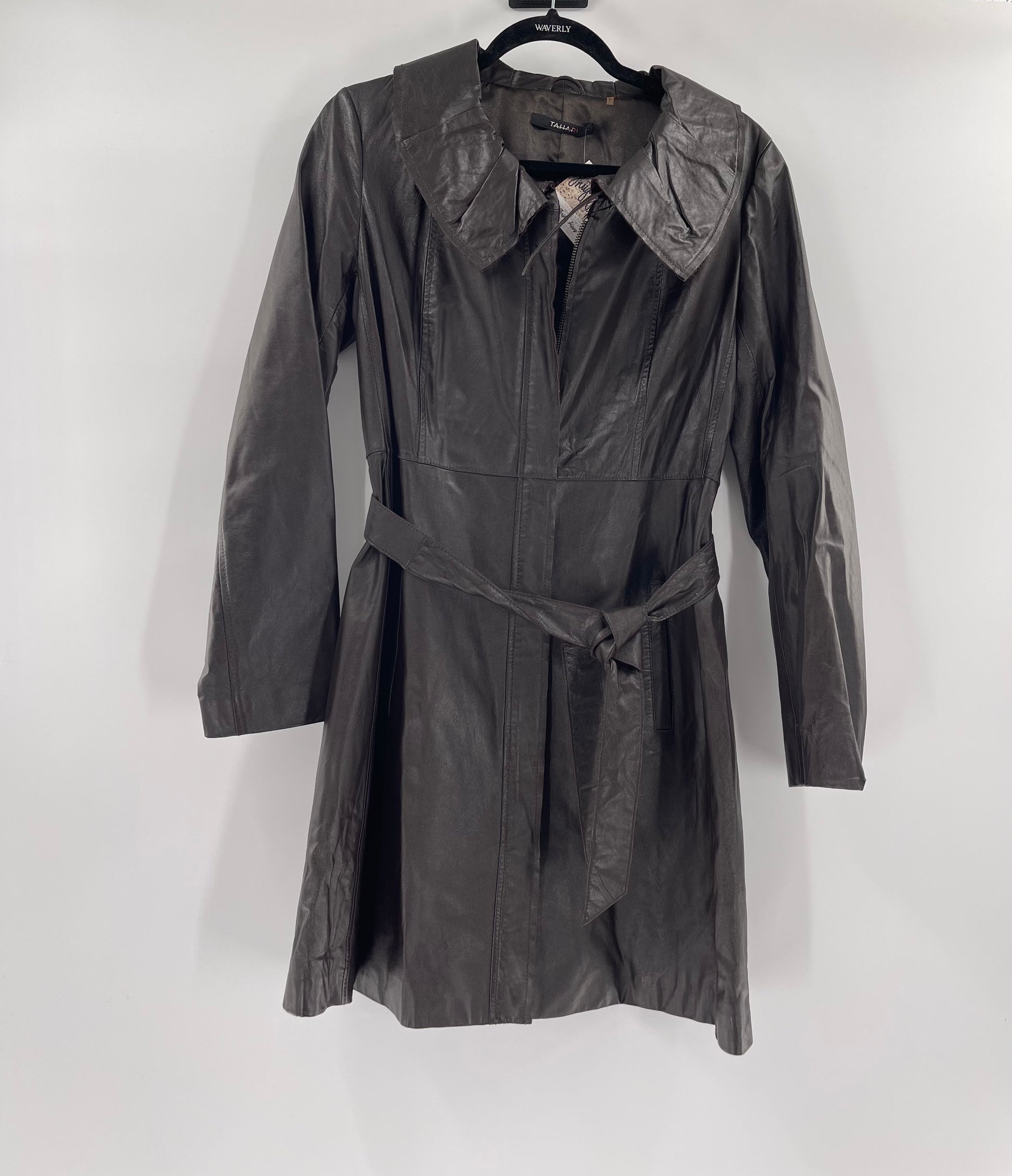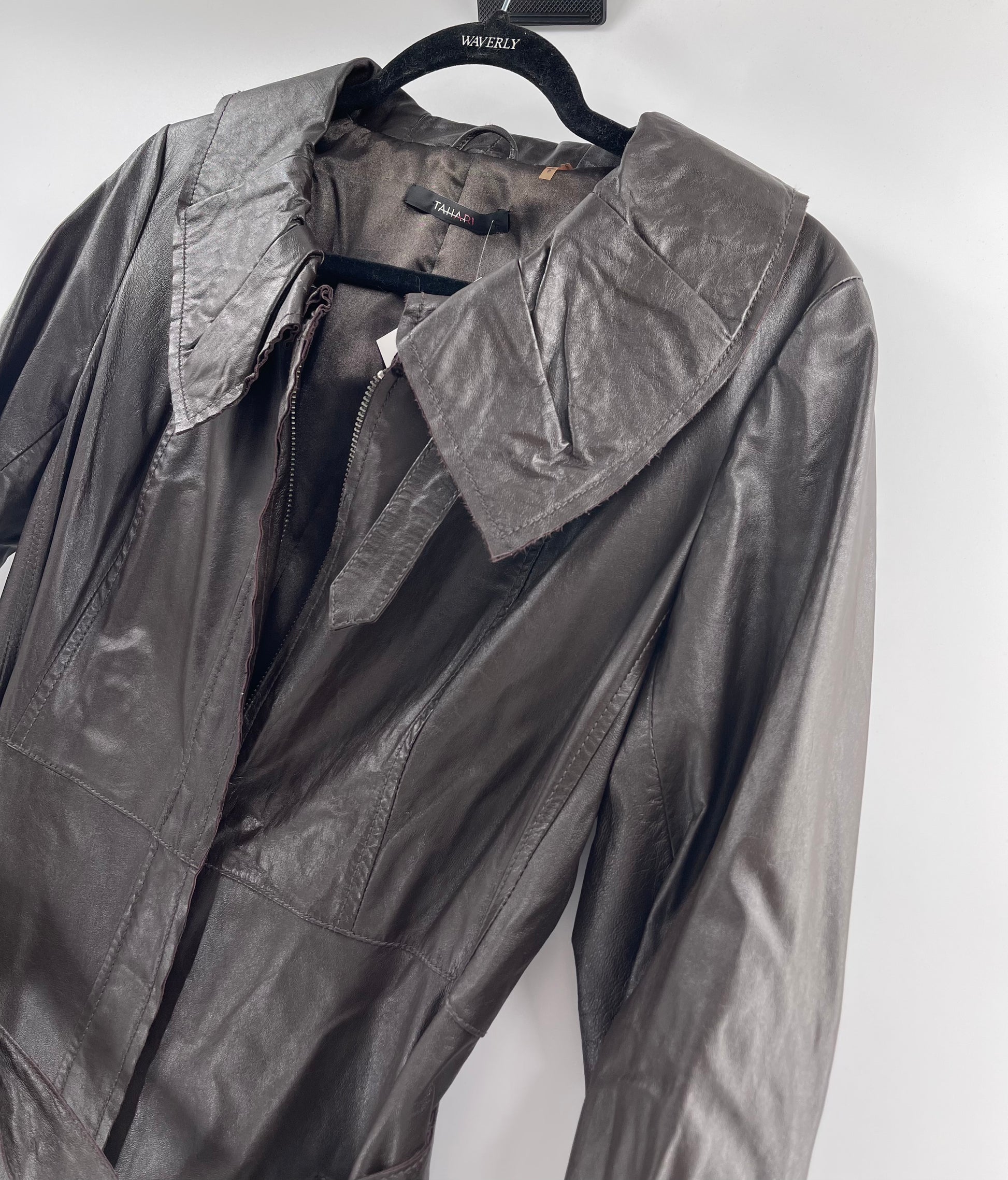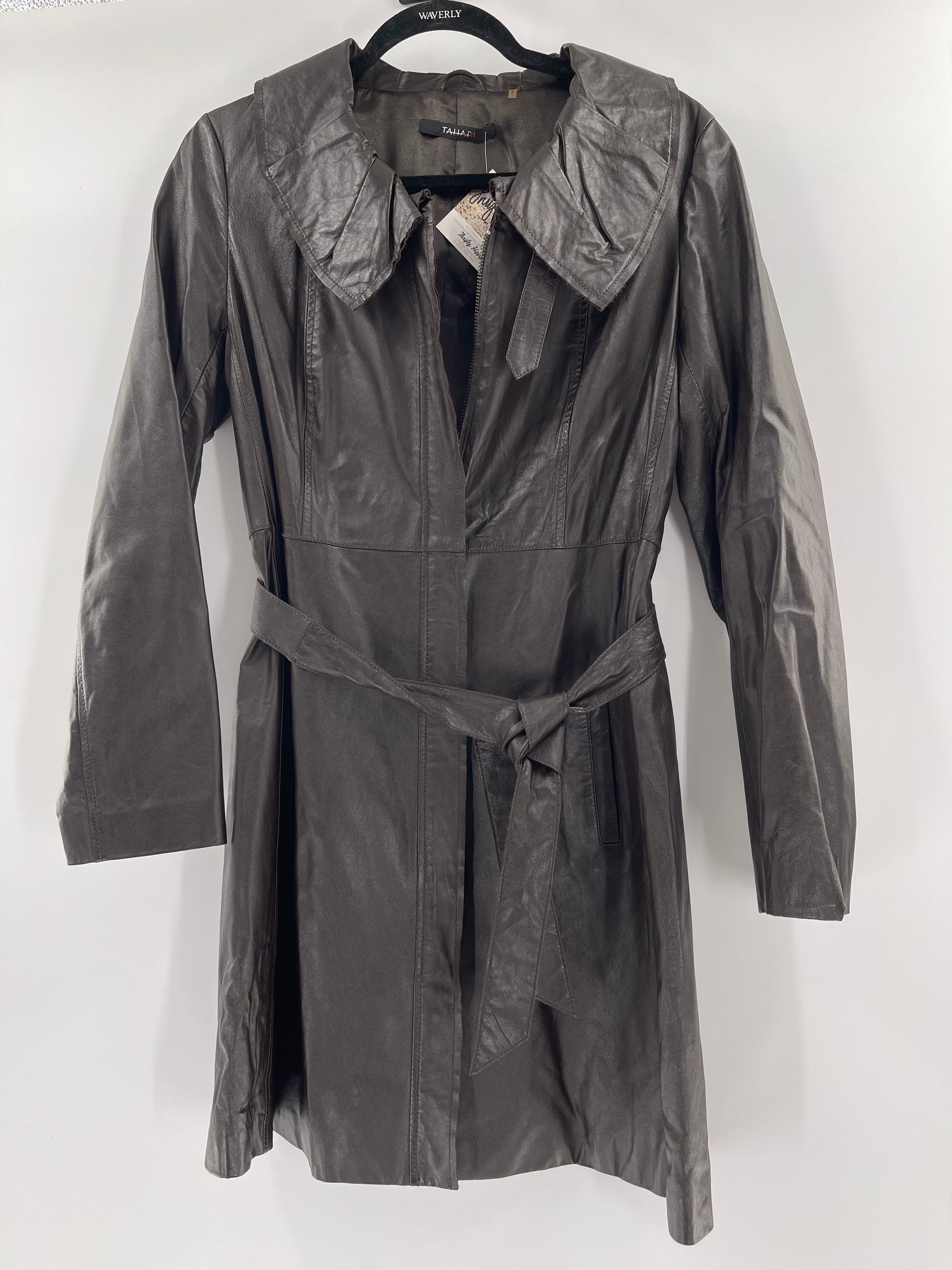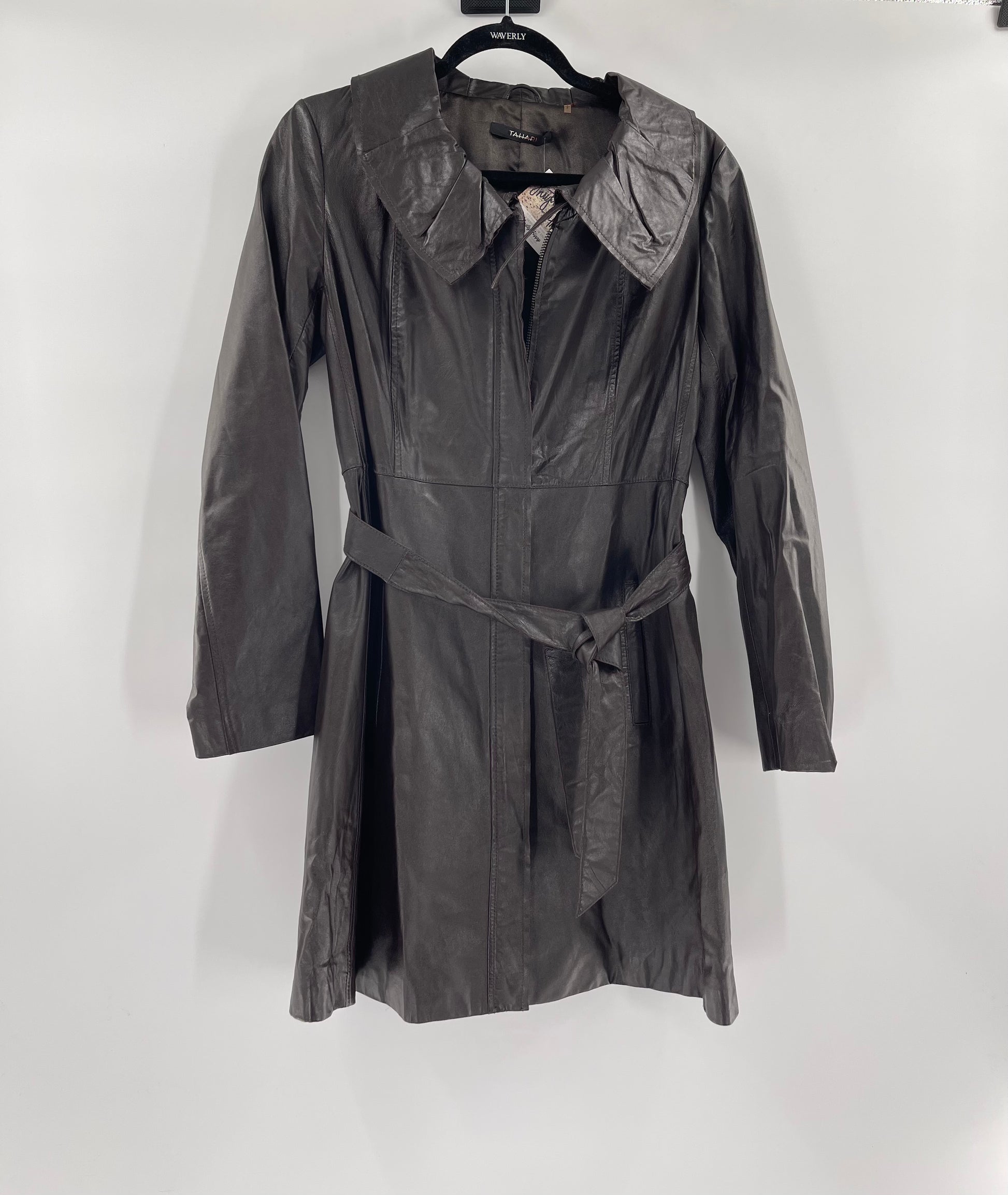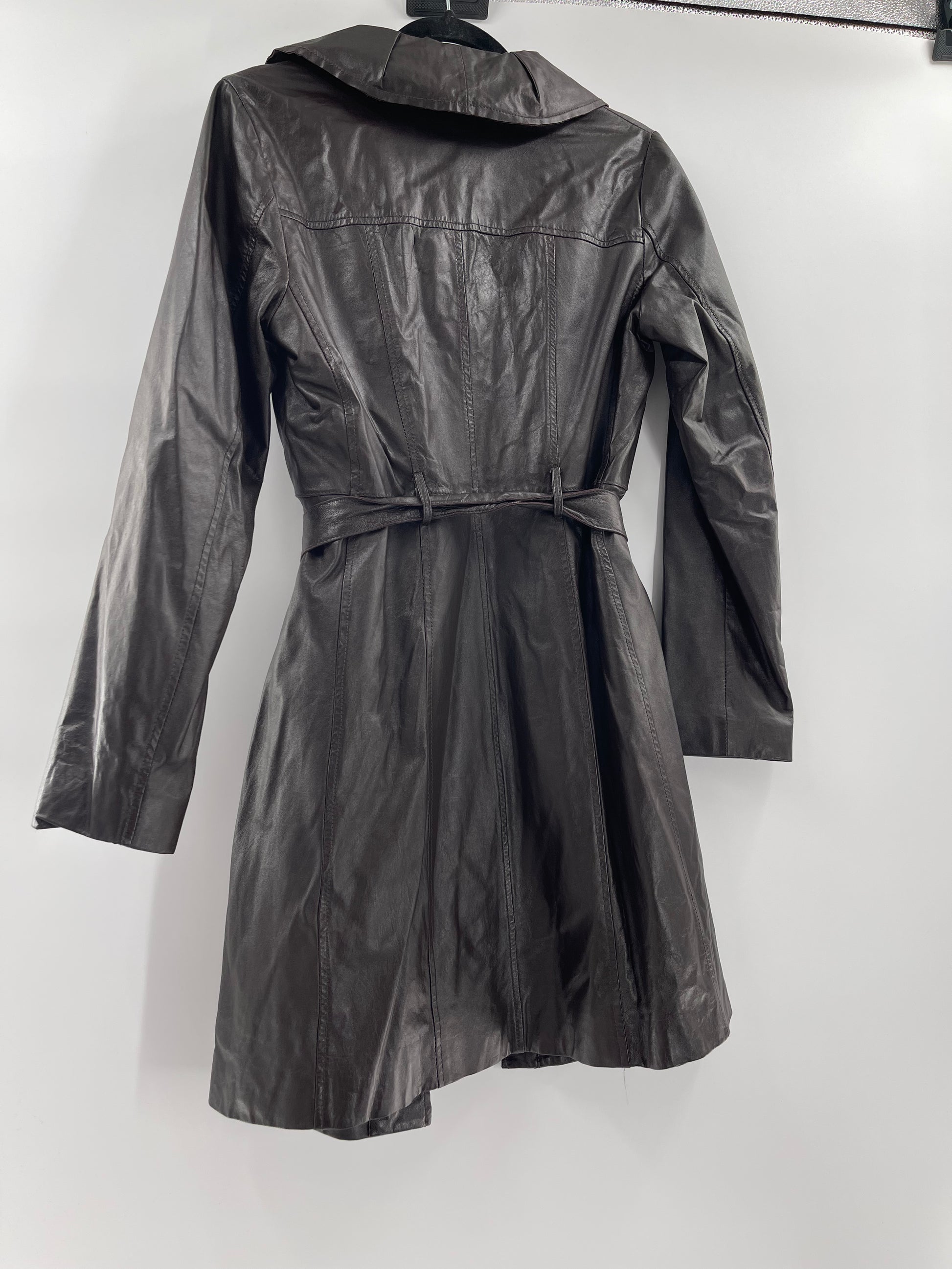 Tahari Dark Brown 100% Lamb Leather Trench Coat With Pleated Collar Front Zipper and Belt (Size Small)