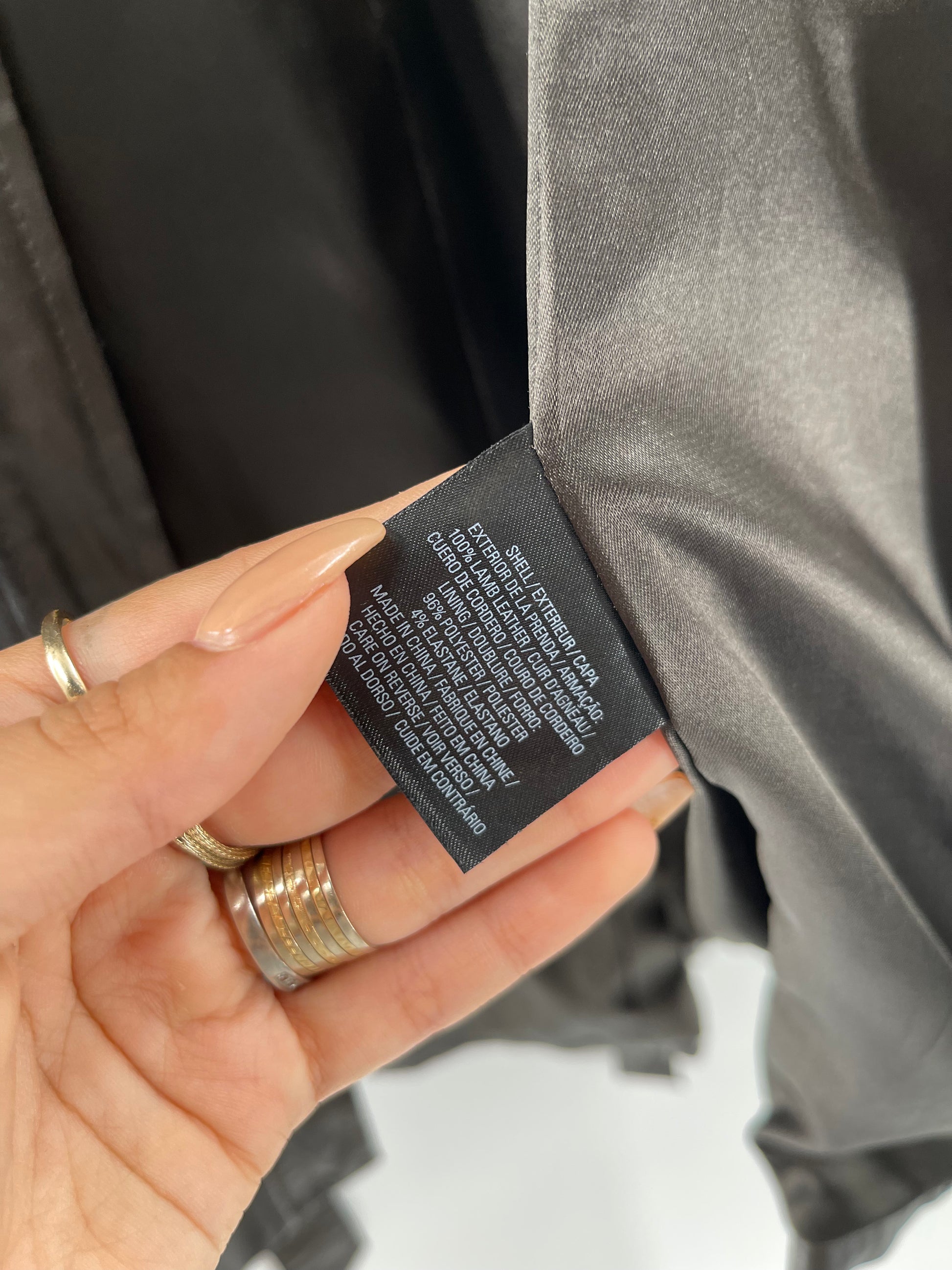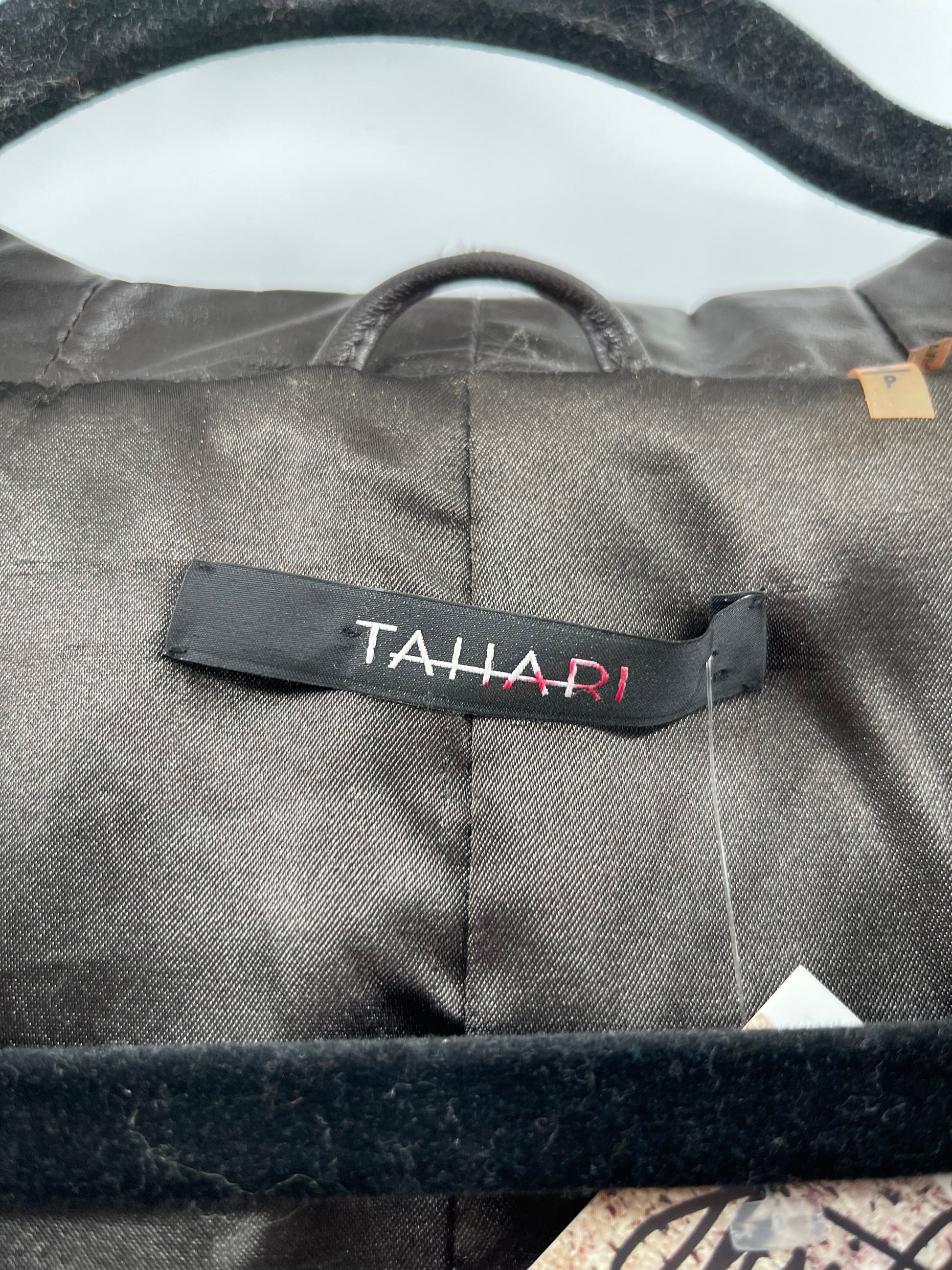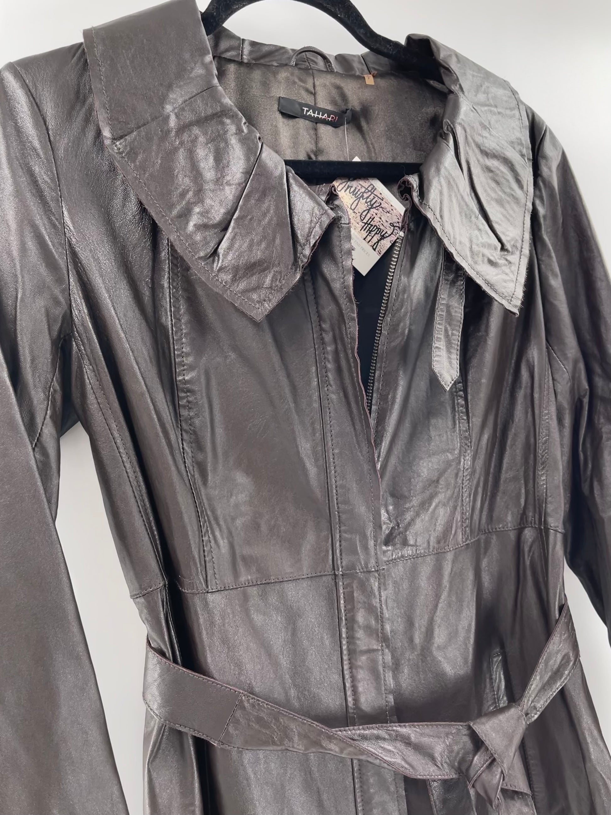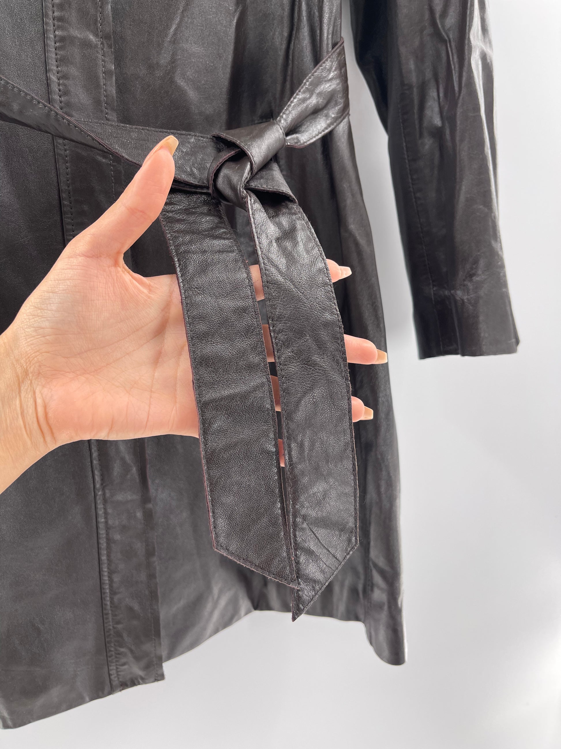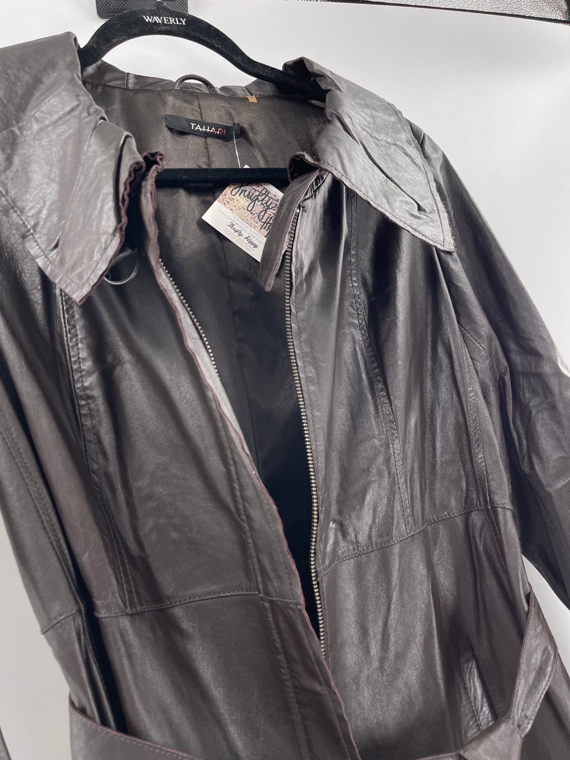 Tahari Dark Brown 100% Lamb Leather Trench Coat With Pleated Collar Front Zipper and Belt (Size Small)