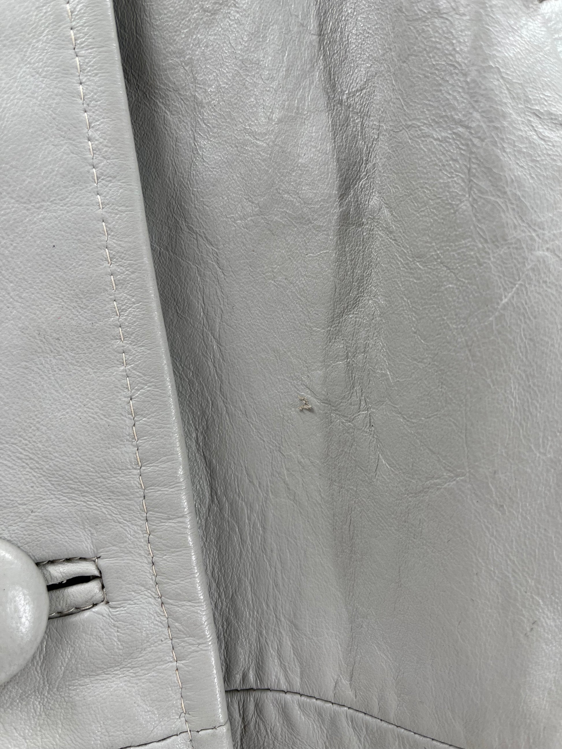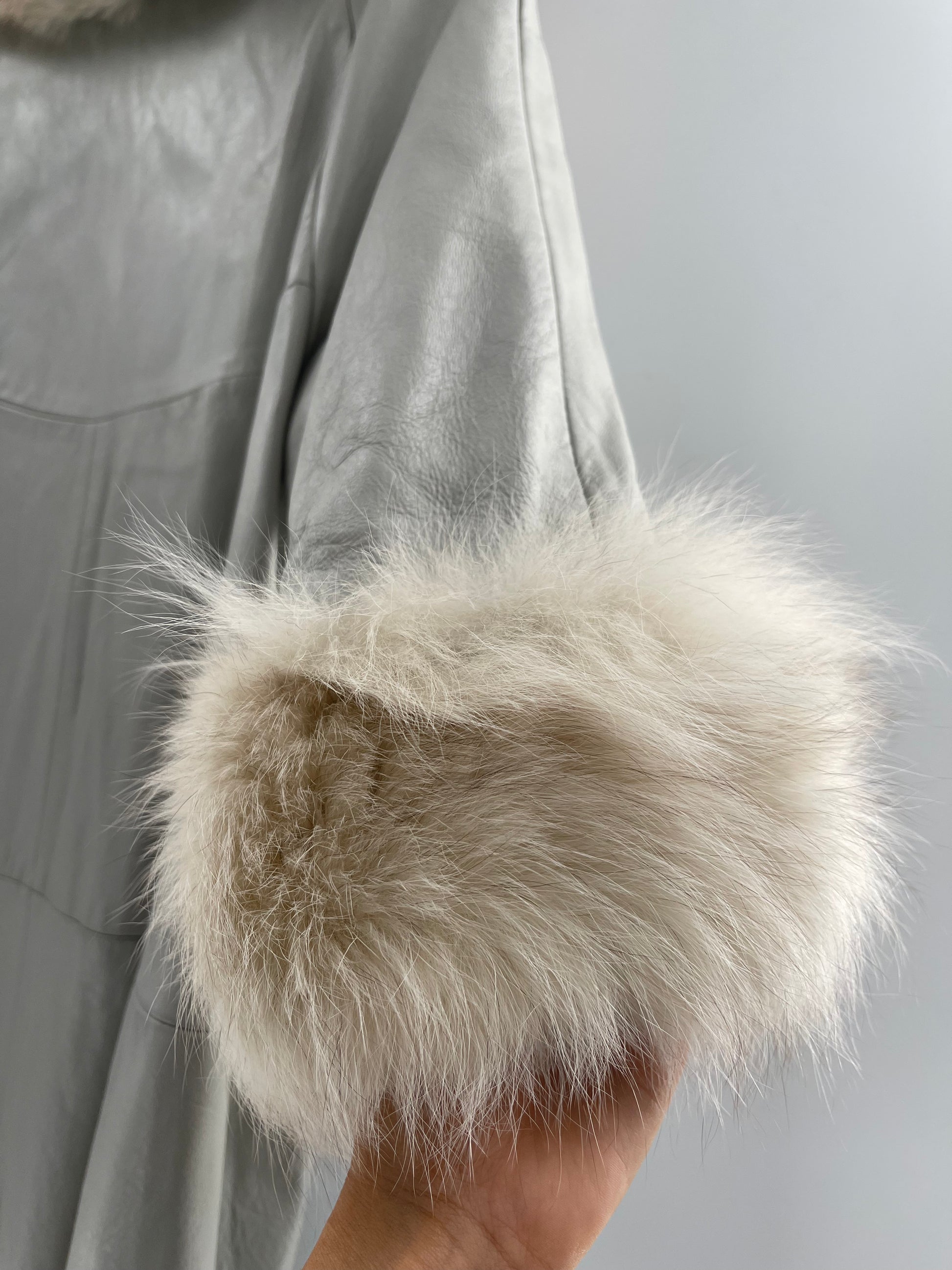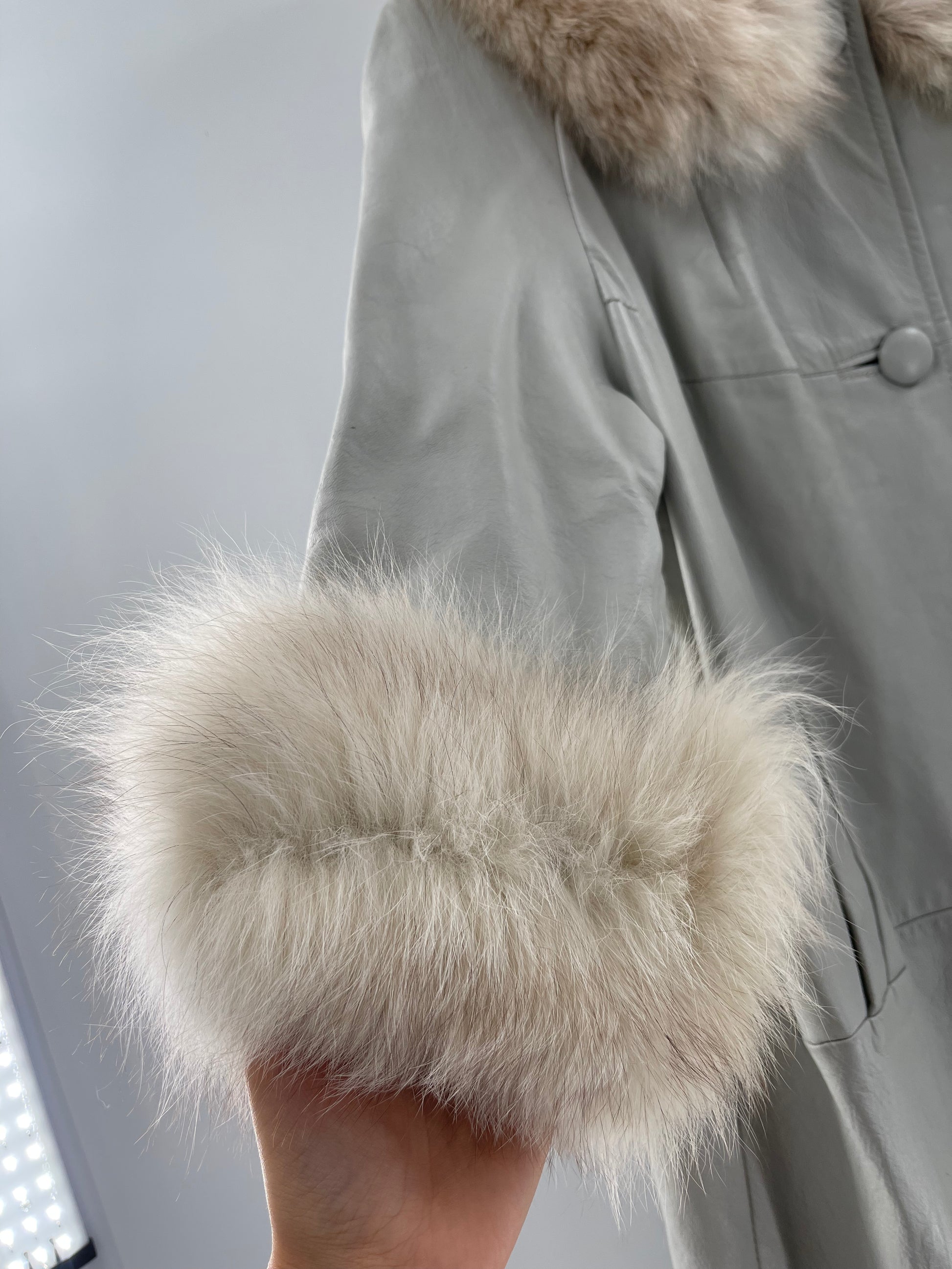 Light Gray 100% Leather Coat With Real Fur Collar and Cuffs Trim (Size 16) VINTAGE