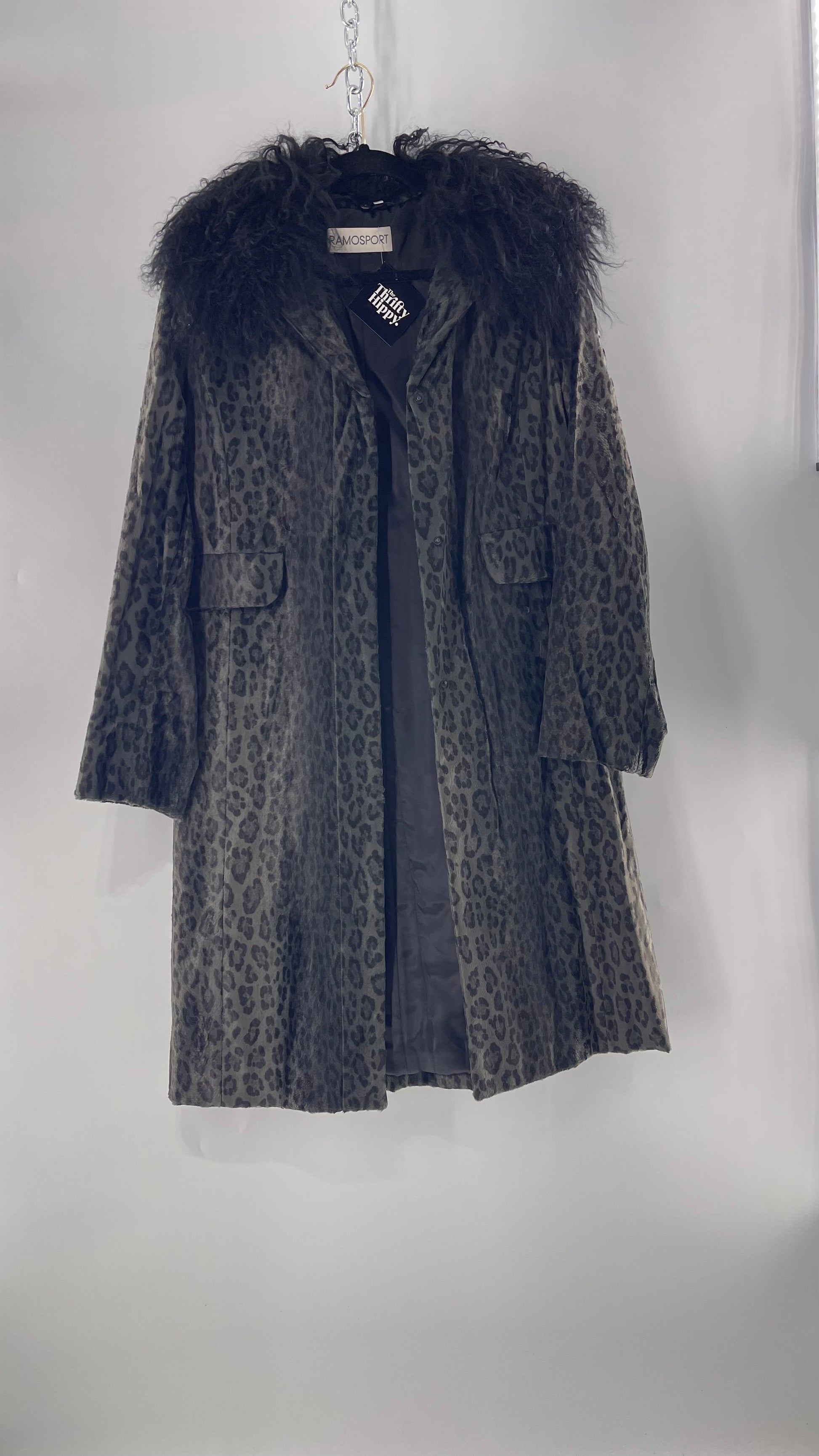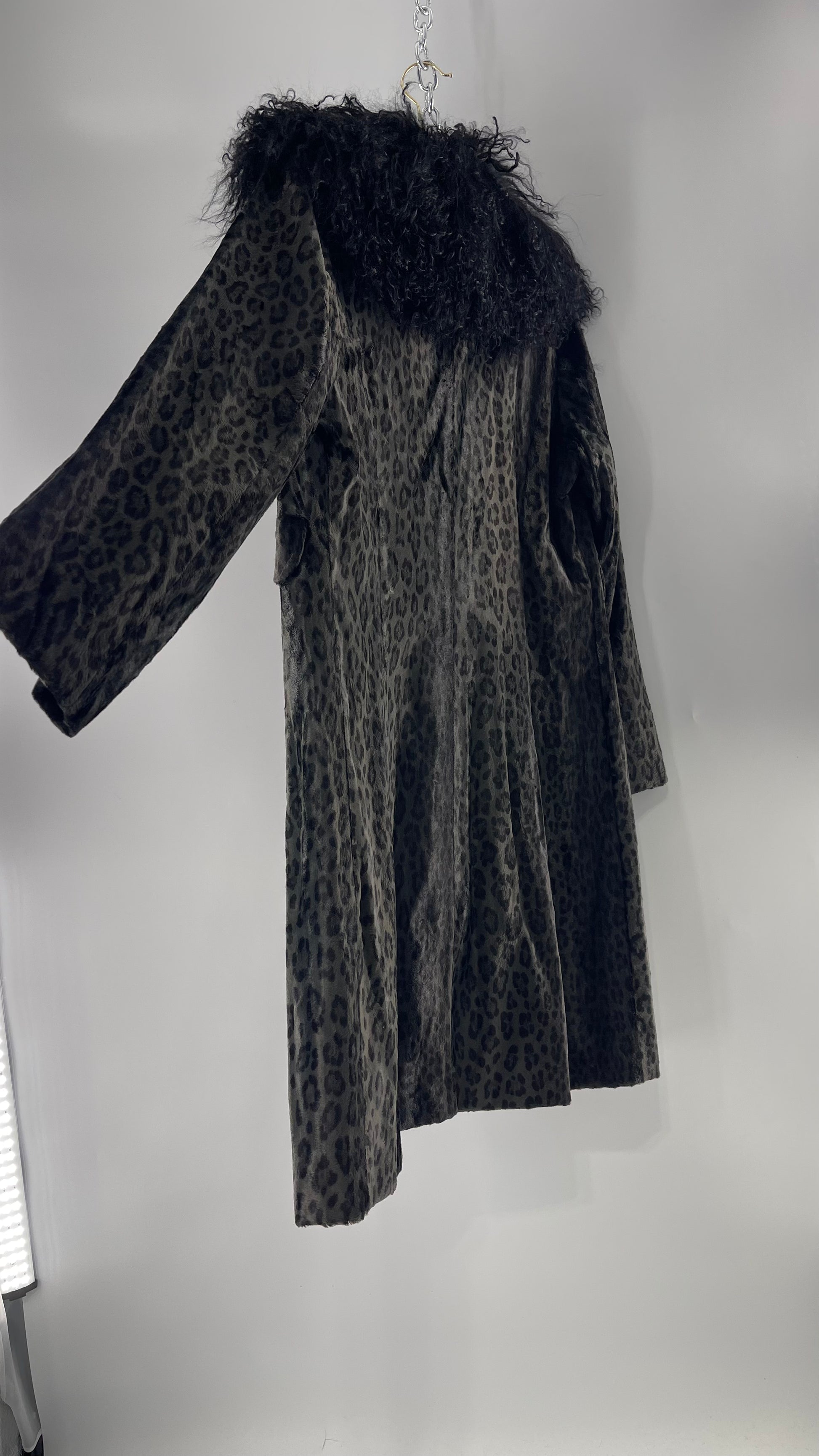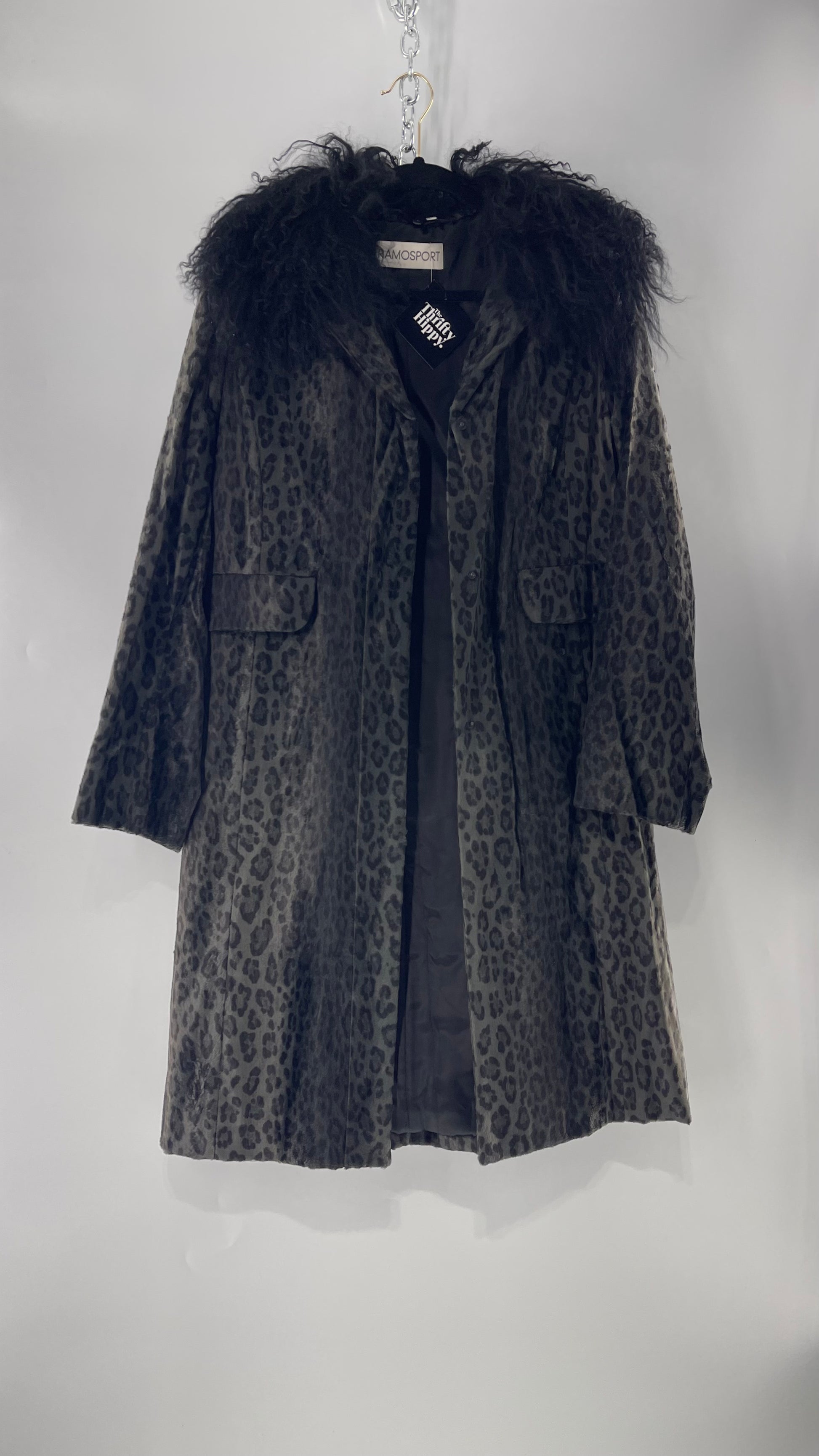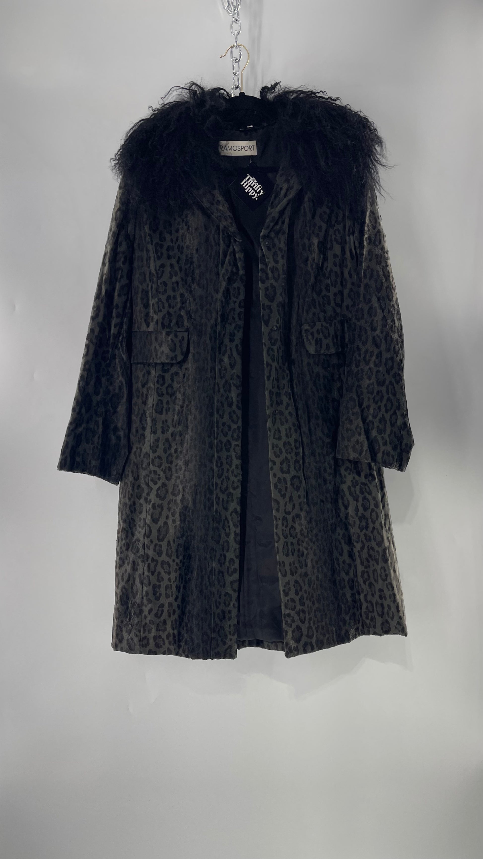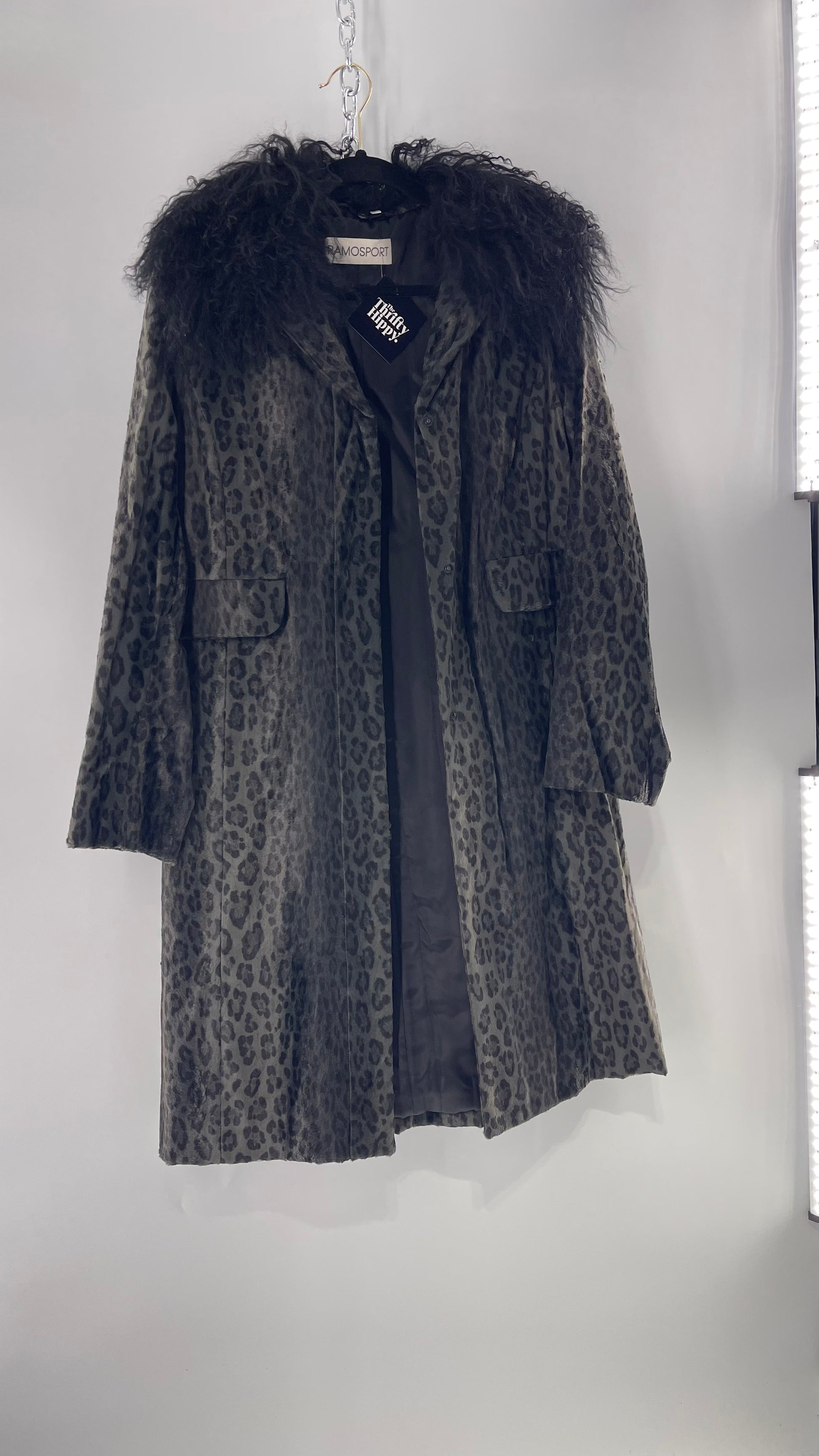 Vintage Romanian RAMOSTEPH Black/Gray Leopard Print Coat with Mongolian Fur Collar (Medium)