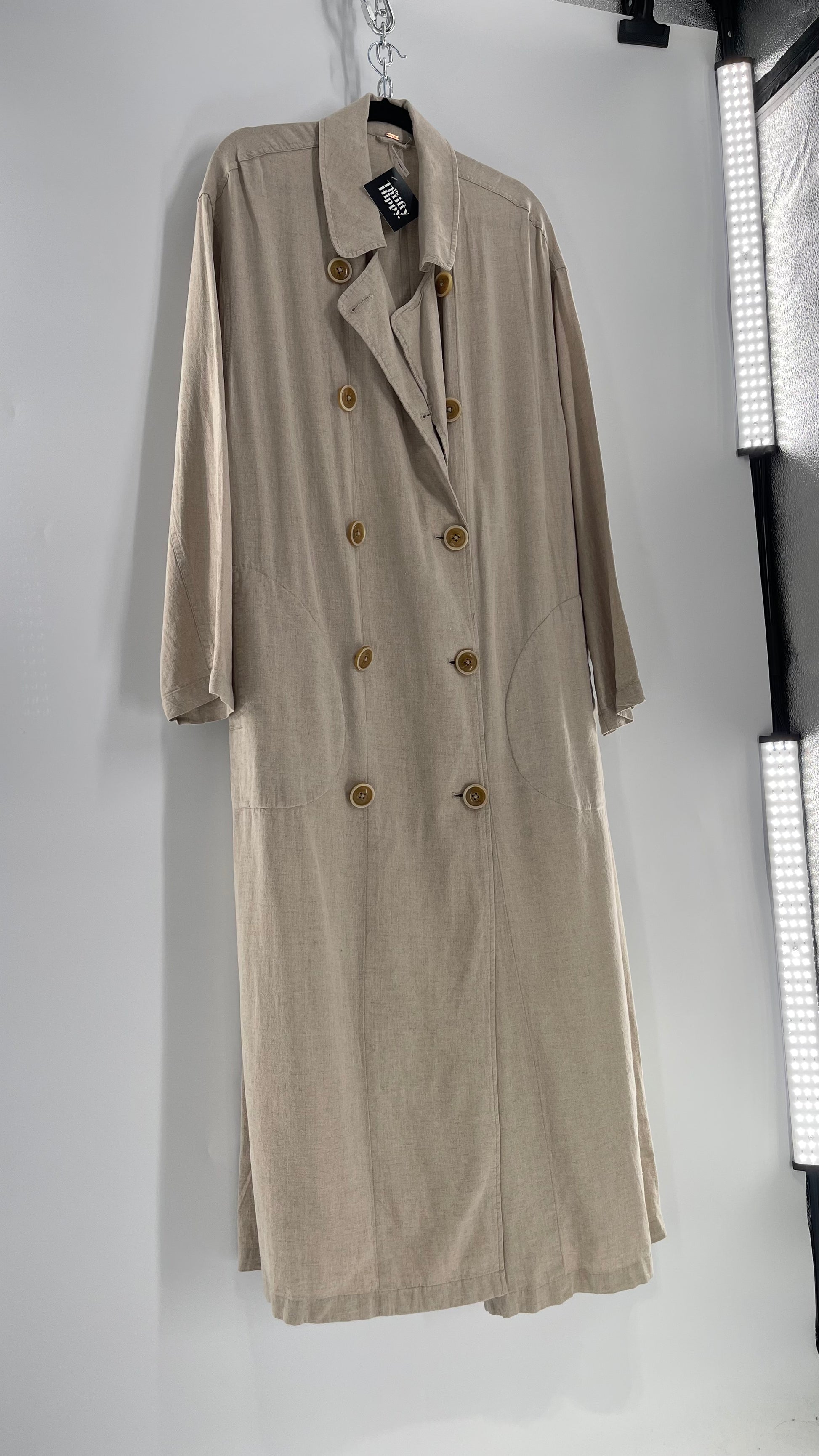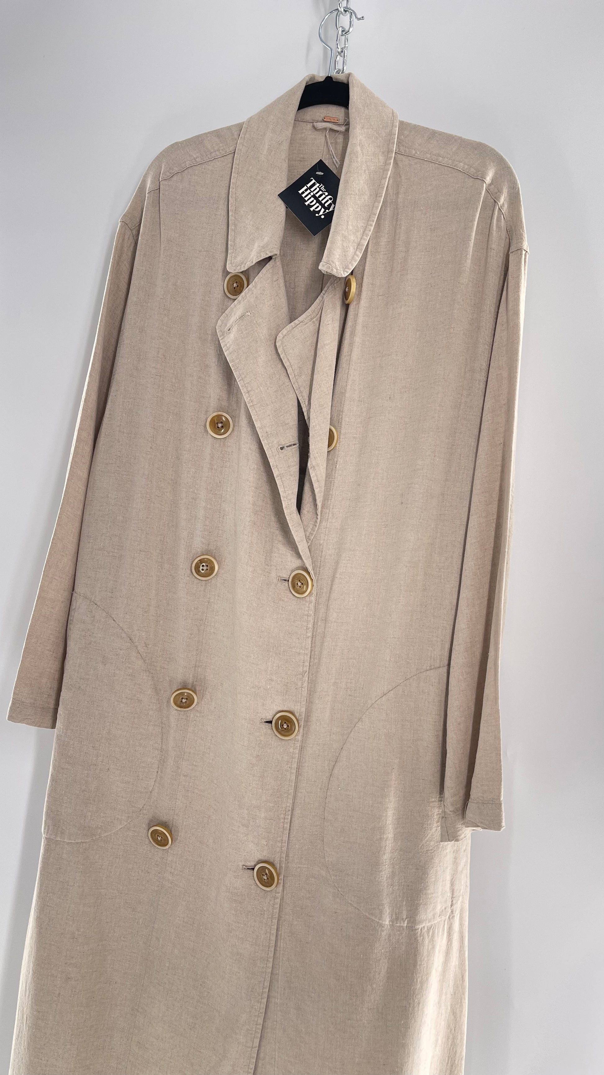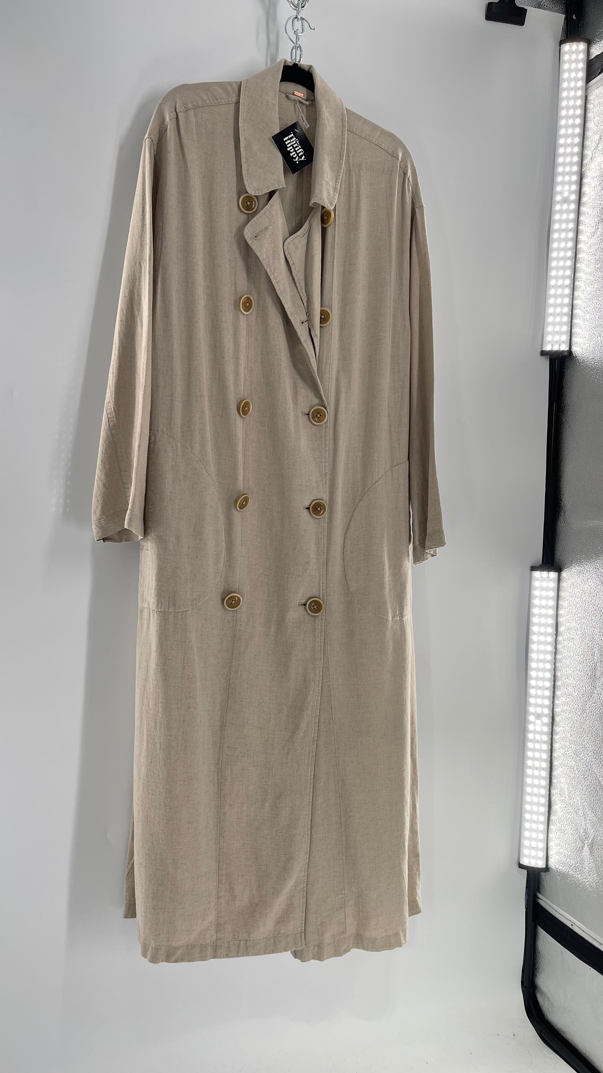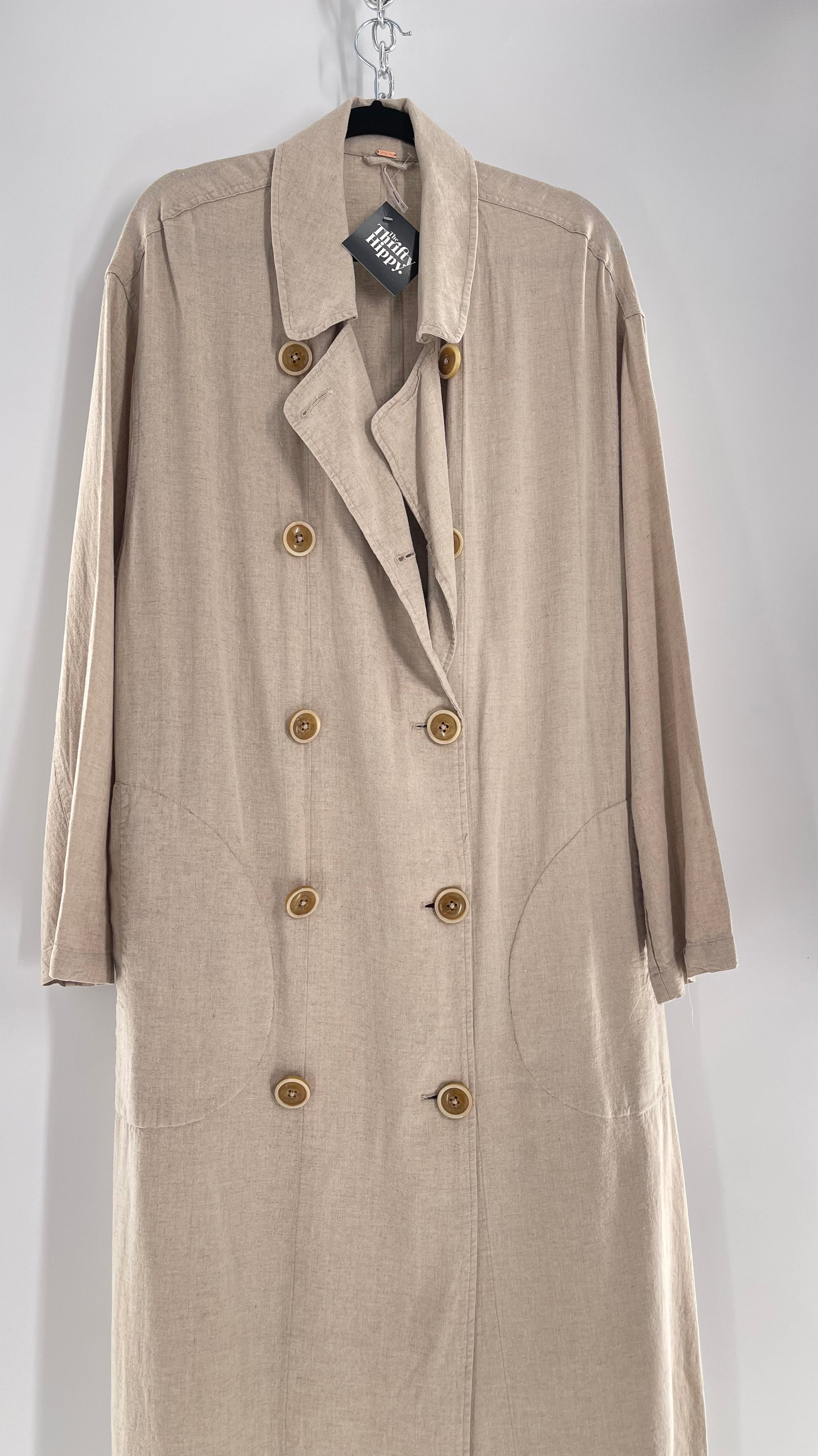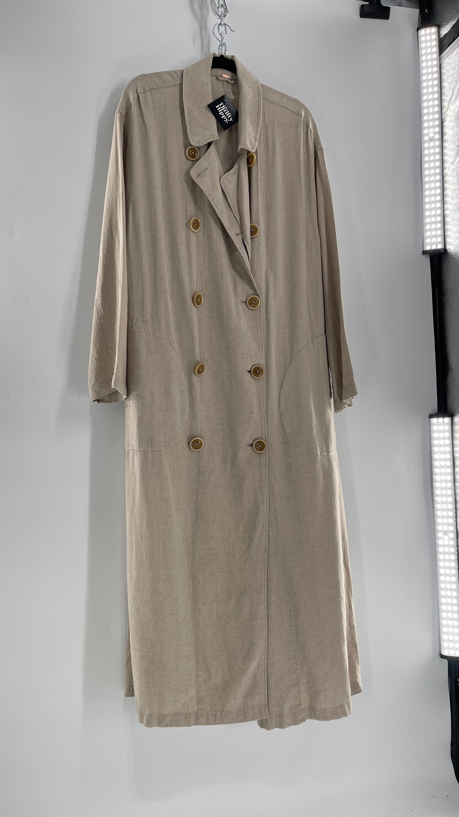 Free People Double Breasted Beige Linen Trench Coat with Brown Buttons and Tags Attached