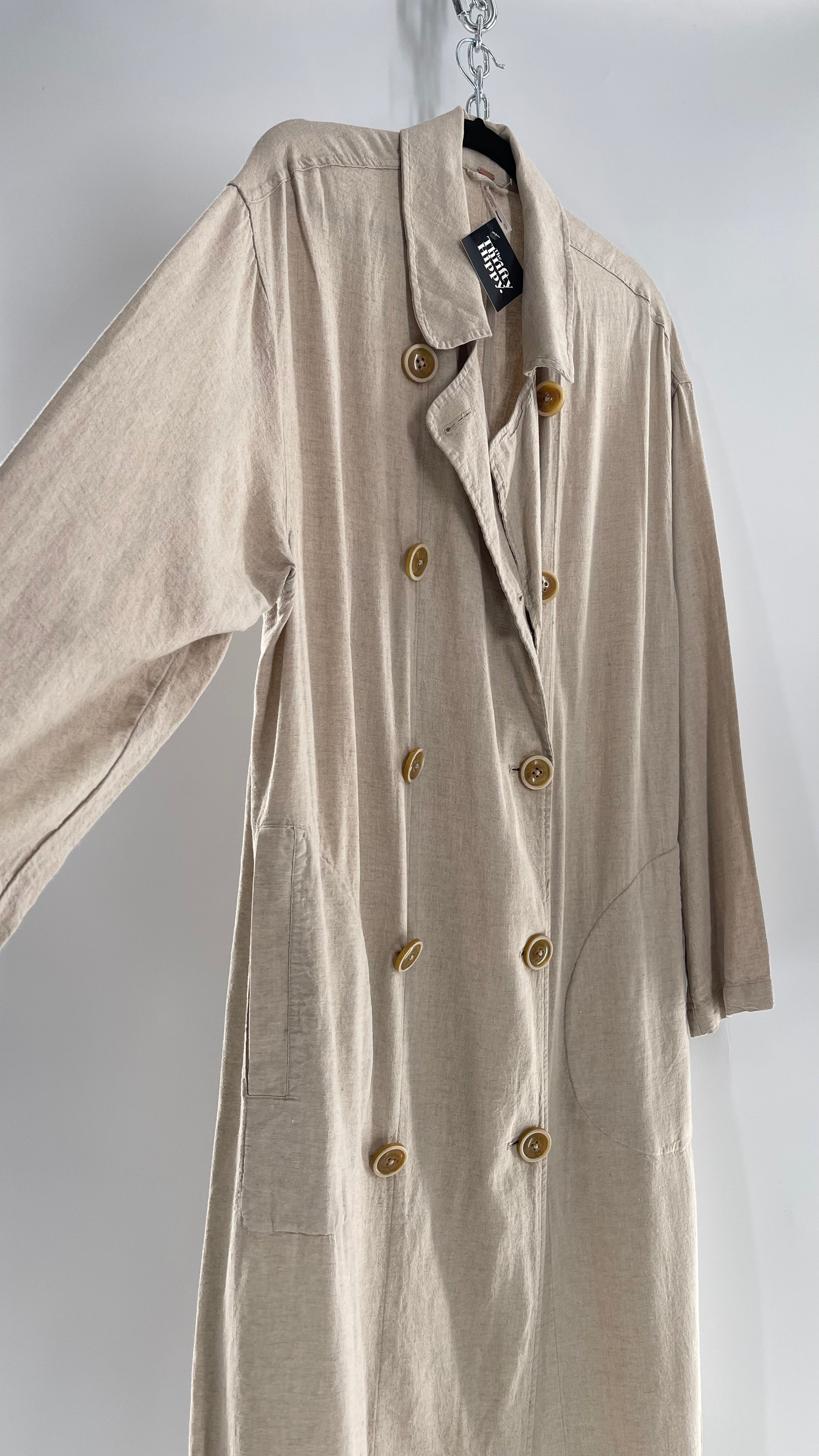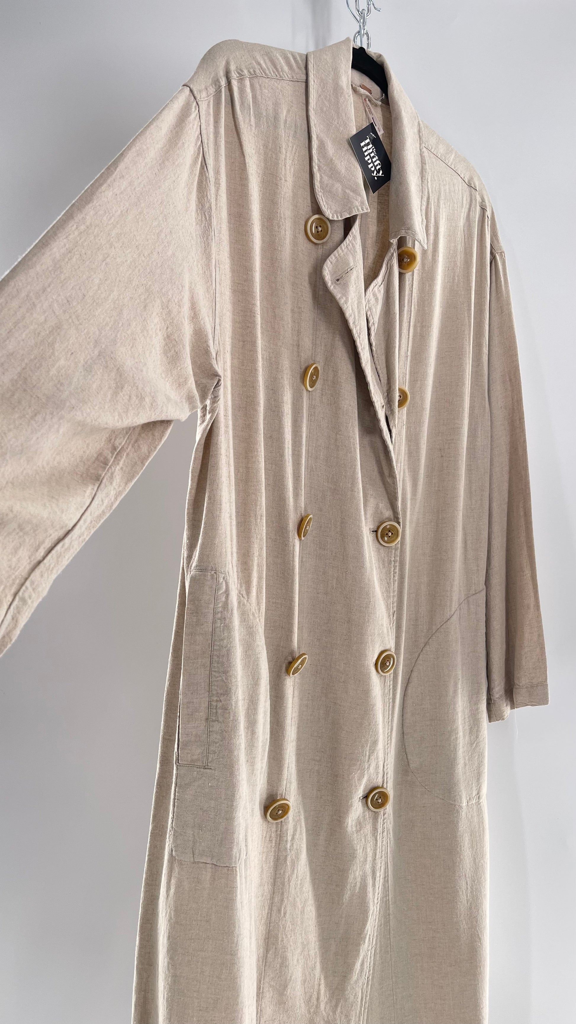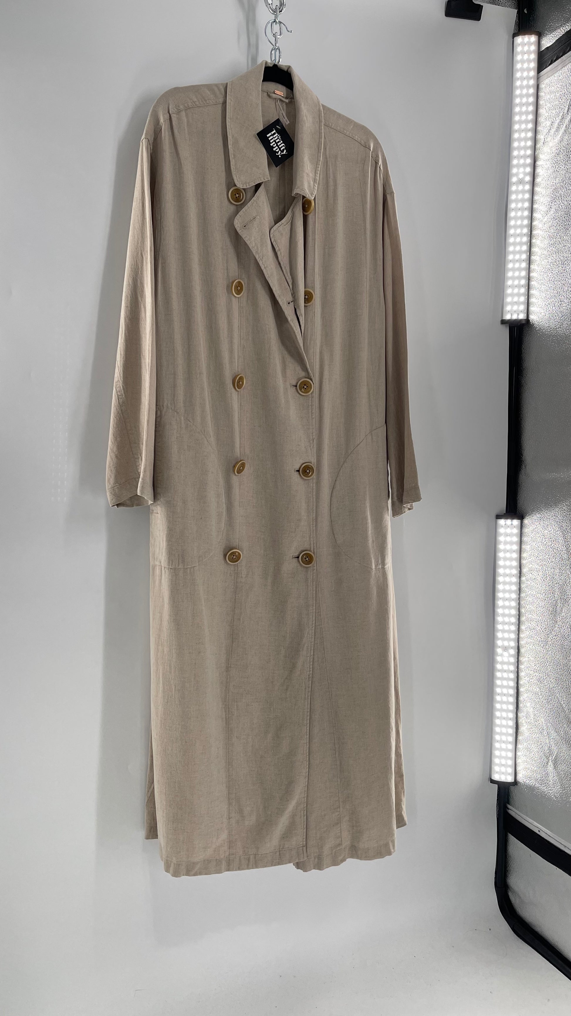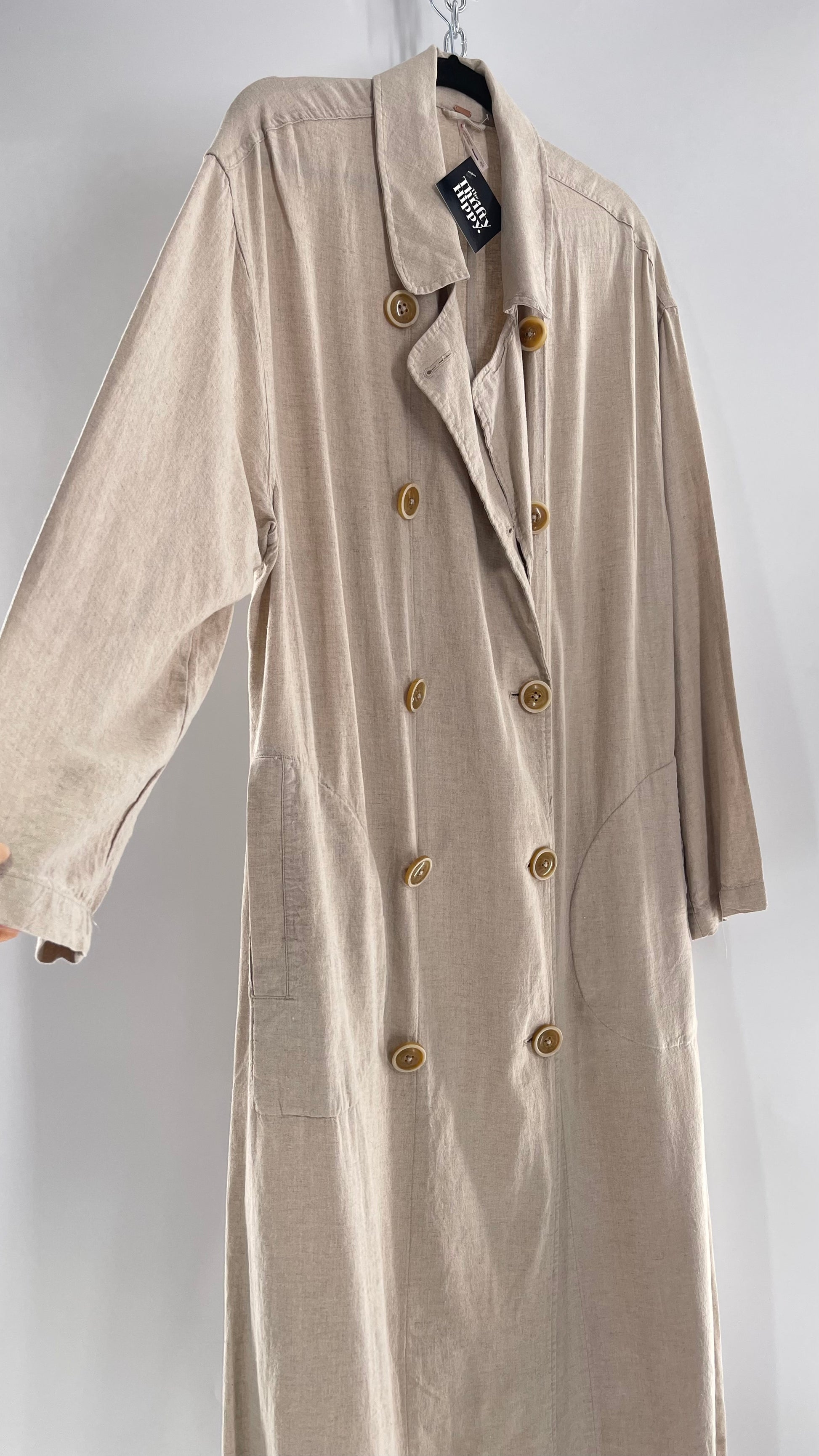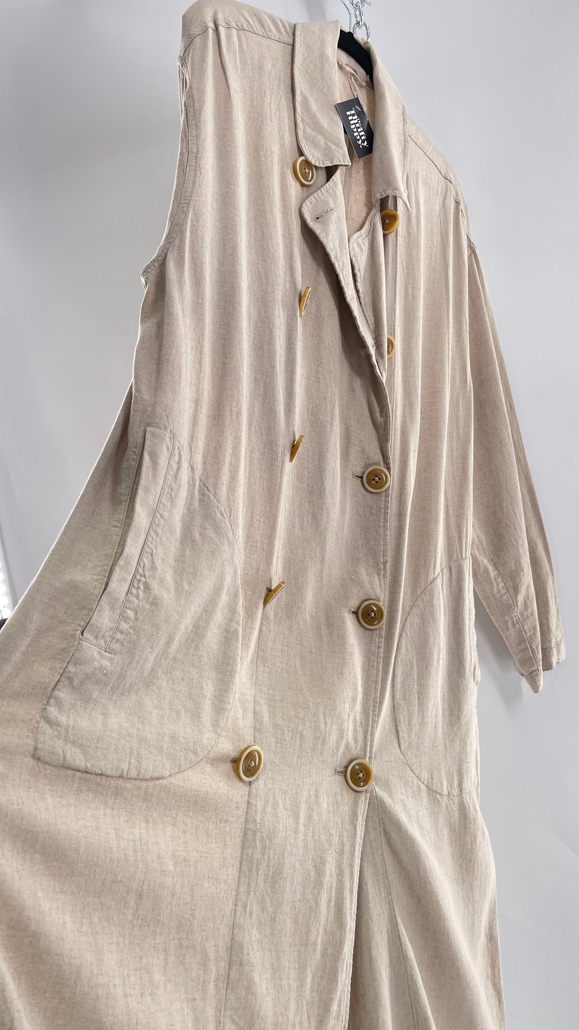 Free People Double Breasted Beige Linen Trench Coat with Brown Buttons and Tags Attached