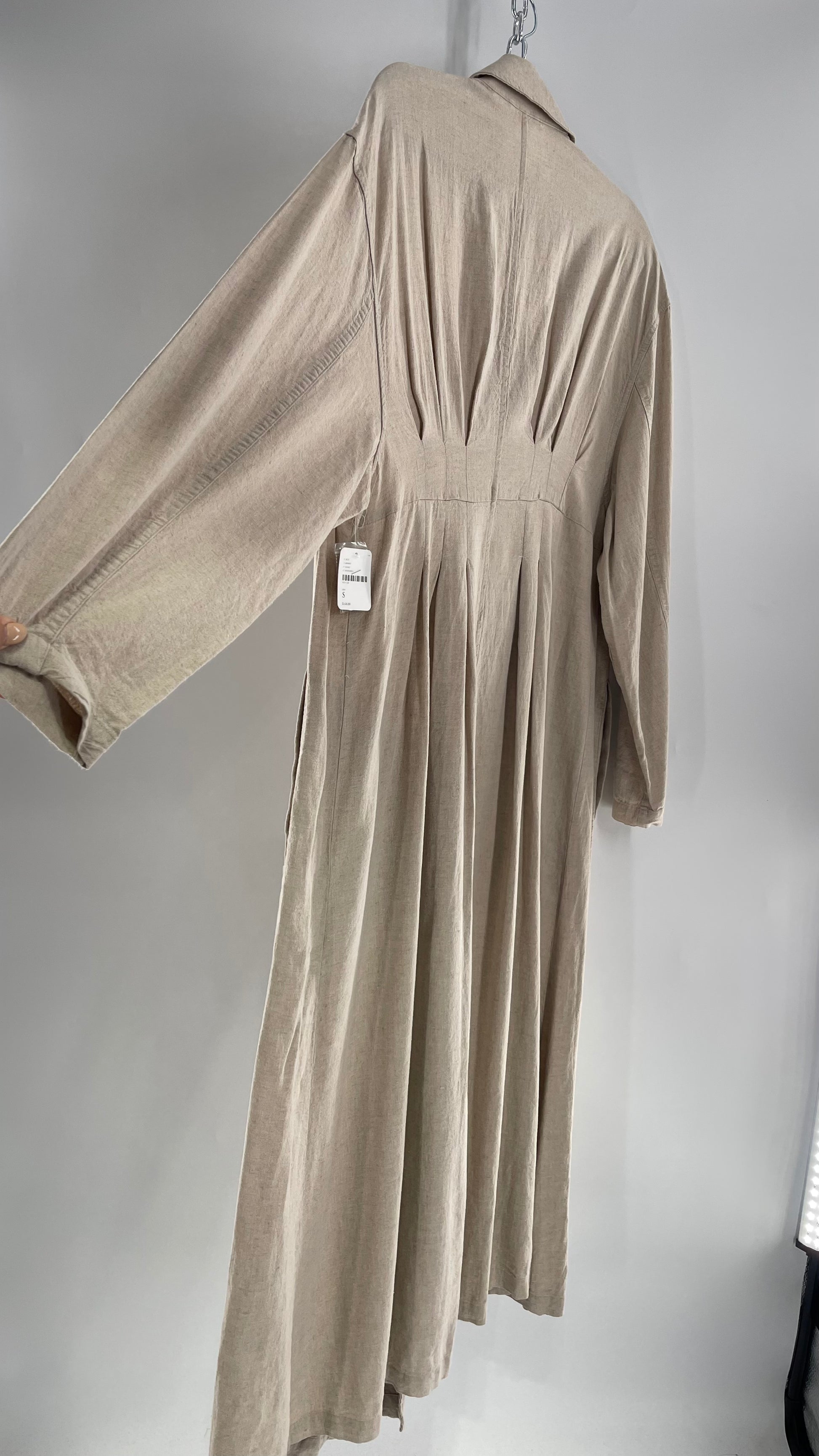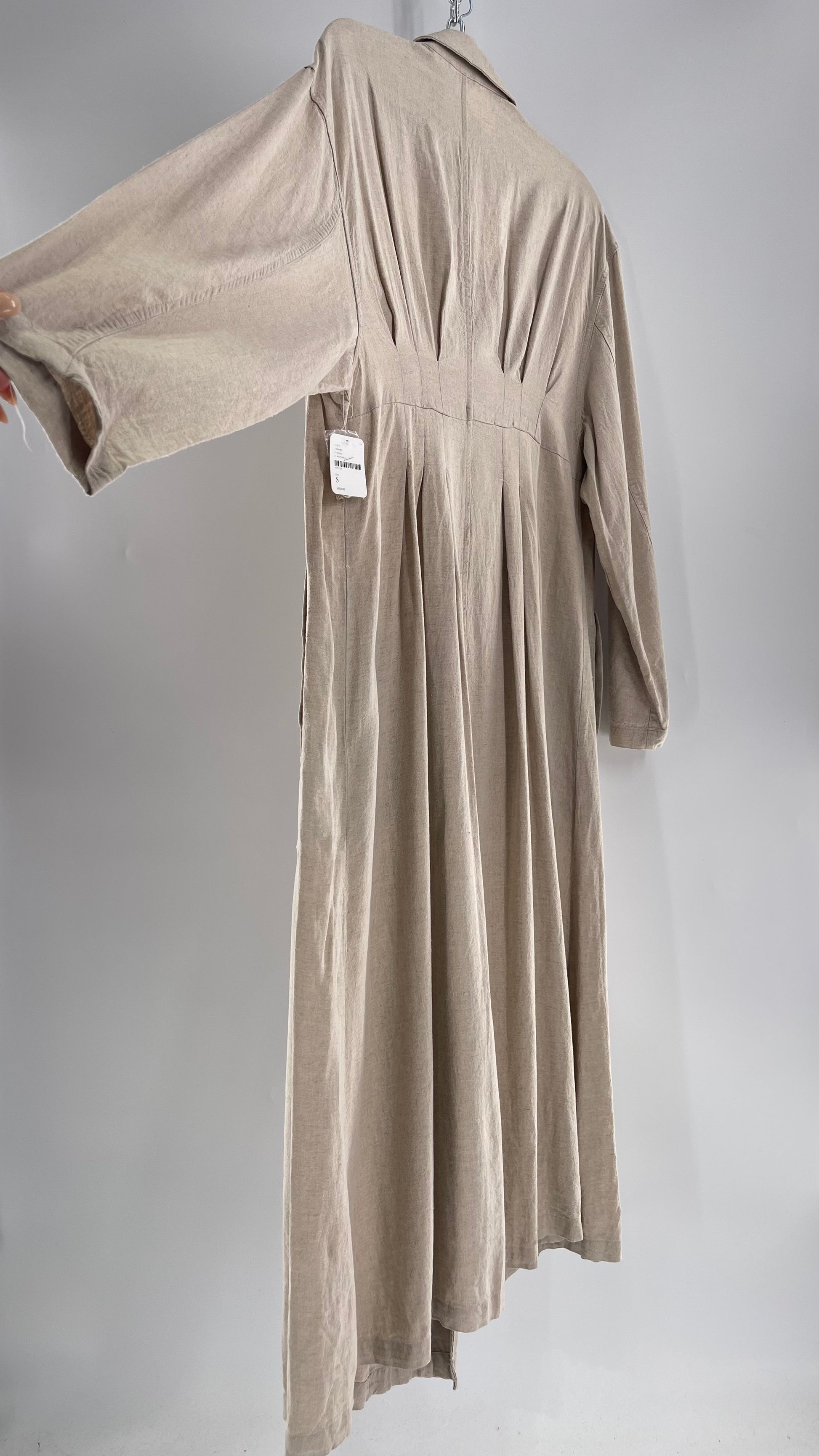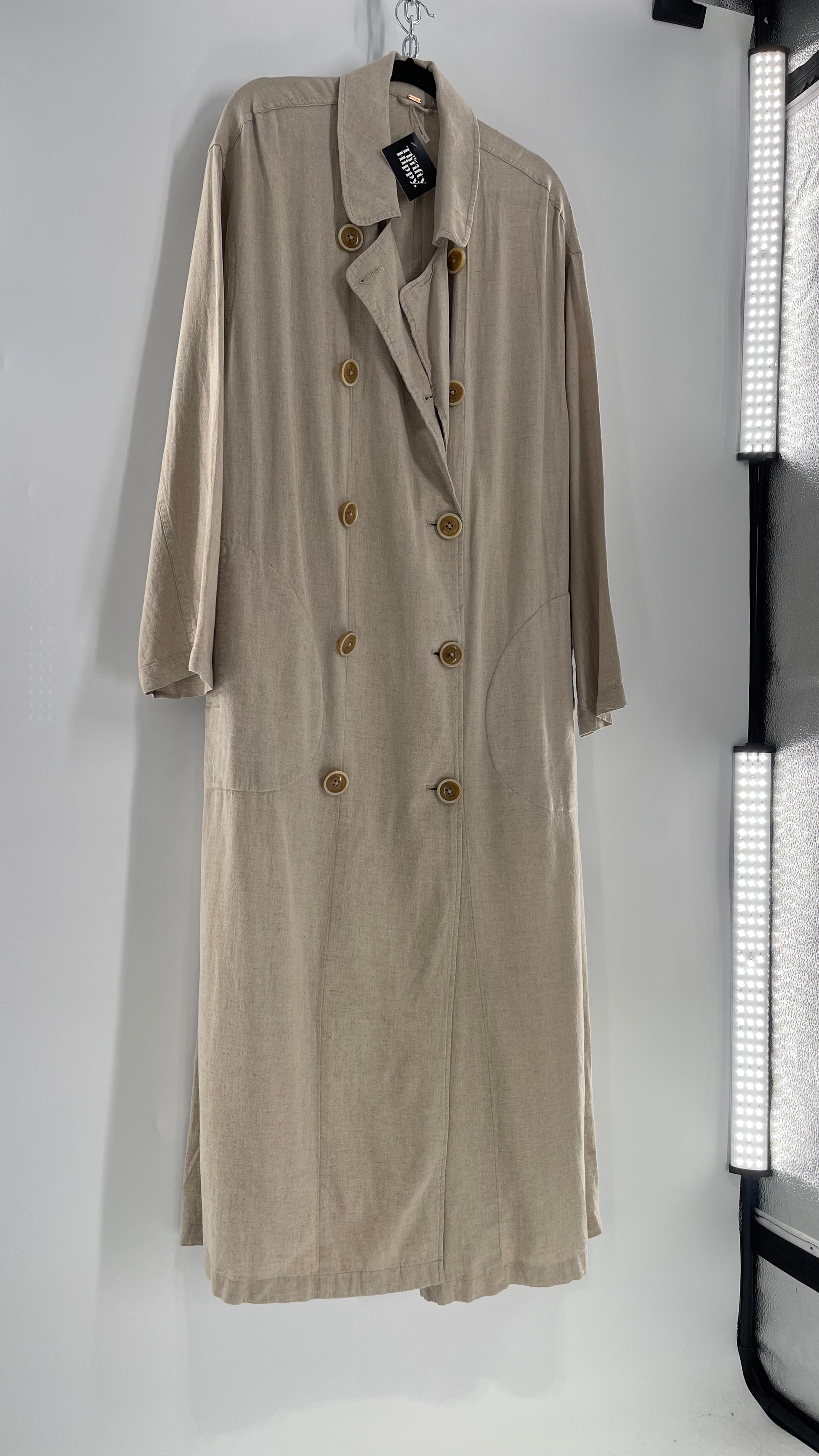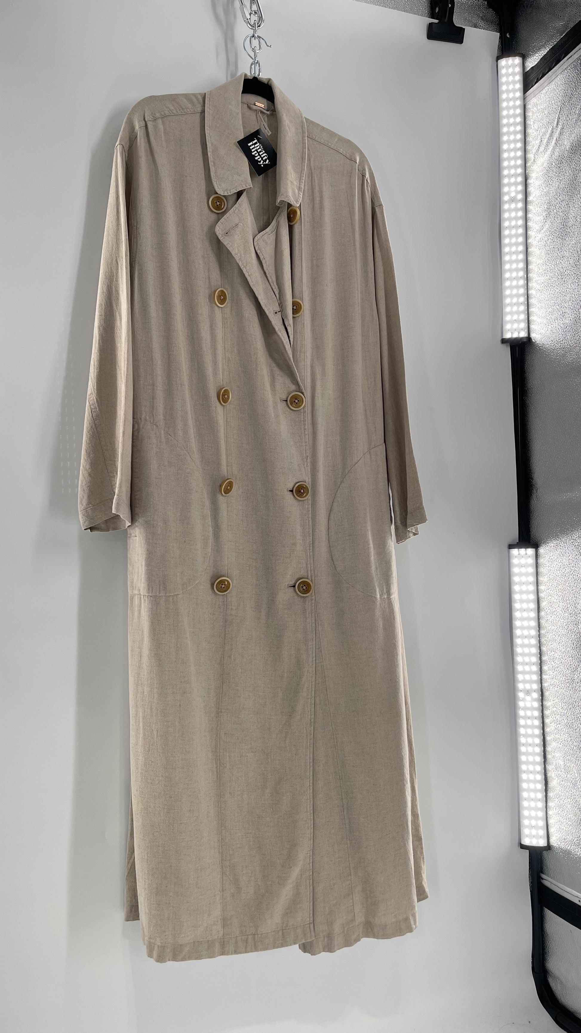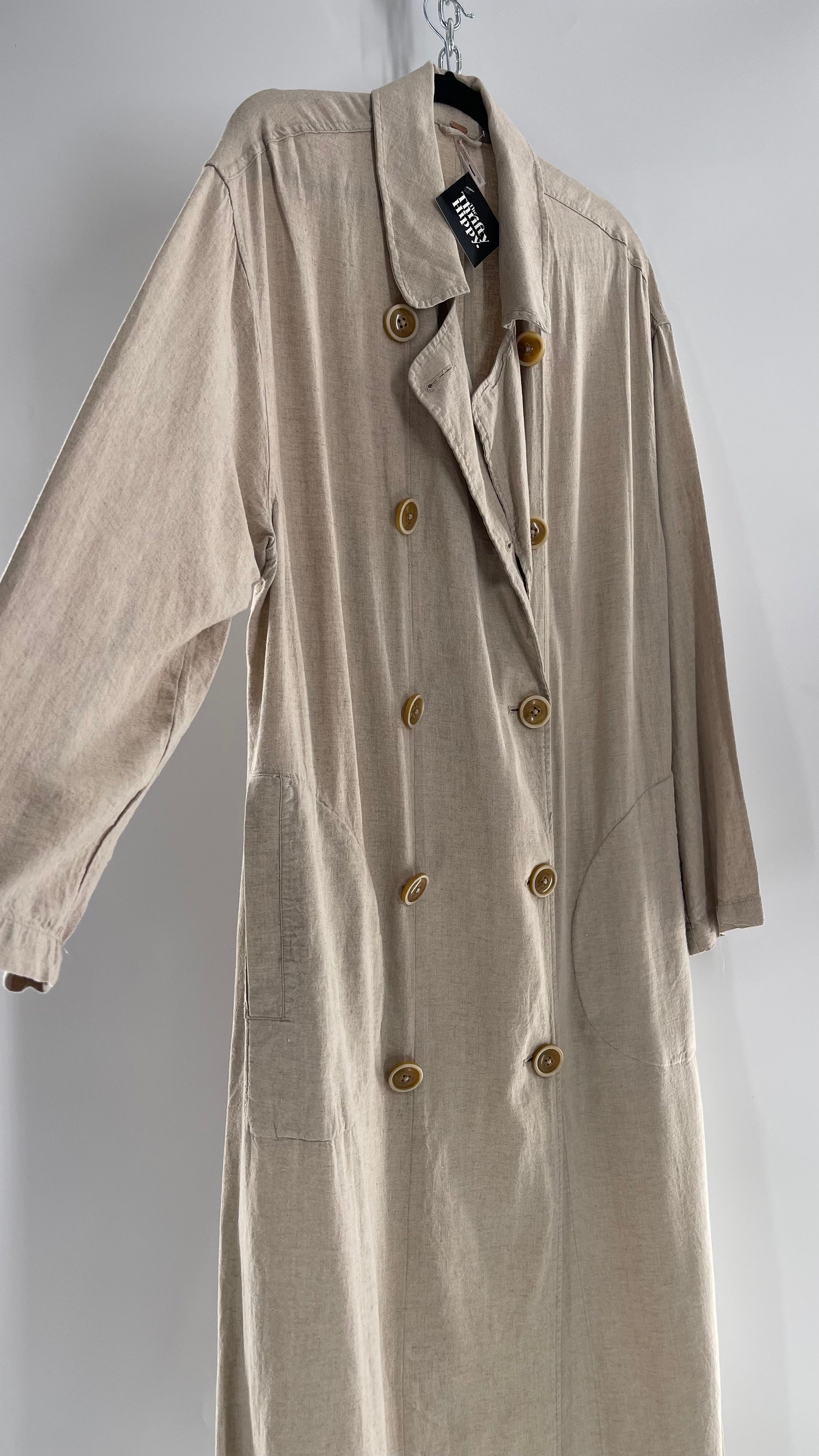 Free People Double Breasted Beige Linen Trench Coat with Brown Buttons and Tags Attached