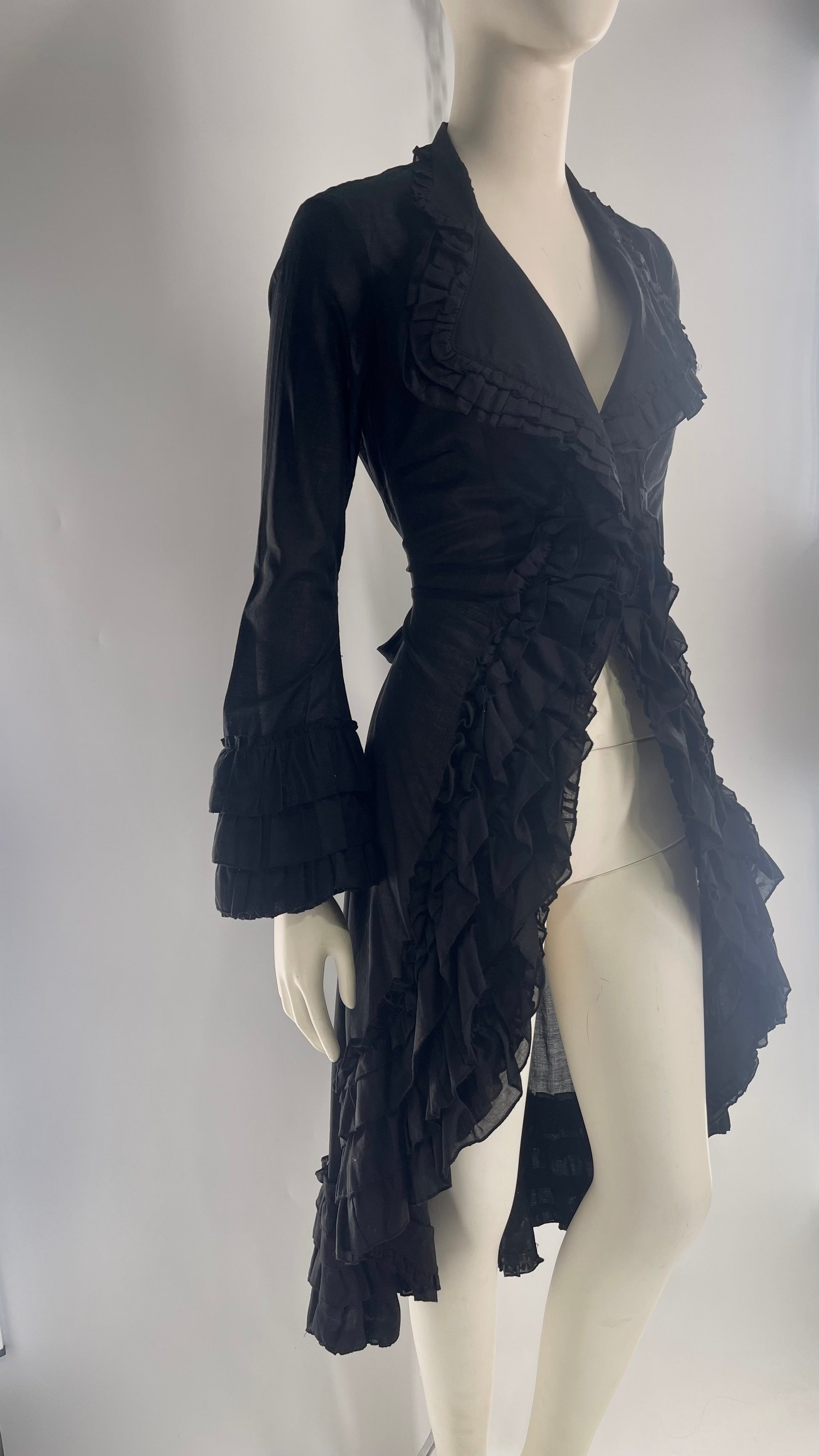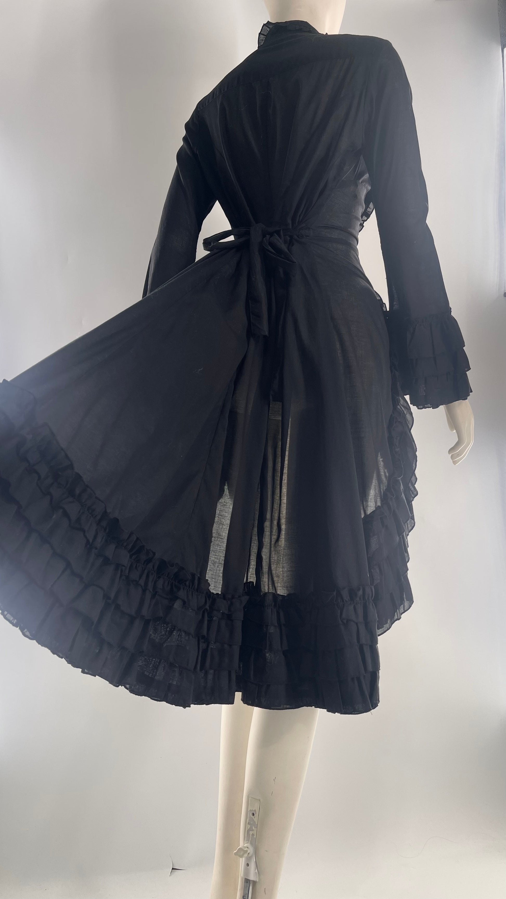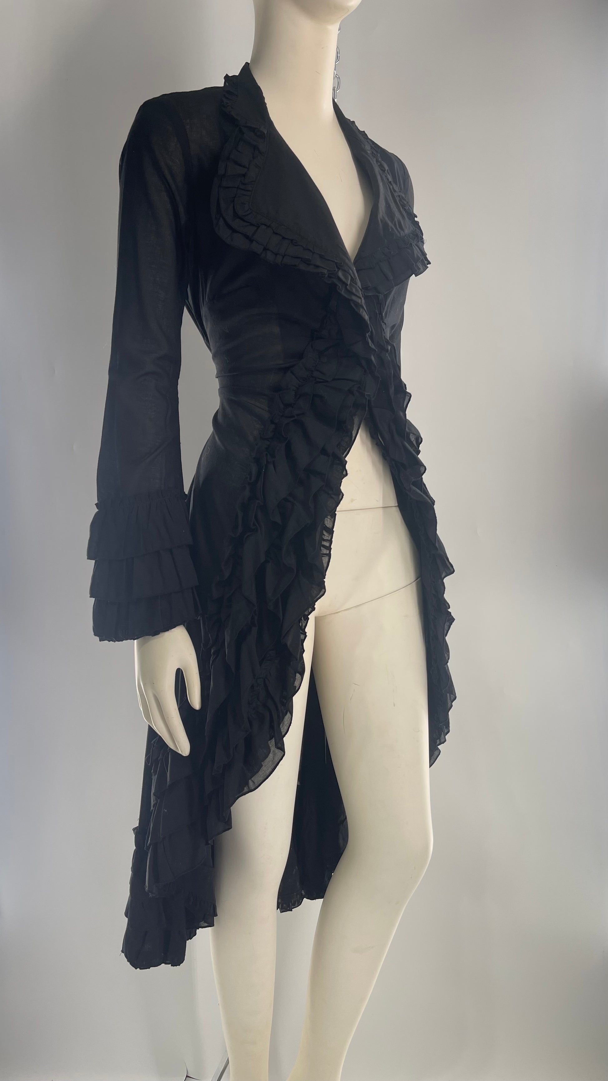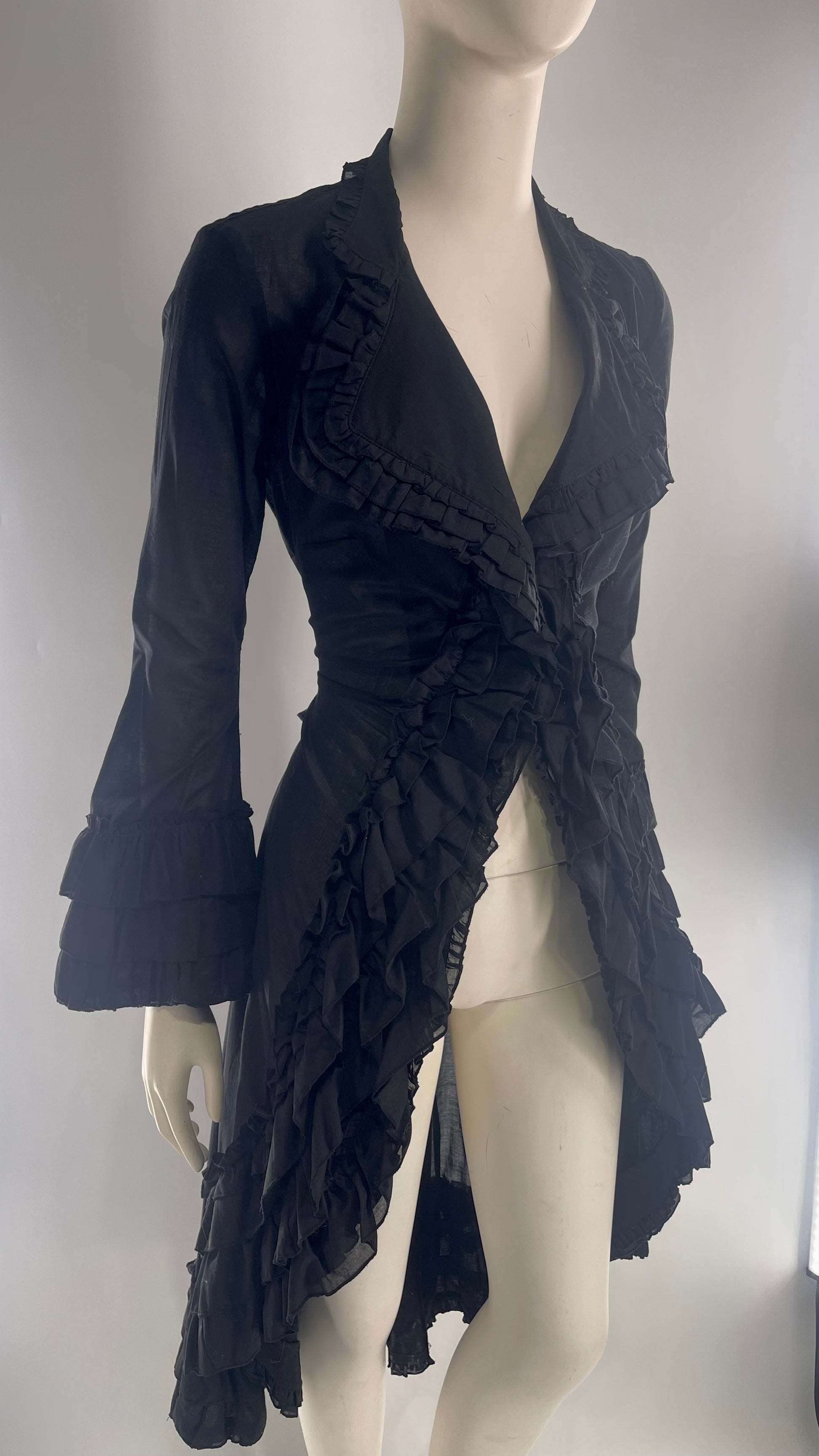 Vintage Cordelia Cotton Black Ruffled Duster Coat with Ruffled Lapel and Cuffs (XS)