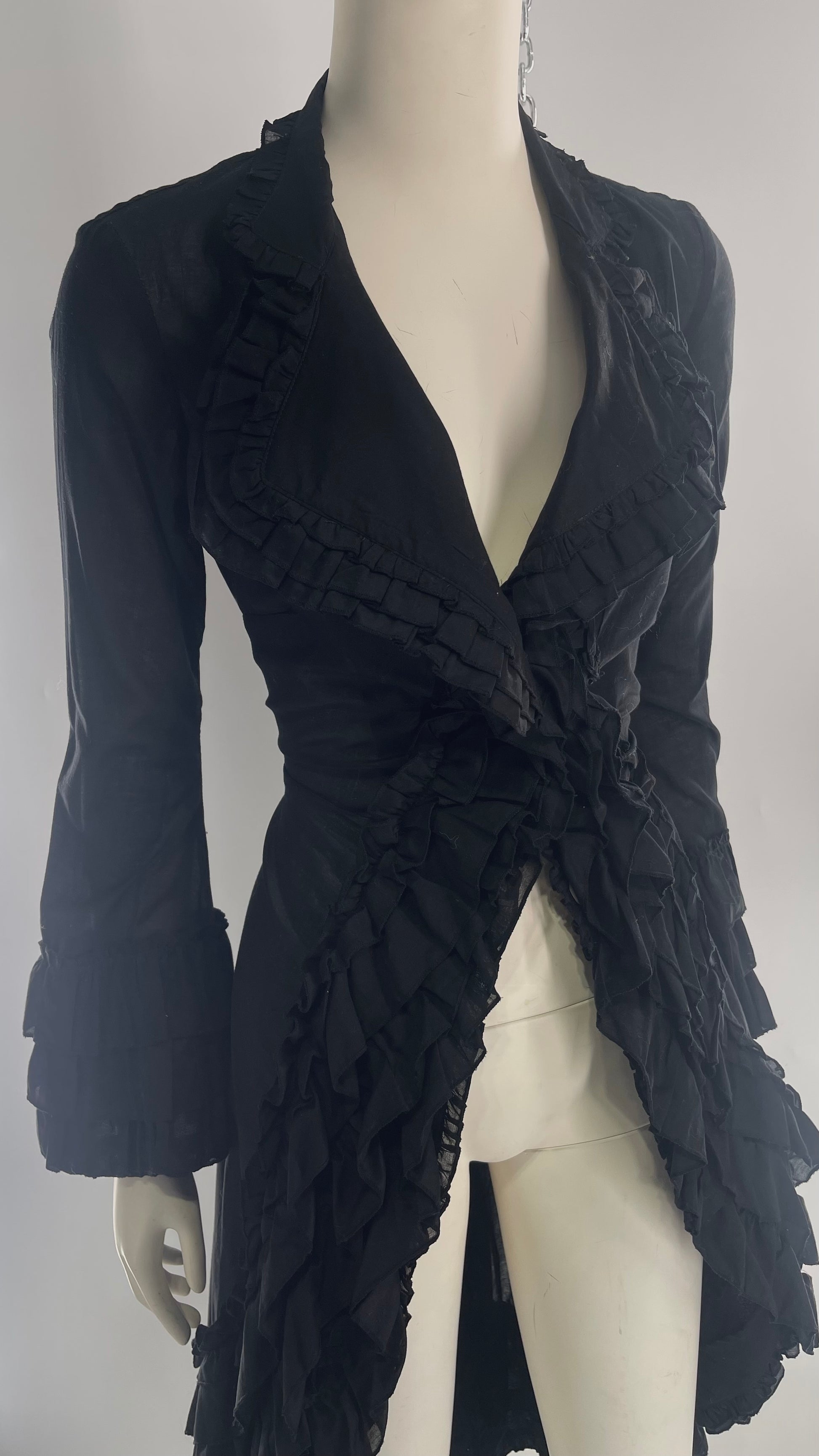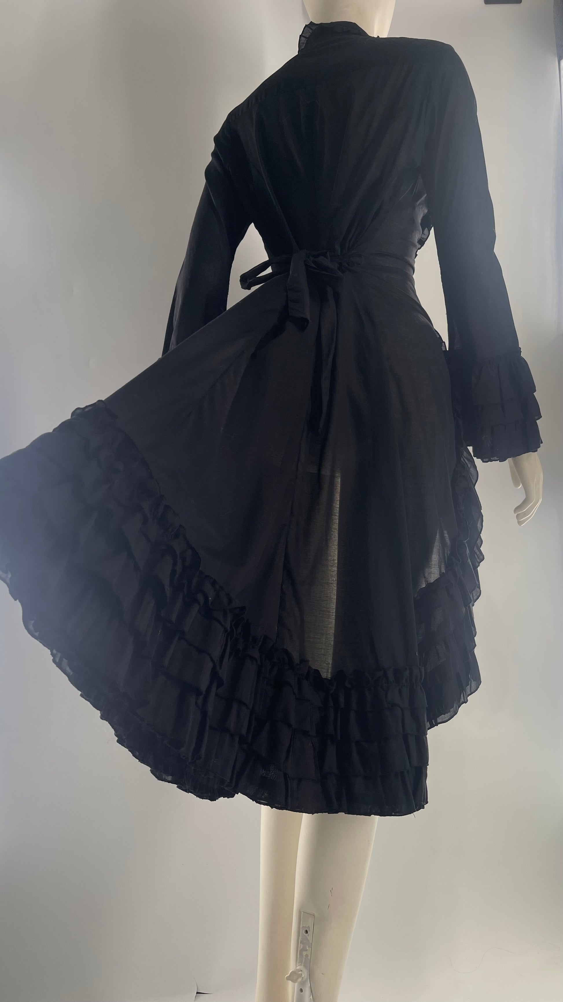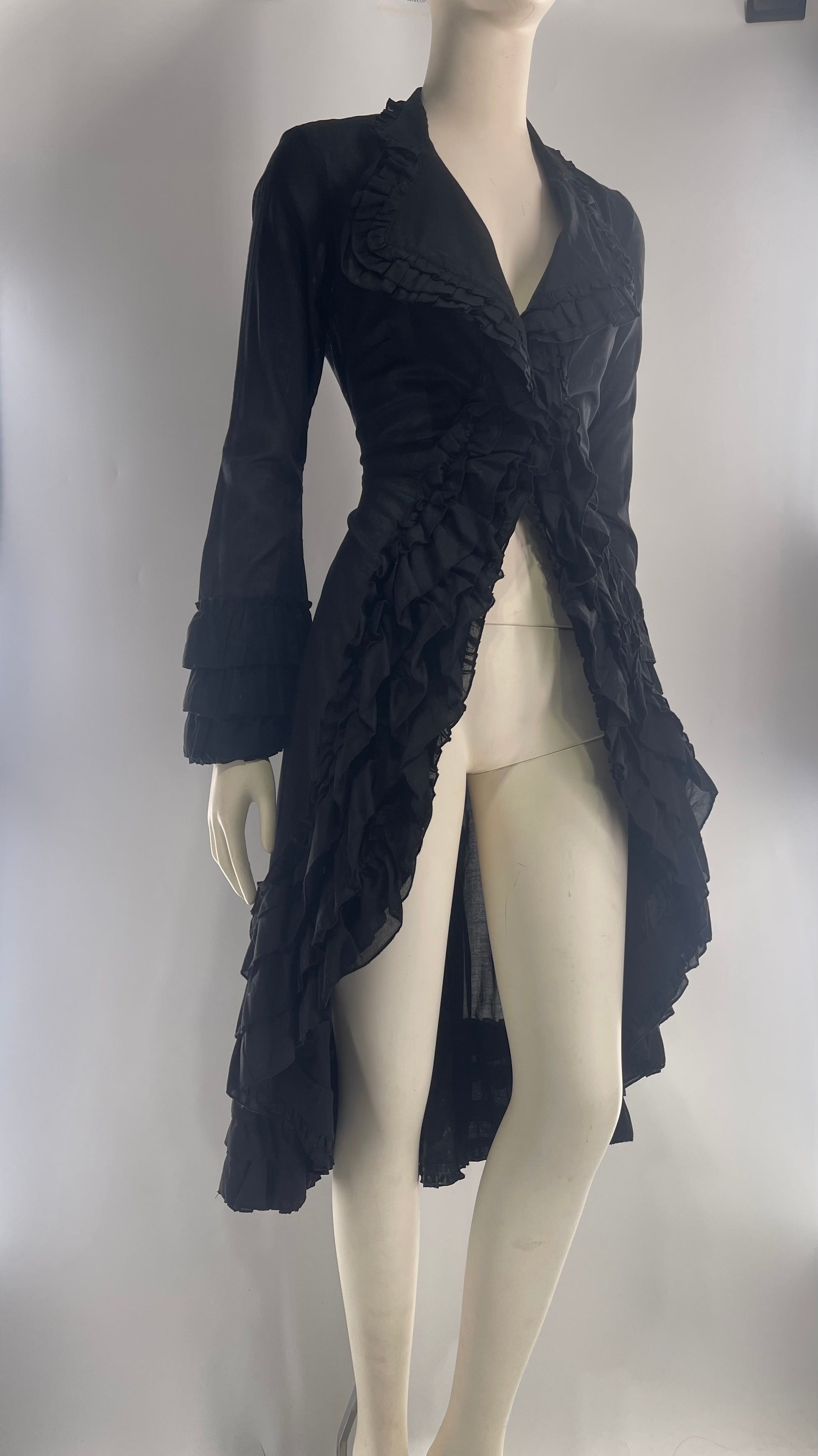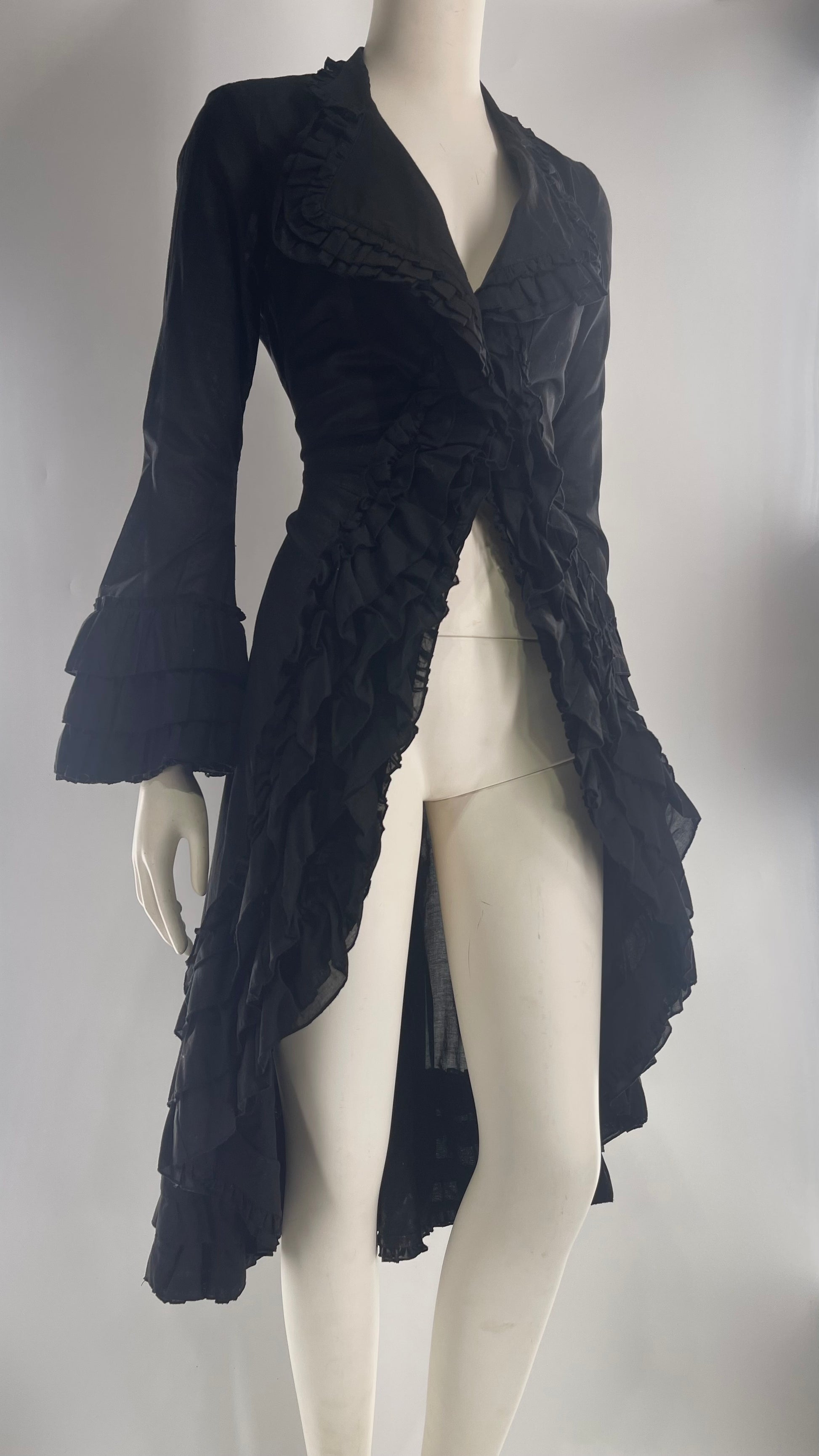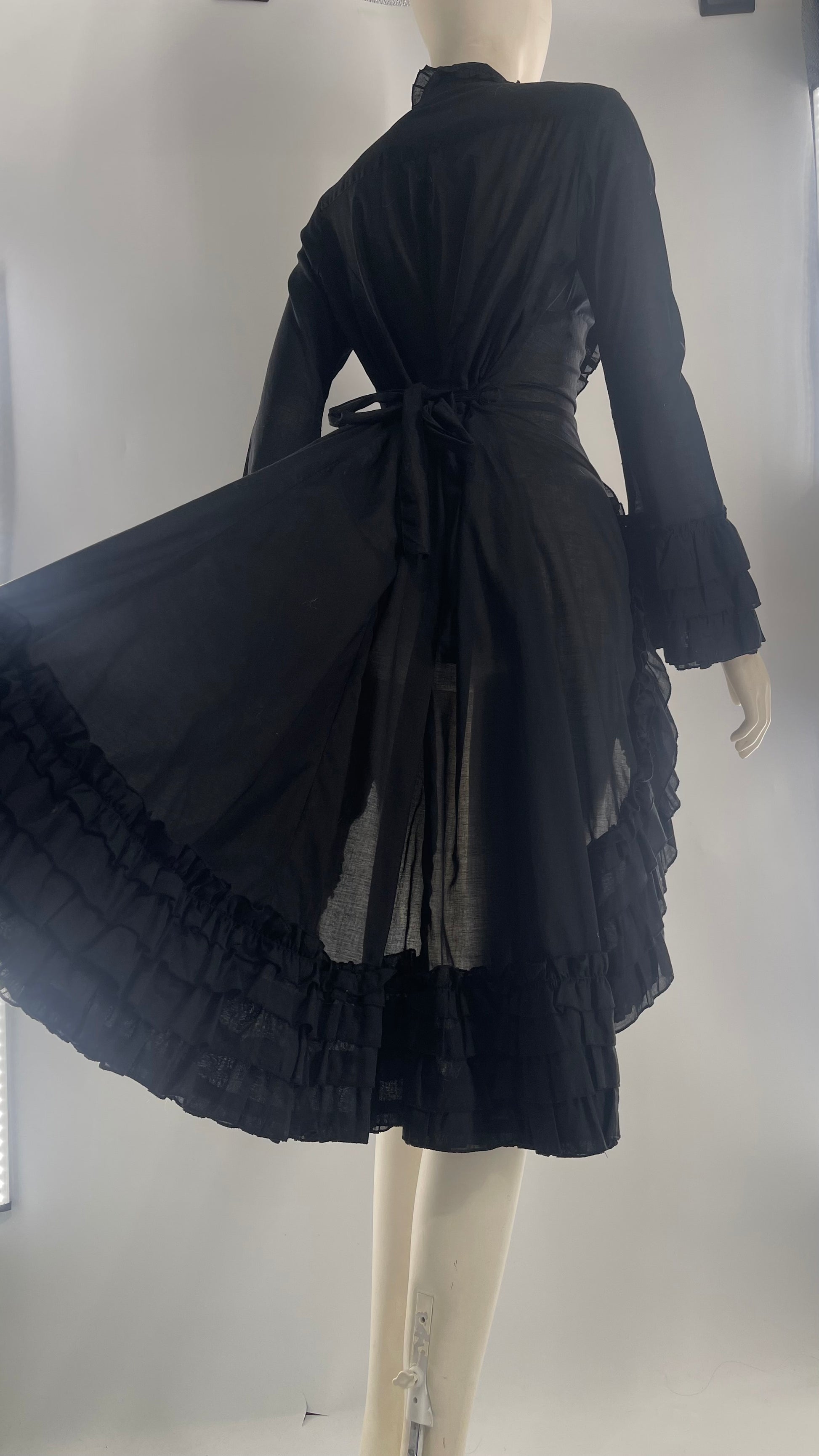 Vintage Cordelia Cotton Black Ruffled Duster Coat with Ruffled Lapel and Cuffs (XS)