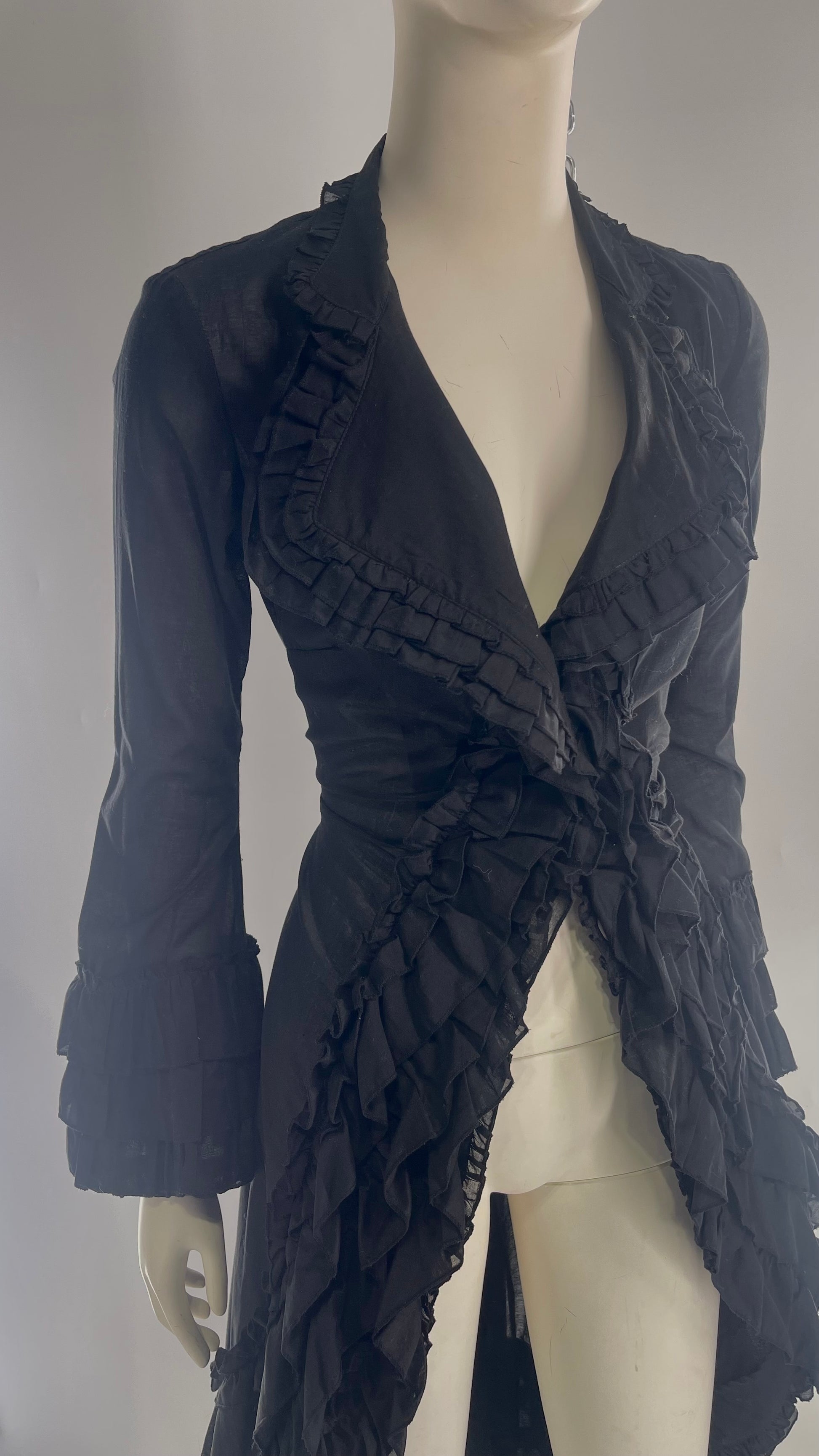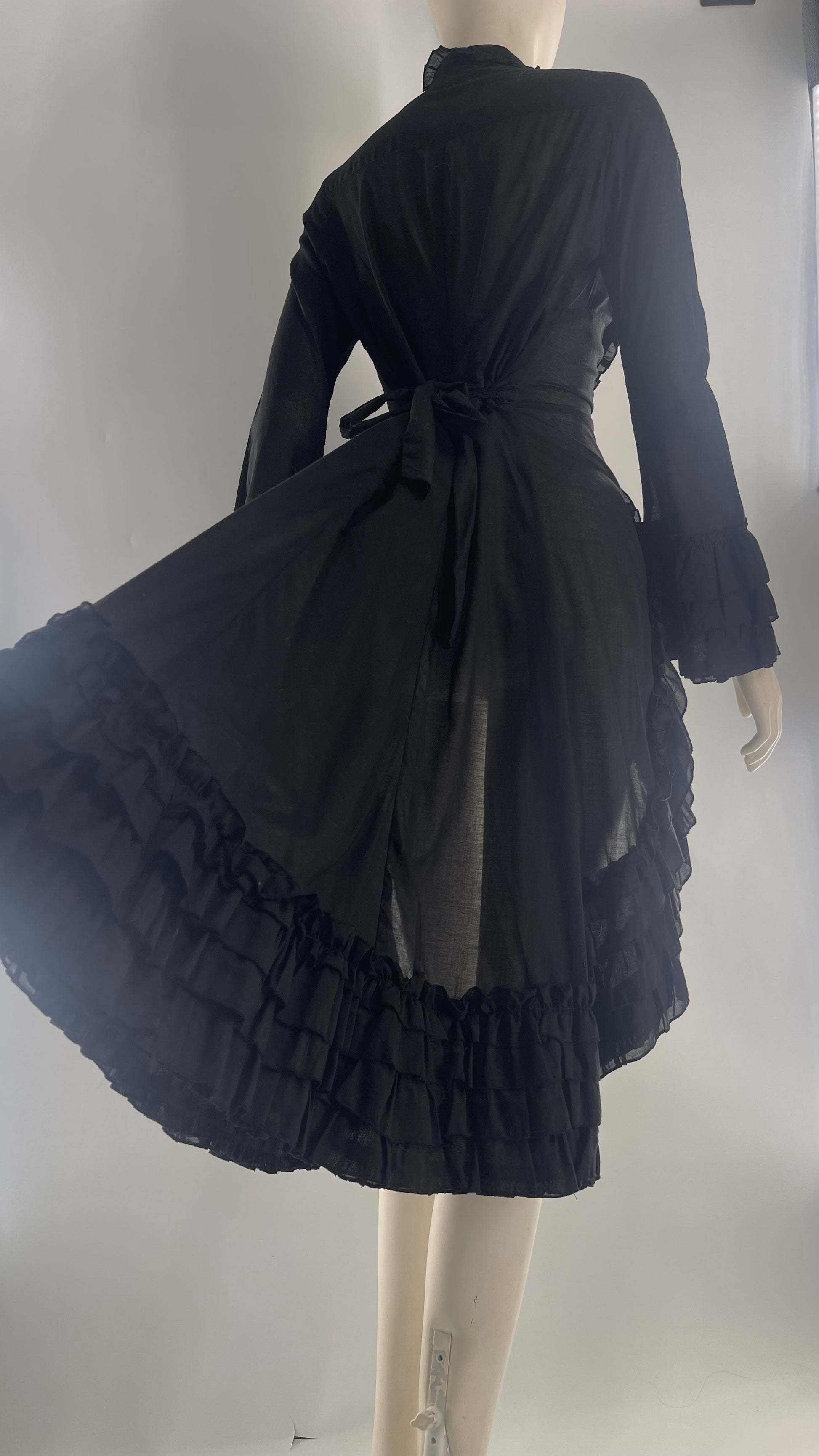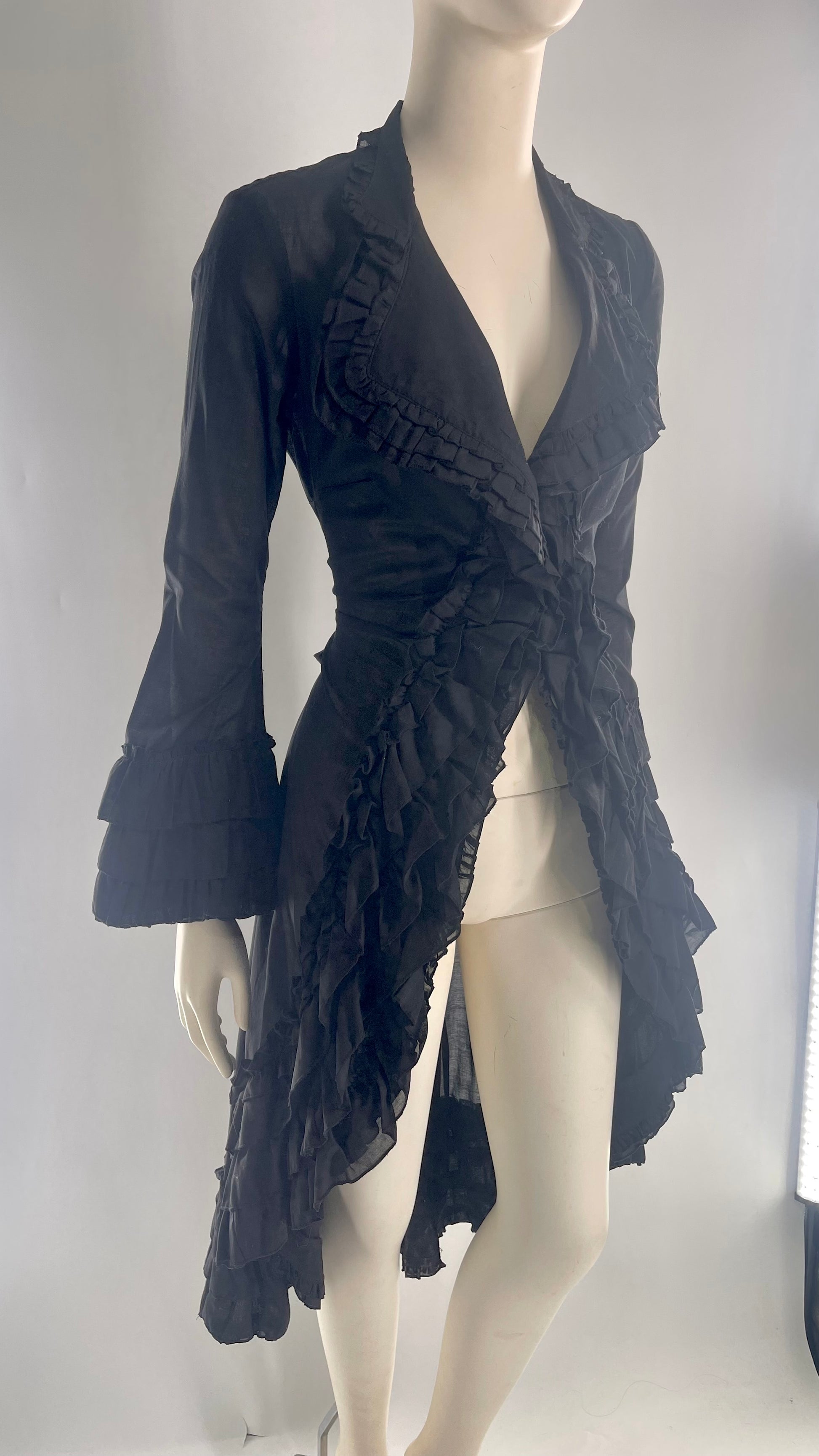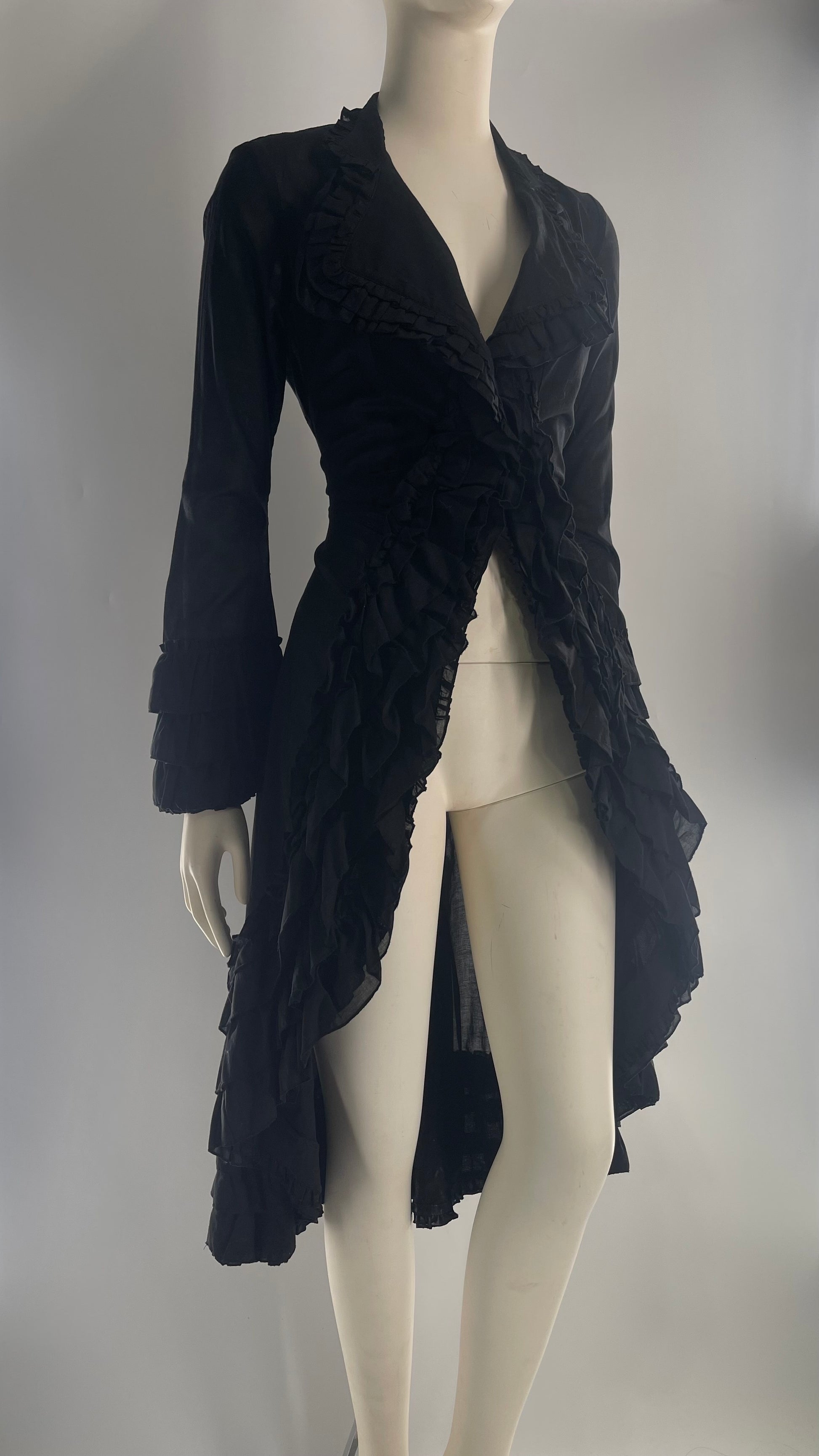 Vintage Cordelia Cotton Black Ruffled Duster Coat with Ruffled Lapel and Cuffs (XS)
