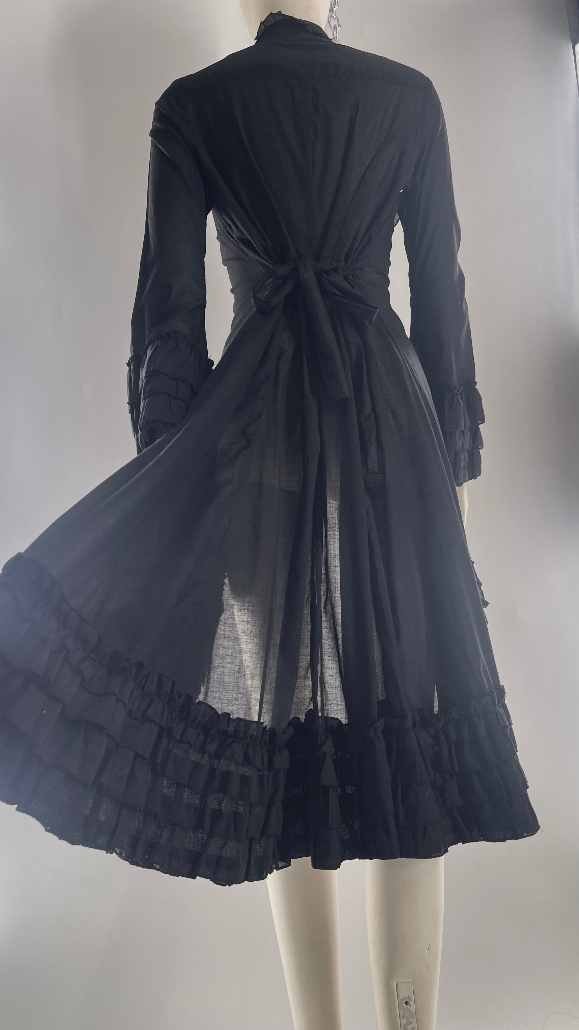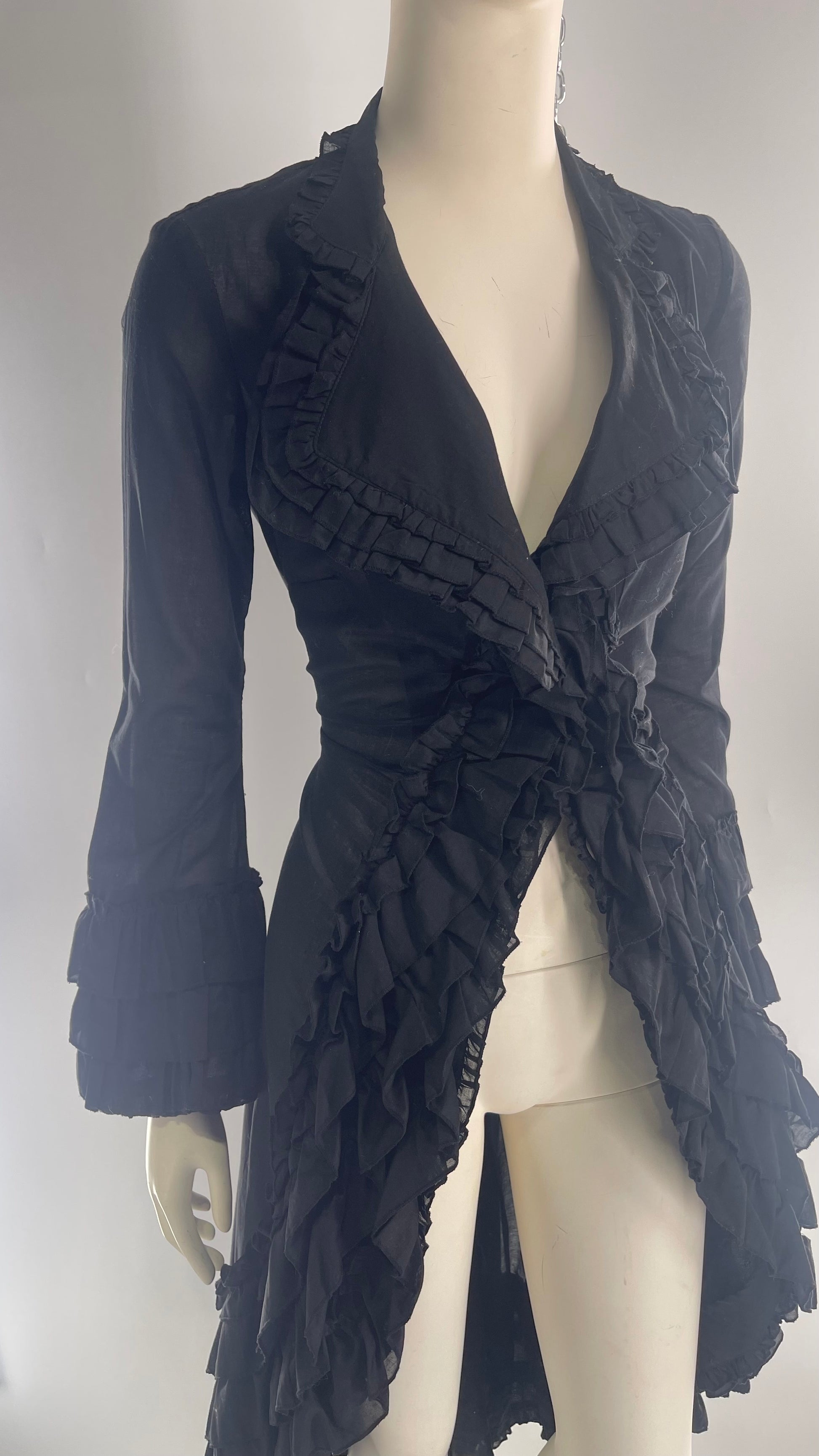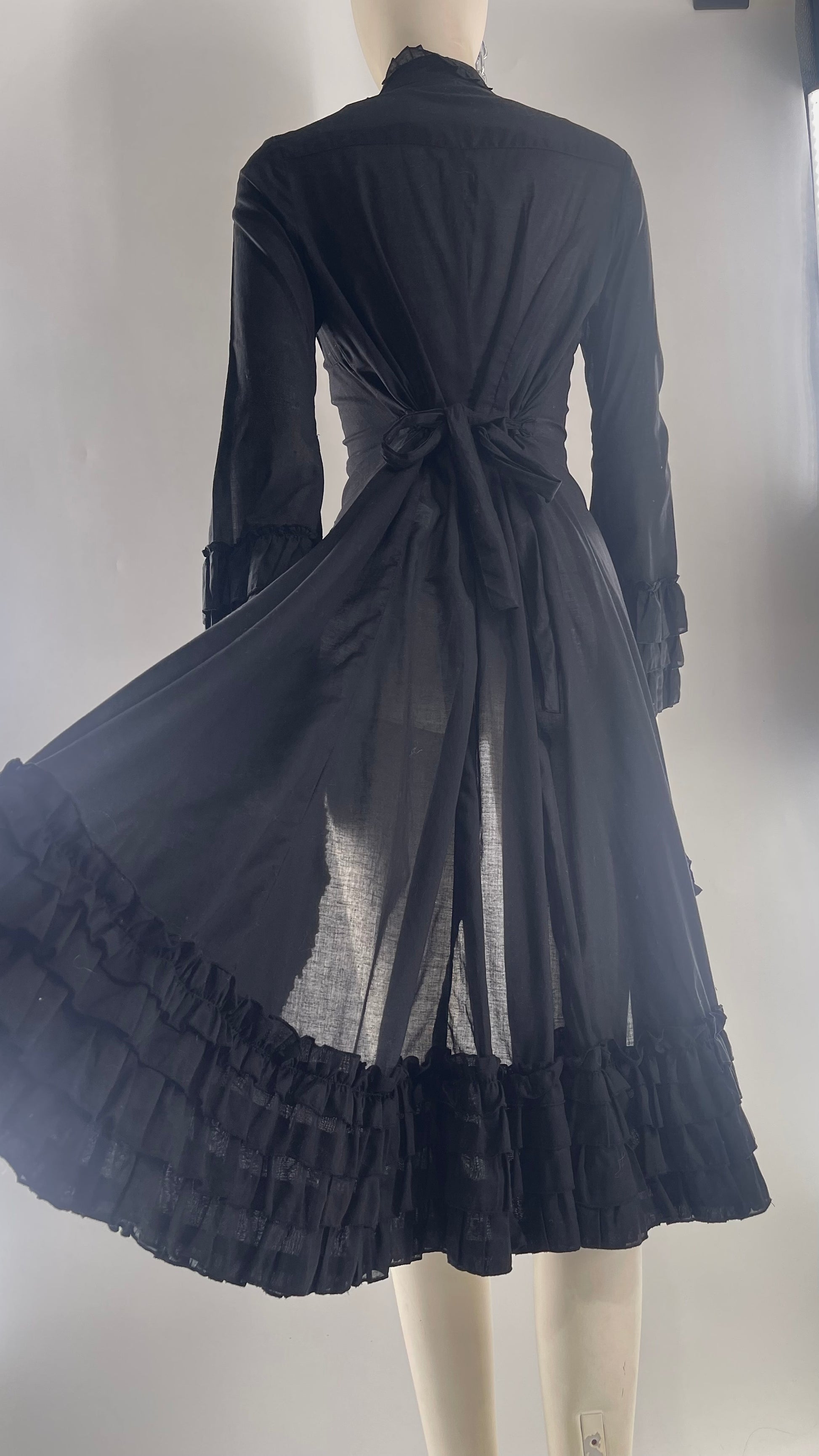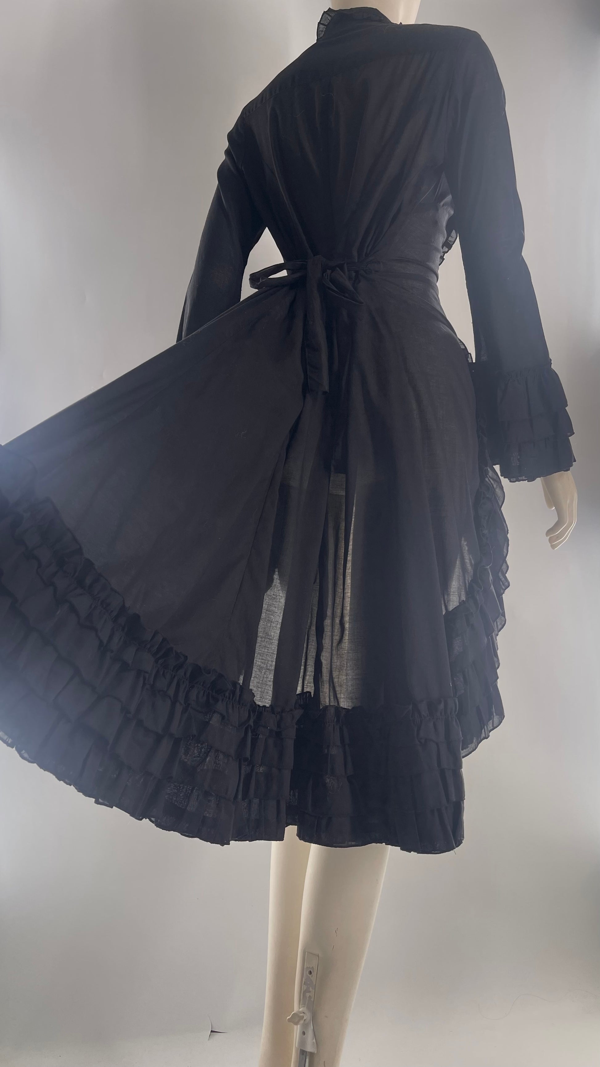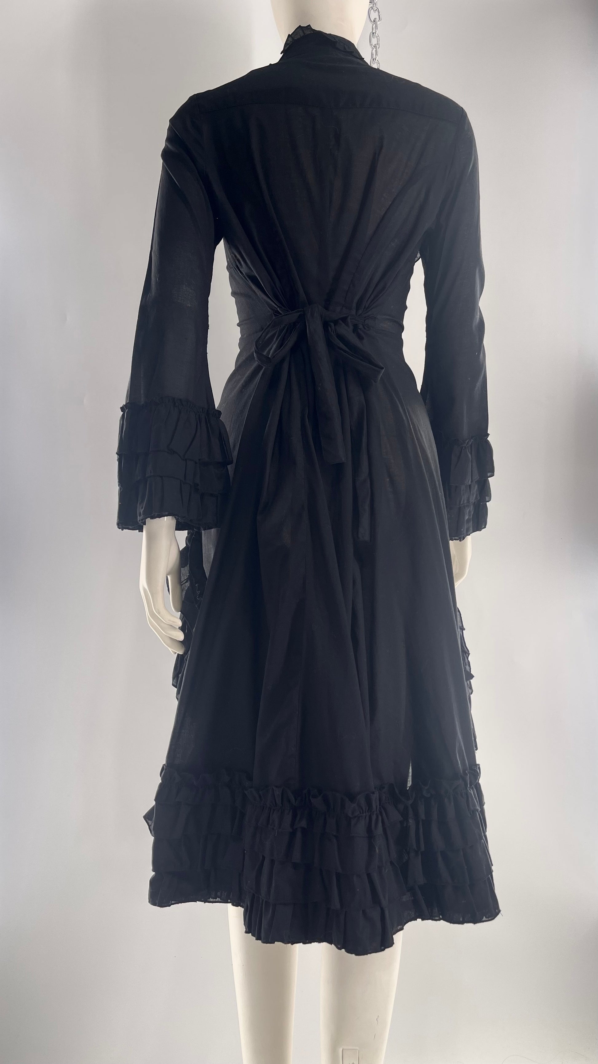 Vintage Cordelia Cotton Black Ruffled Duster Coat with Ruffled Lapel and Cuffs (XS)