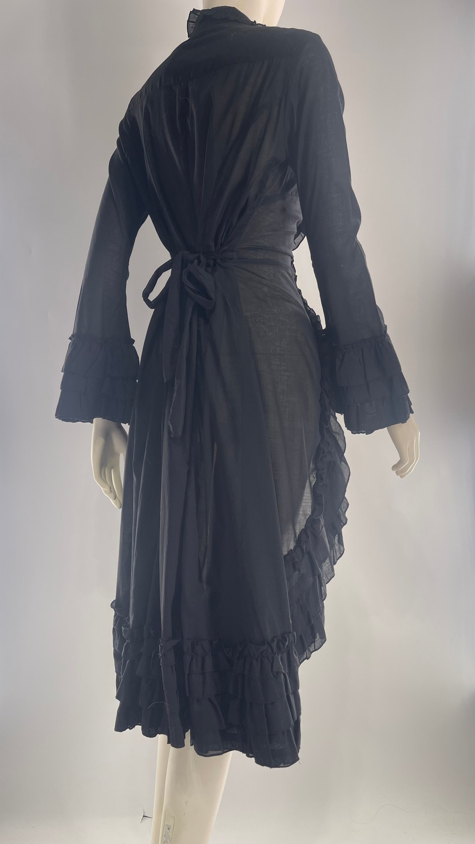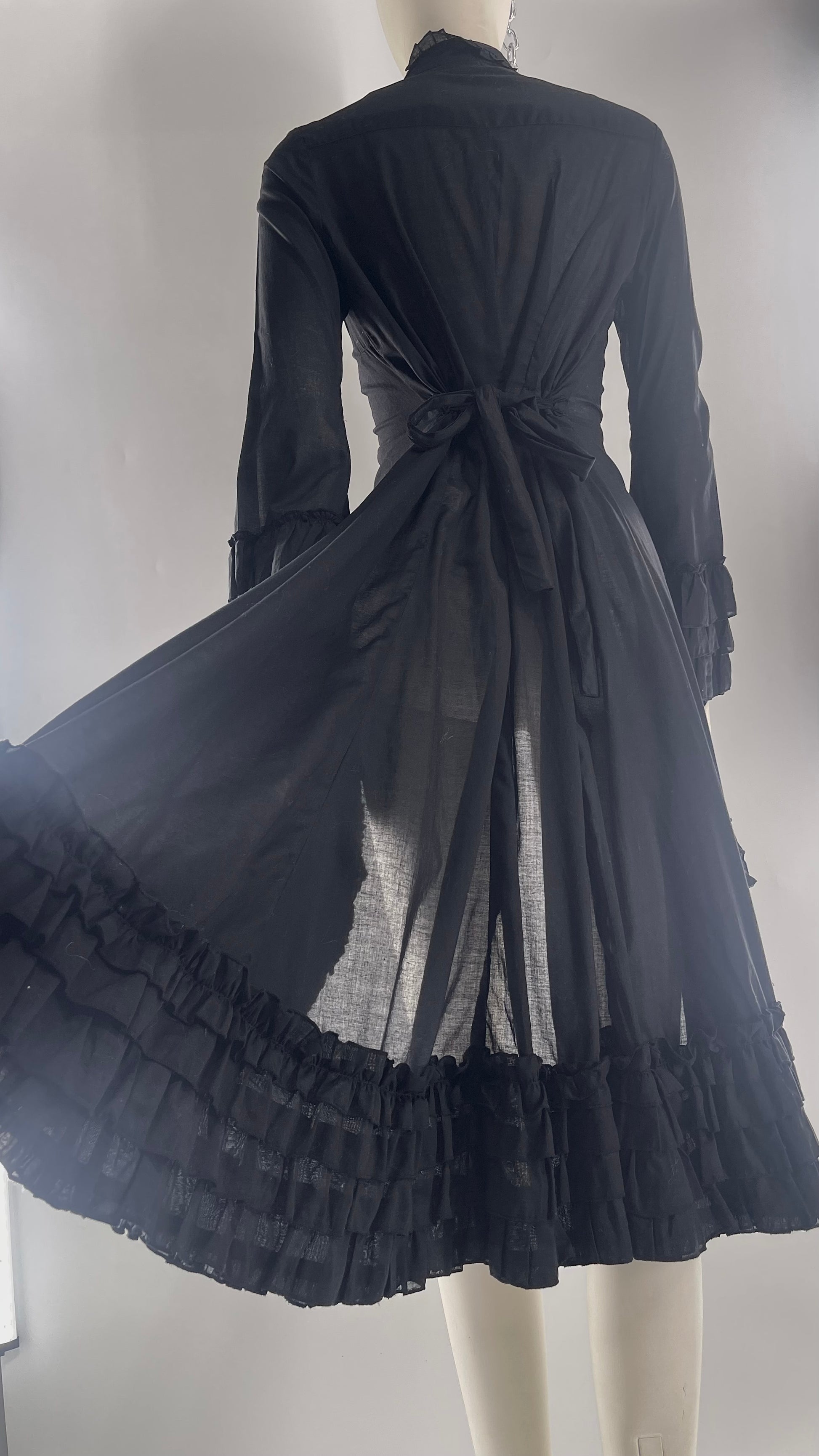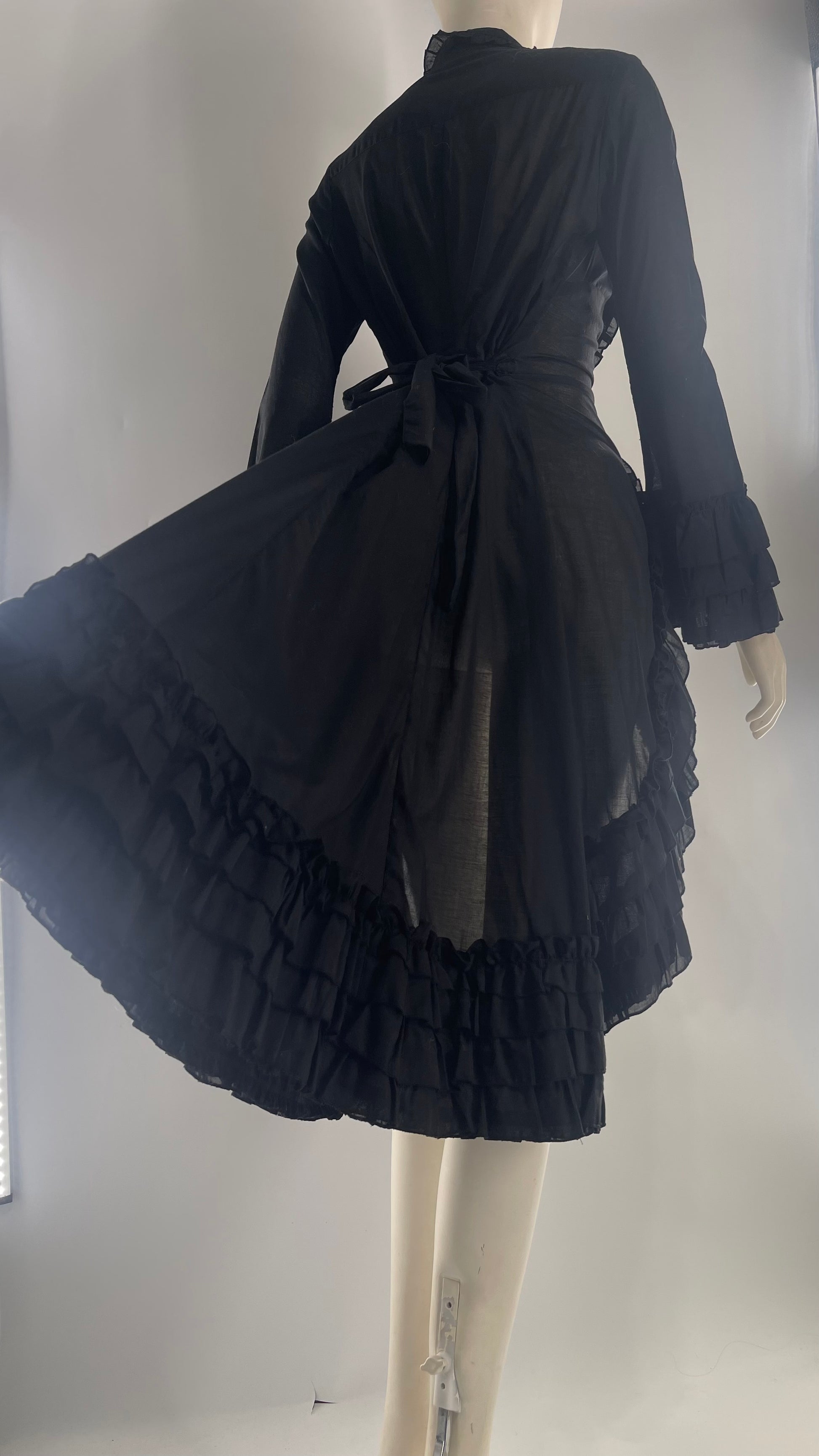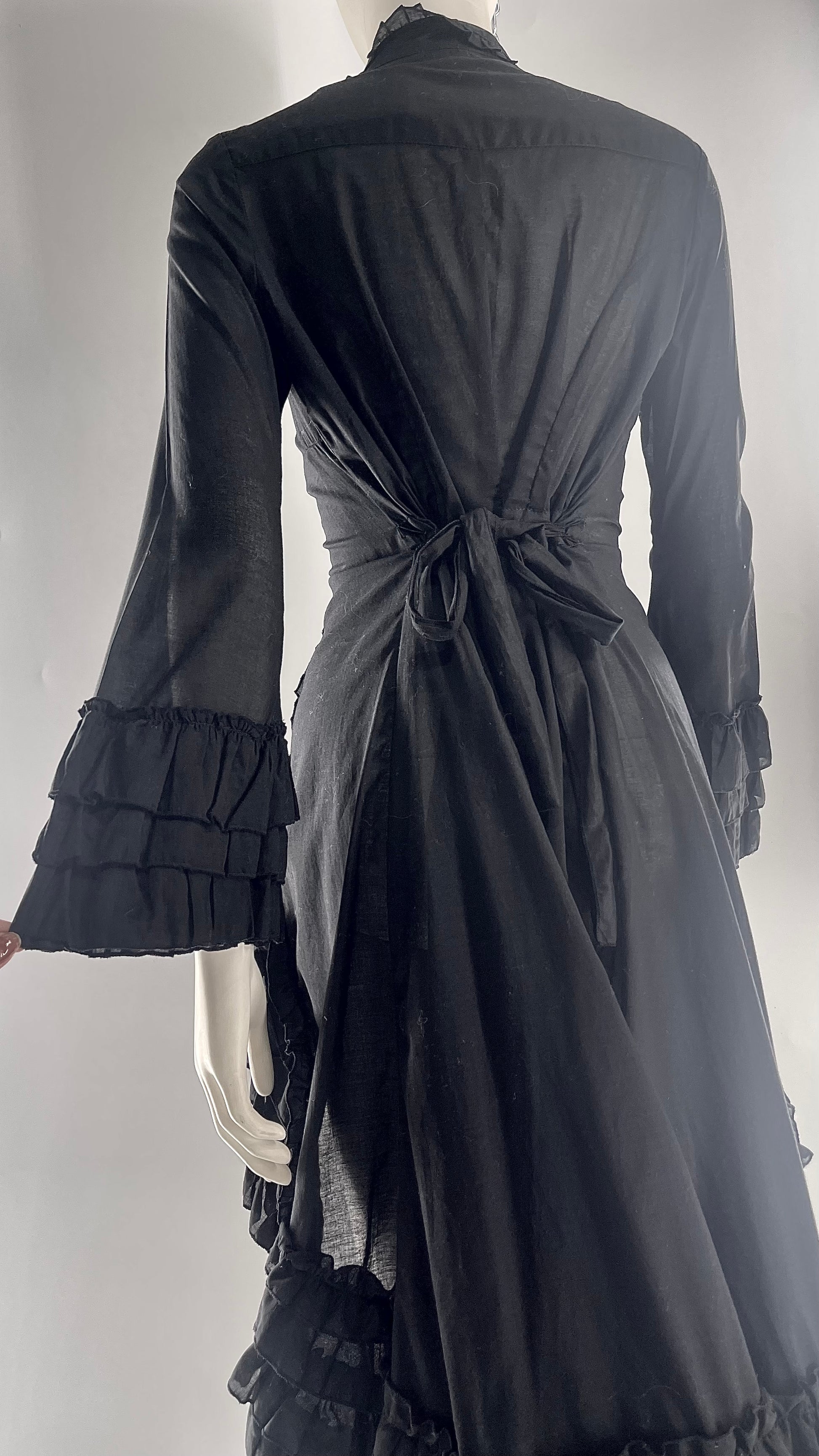 Vintage Cordelia Cotton Black Ruffled Duster Coat with Ruffled Lapel and Cuffs (XS)