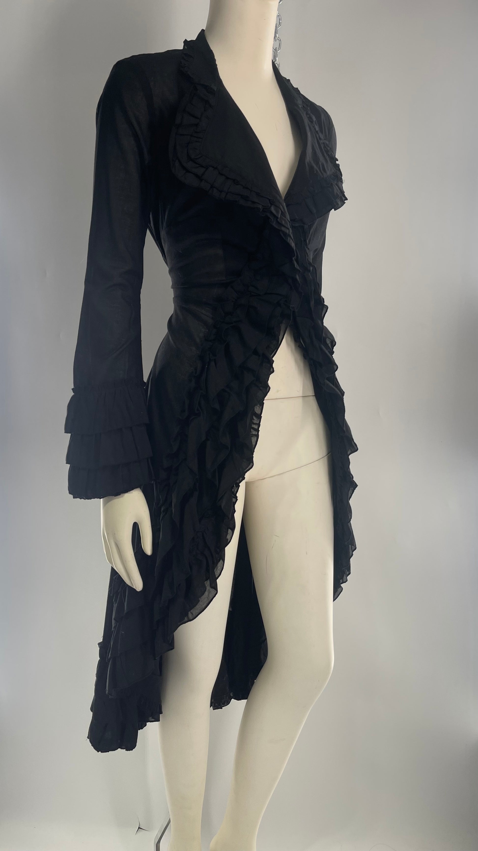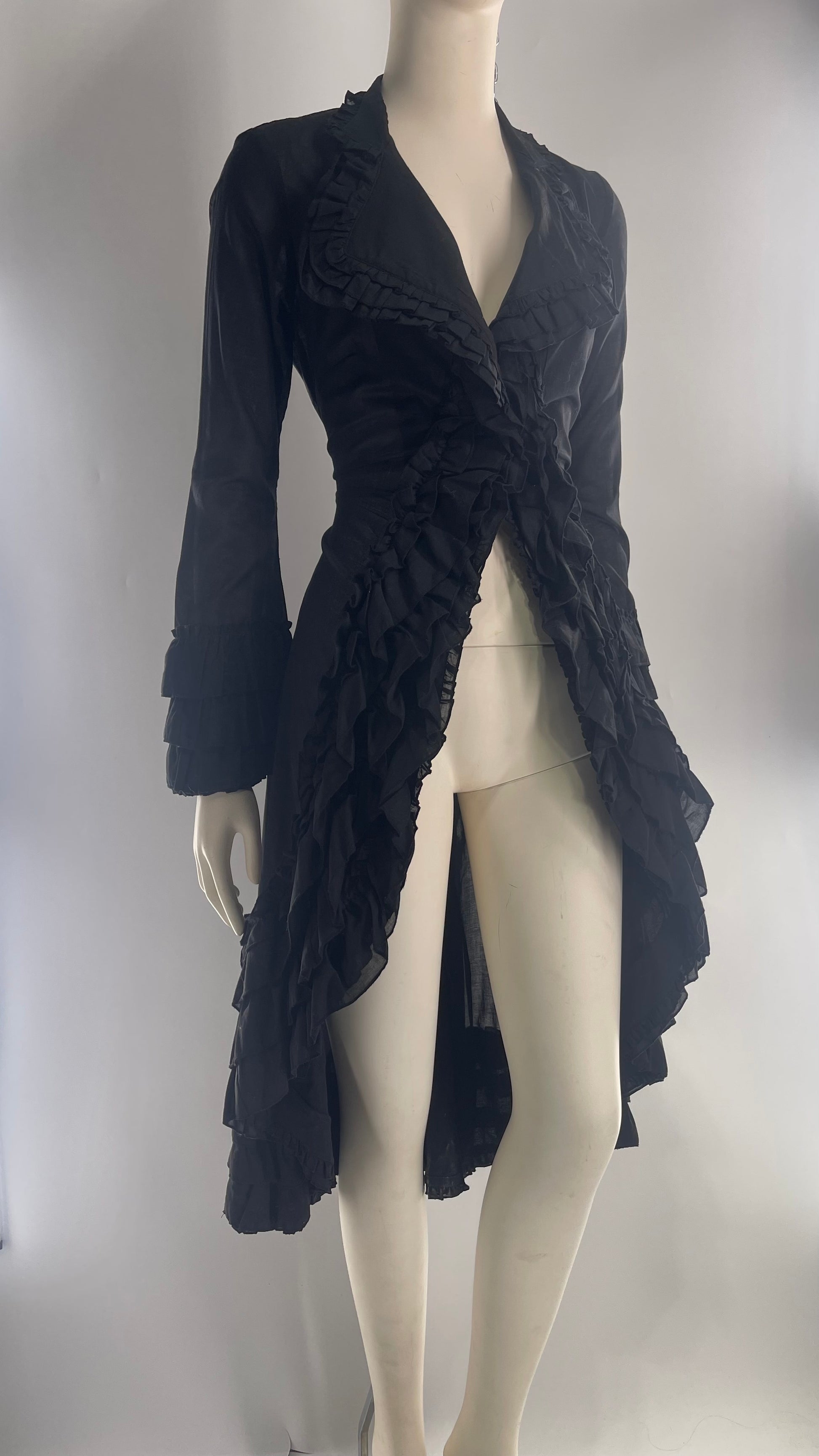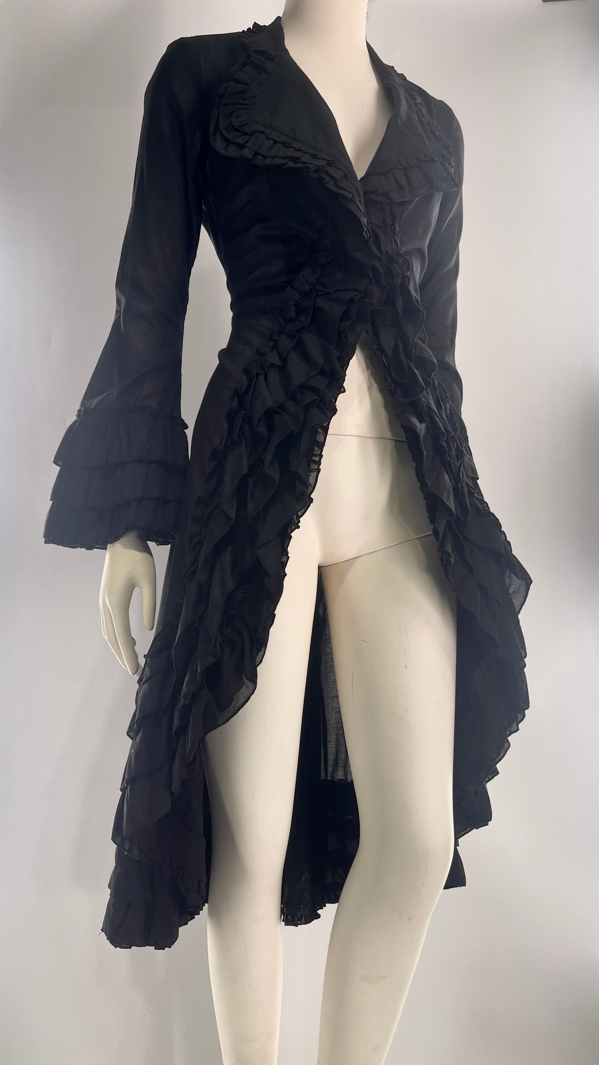 Vintage Cordelia Black Ruffled Duster Coat with Ruffled Lapel and Cuffs (XS)