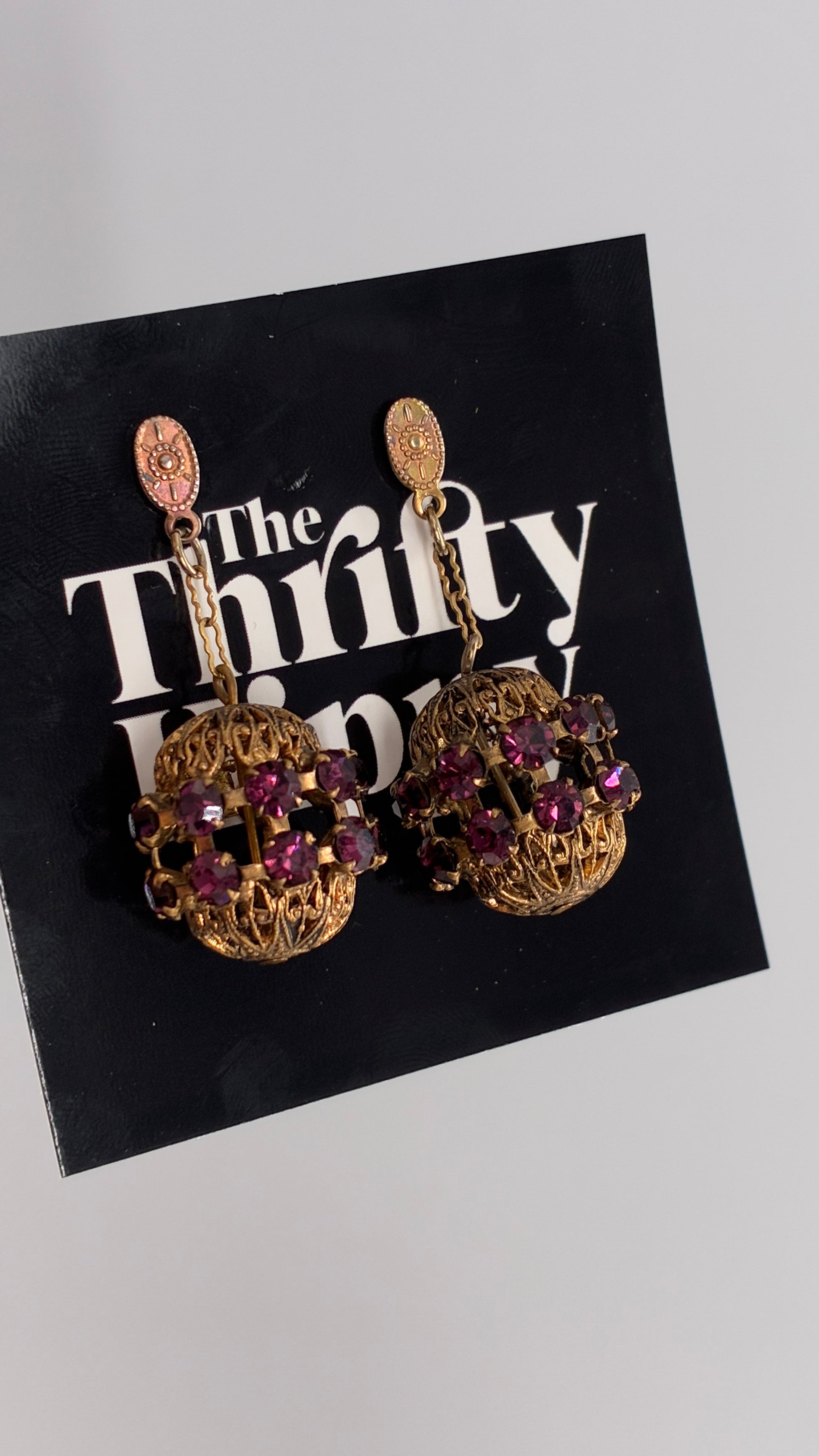 Vintage Bronze Ornate Cage Pendant Earrings with Purple Stone Details