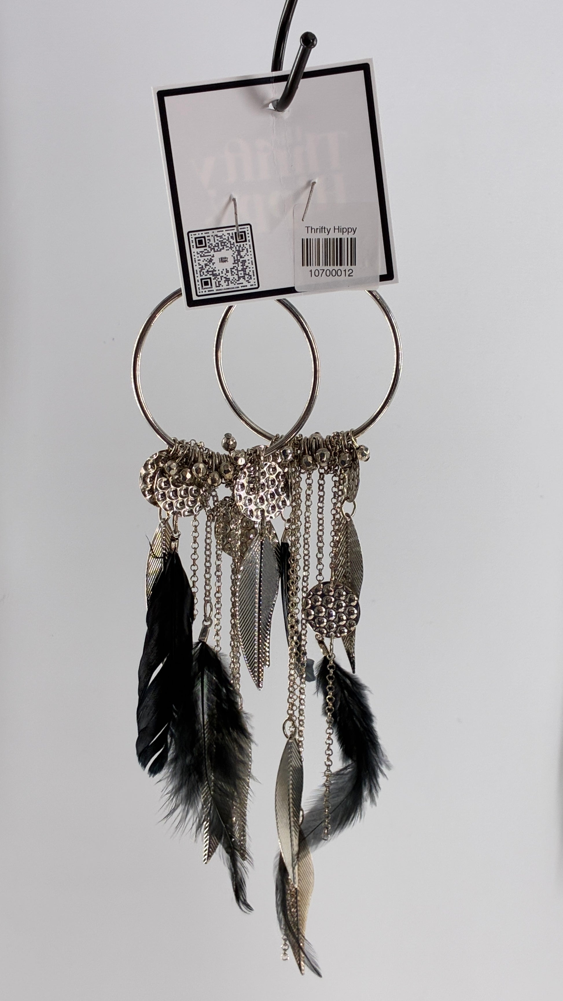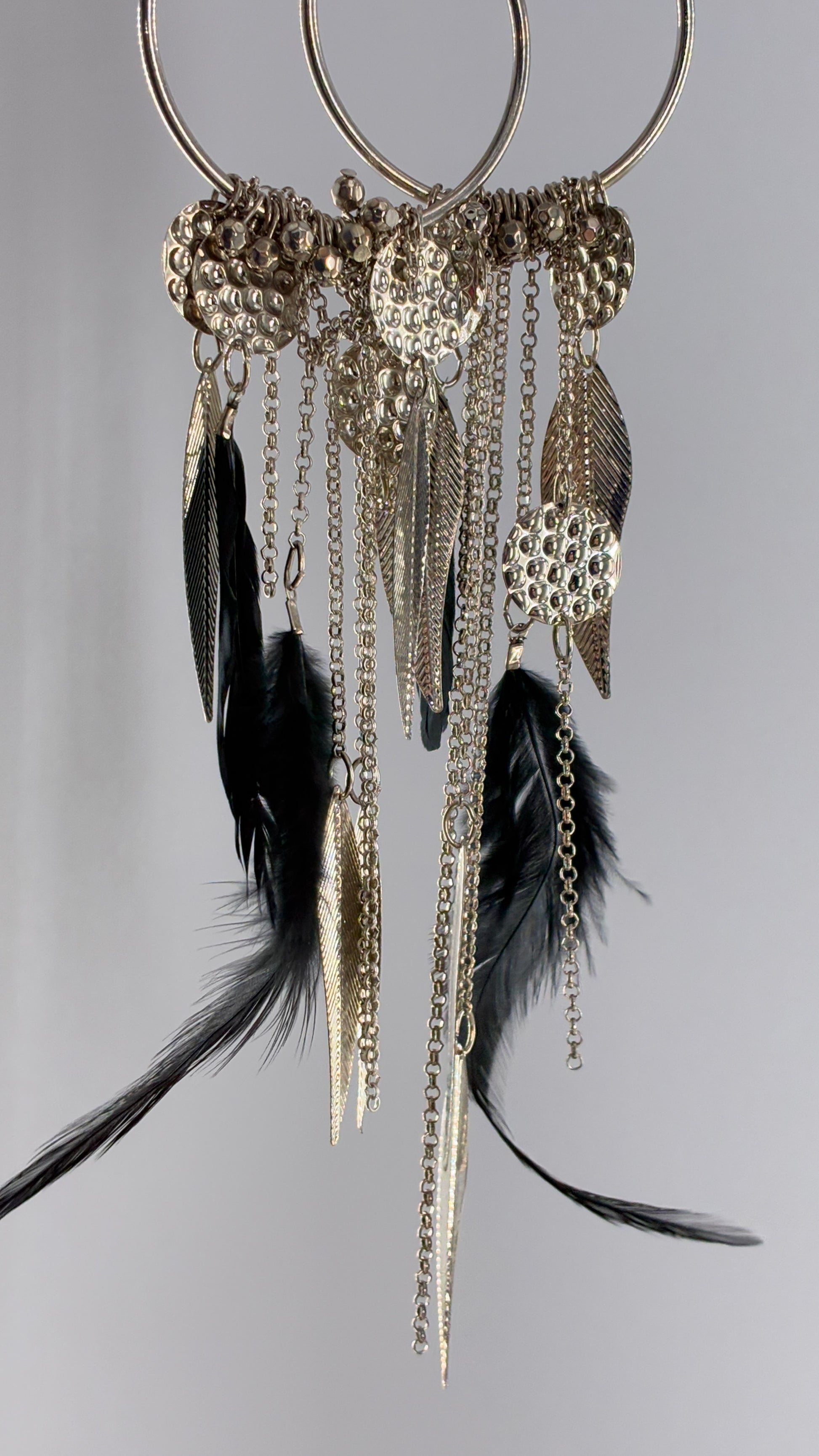 Vintage Hoop Earring with Chains, Feathers and Silver Metal Coins
