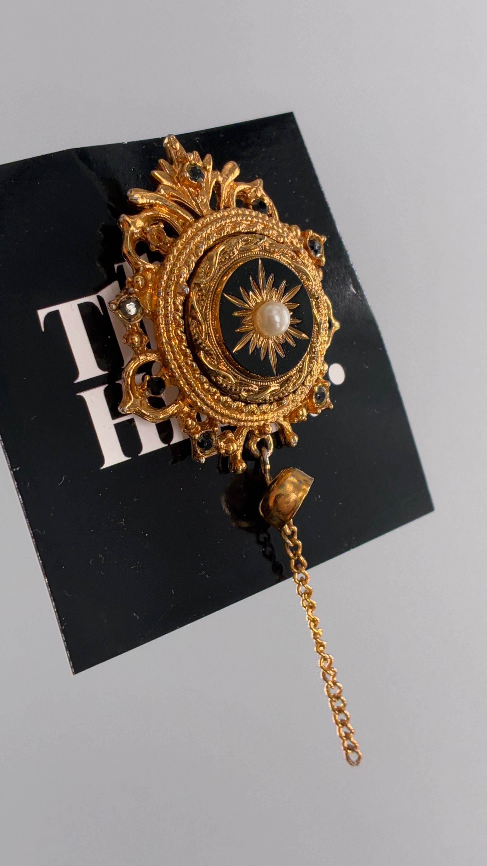 Vintage Victorian Revival Gold Brooch with Black Glass, Starburst Motif, Faux Pearl Centerpiece and Dangling Chain