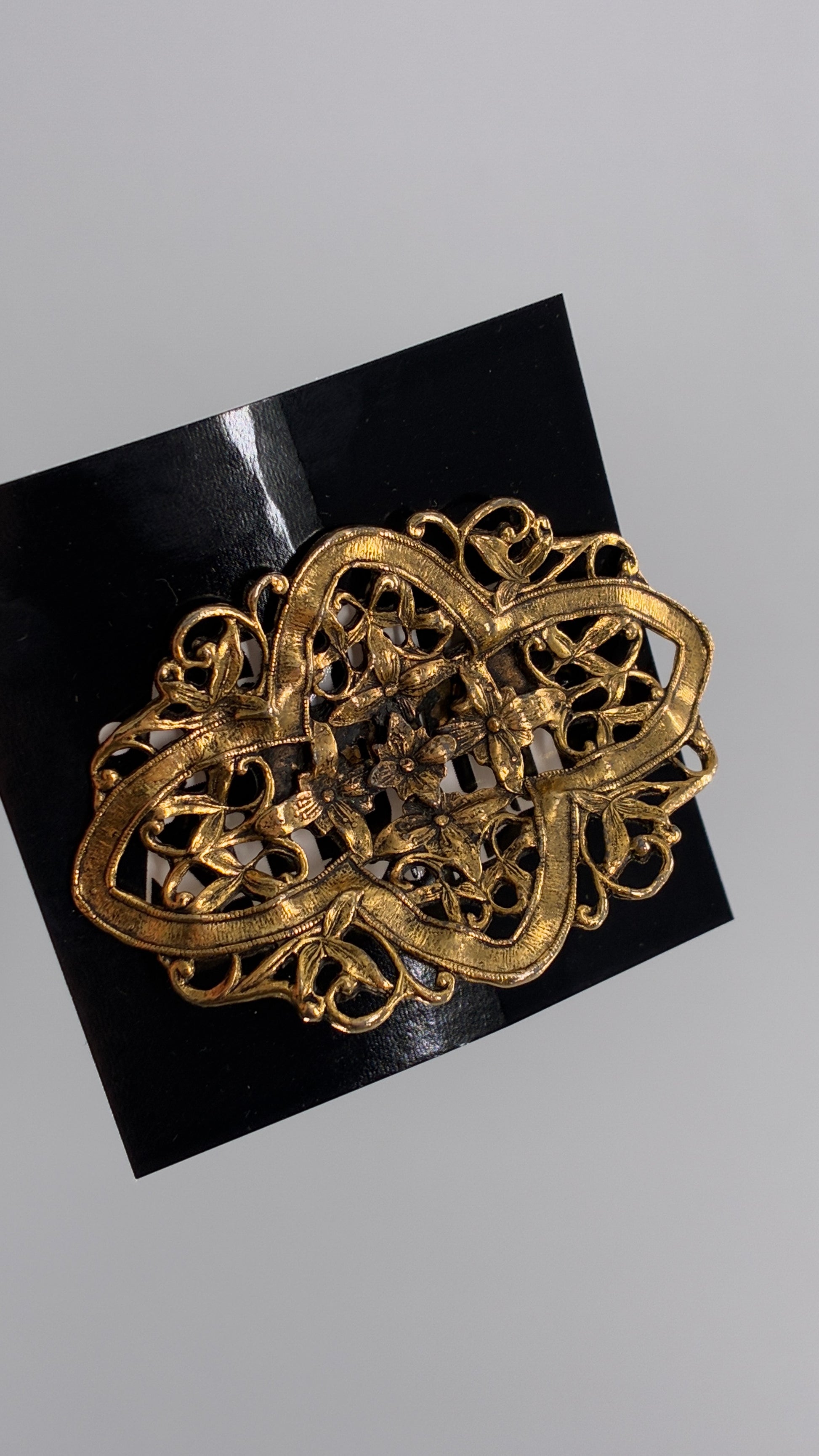 Vintage MUSI Ornate Gold French Buckle Engraved Flowers and Leaves