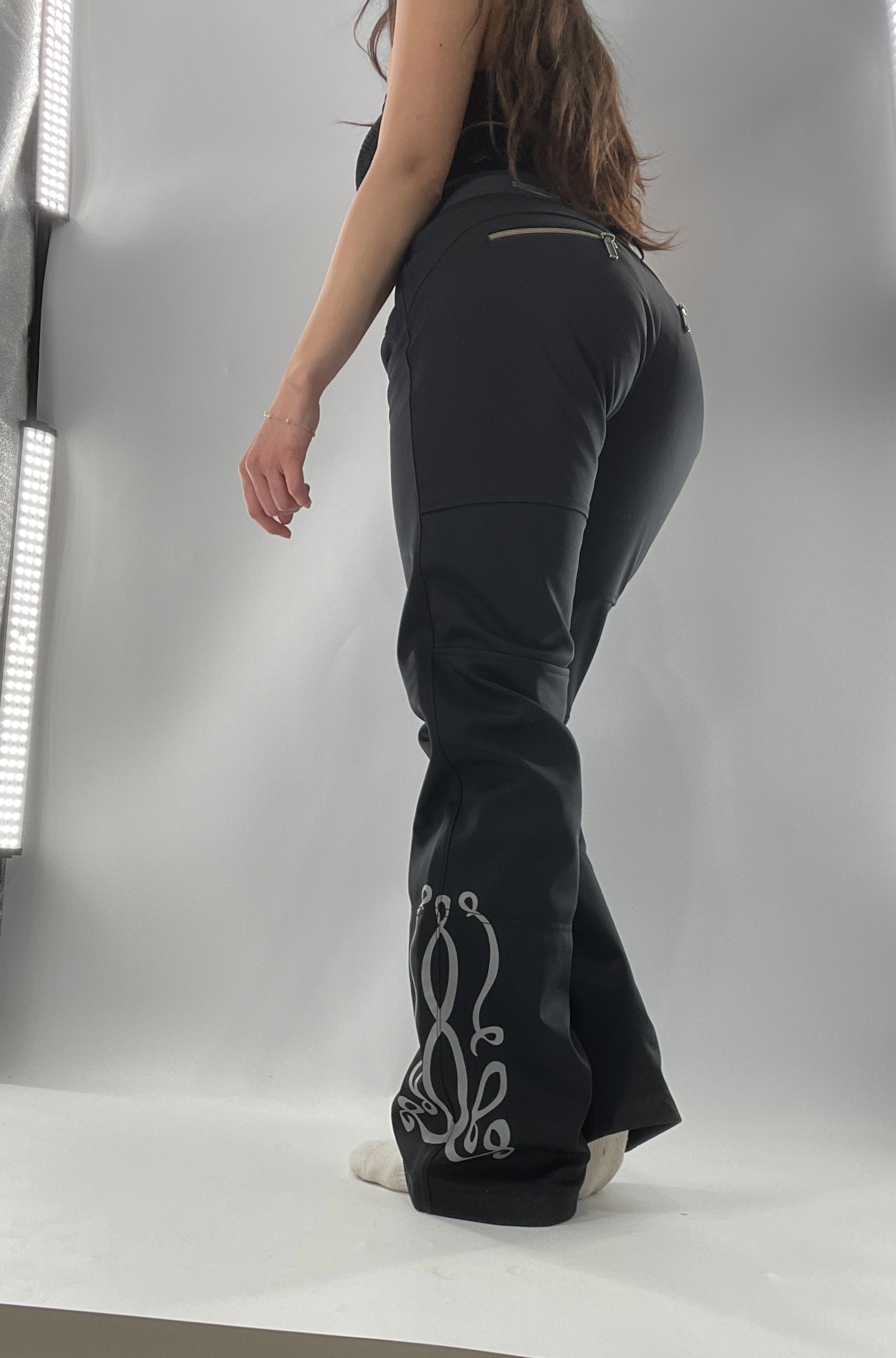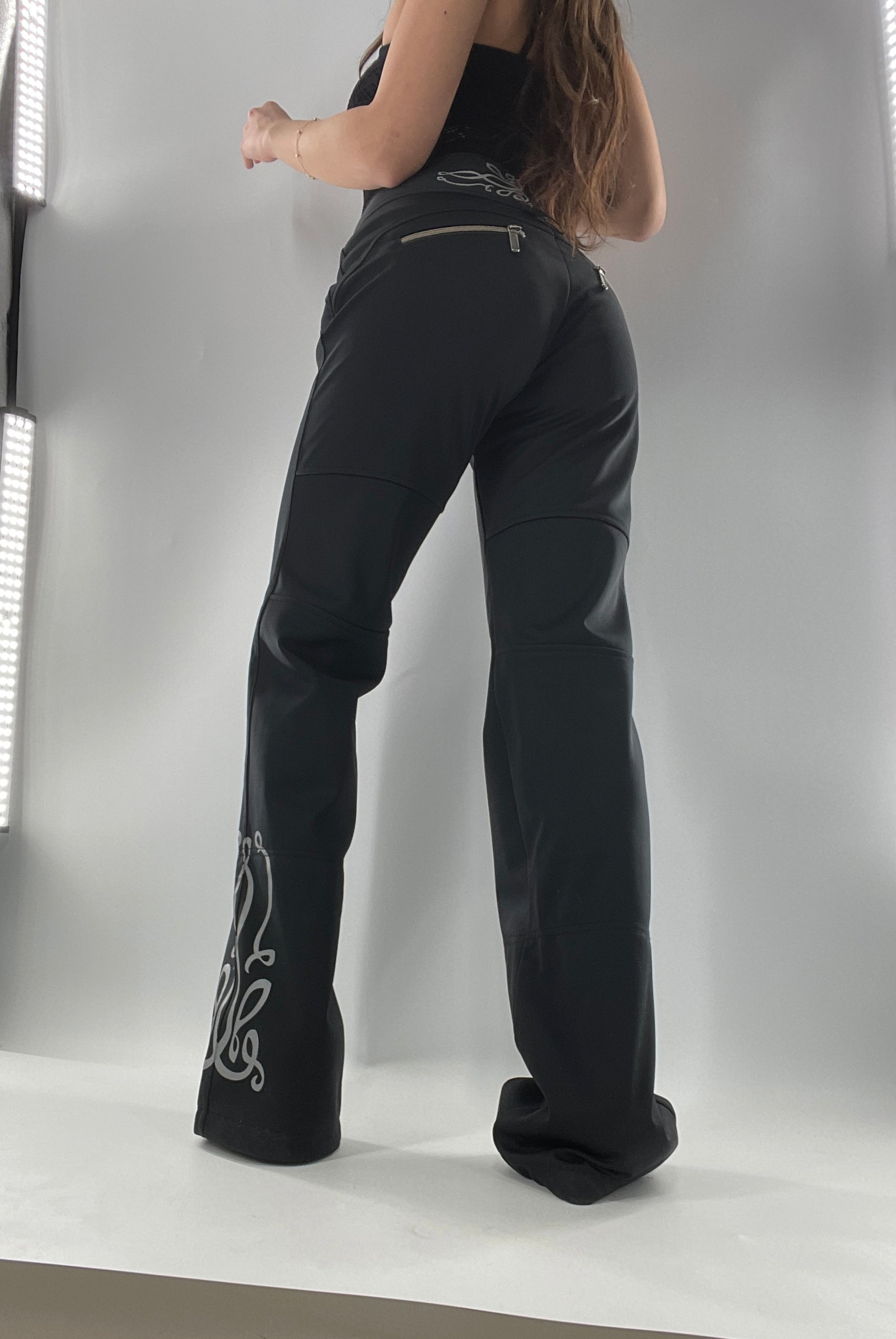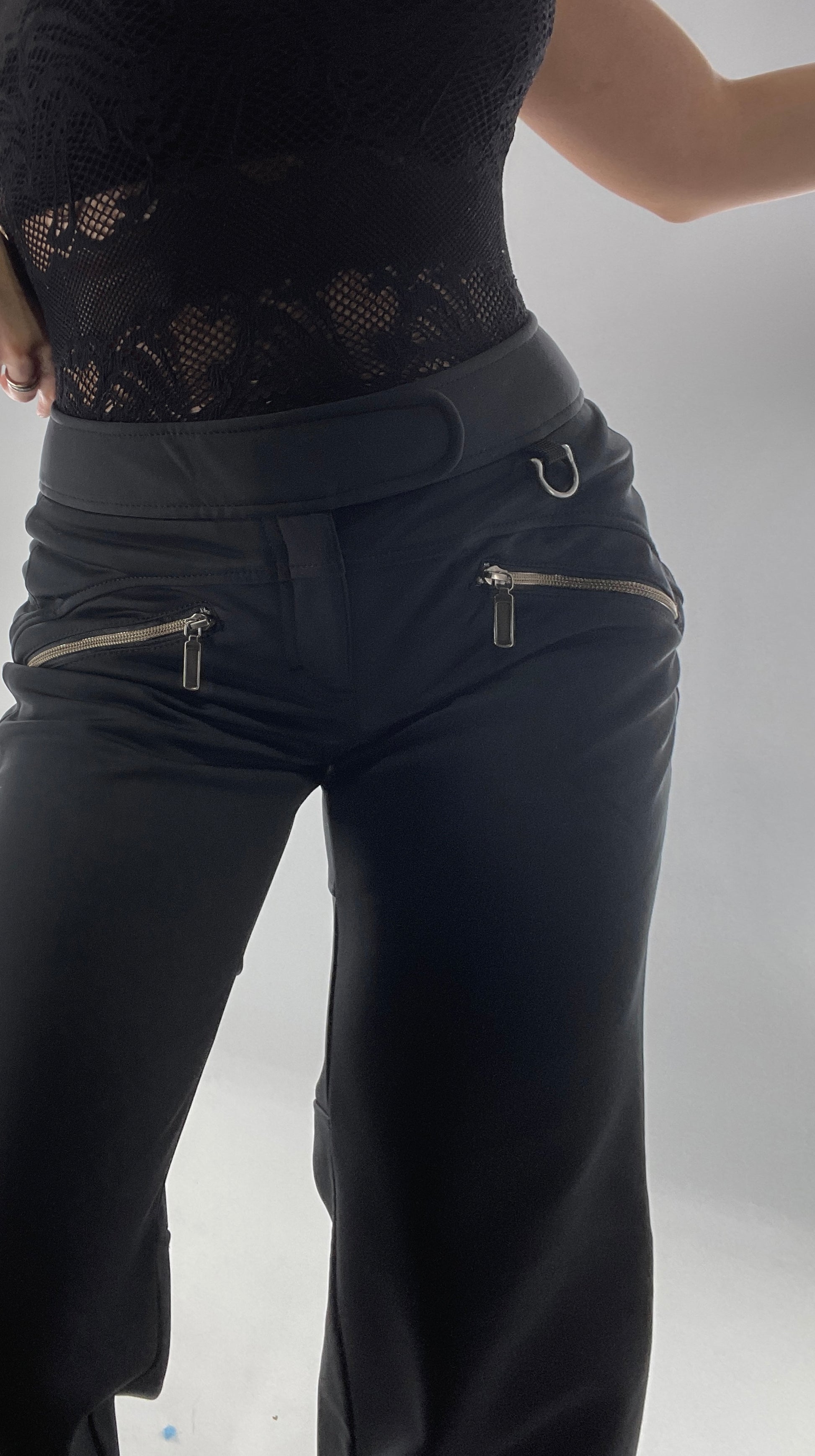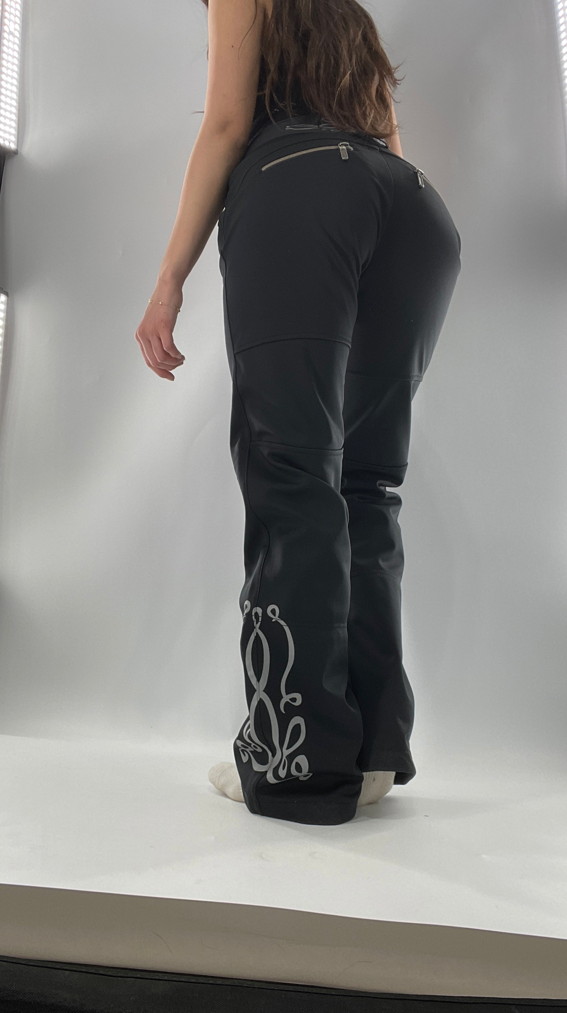 Vintage Athleta Flare 100% Nylon Black Pants with Side Clasps, Low Rise, Graphic on Back and Side of Leg (4)