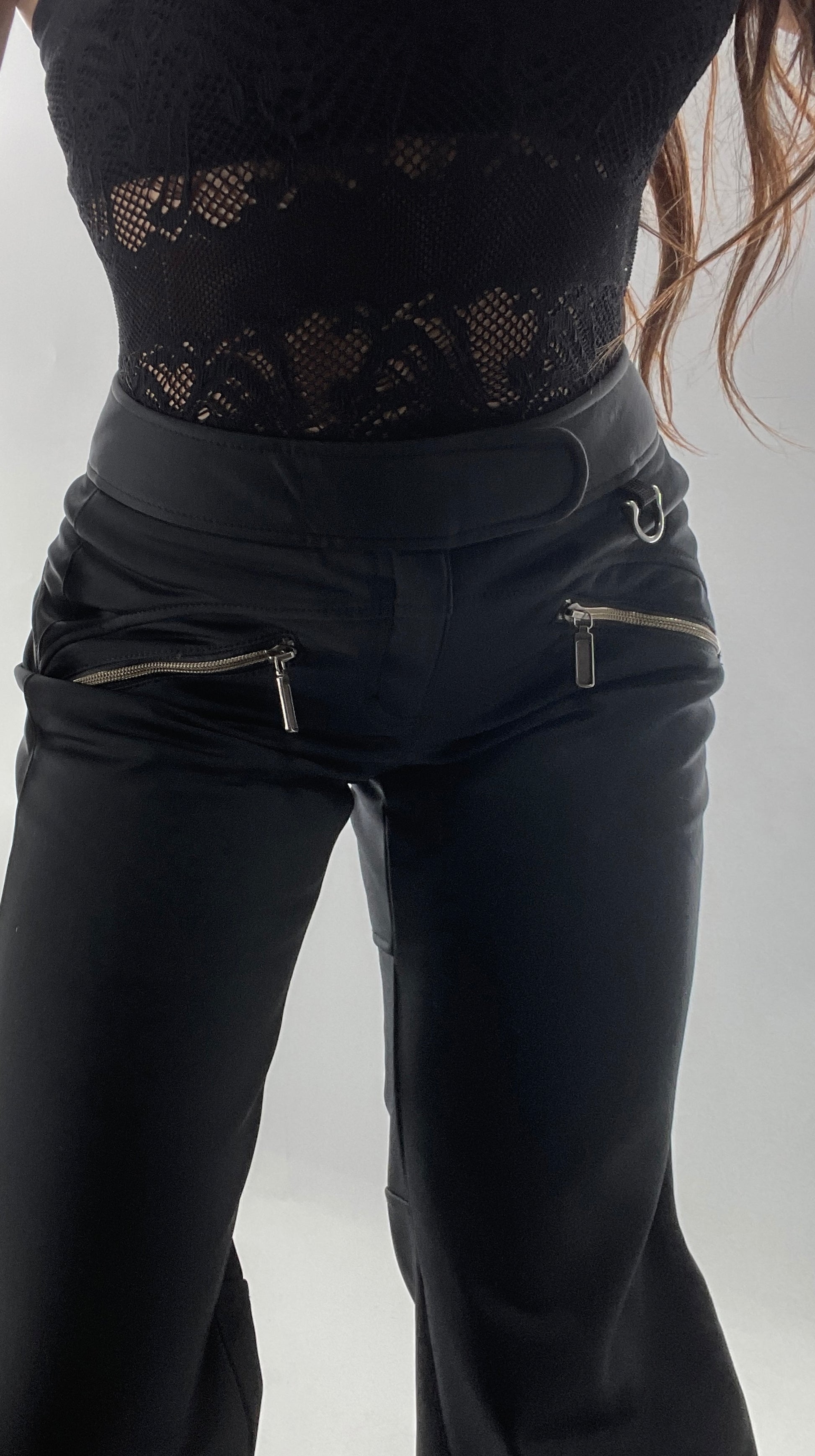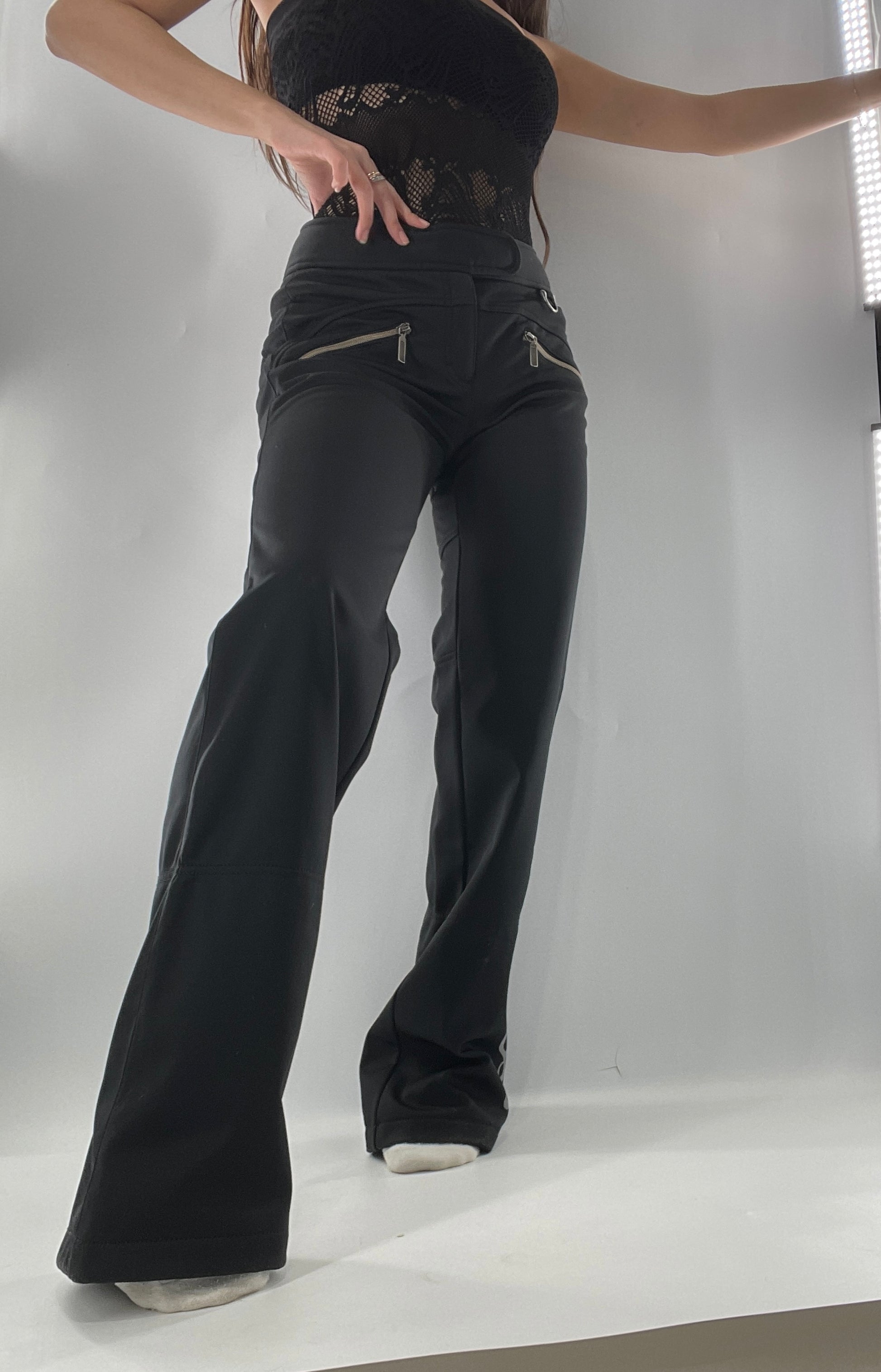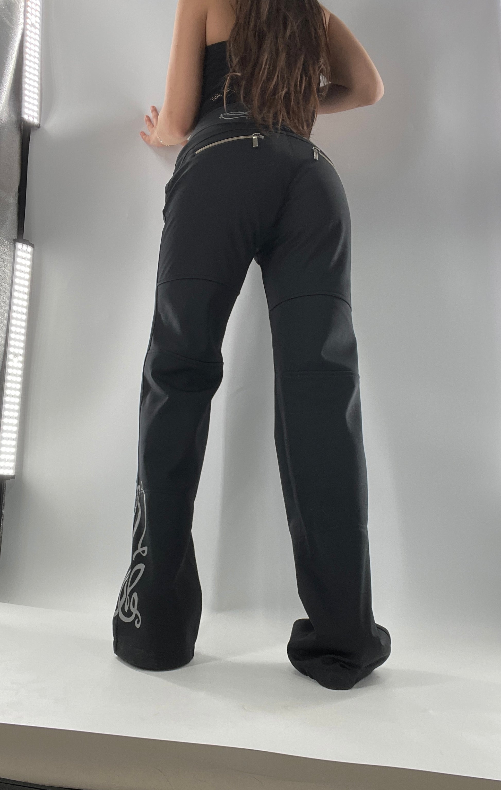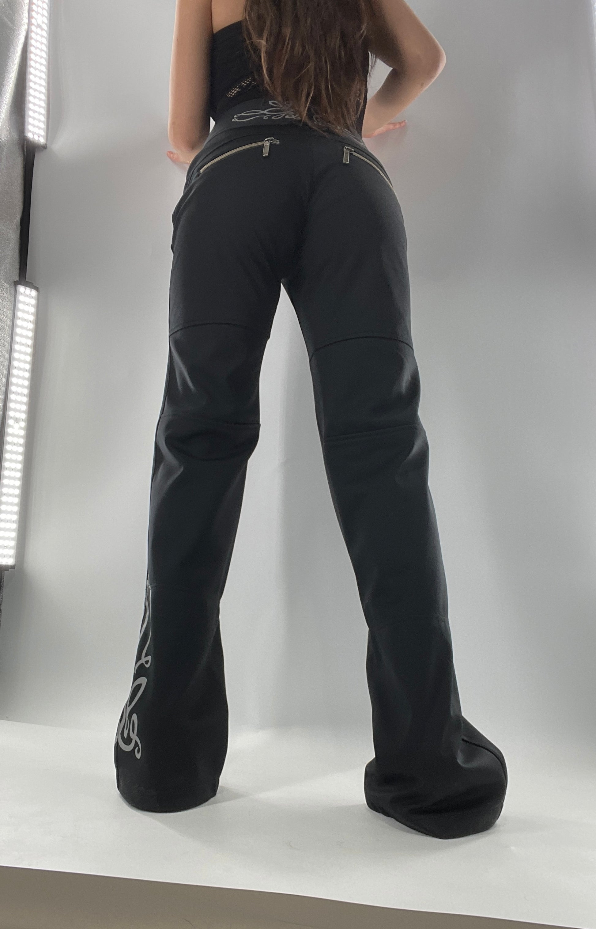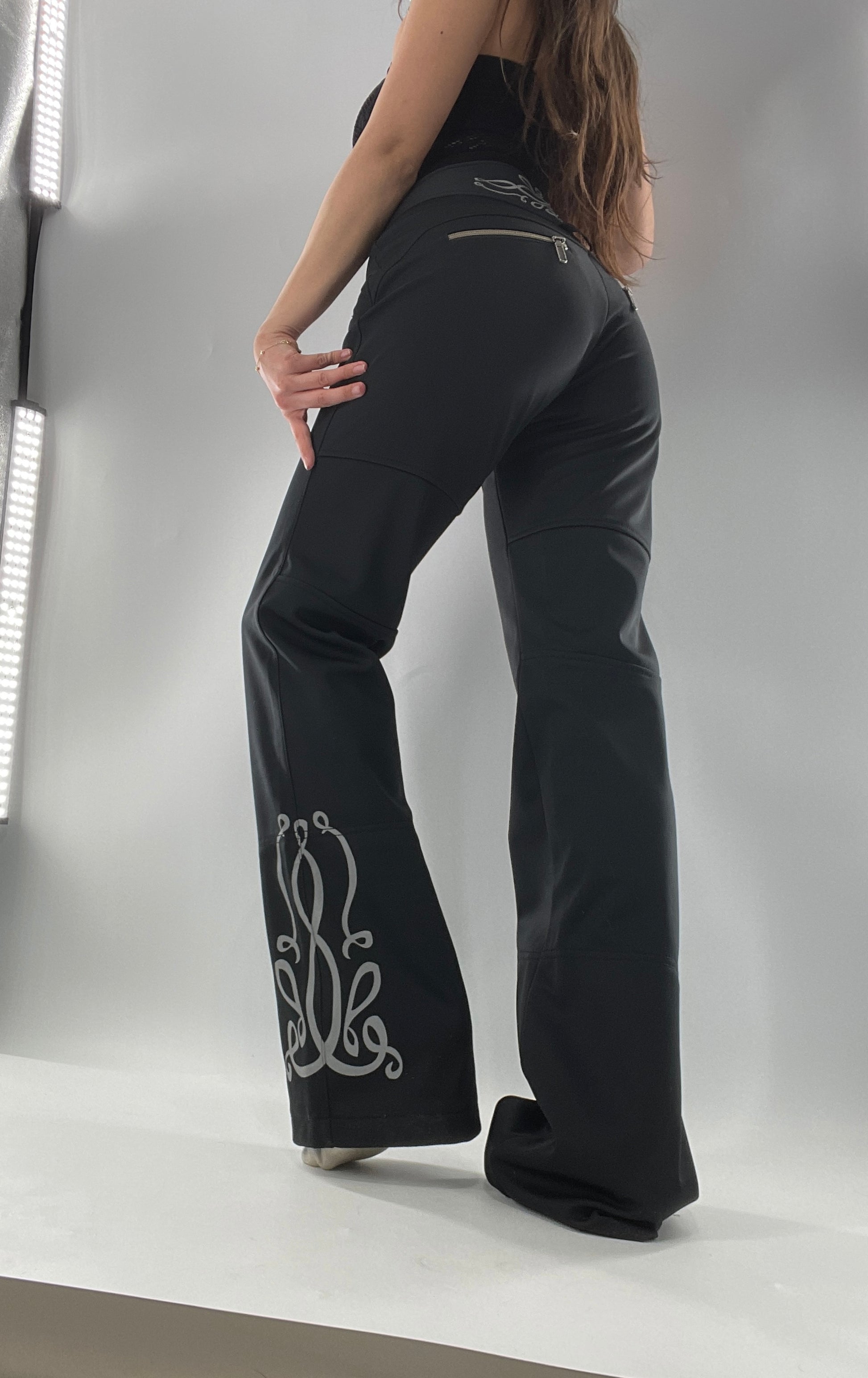 Vintage Athleta Flare 100% Nylon Black Pants with Side Clasps, Low Rise, Graphic on Back and Side of Leg (4)