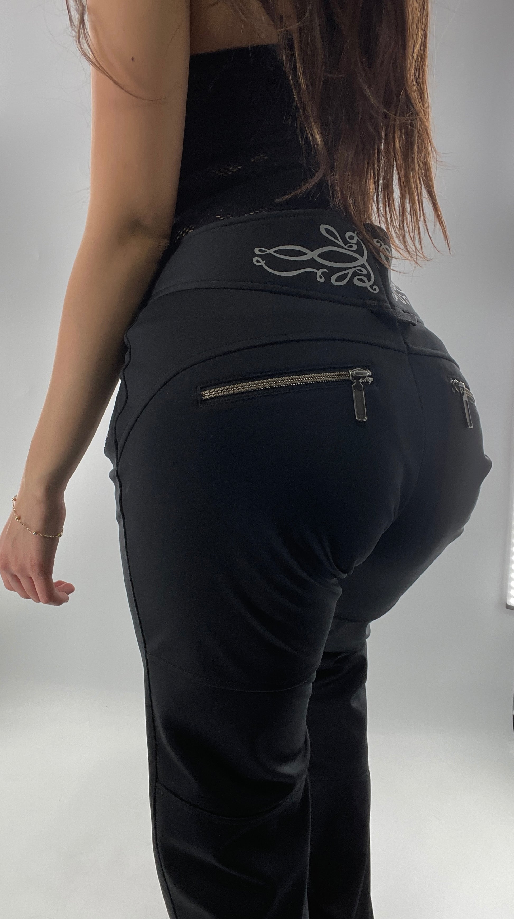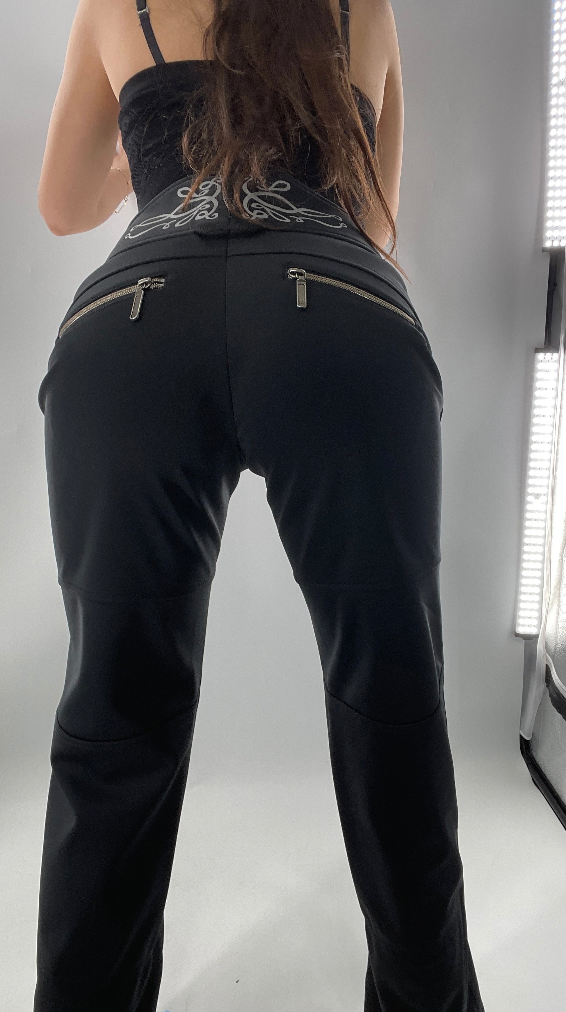 Vintage Athleta Flare 100% Nylon Thick Stretchy Black Pants with Side Clasps, Low Rise, Graphic on Back and Side of Leg (4)