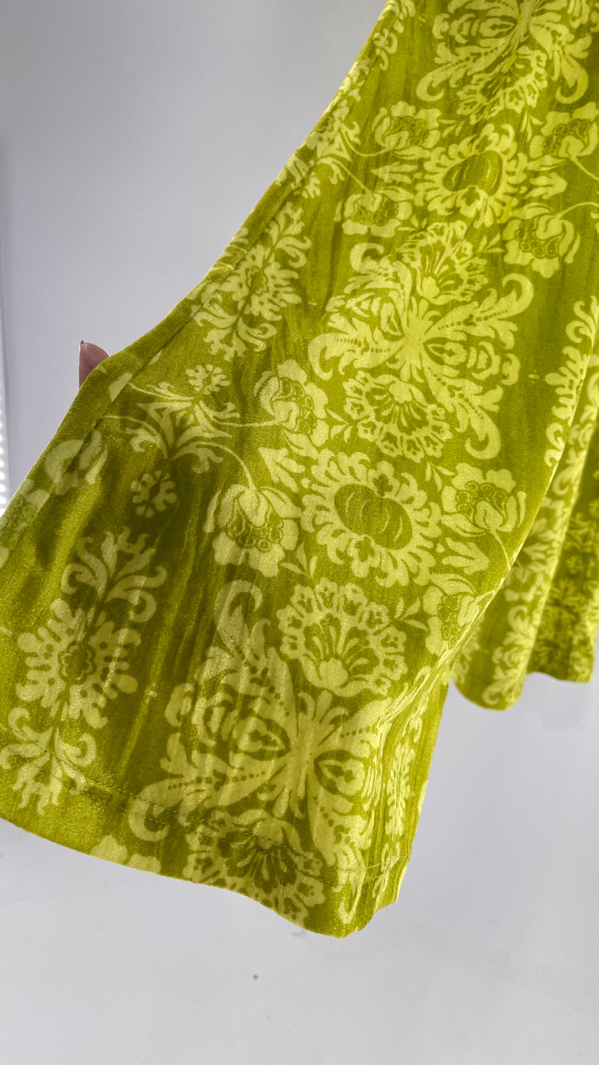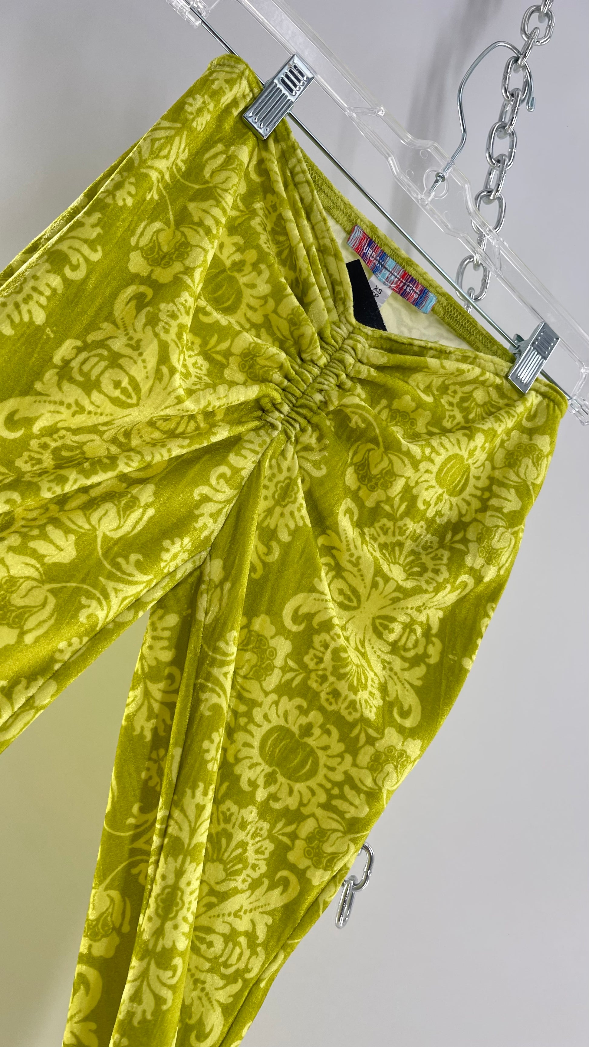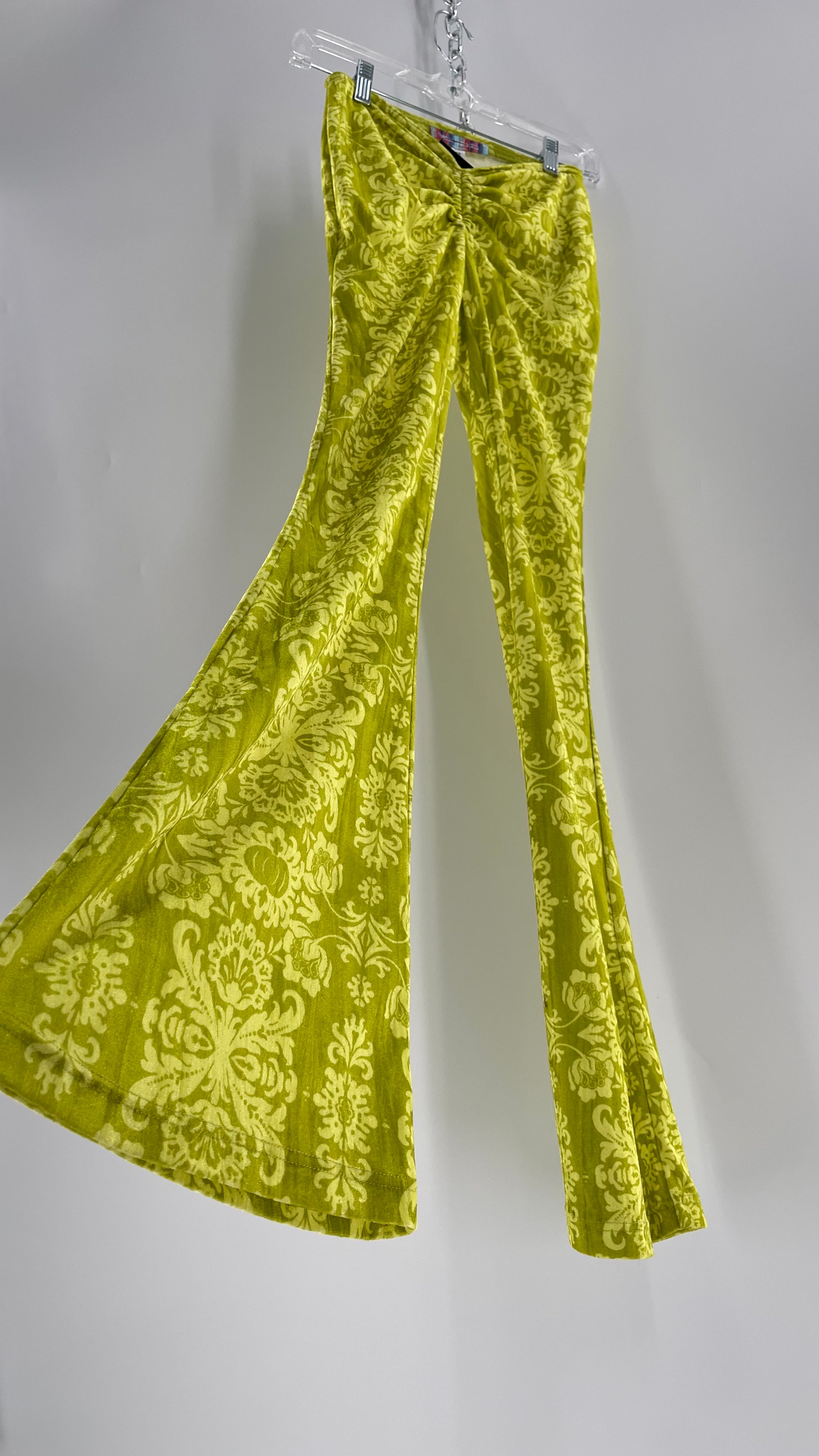 Urban Outfitters Chartreuse Green/Yellow Velvet Lace Patterned Flares with Scrunch Front (XS)