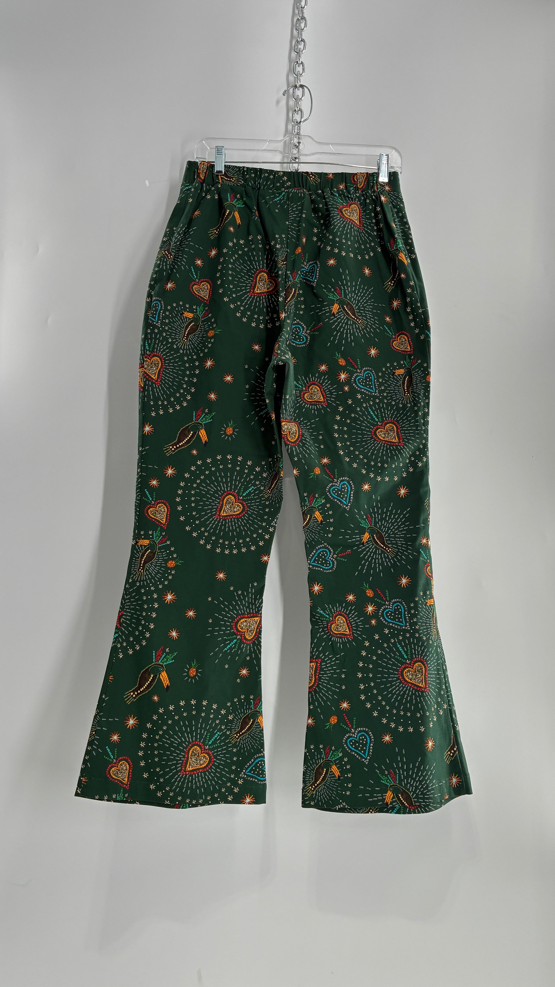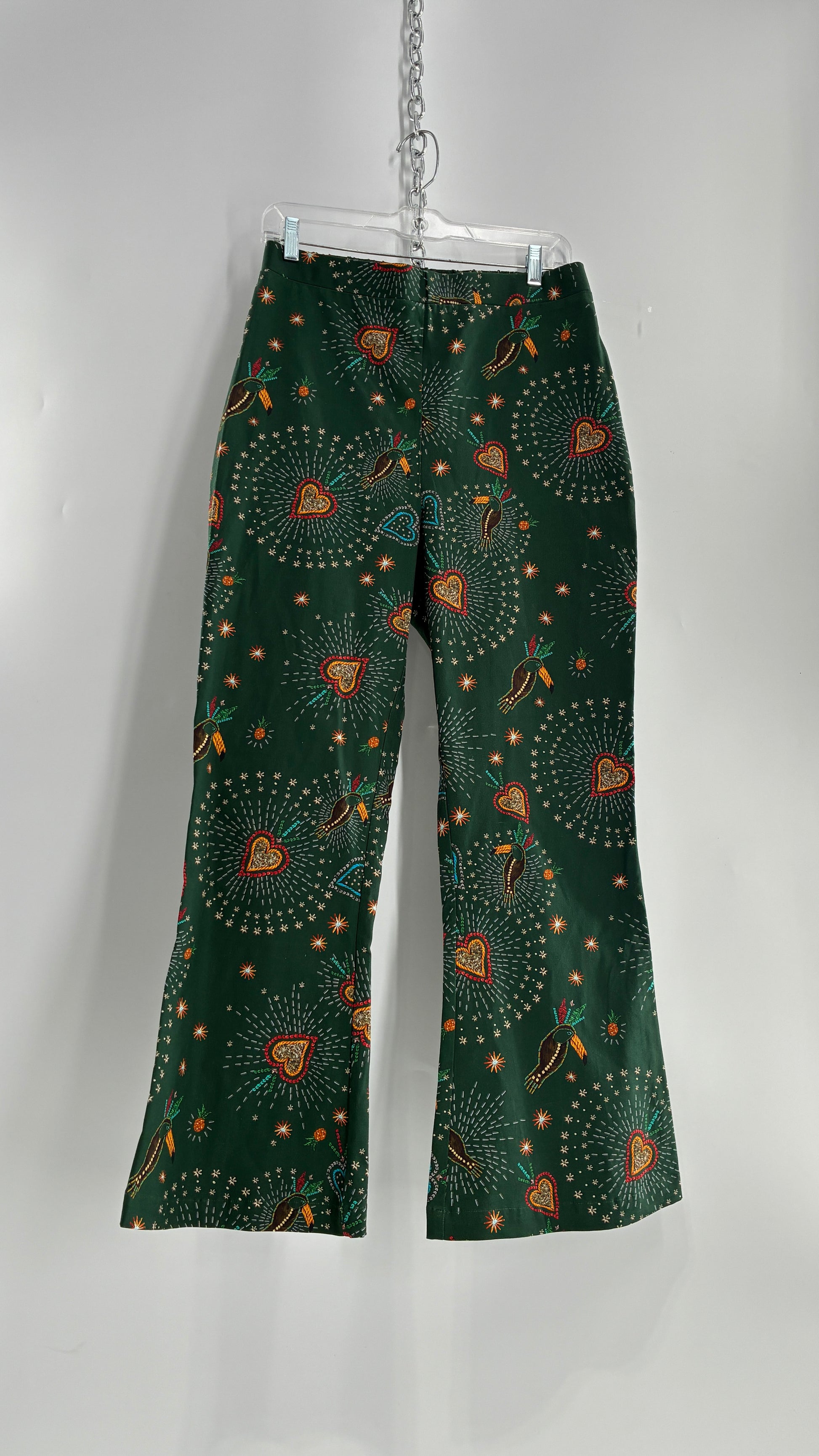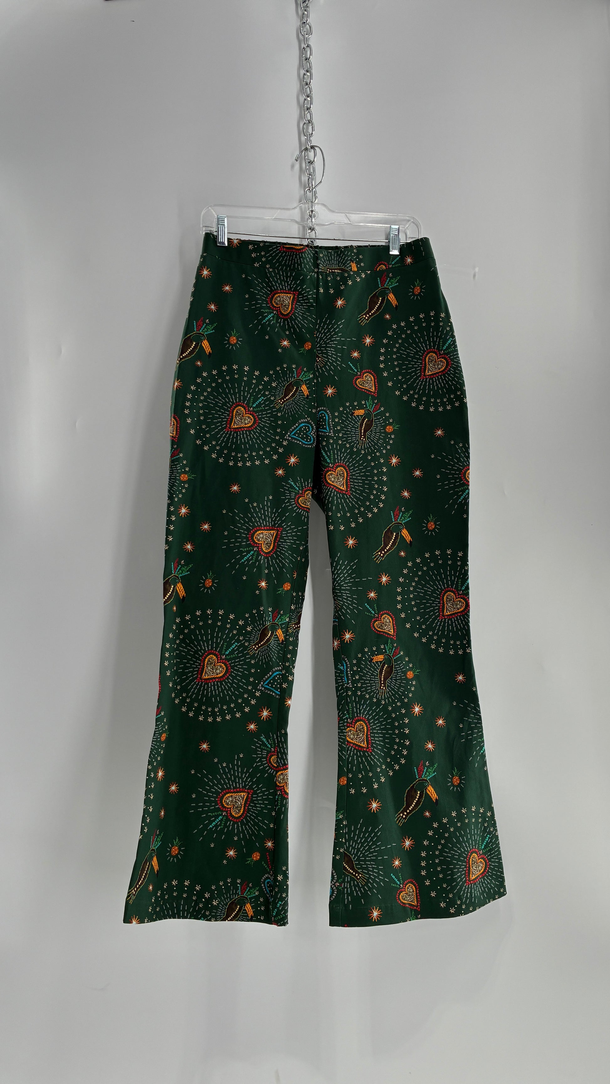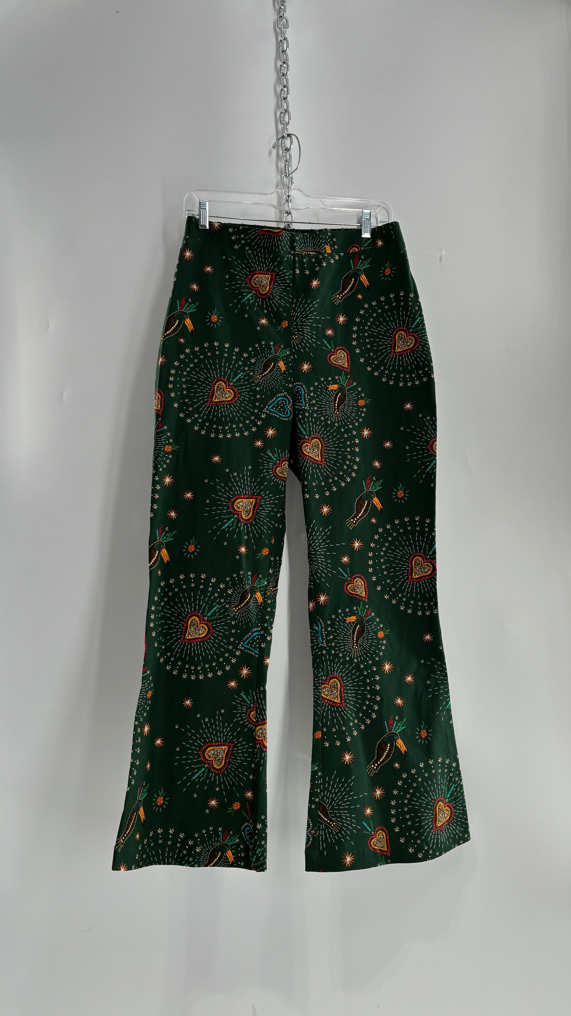 FARM RIO Forest Green Flared Fernanda Toucan Heart Patterned Pant