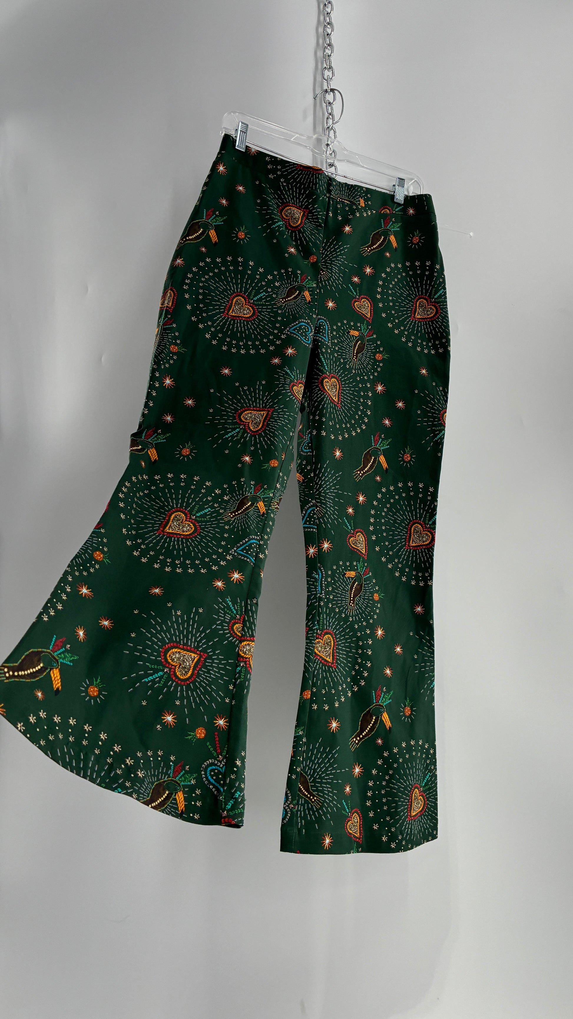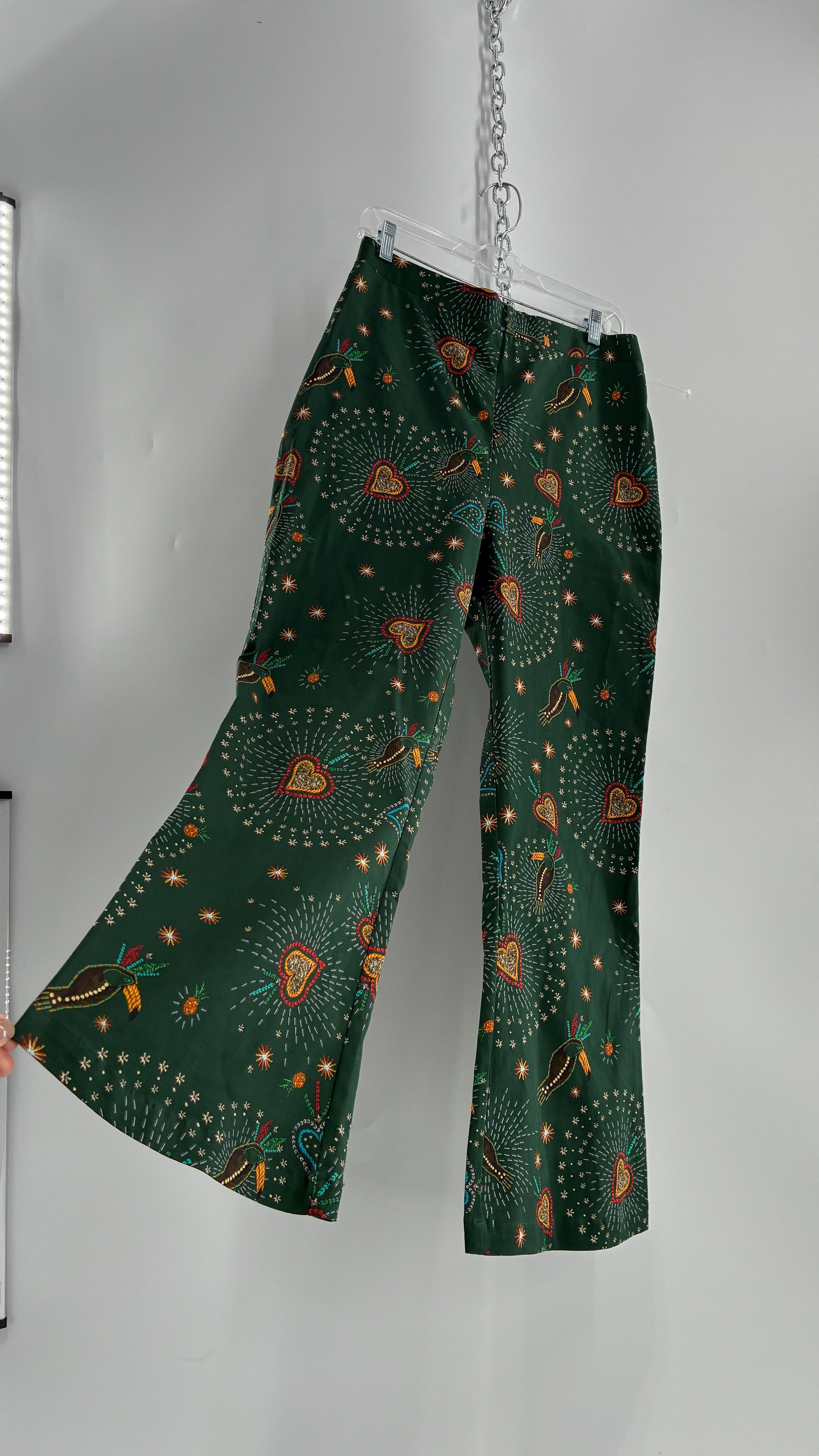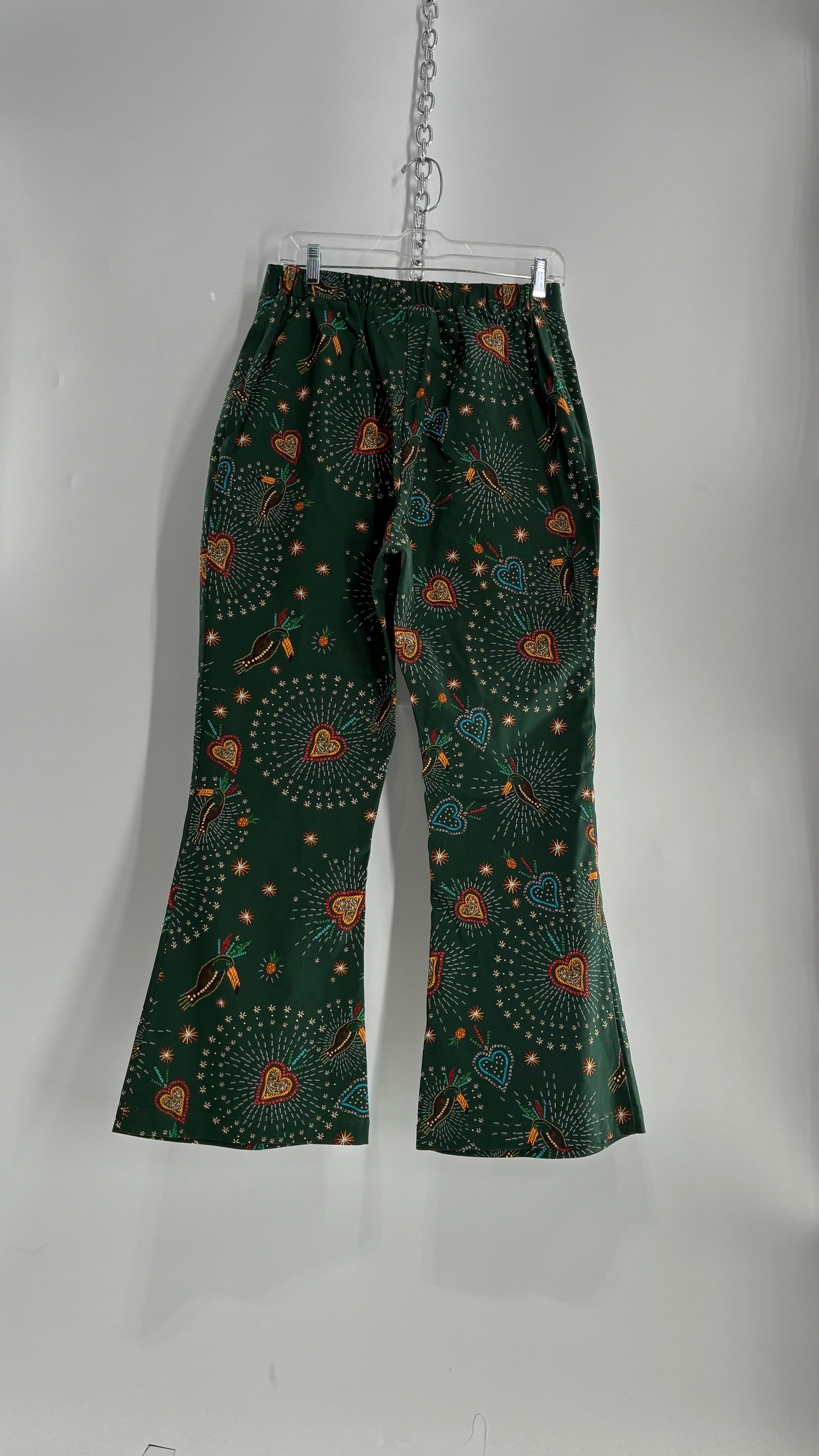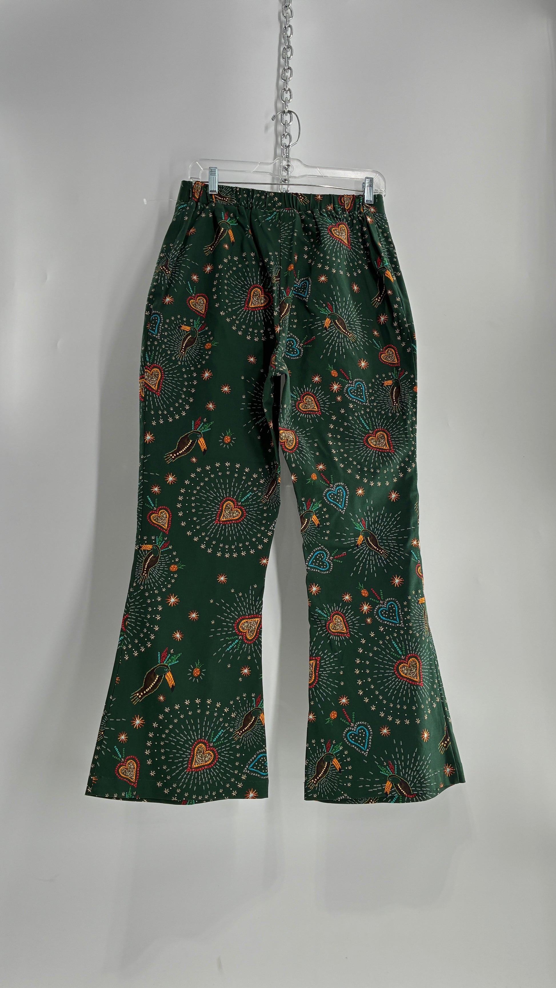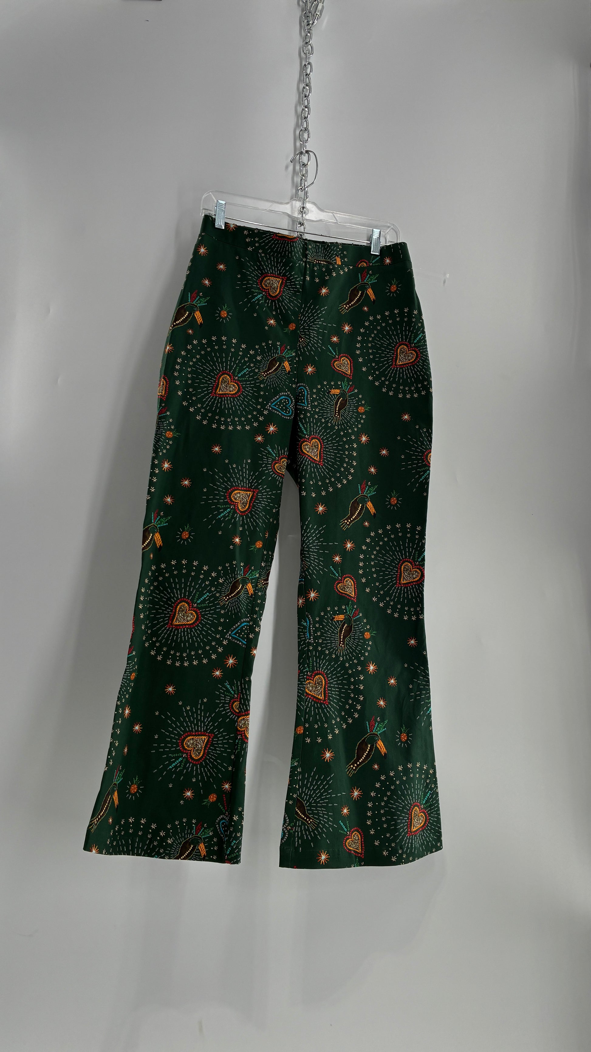 FARM RIO Forest Green Flared Fernanda Toucan Heart Patterned Pant