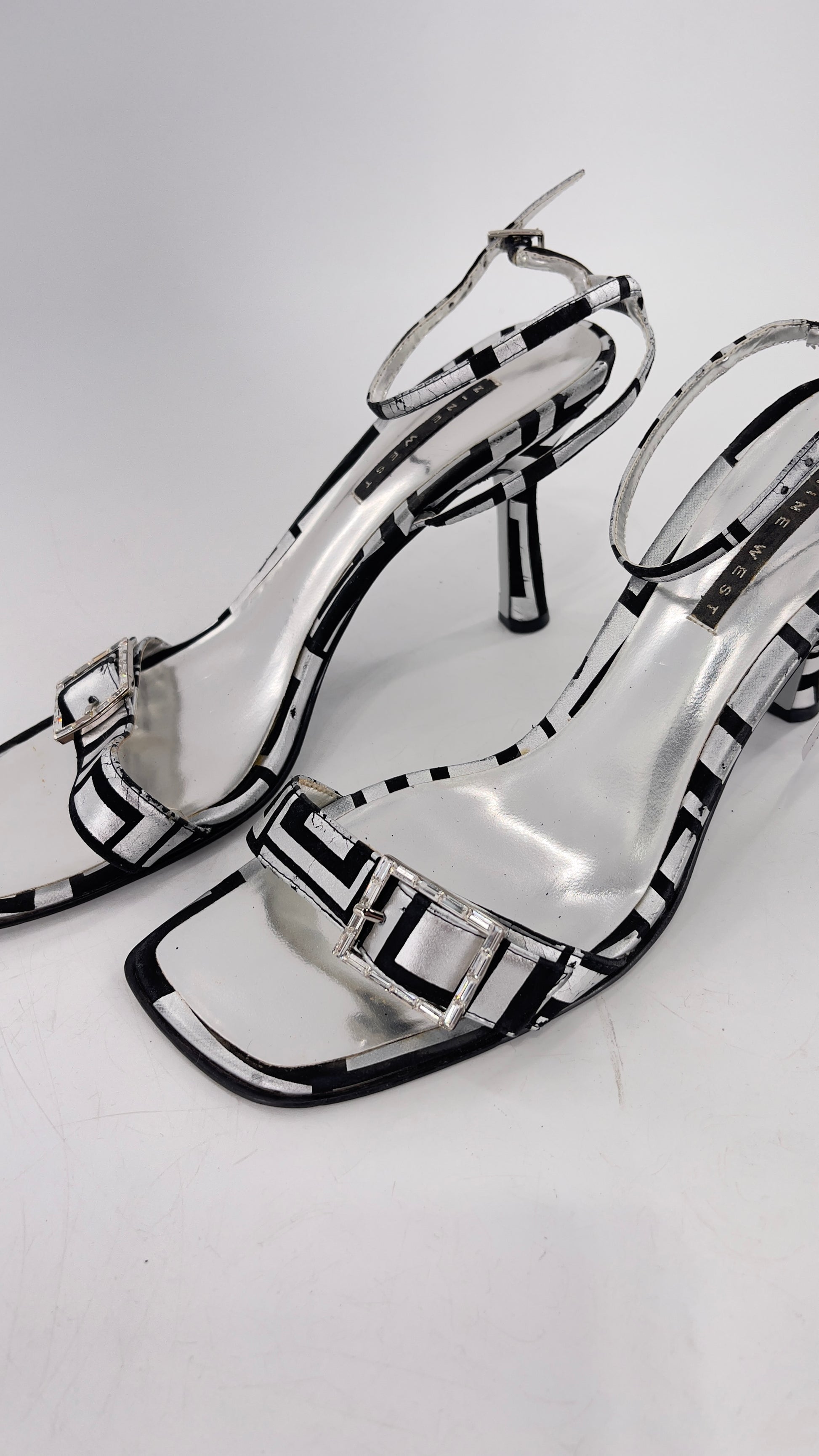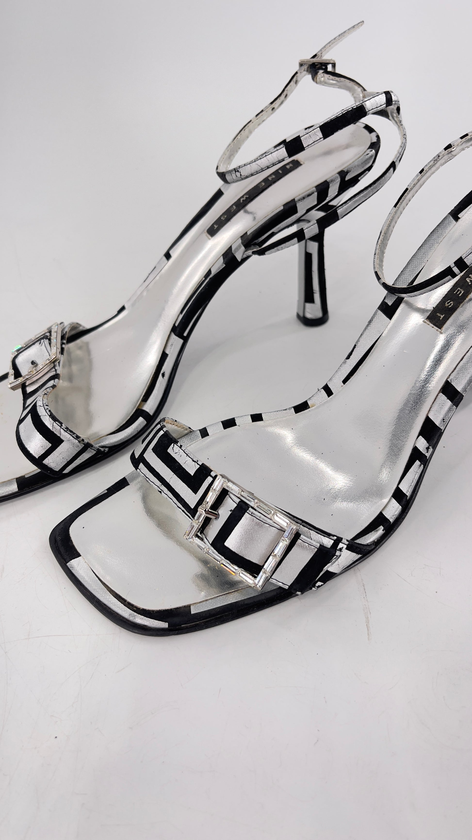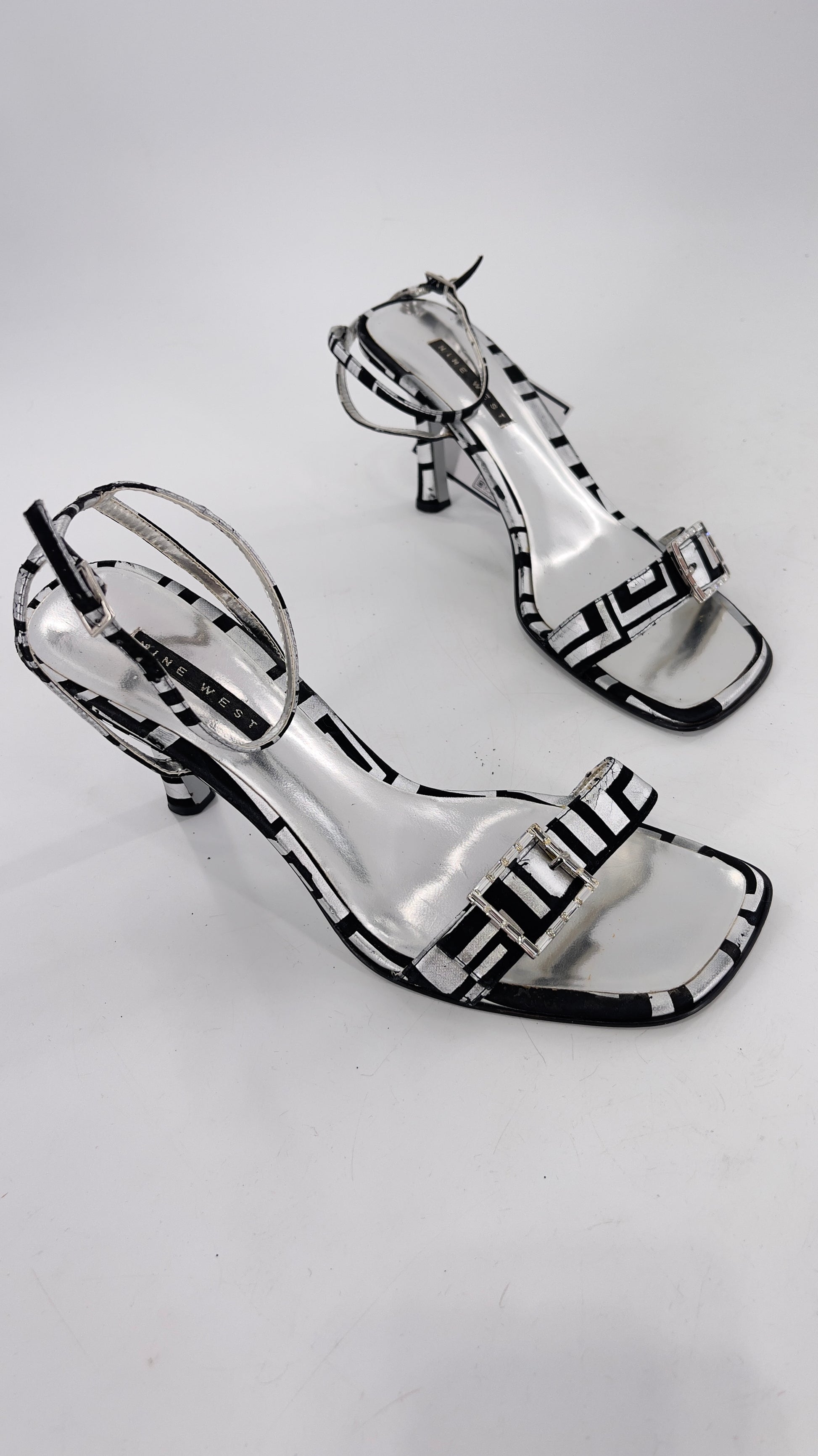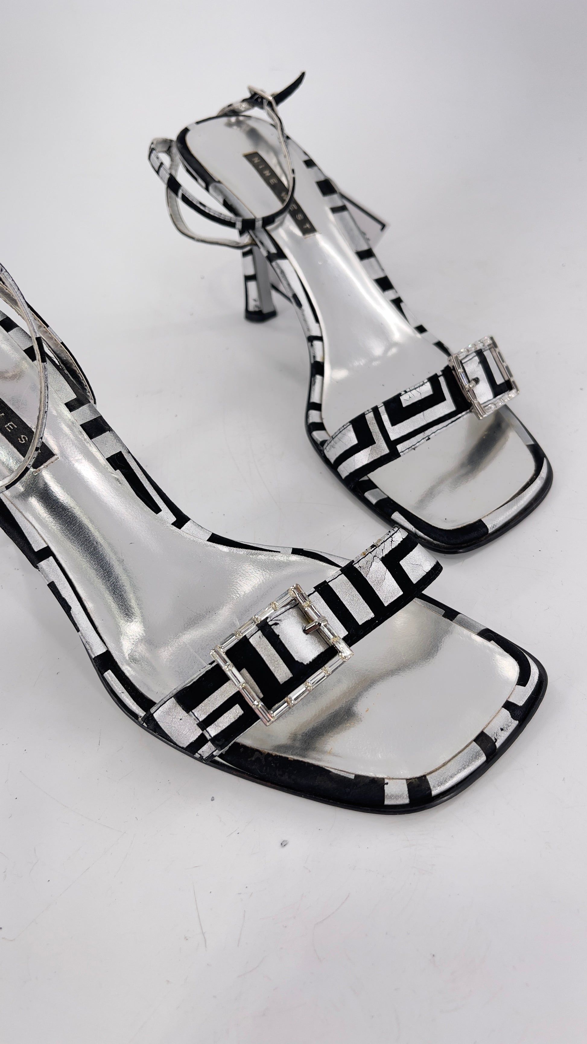 Vintage 1990s Nine West Square Toe Rhinestone Buckle Heel(10) in geometric silver/black pattern