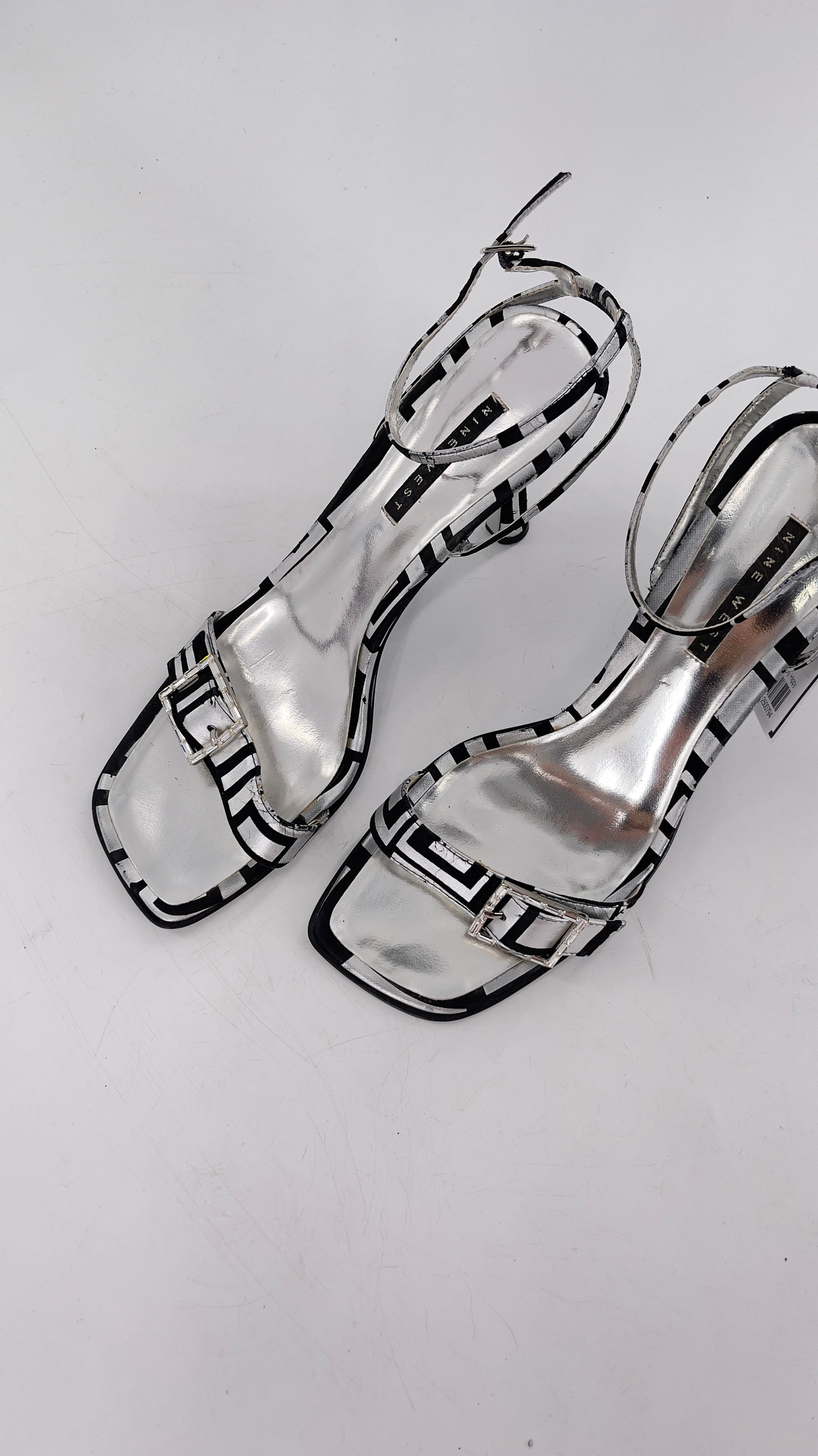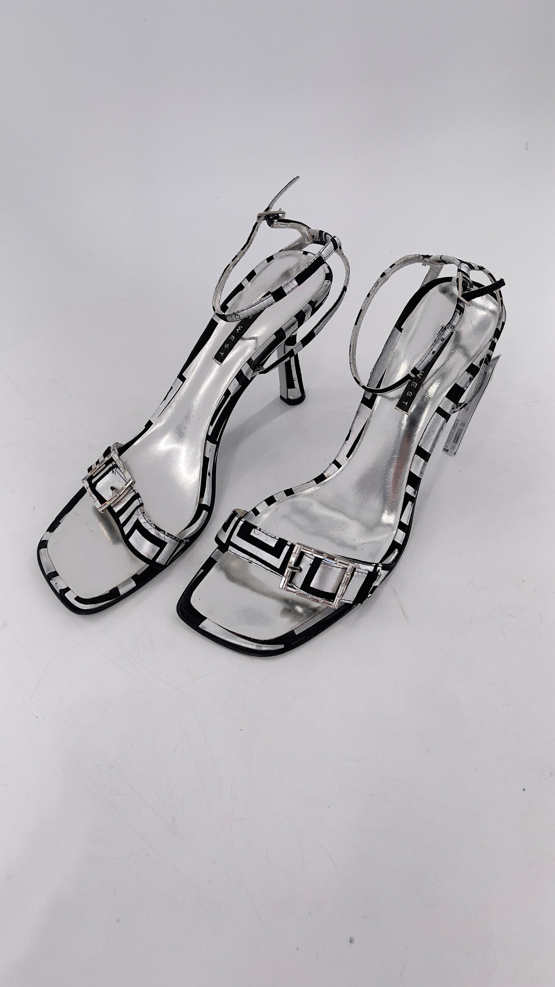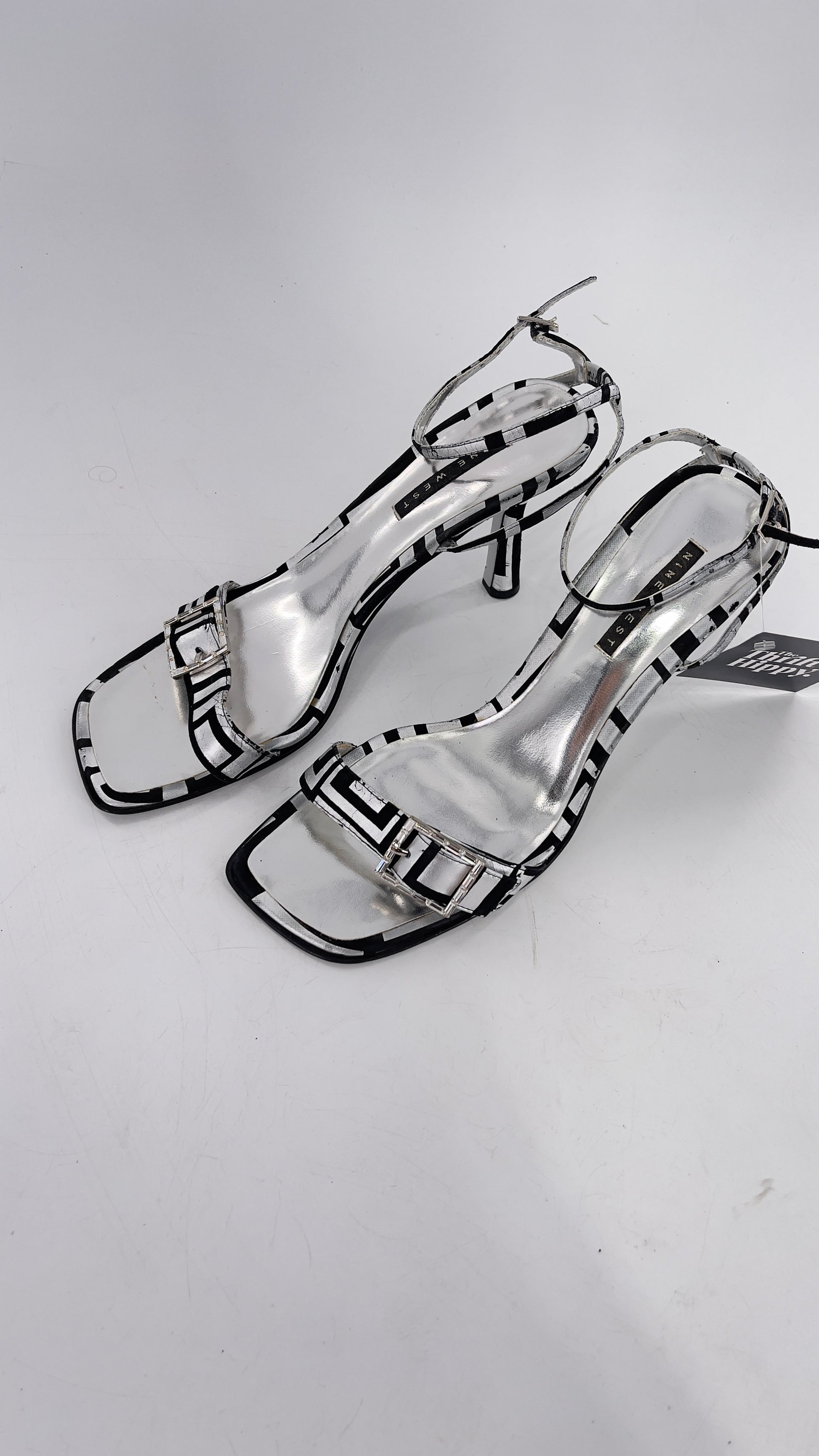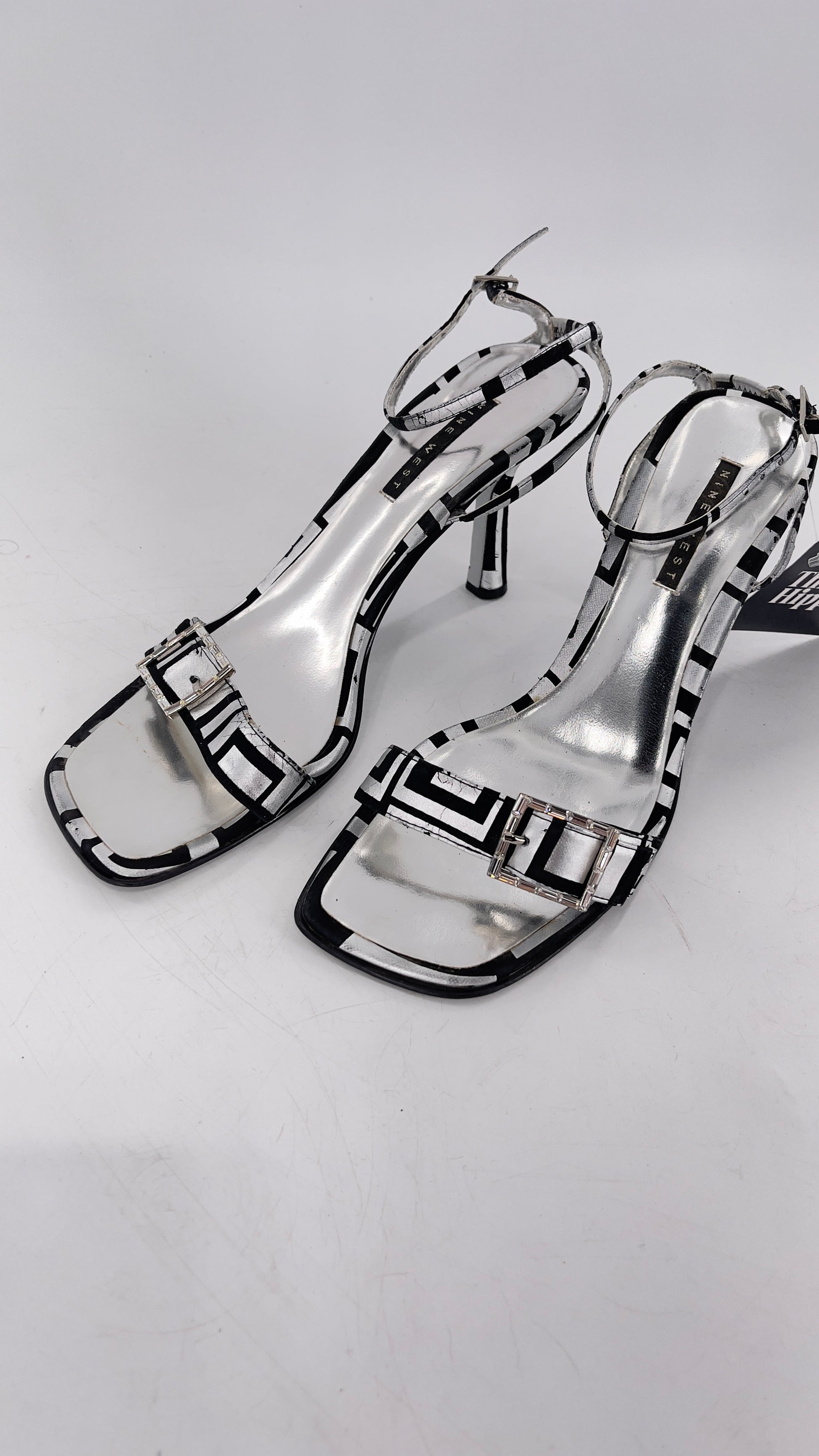 Vintage 1990s Nine West Square Toe Rhinestone Buckle Heel(10) in geometric silver/black pattern