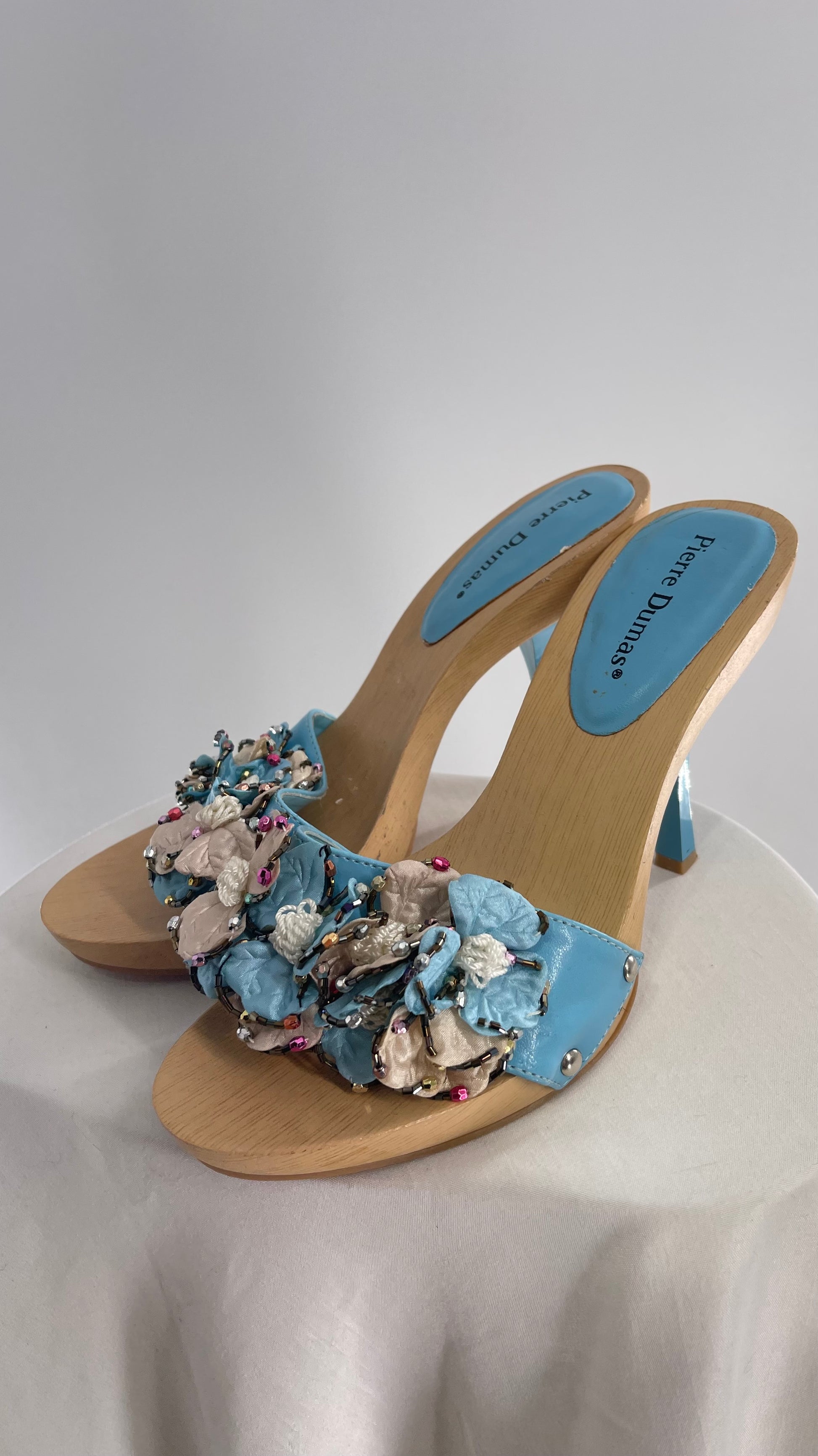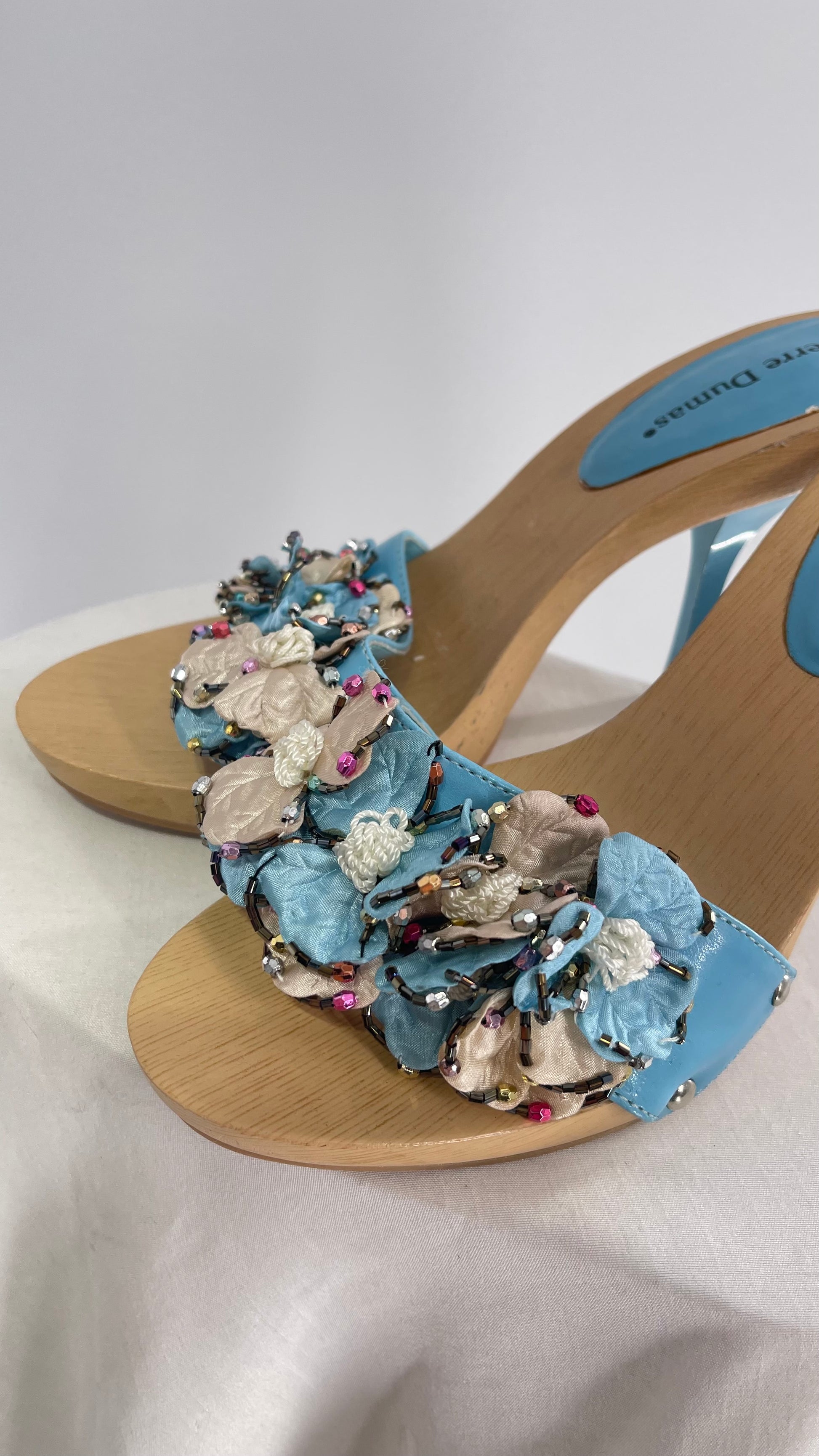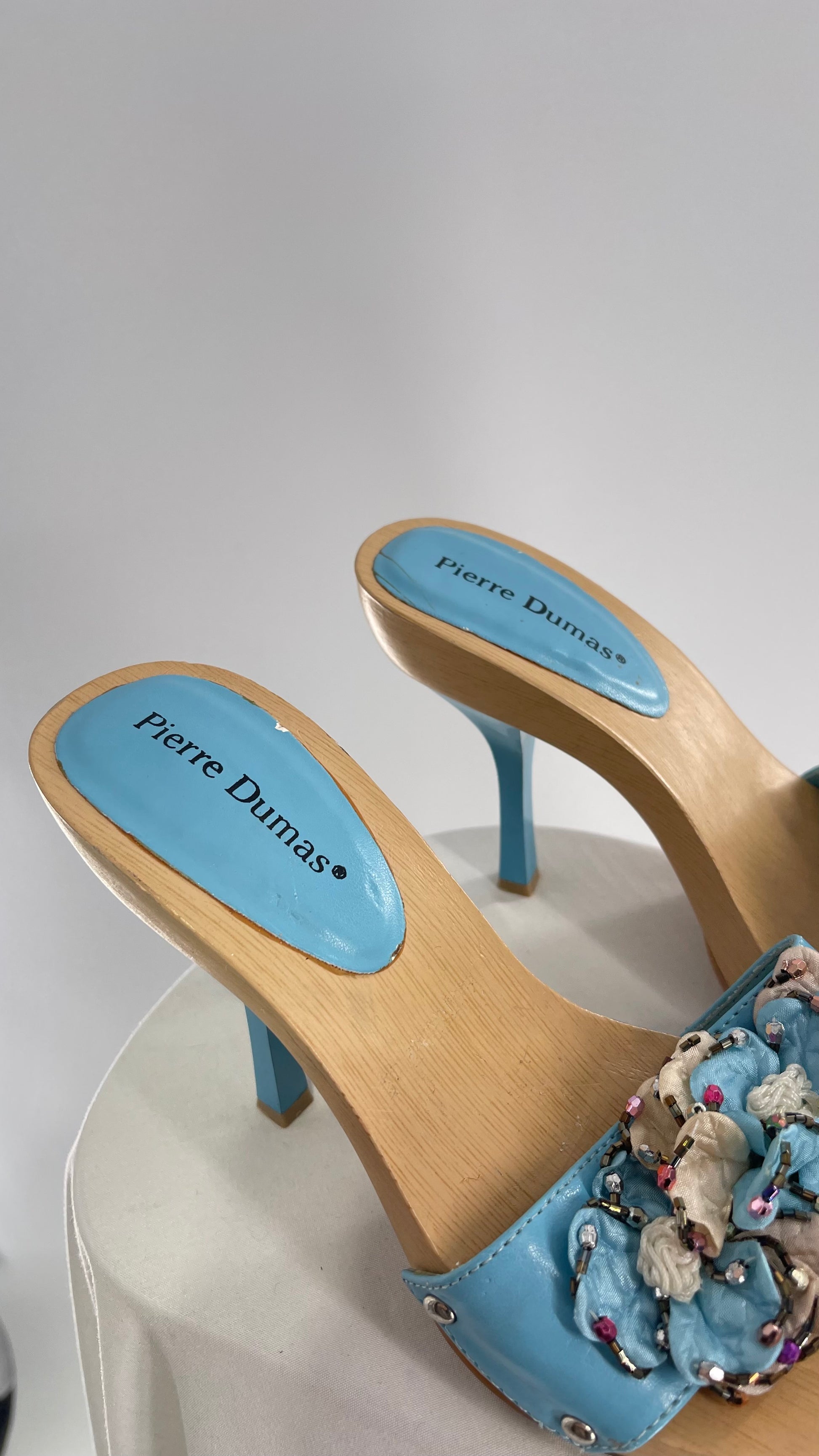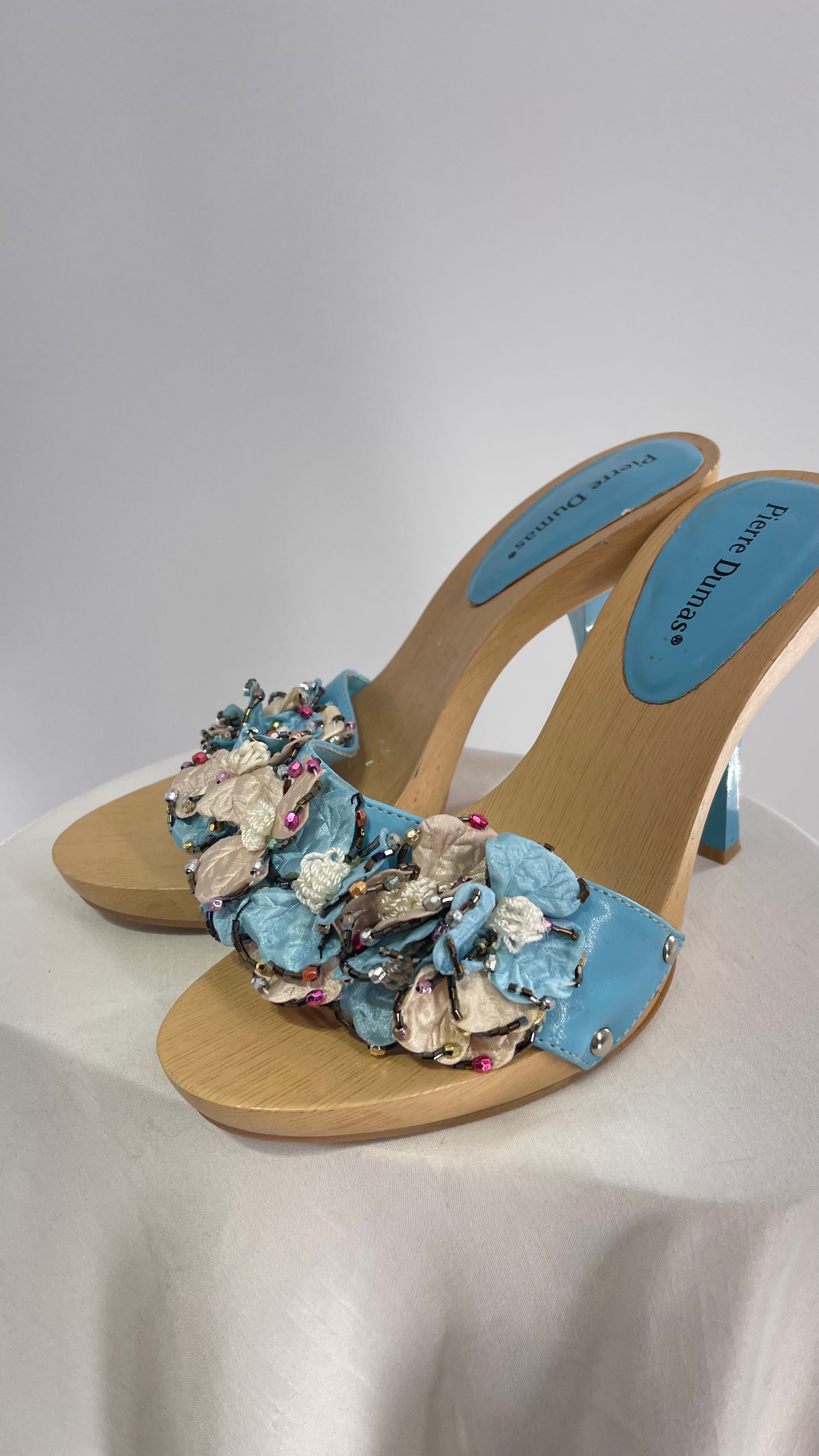 Pierre Dumas Baby Blue Wooden Heel with Beaded Floral Appliqués