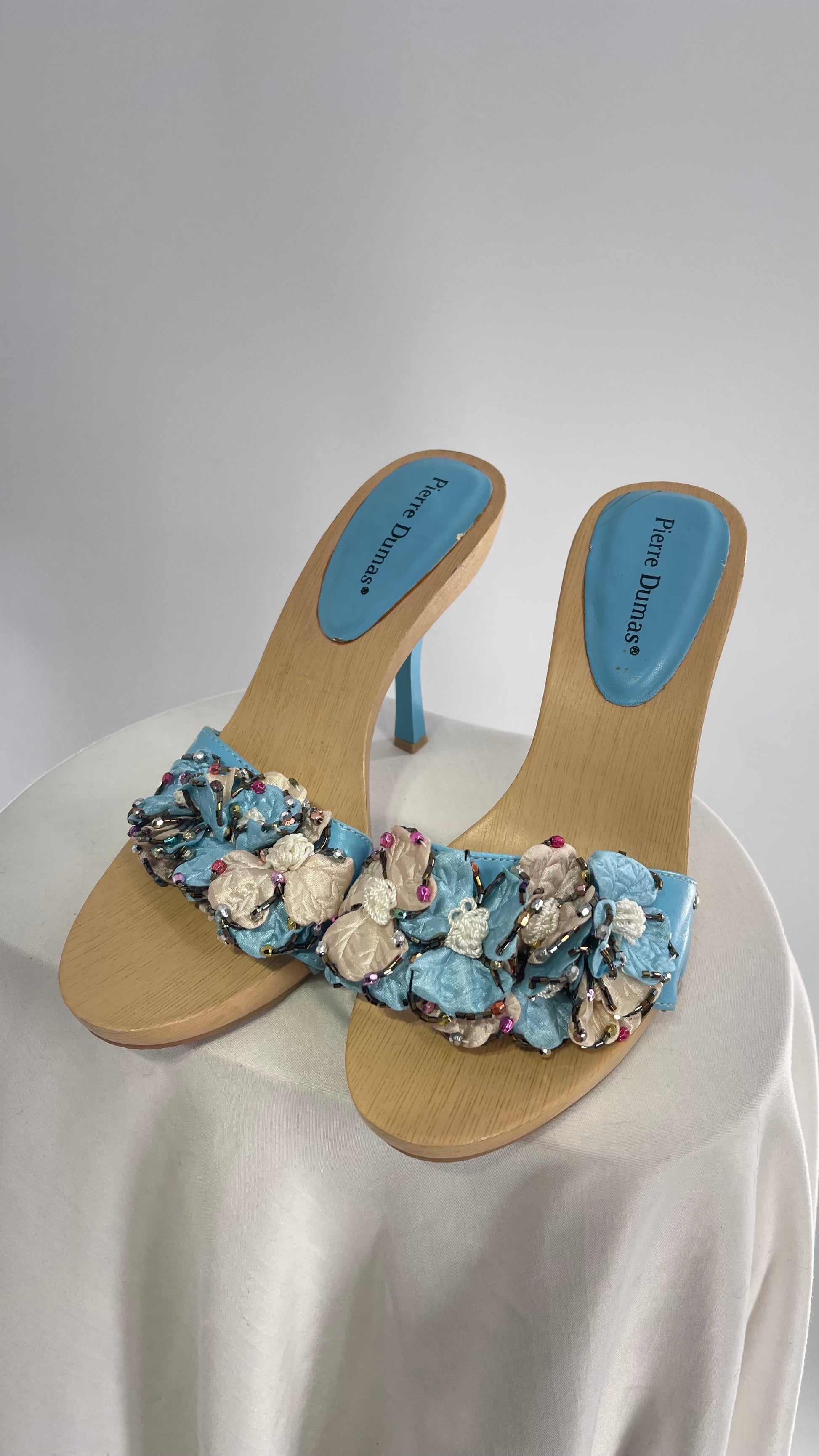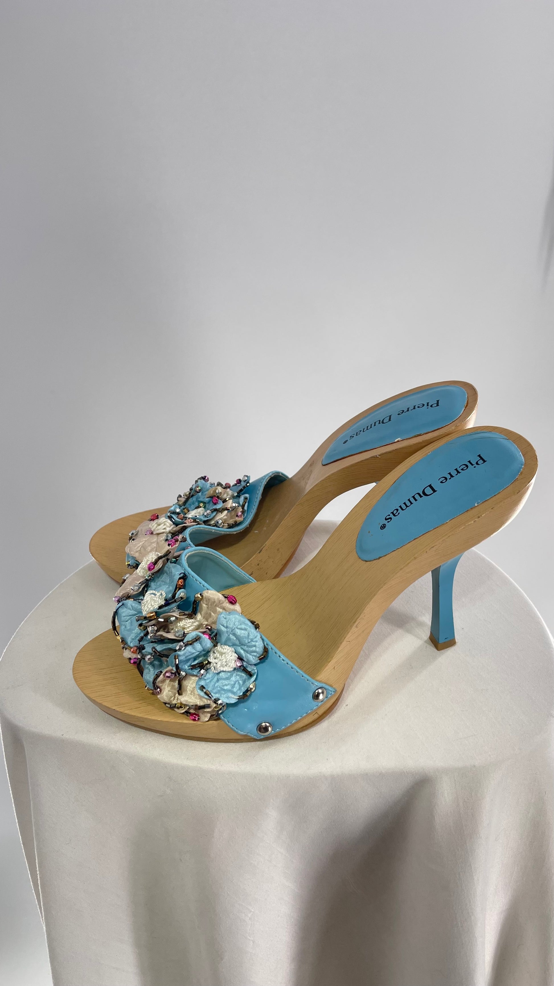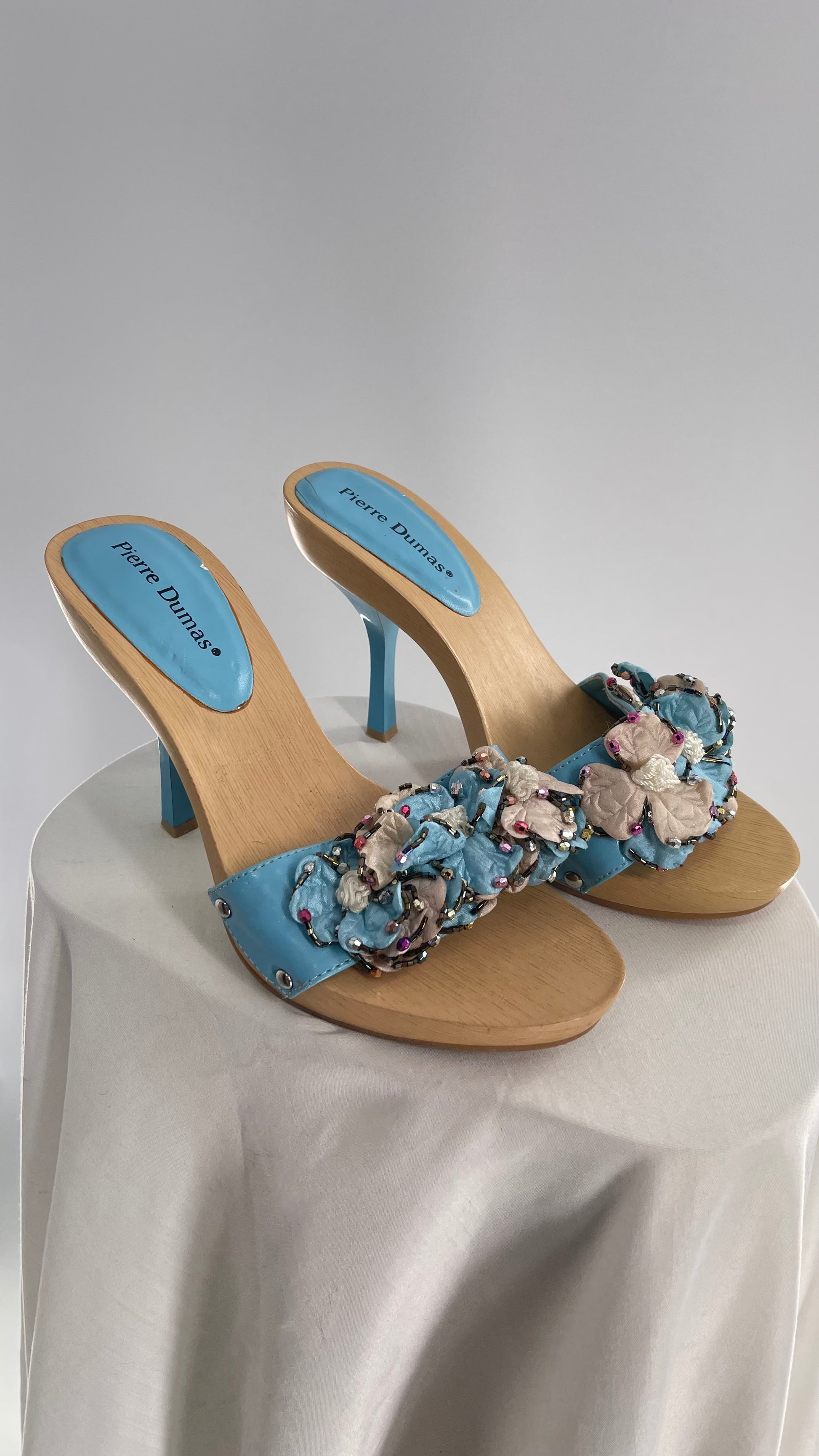 Pierre Dumas Baby Blue Wooden Heel with Beaded Floral Appliqués