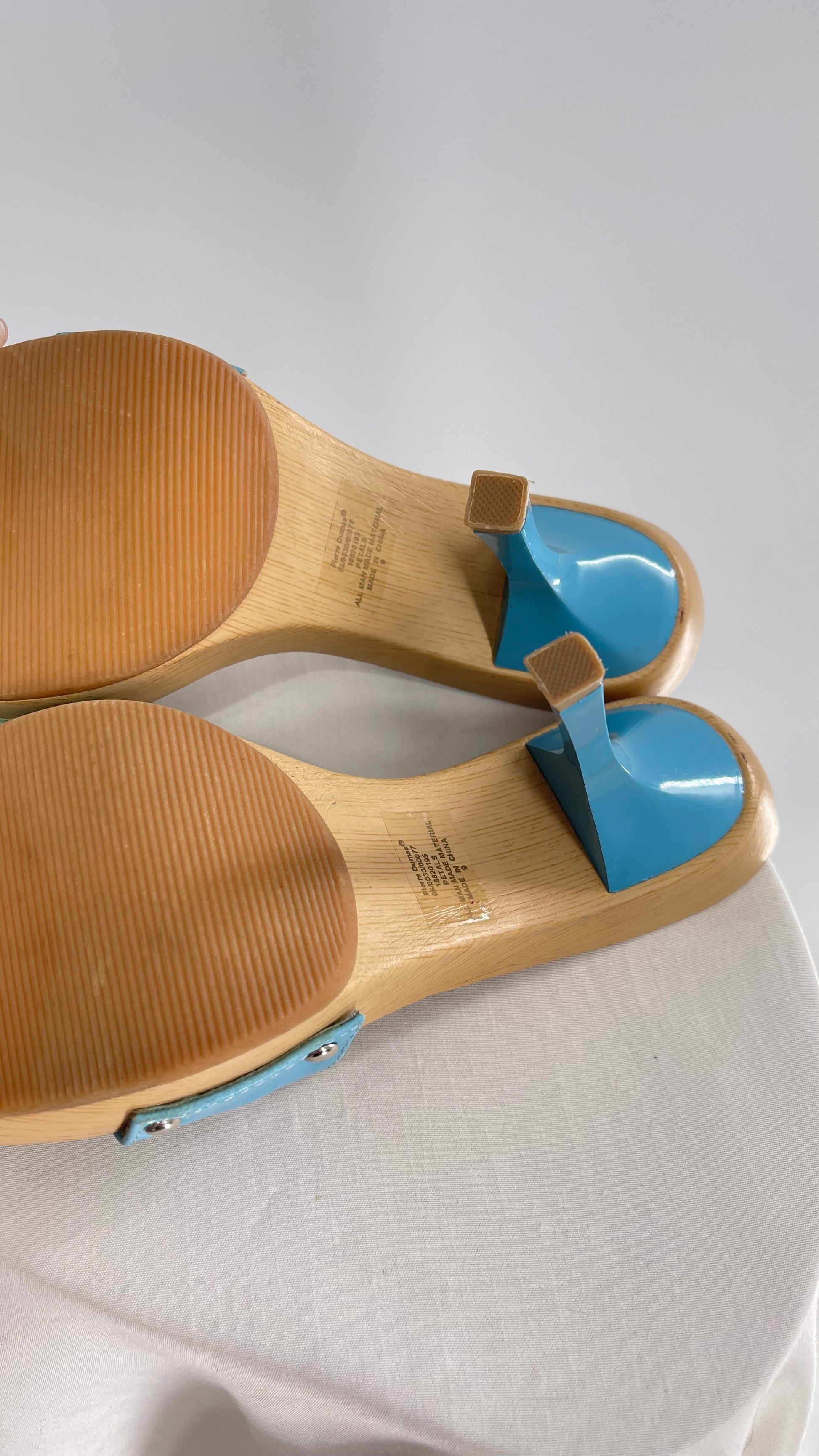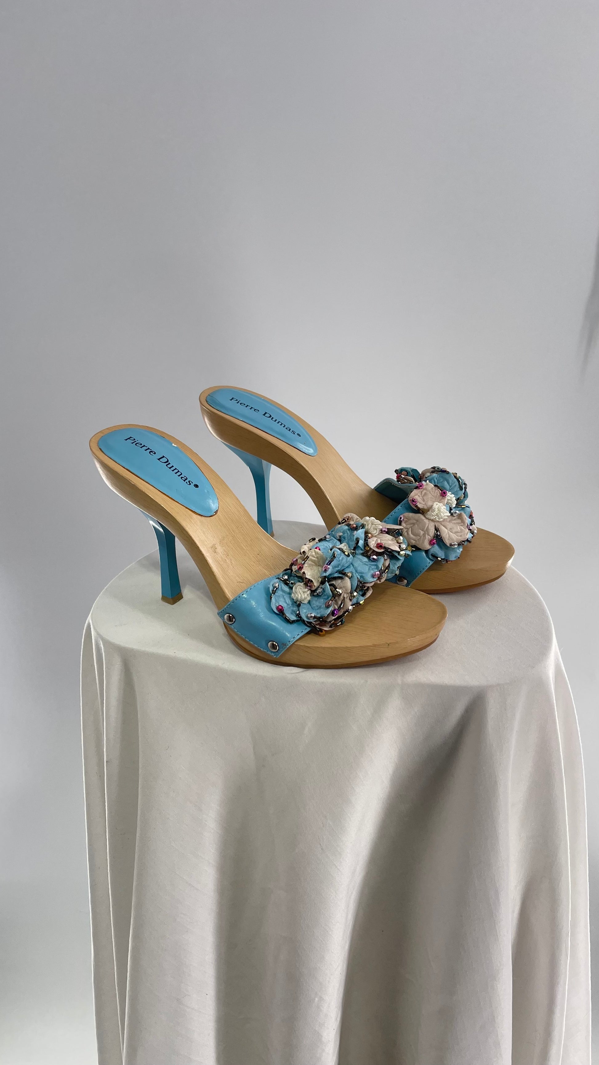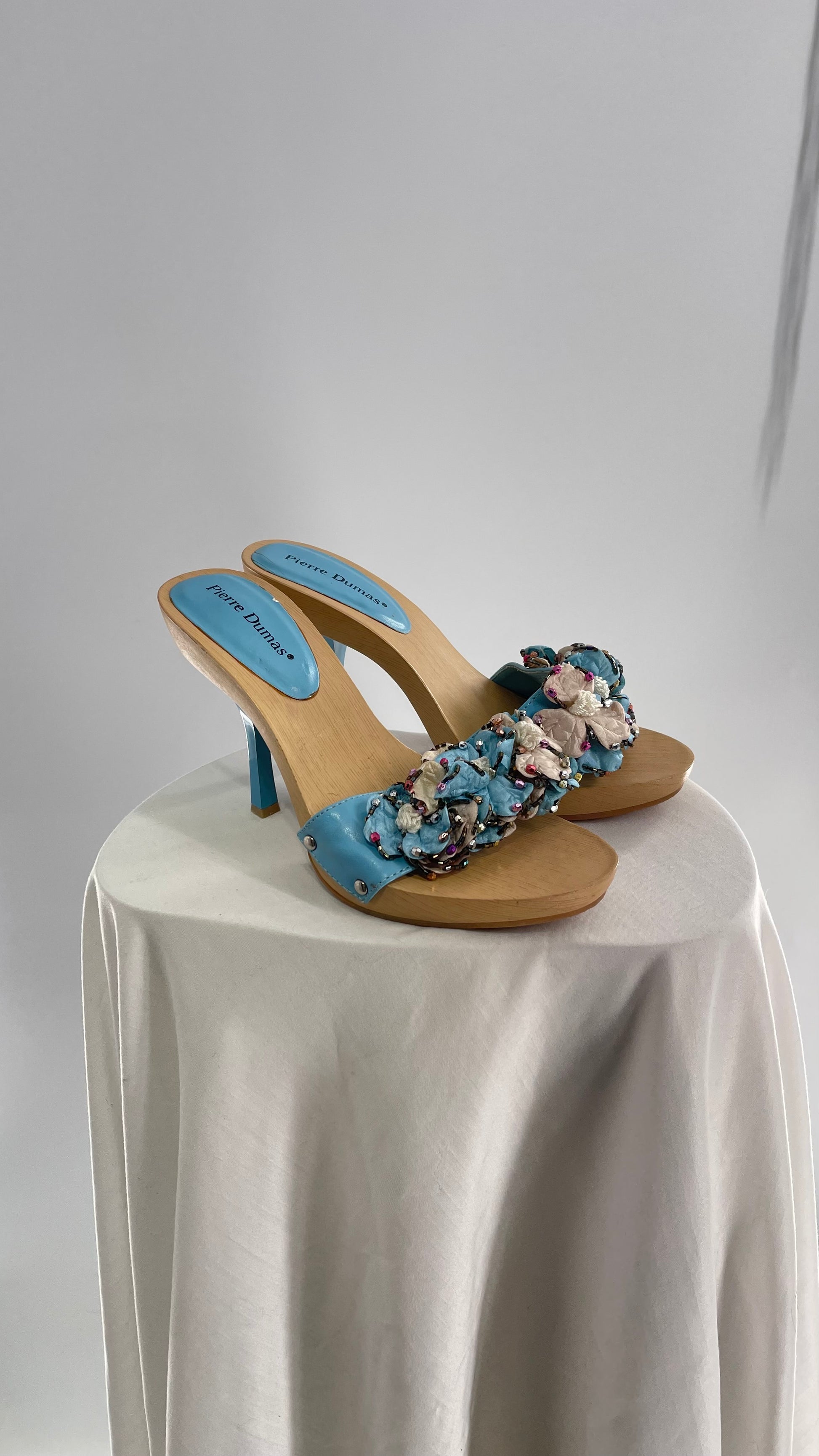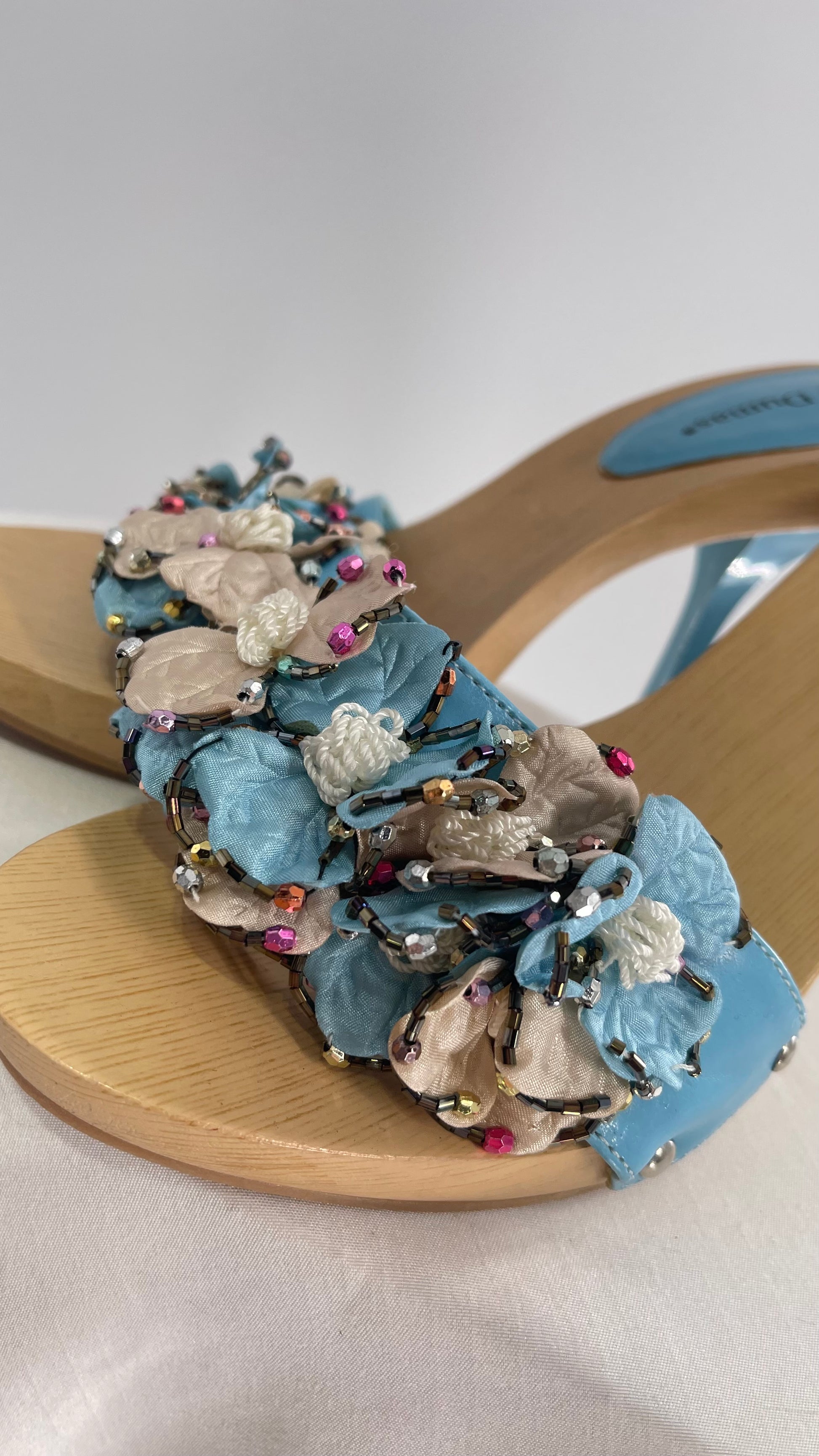 Pierre Dumas Baby Blue Wooden Heel with Beaded Floral Appliqués