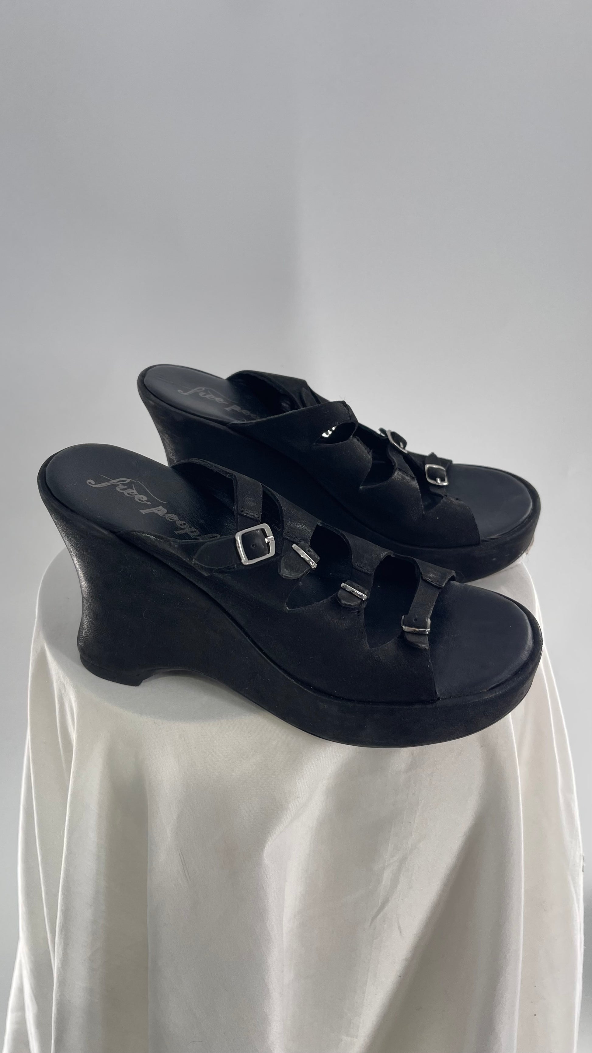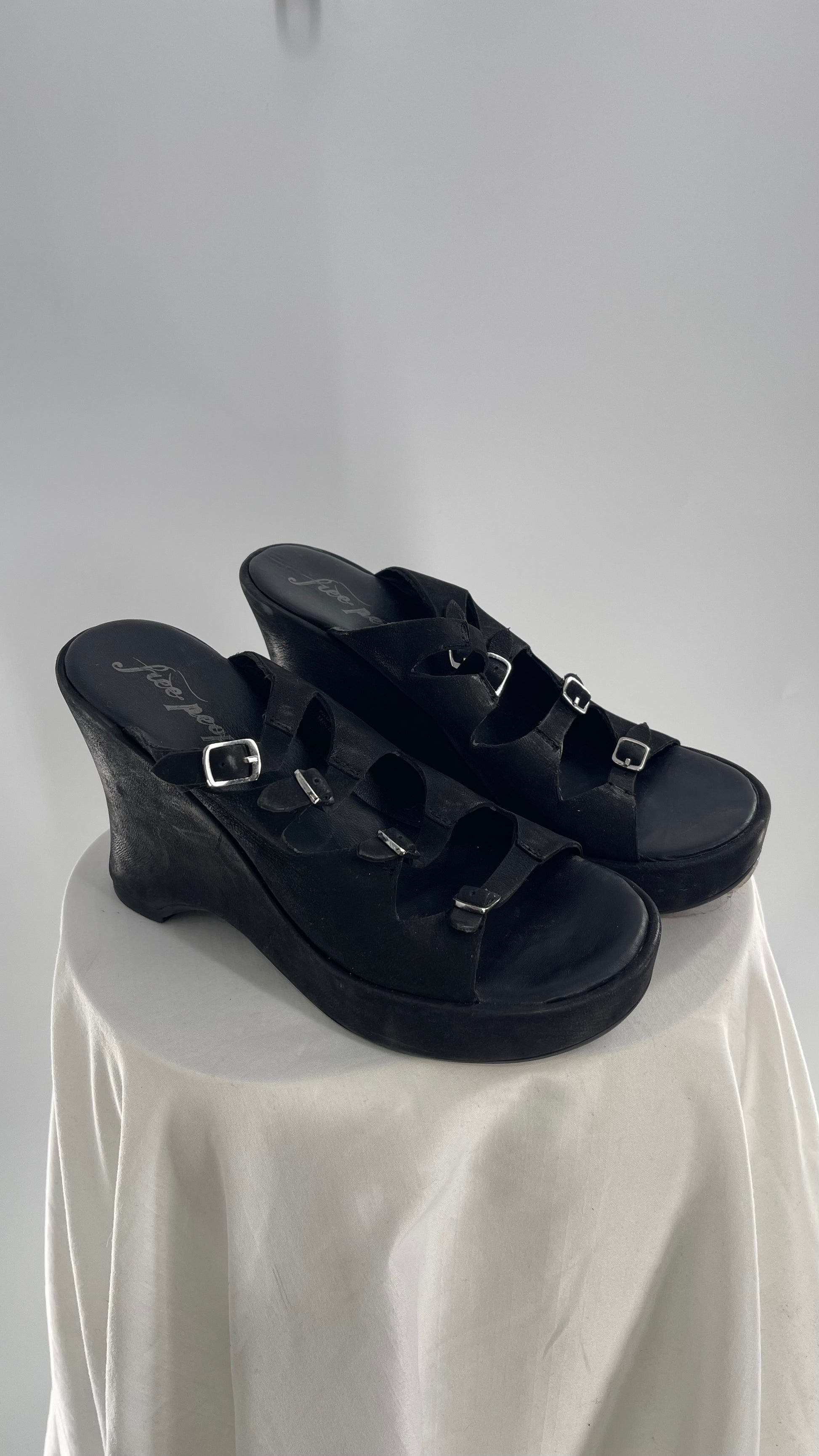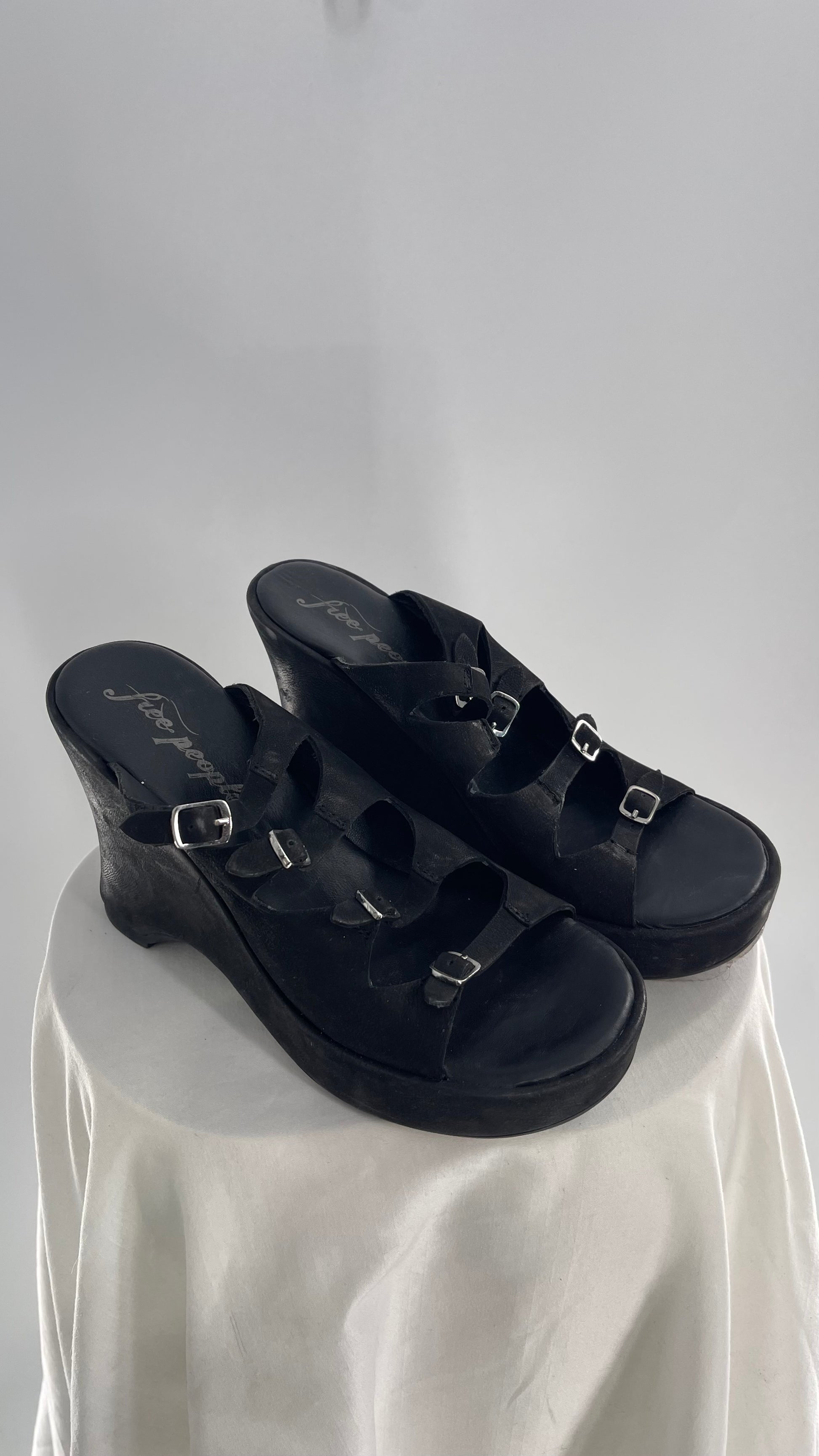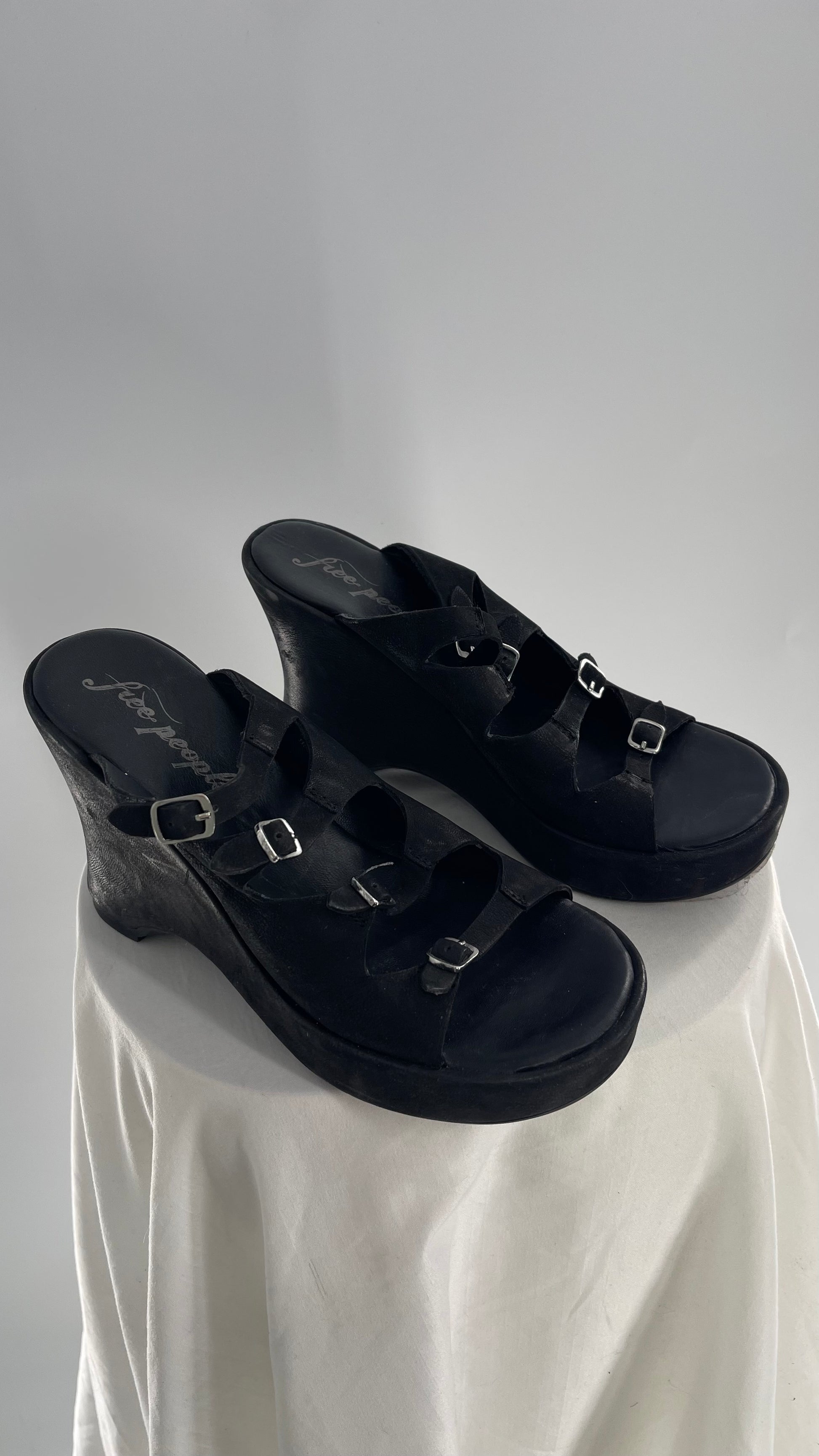 Free People Huffman Black Leather Buckle Wedge Heel (38)