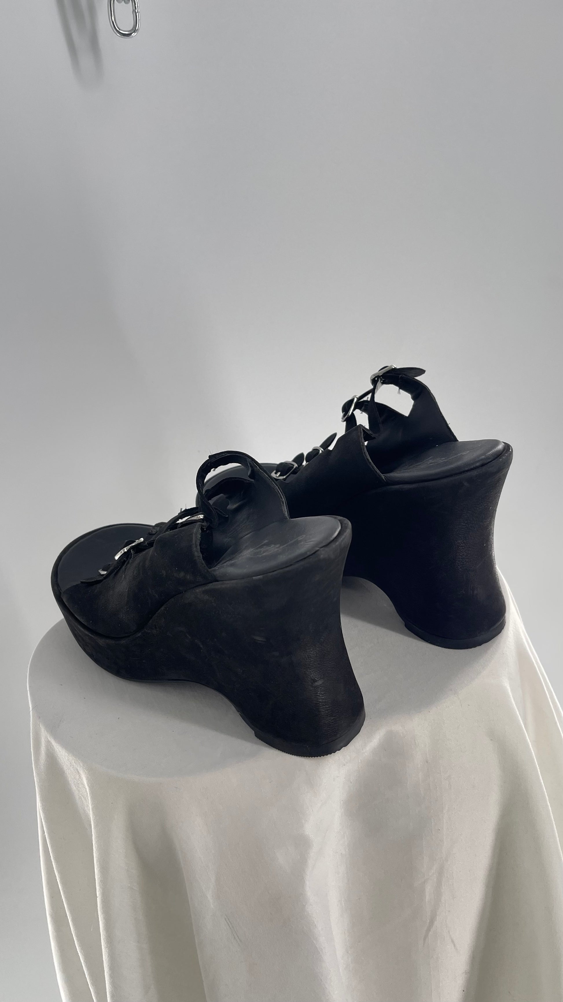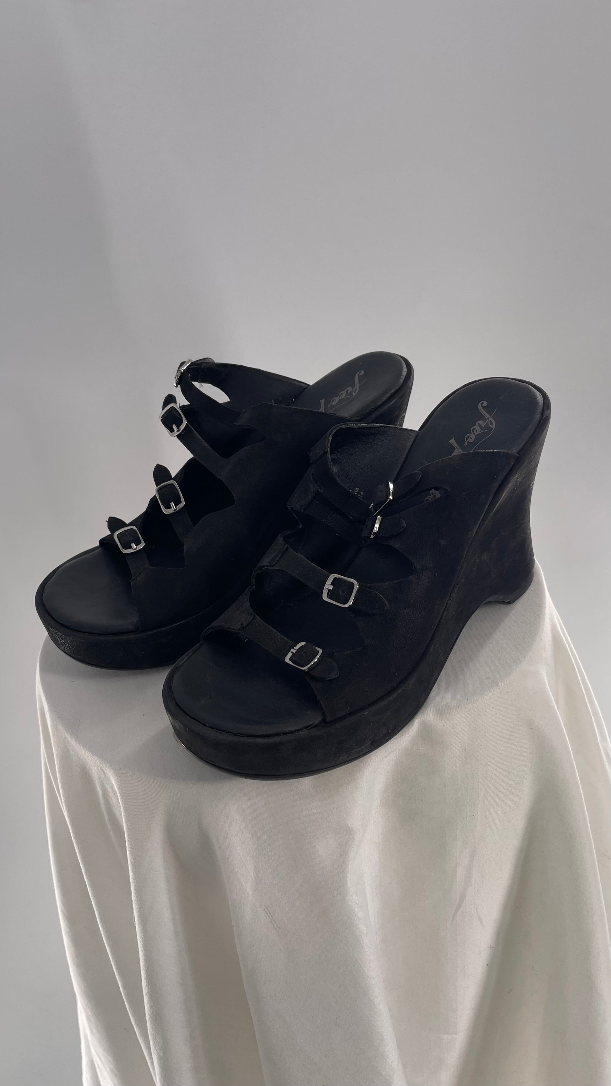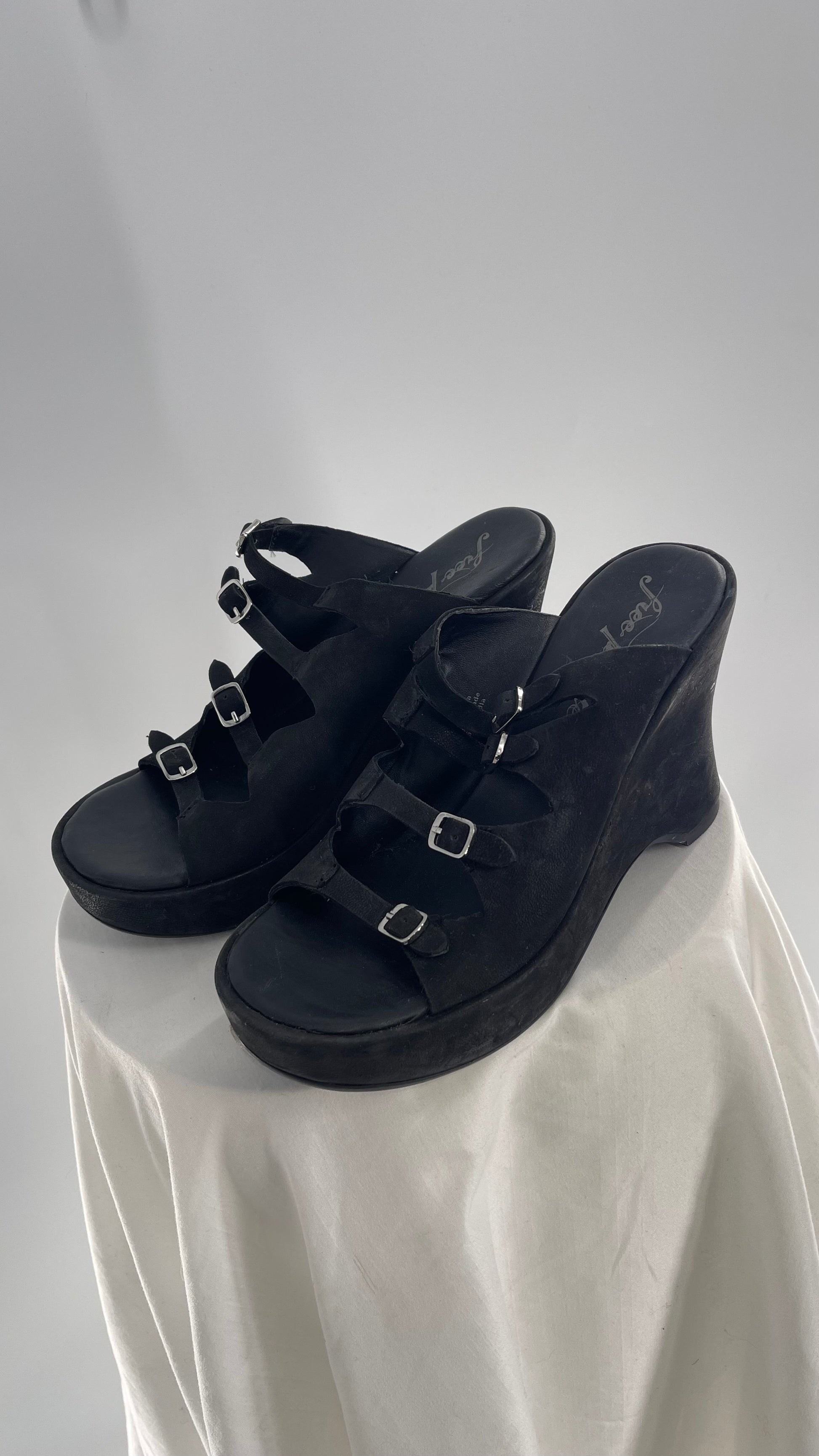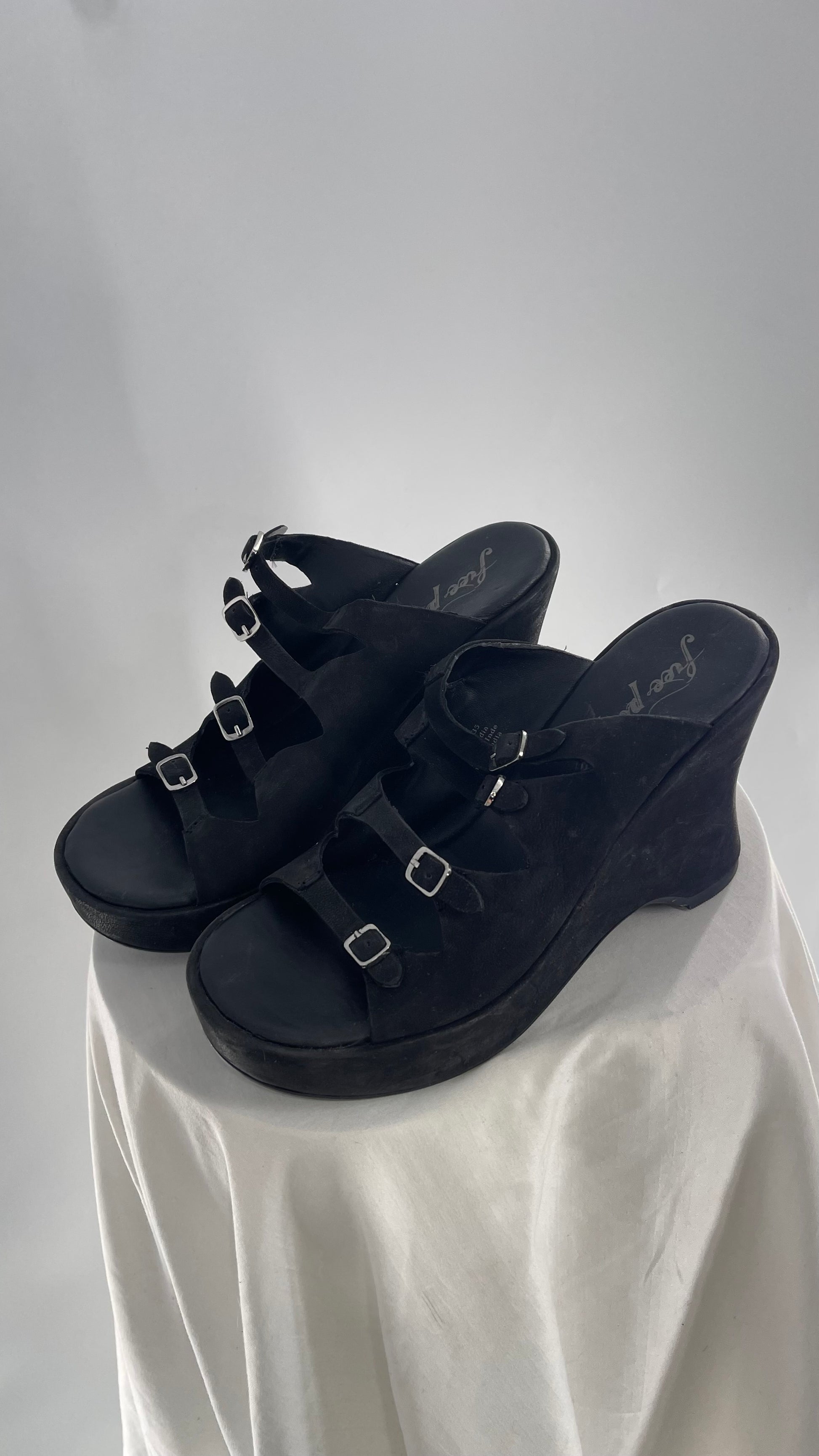 Free People Huffman Black Leather Buckle Wedge Heel (38)