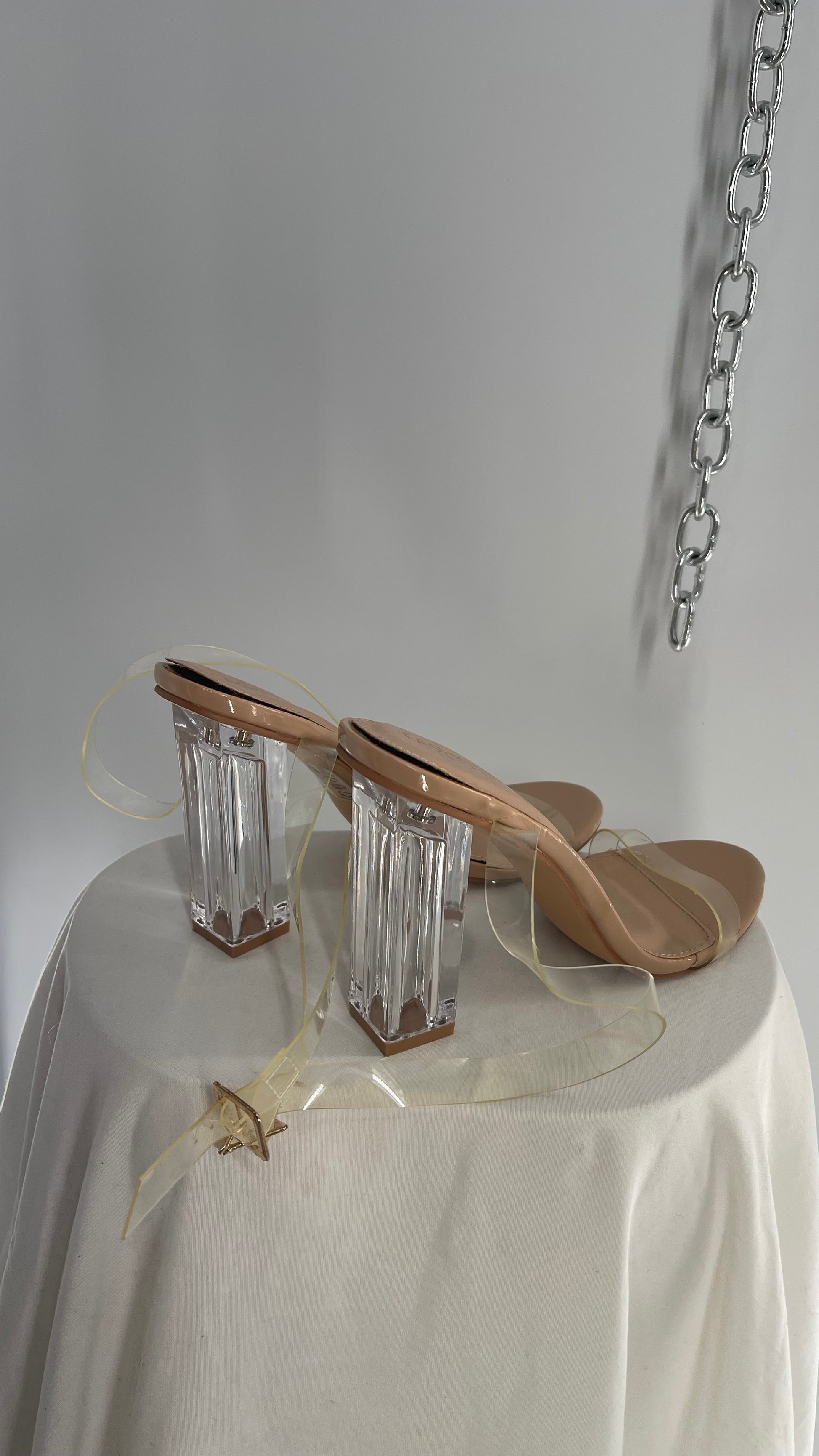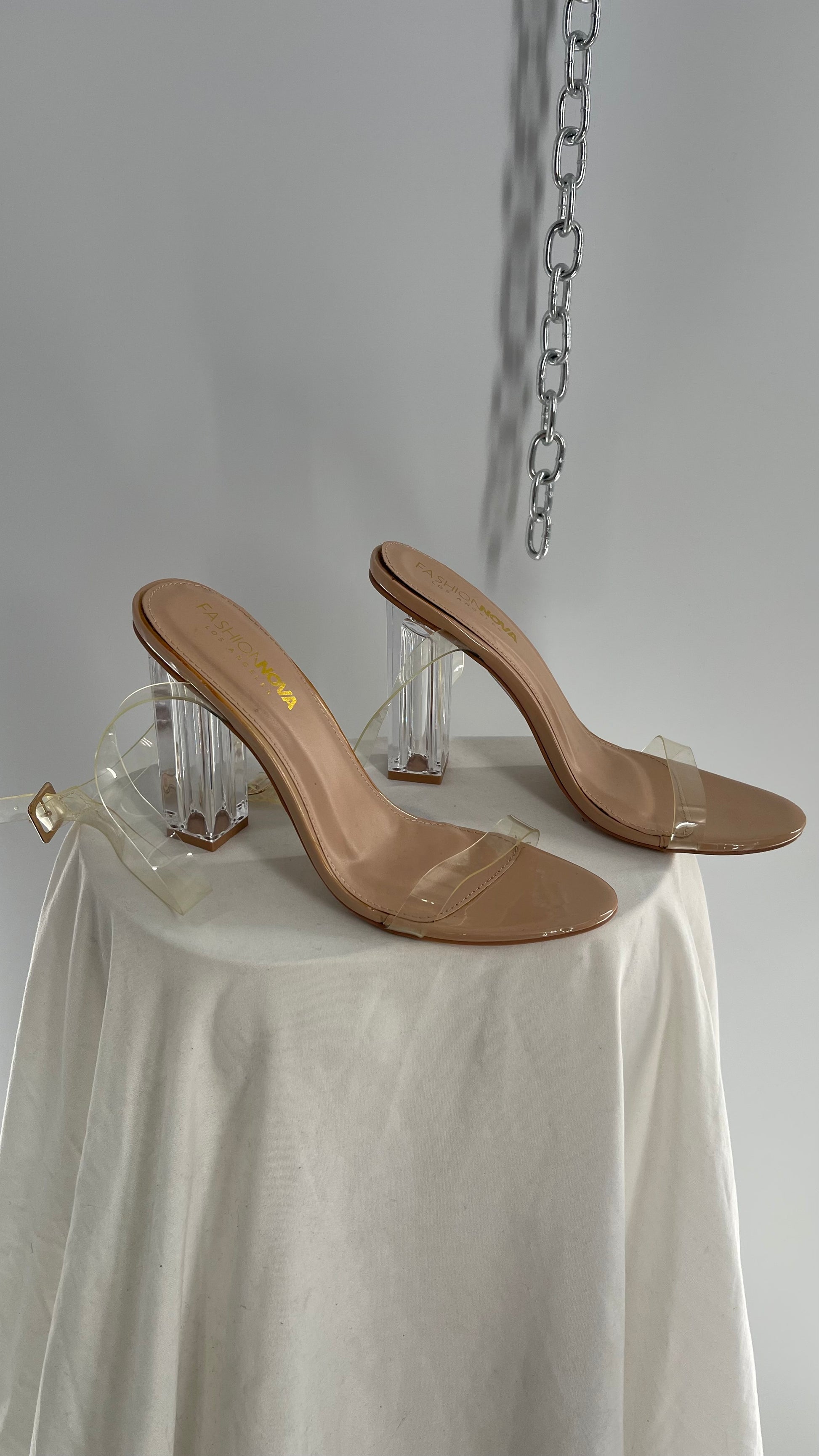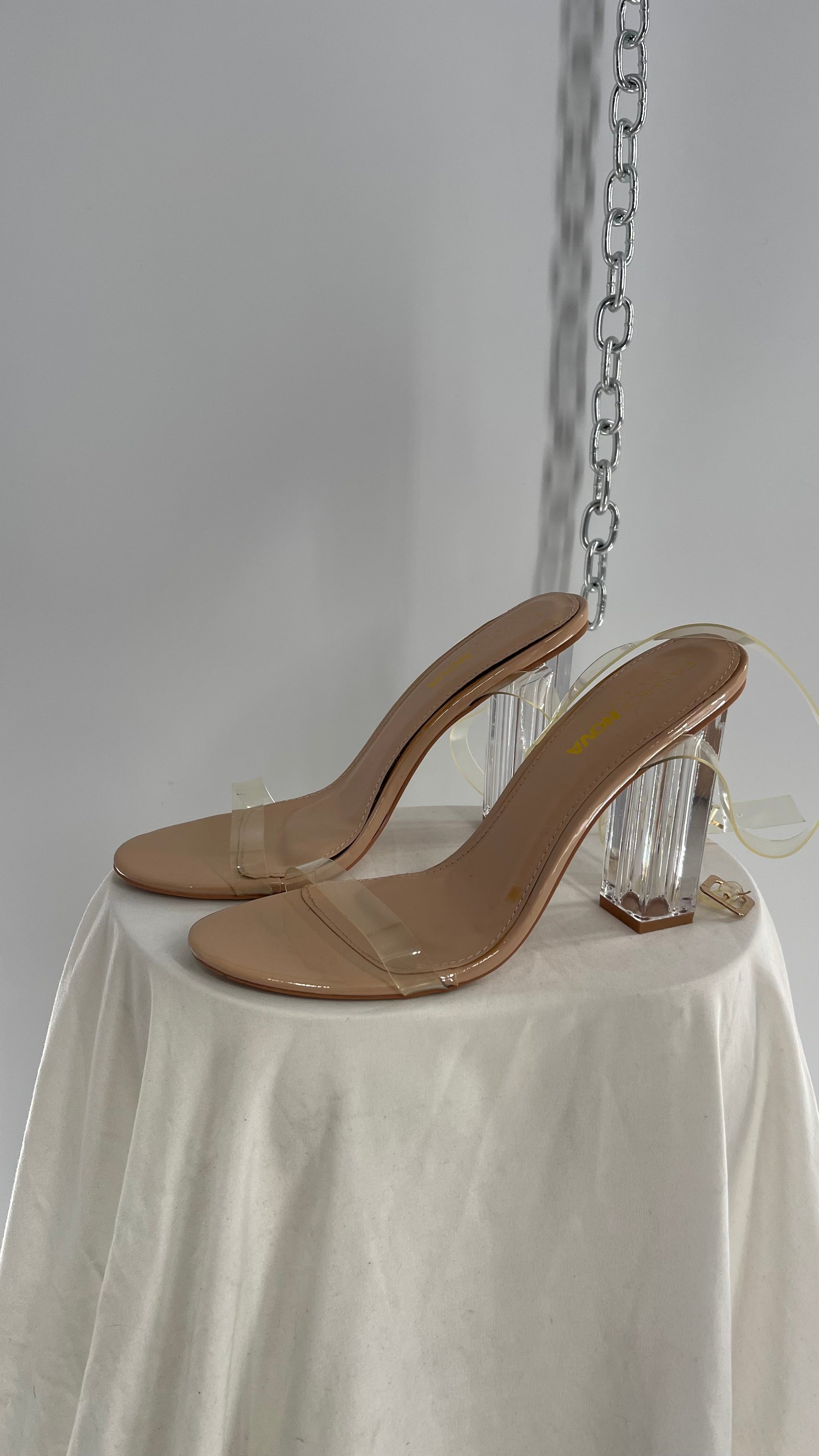 FashionNova Tan Base Lucite Heel Clear Strap Heel