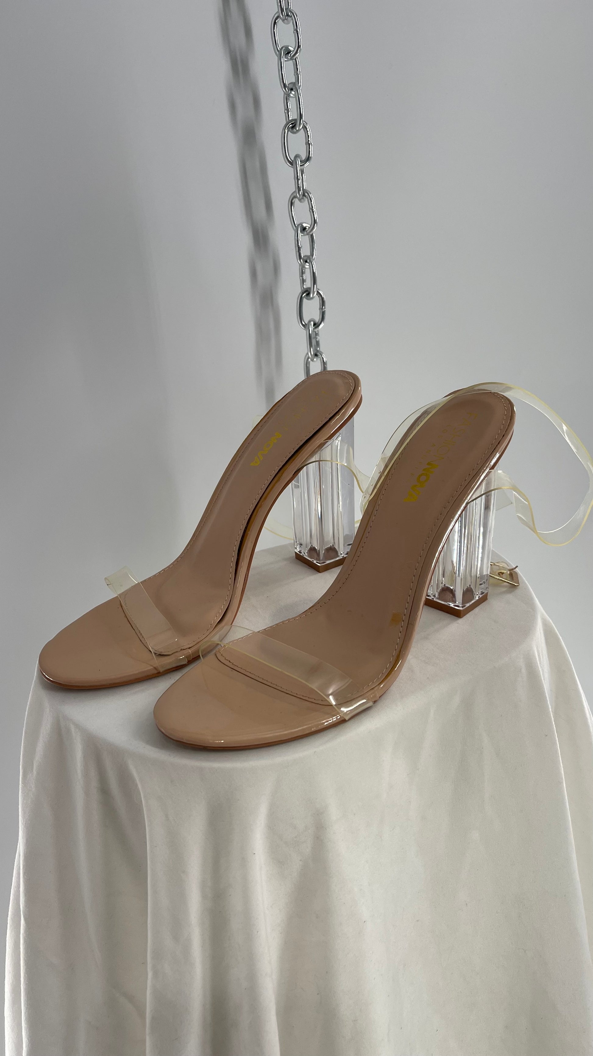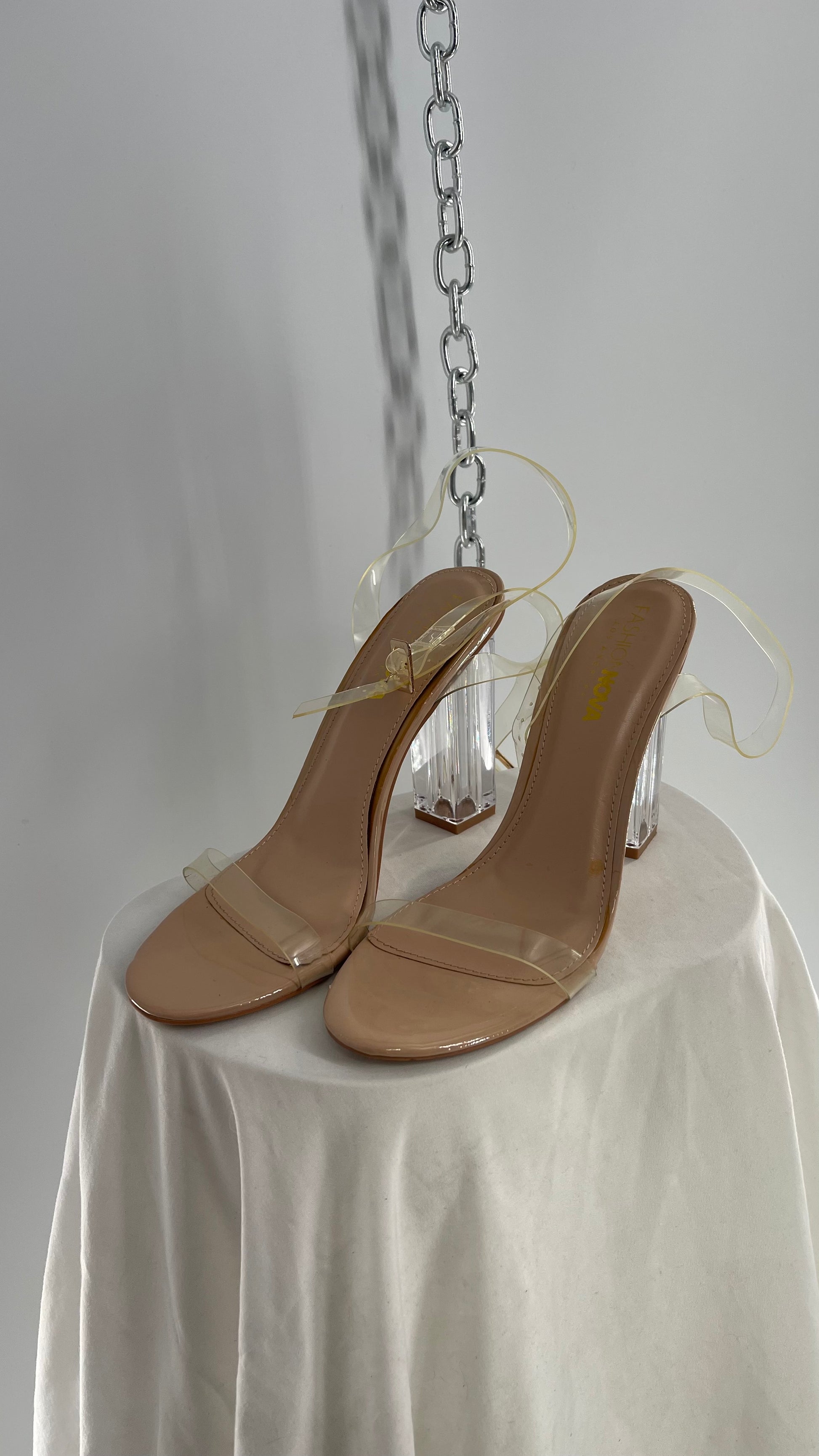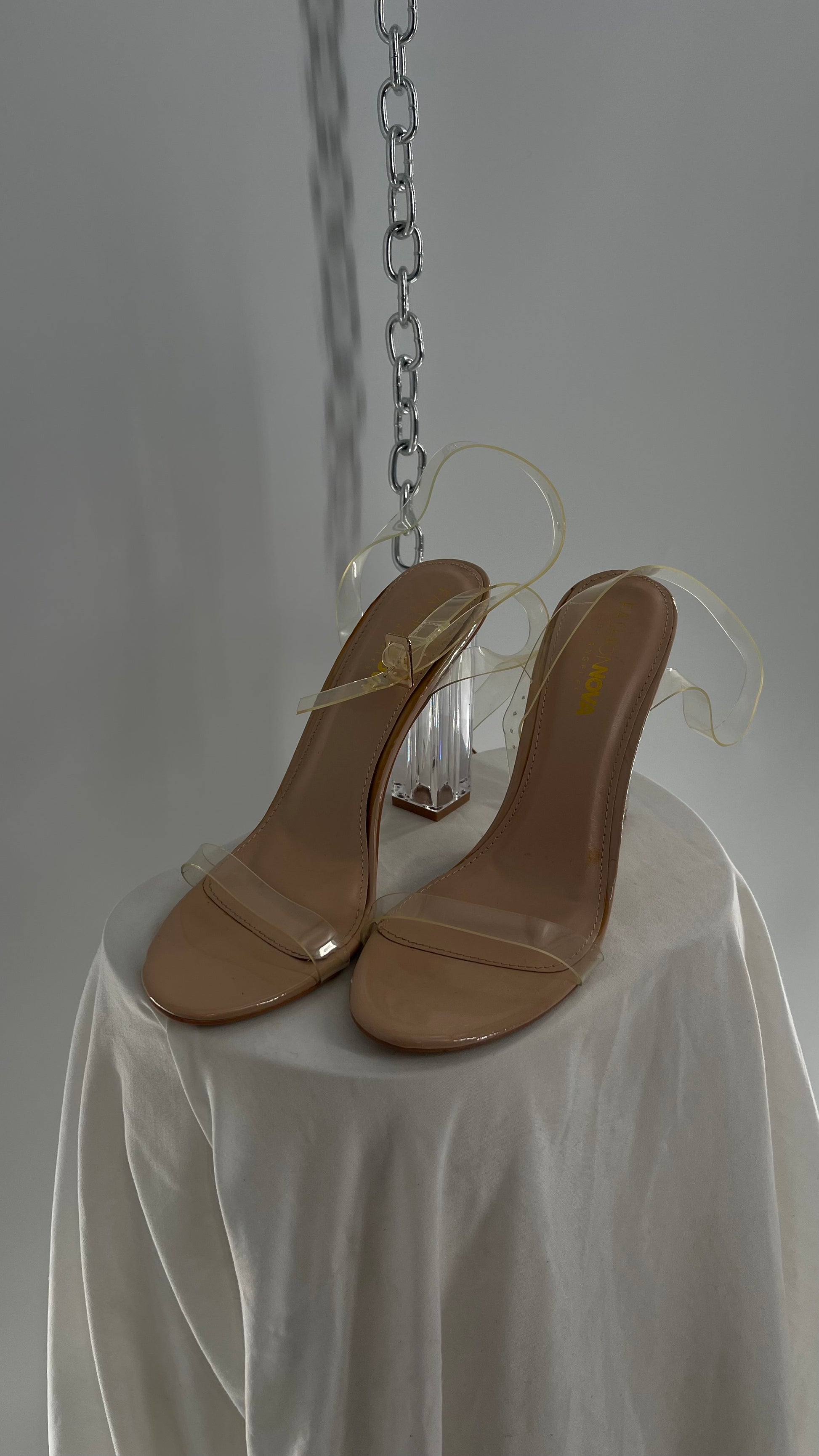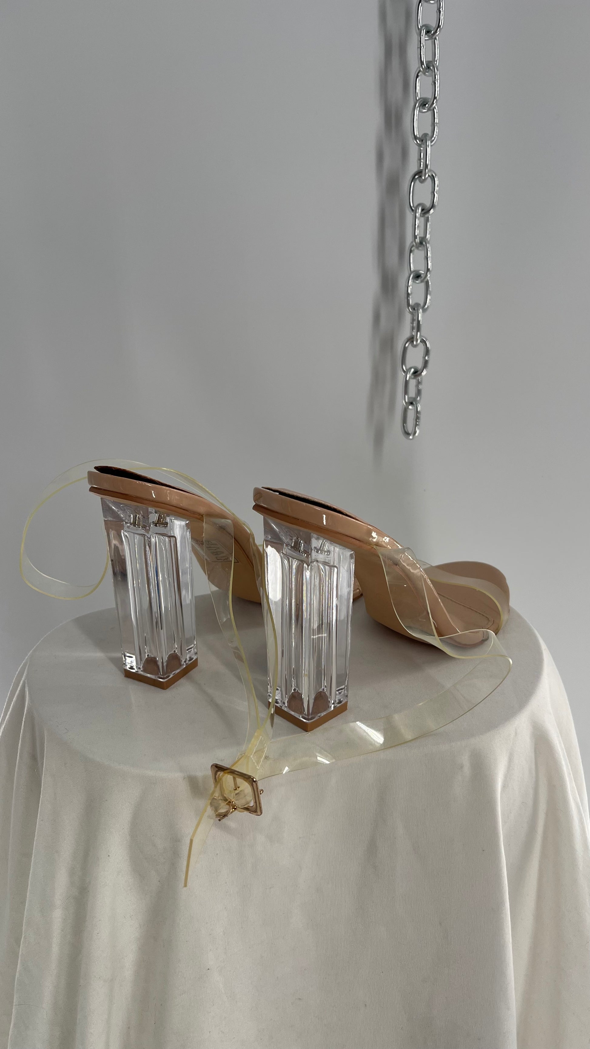 FashionNova Tan Base Lucite Heel Clear Strap Heel
