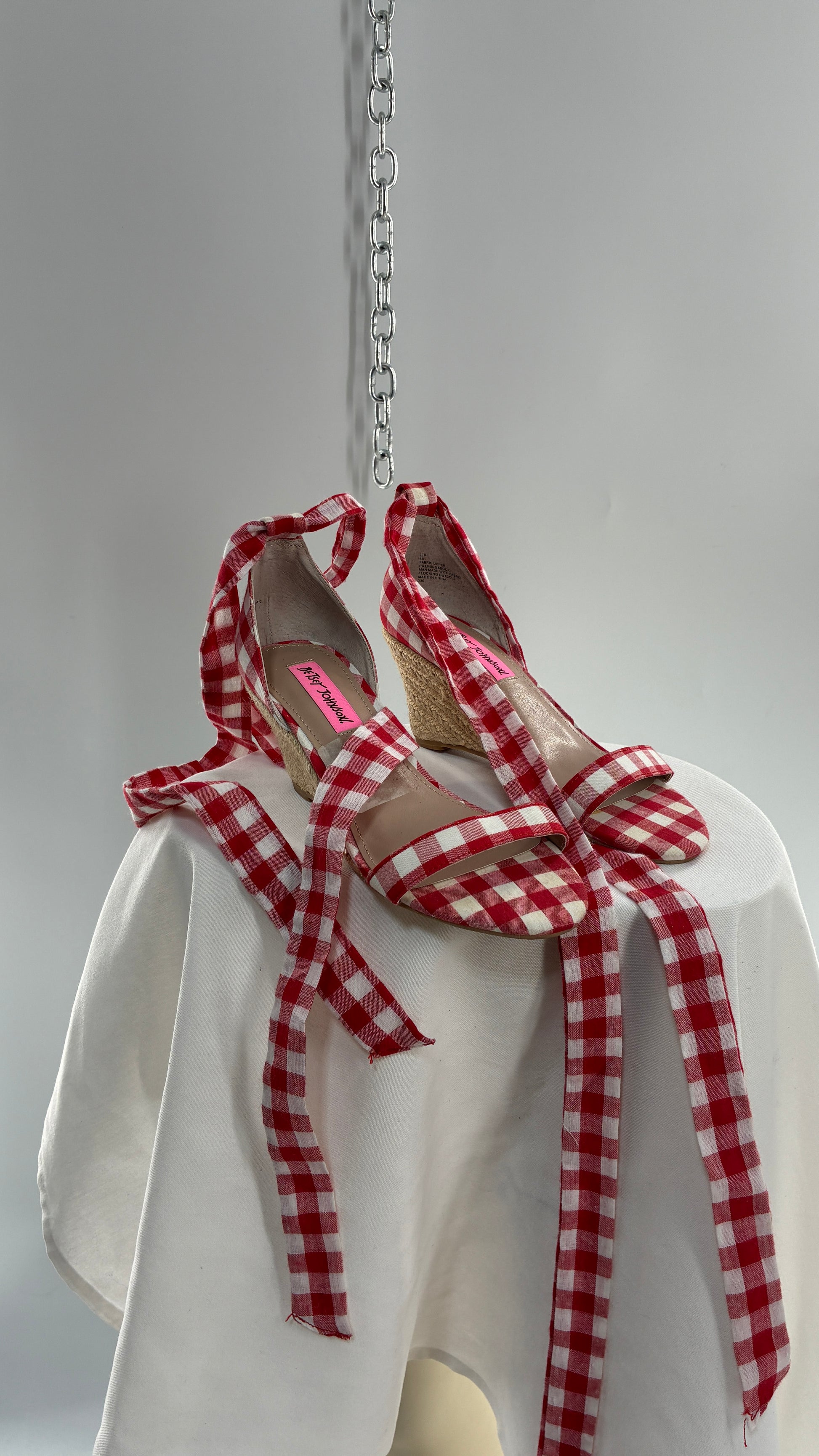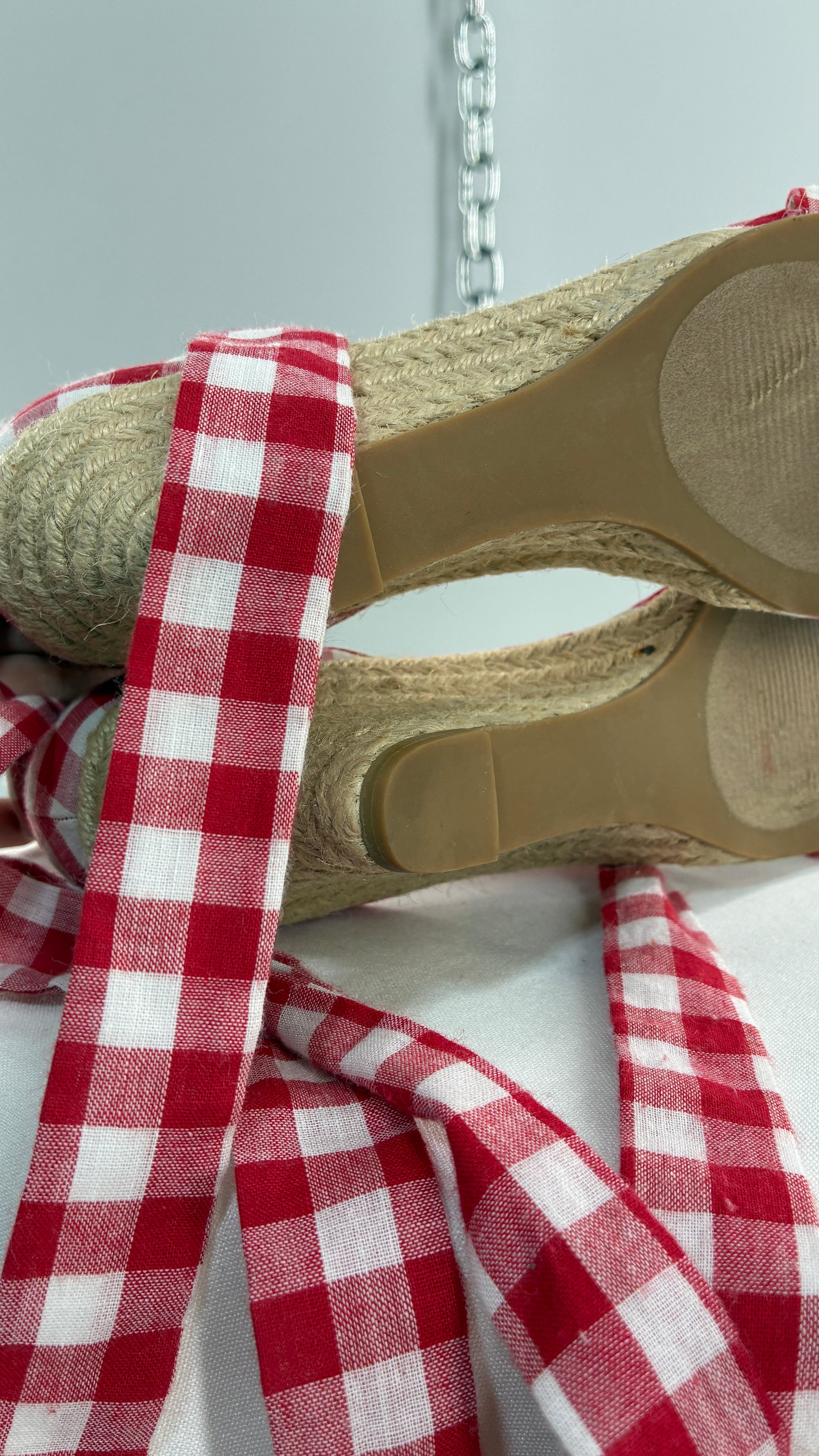 Vintage BETSY JOHNSON Jemi Gingham Red Tie Up Kitten, Wicker Wedge (6)
