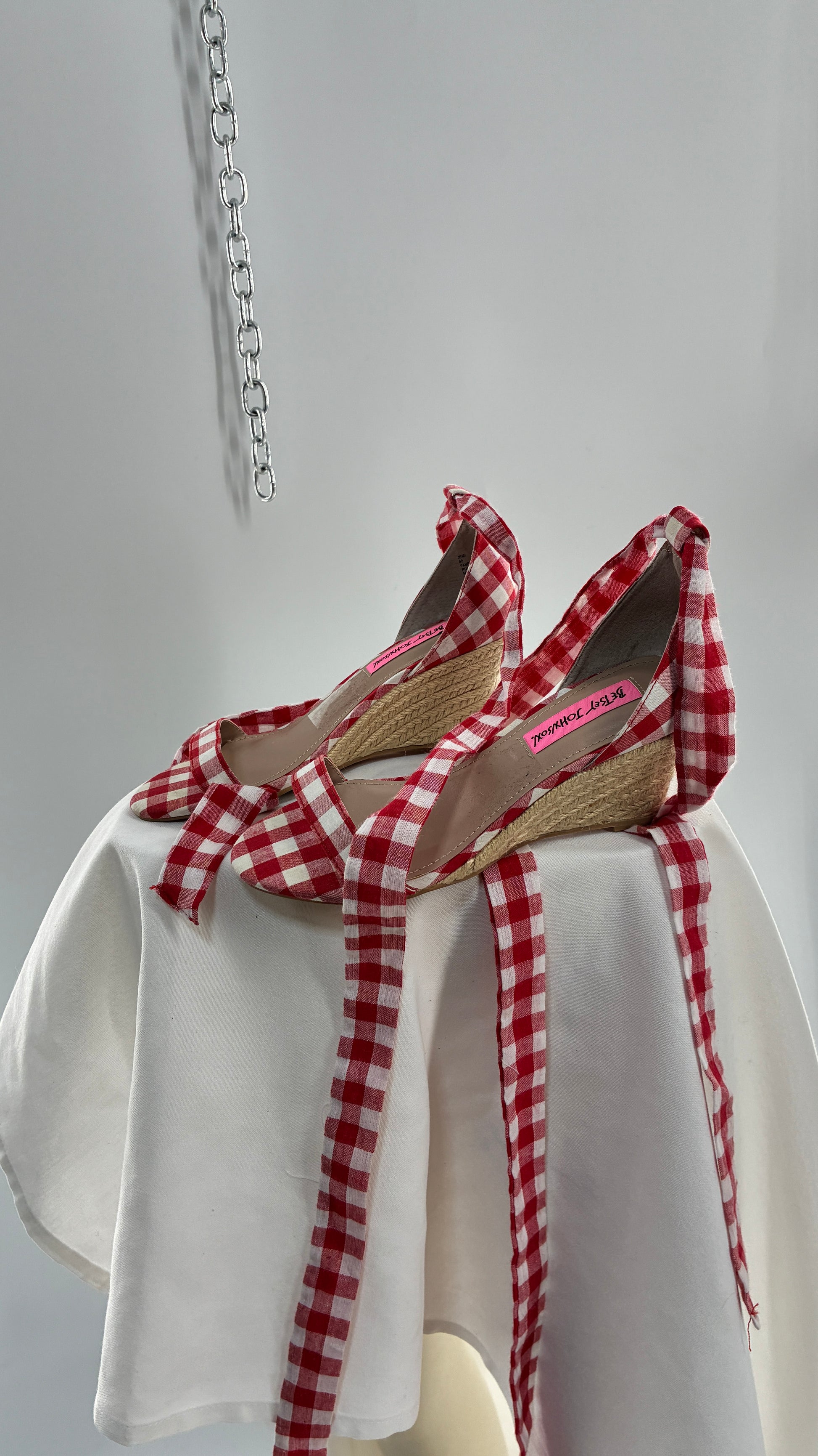 Vintage BETSY JOHNSON Jemi Gingham Red Tie Up Kitten, Wicker Wedge