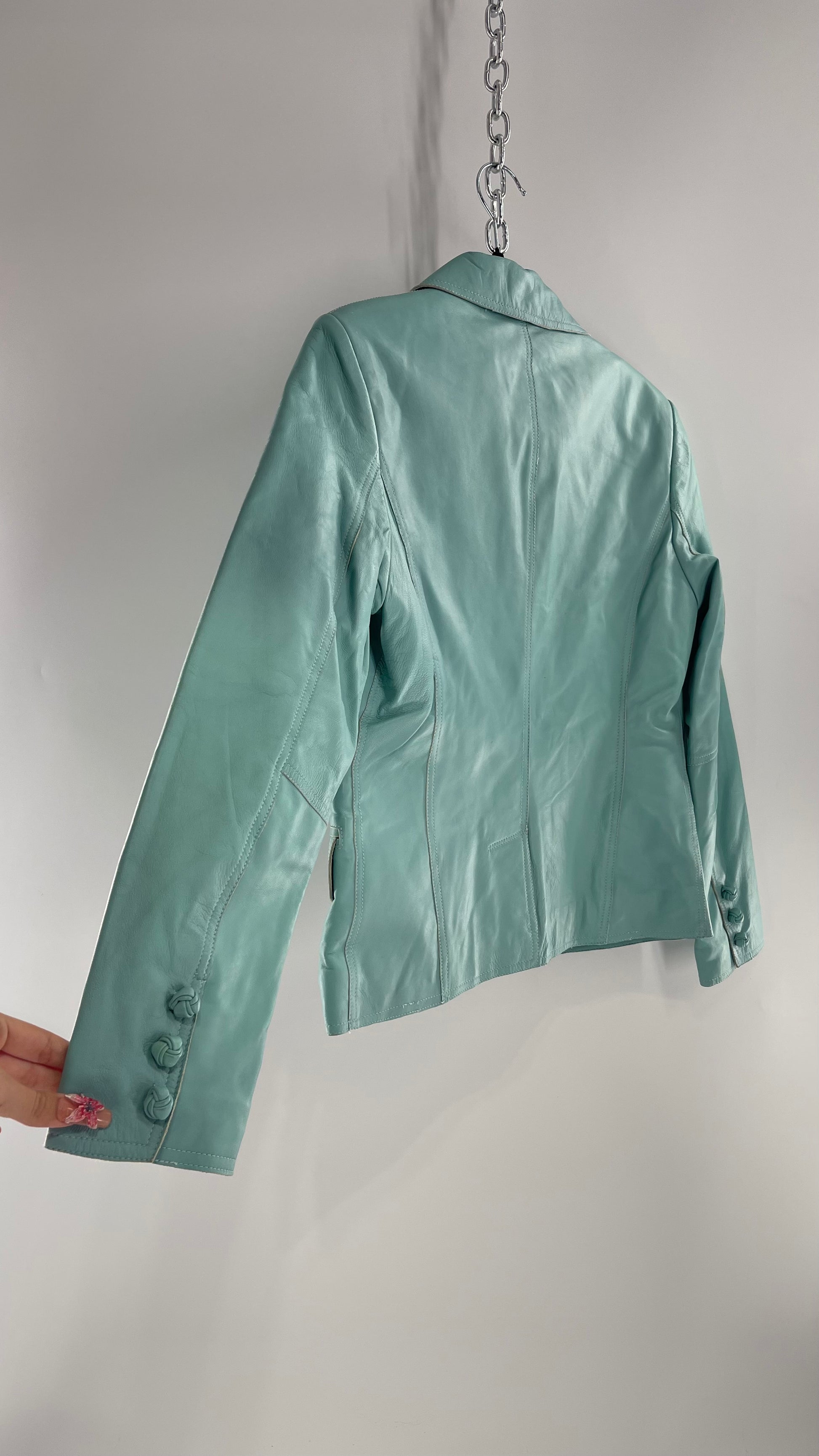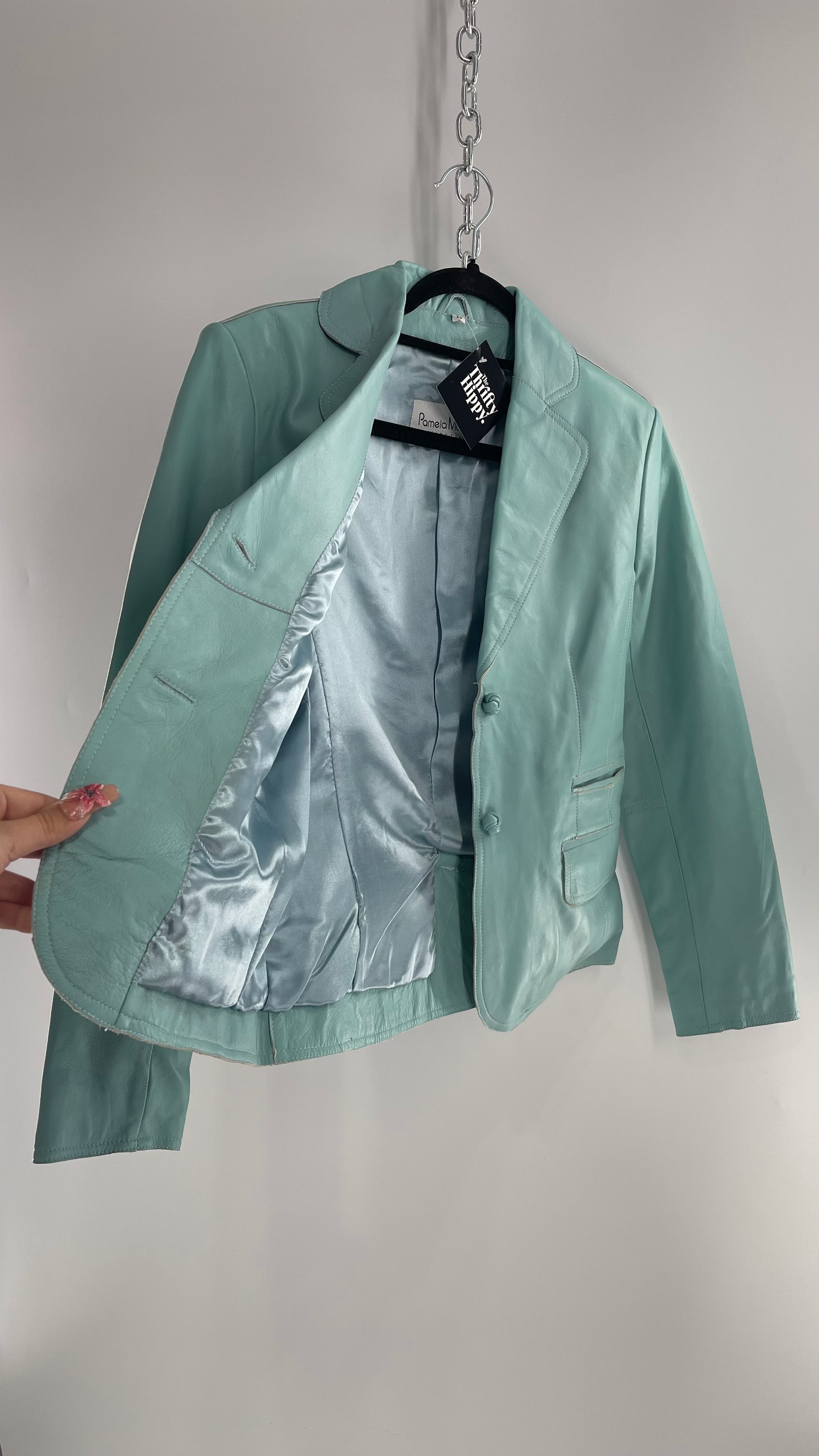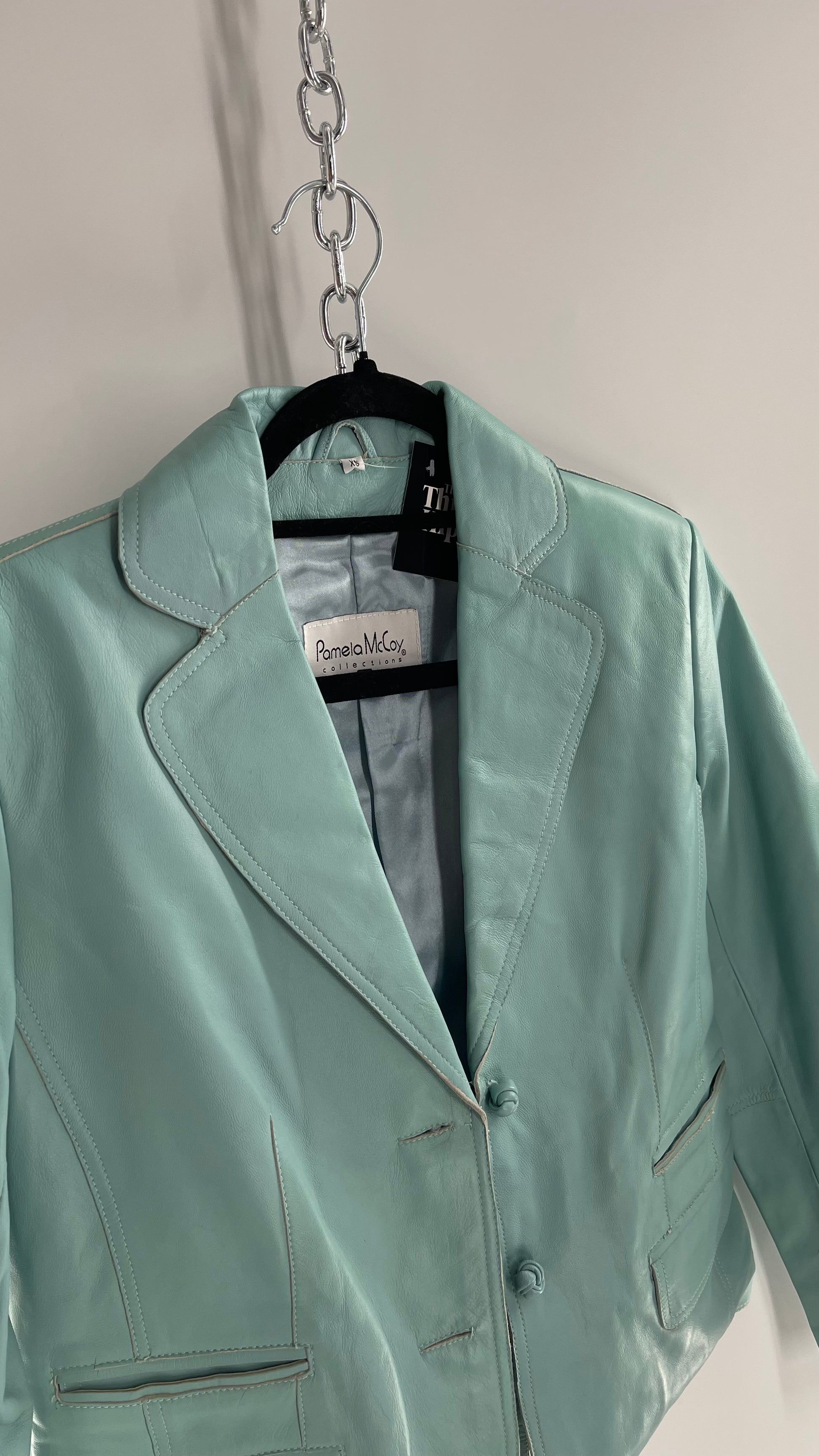 Vintage 1990s Pamela McCoy Eggshell/Tiffany Blue Leather Blazer Jacket (XS)