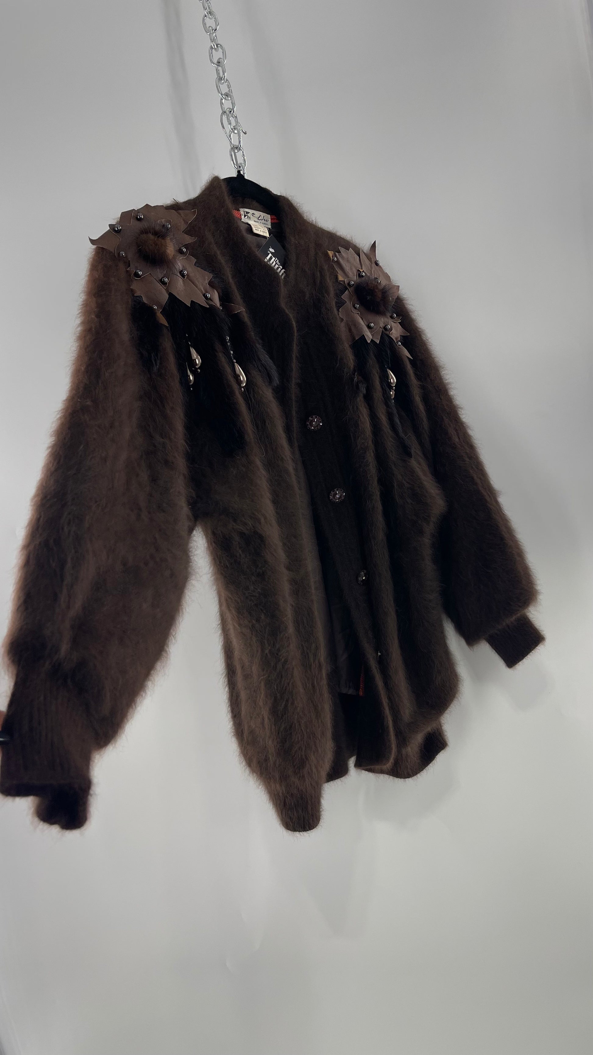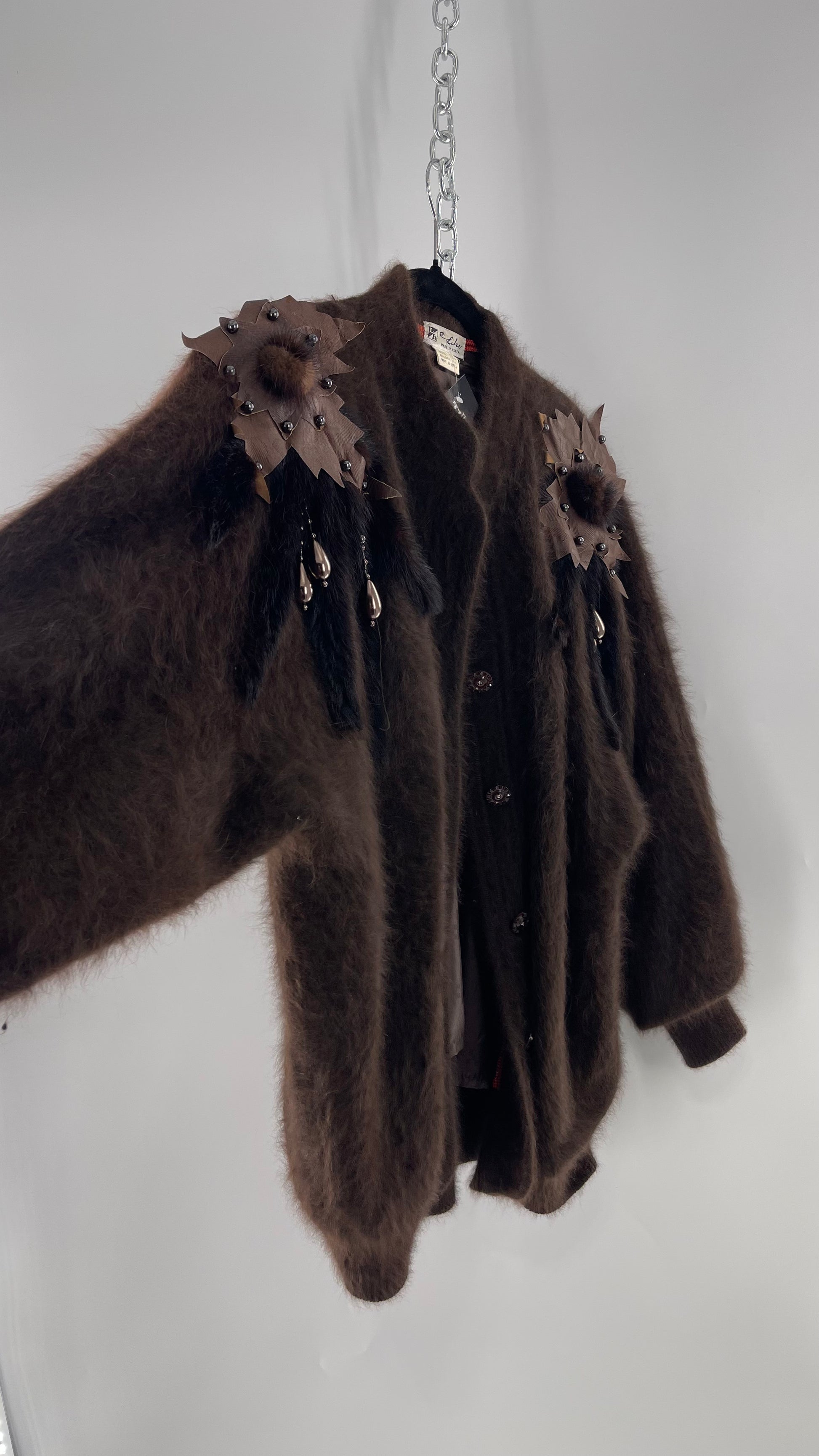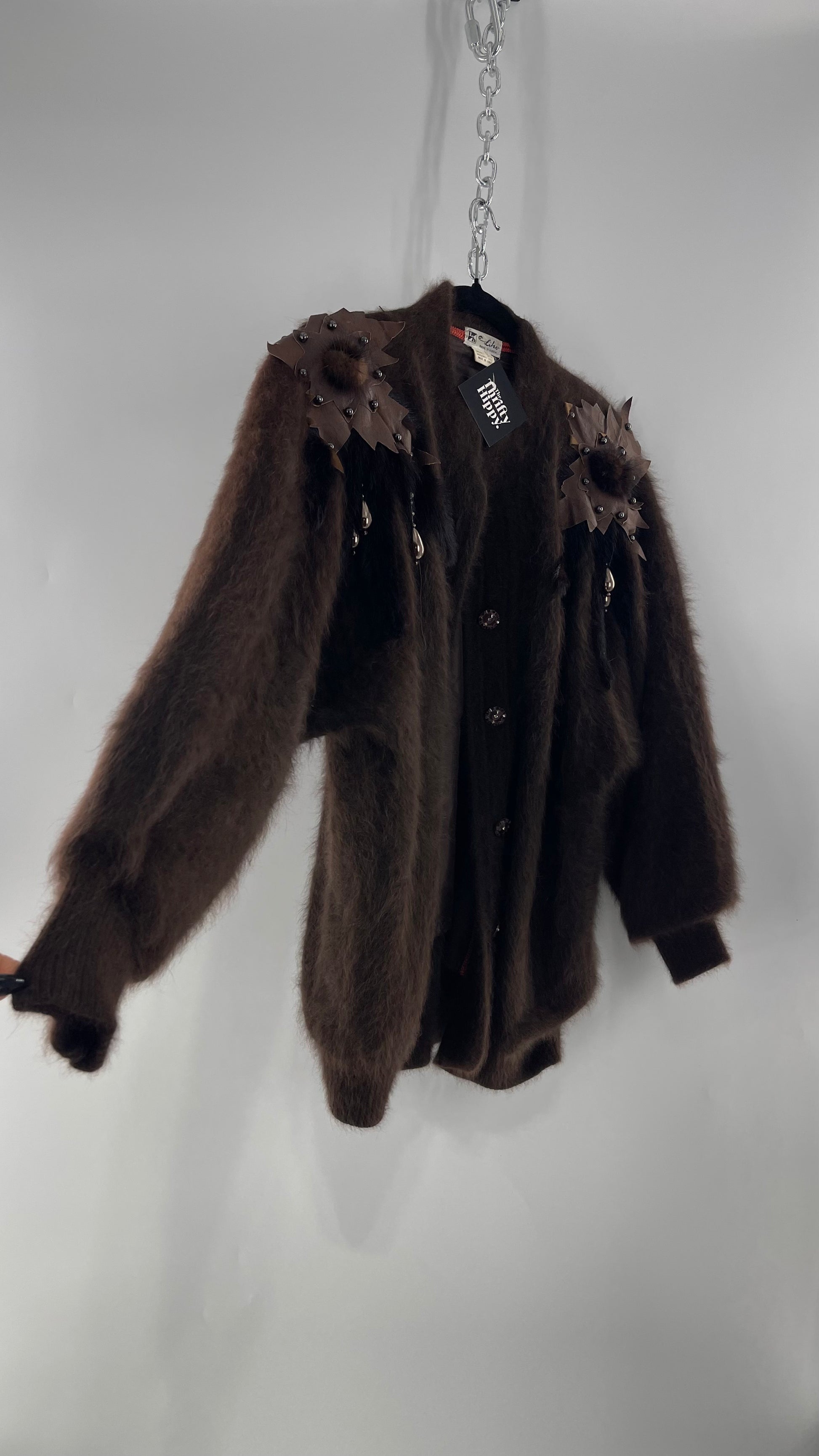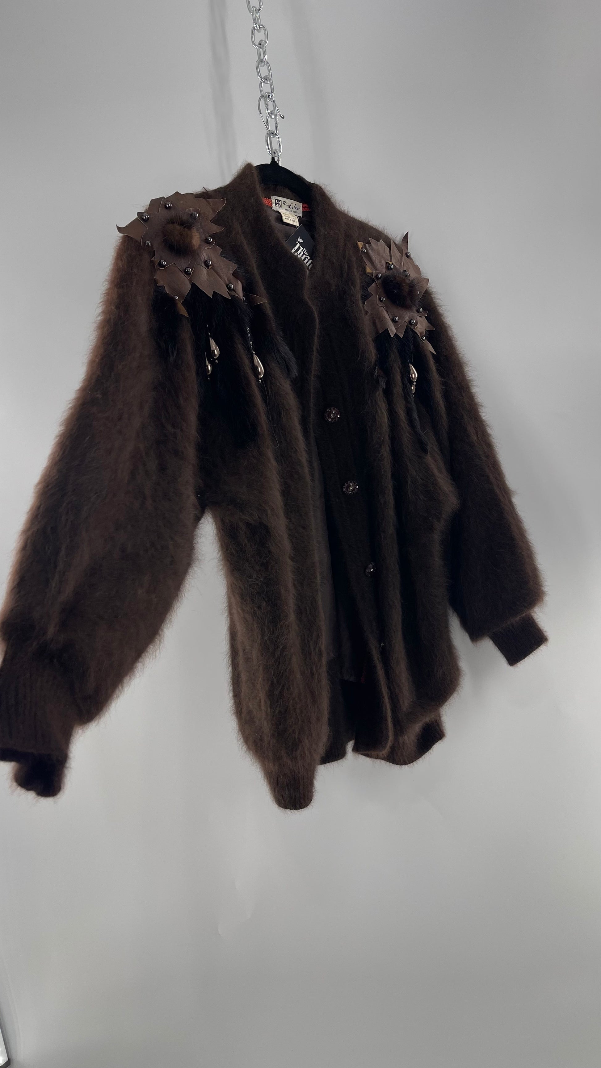 Liho Korean Vintage Brown Cardigan with Leather, Fur and Beaded Detailing 15% Wool 75% Angora (C)(Medium)