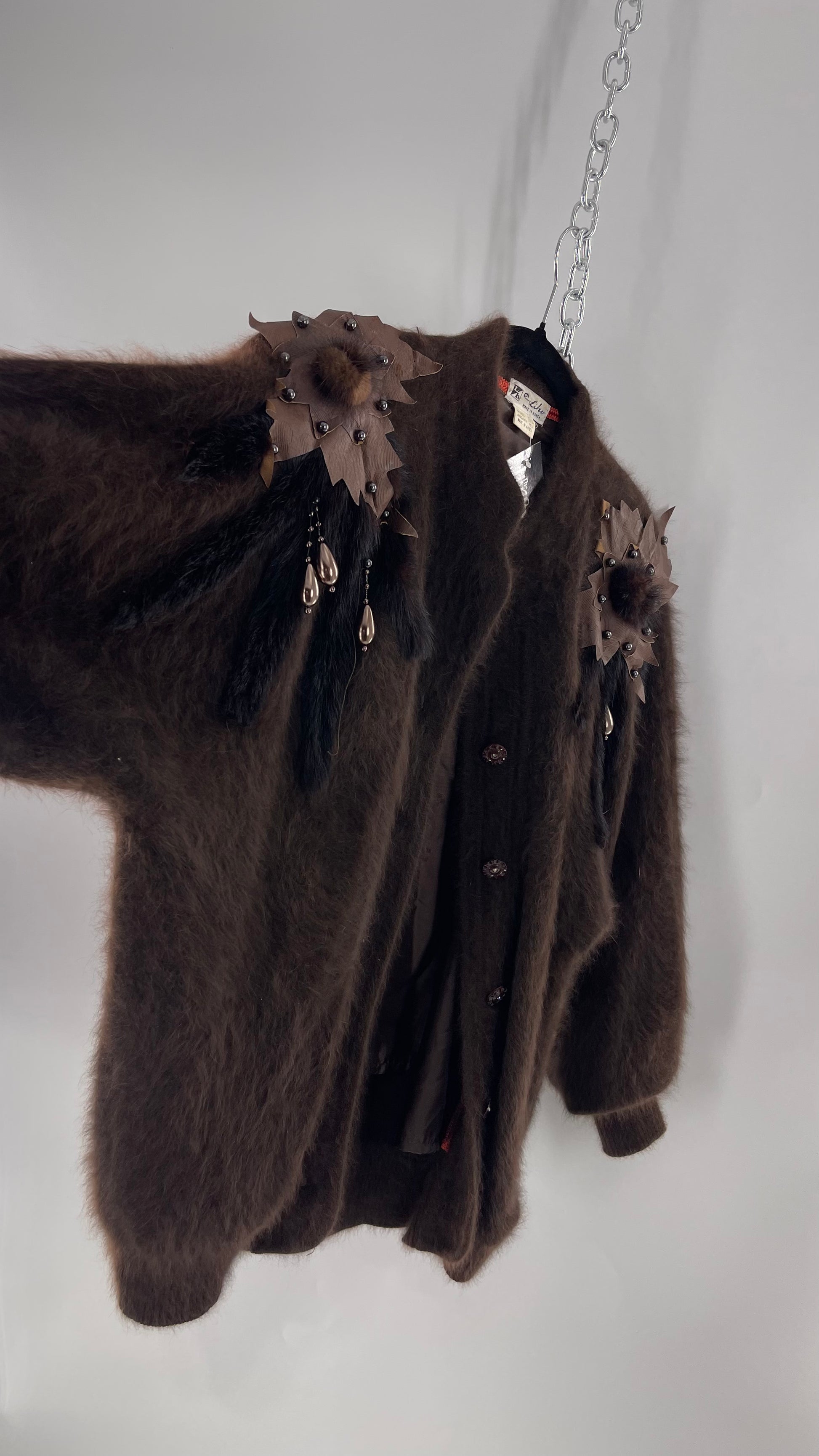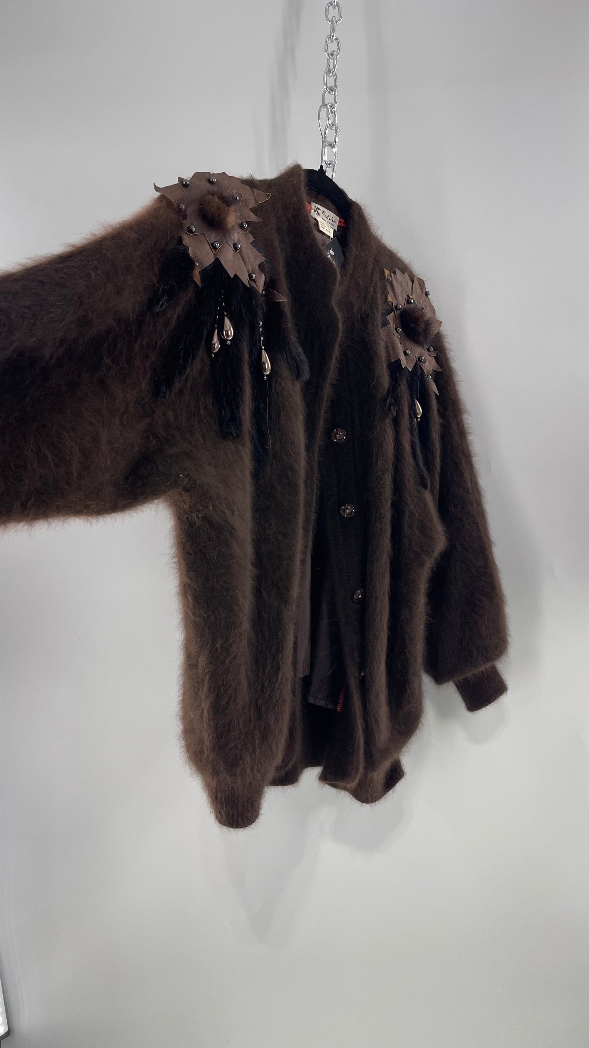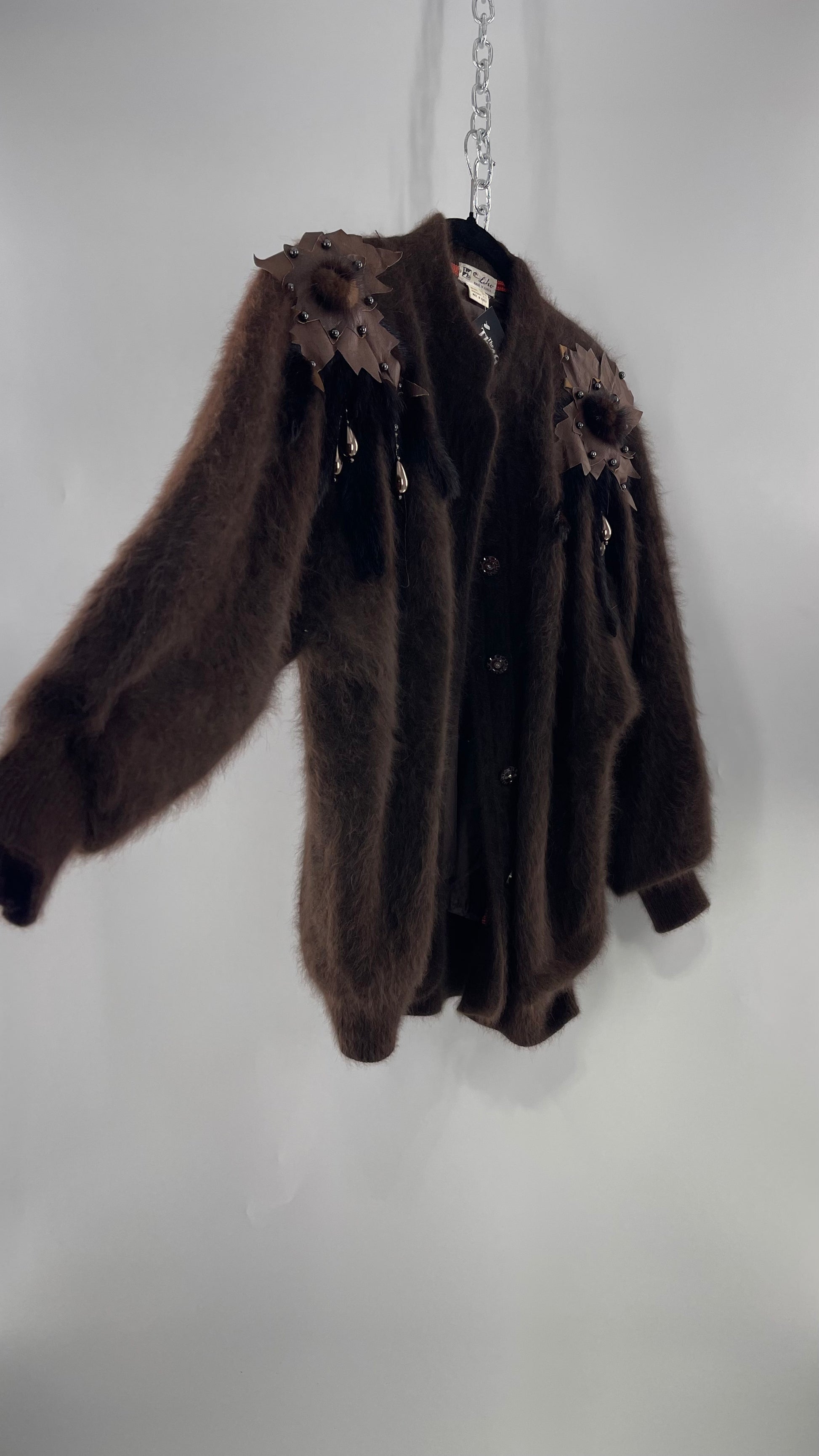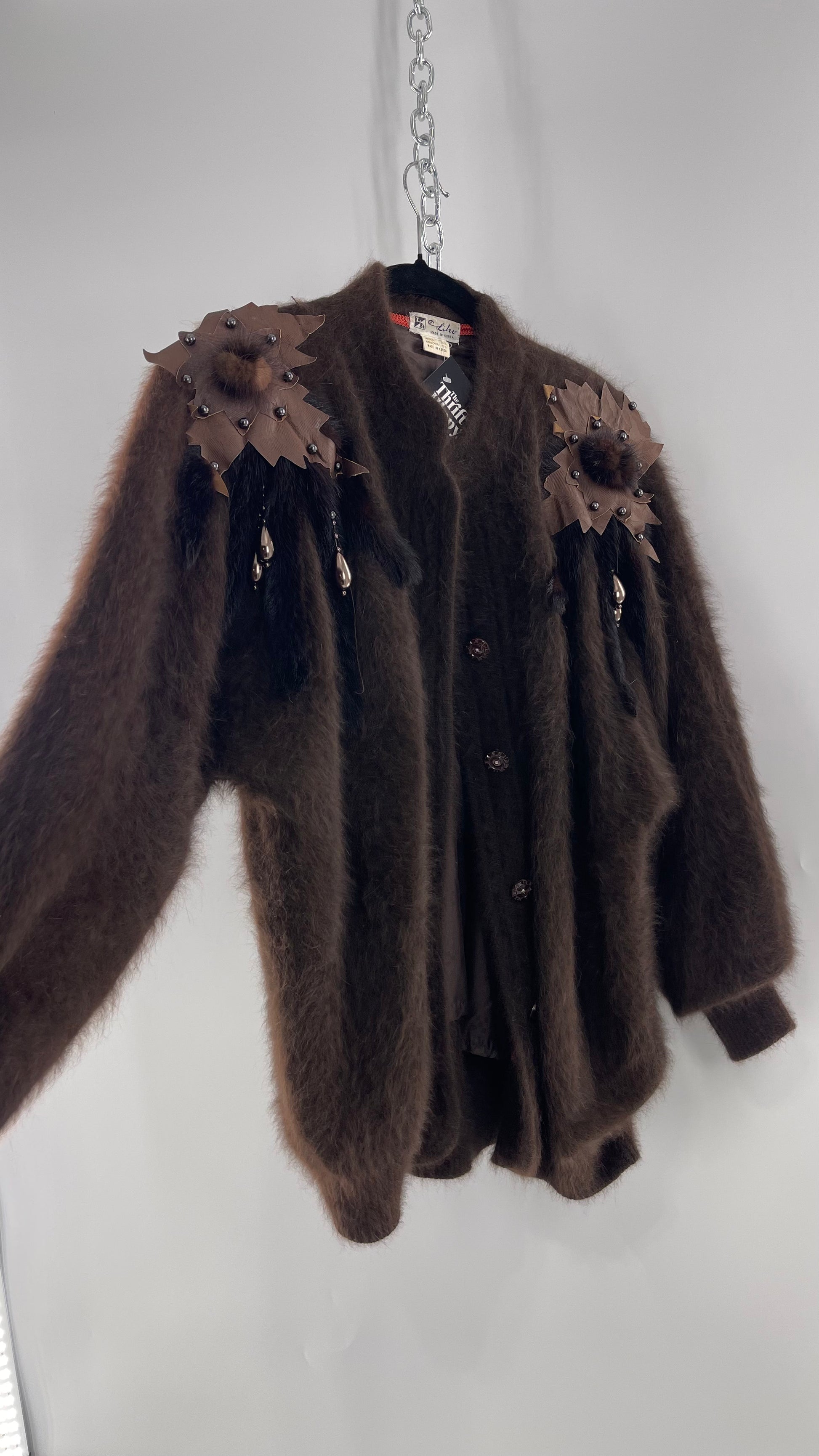 Liho Korean Vintage Brown Cardigan with Leather, Fur and Beaded Detailing 15% Wool 75% Angora (C)(Medium)