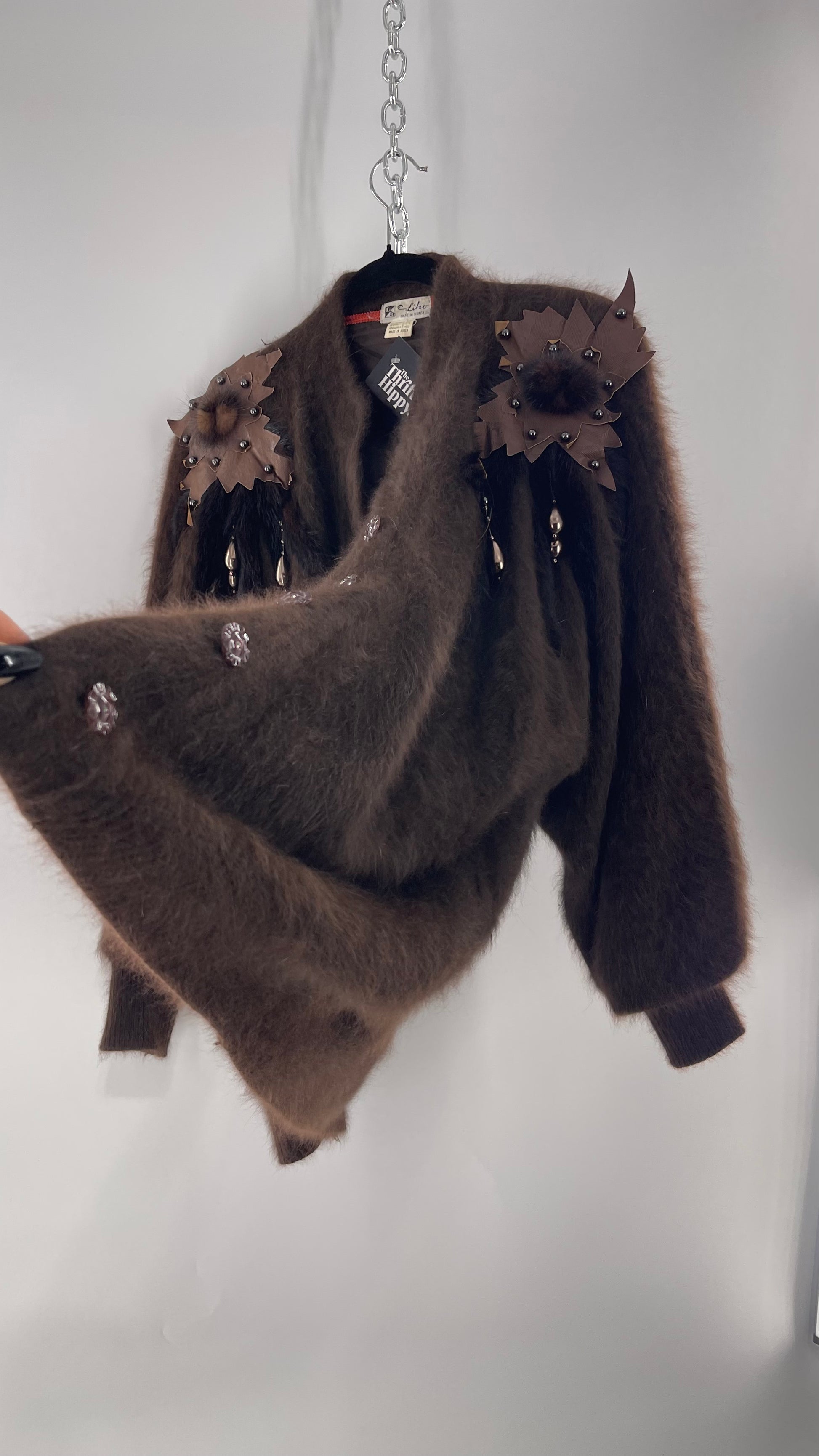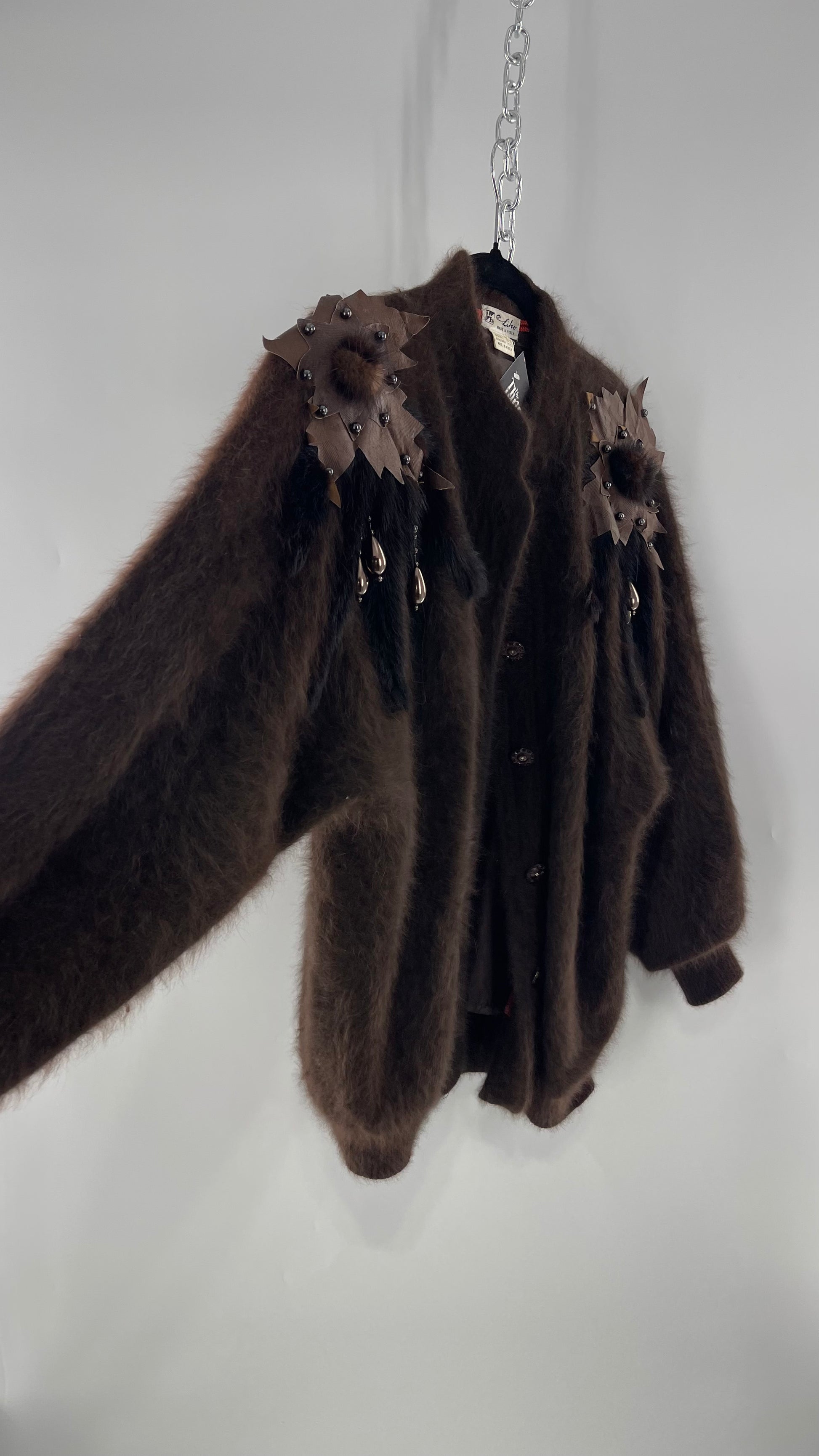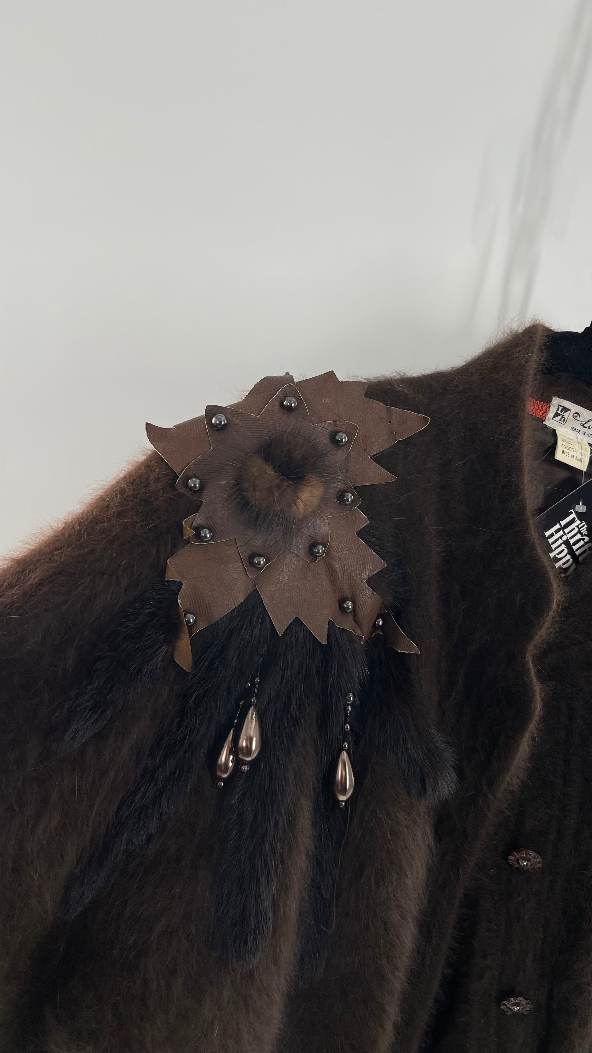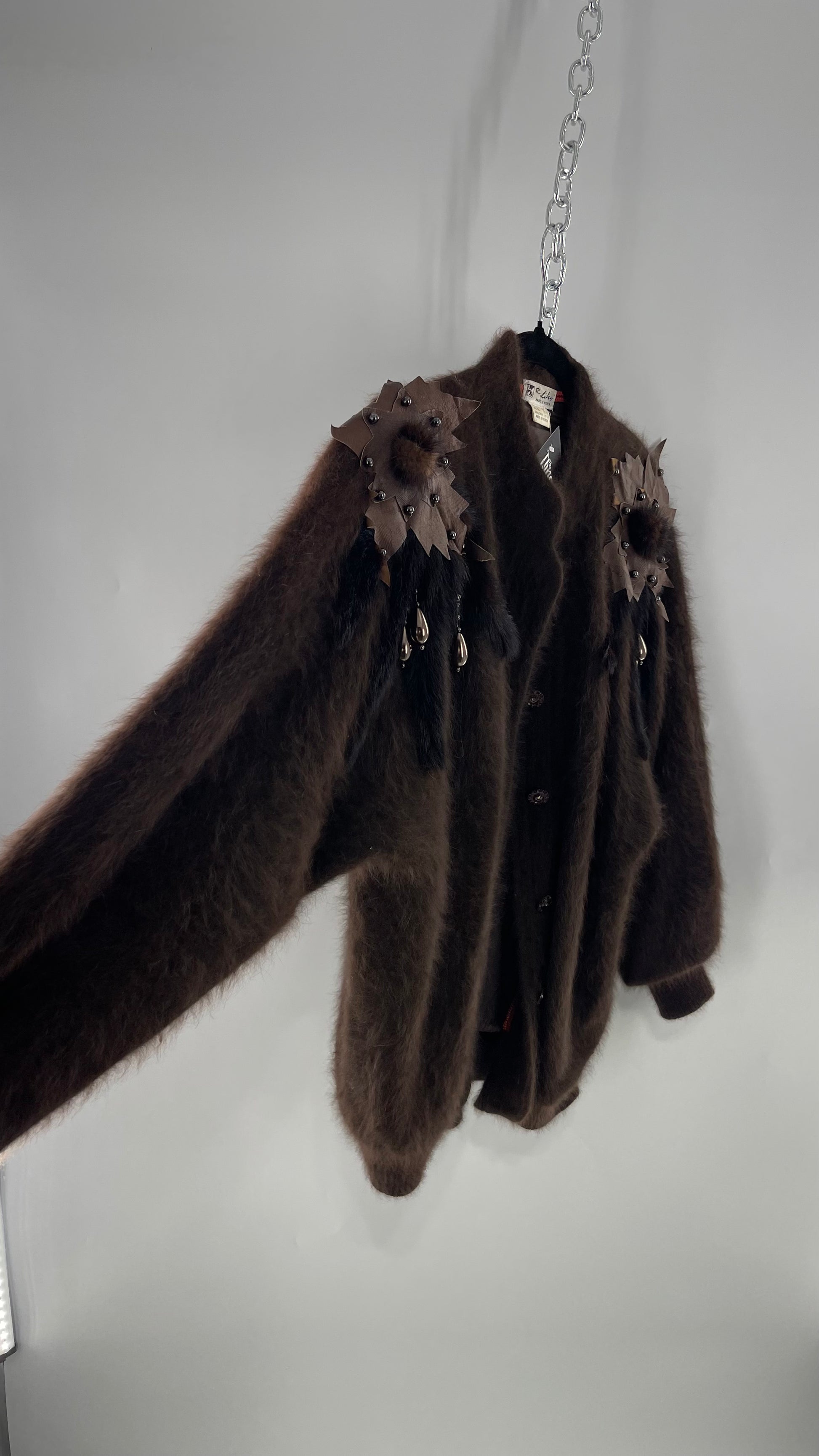 Liho Korean Vintage Brown Cardigan with Leather, Fur and Beaded Detailing 15% Wool 75% Angora (C)(Medium)