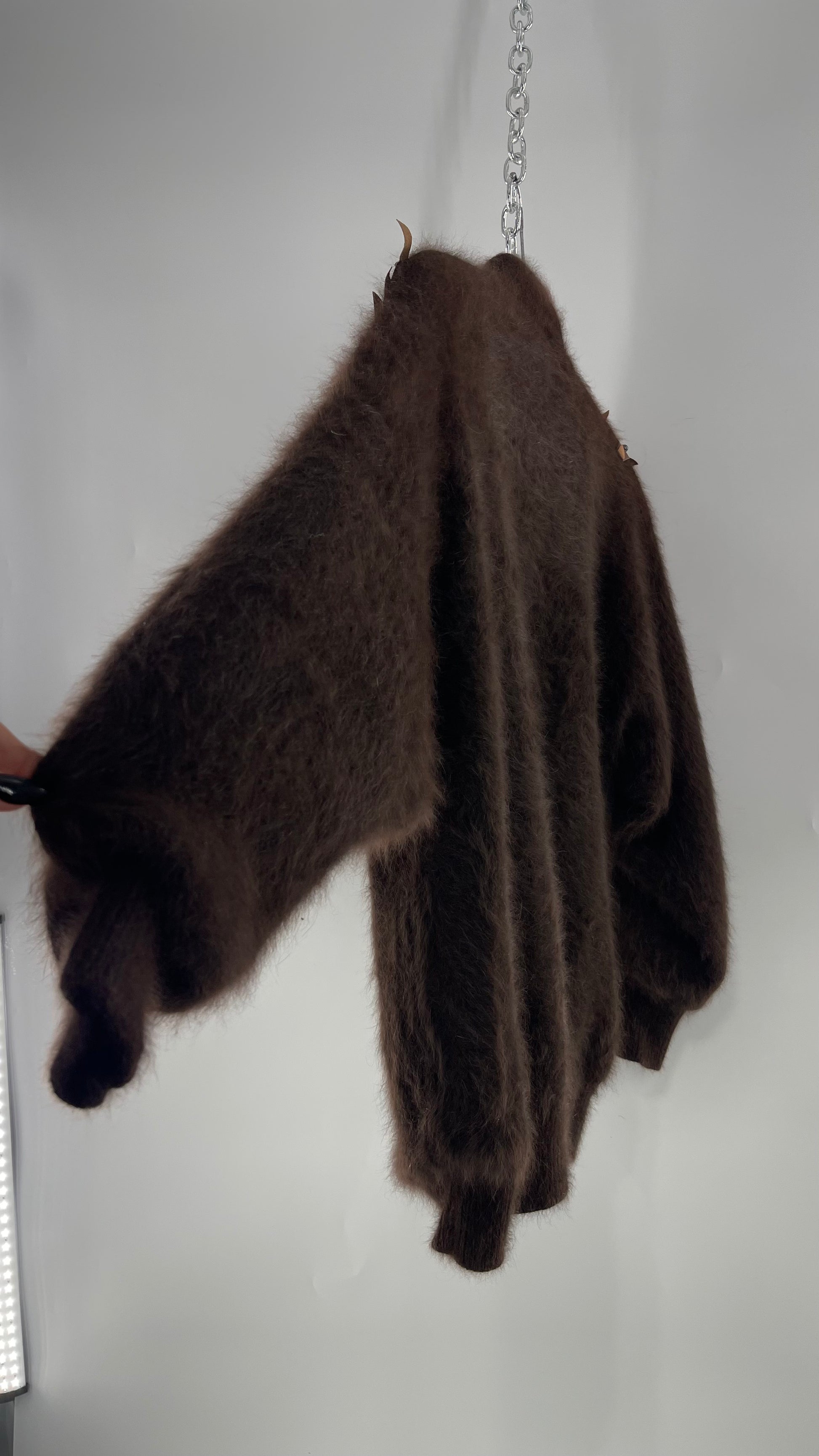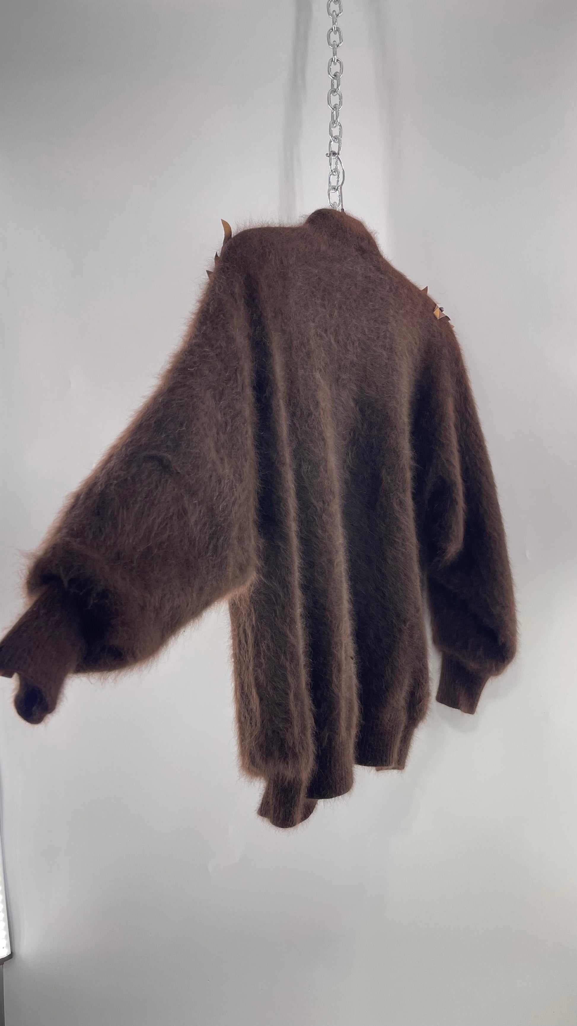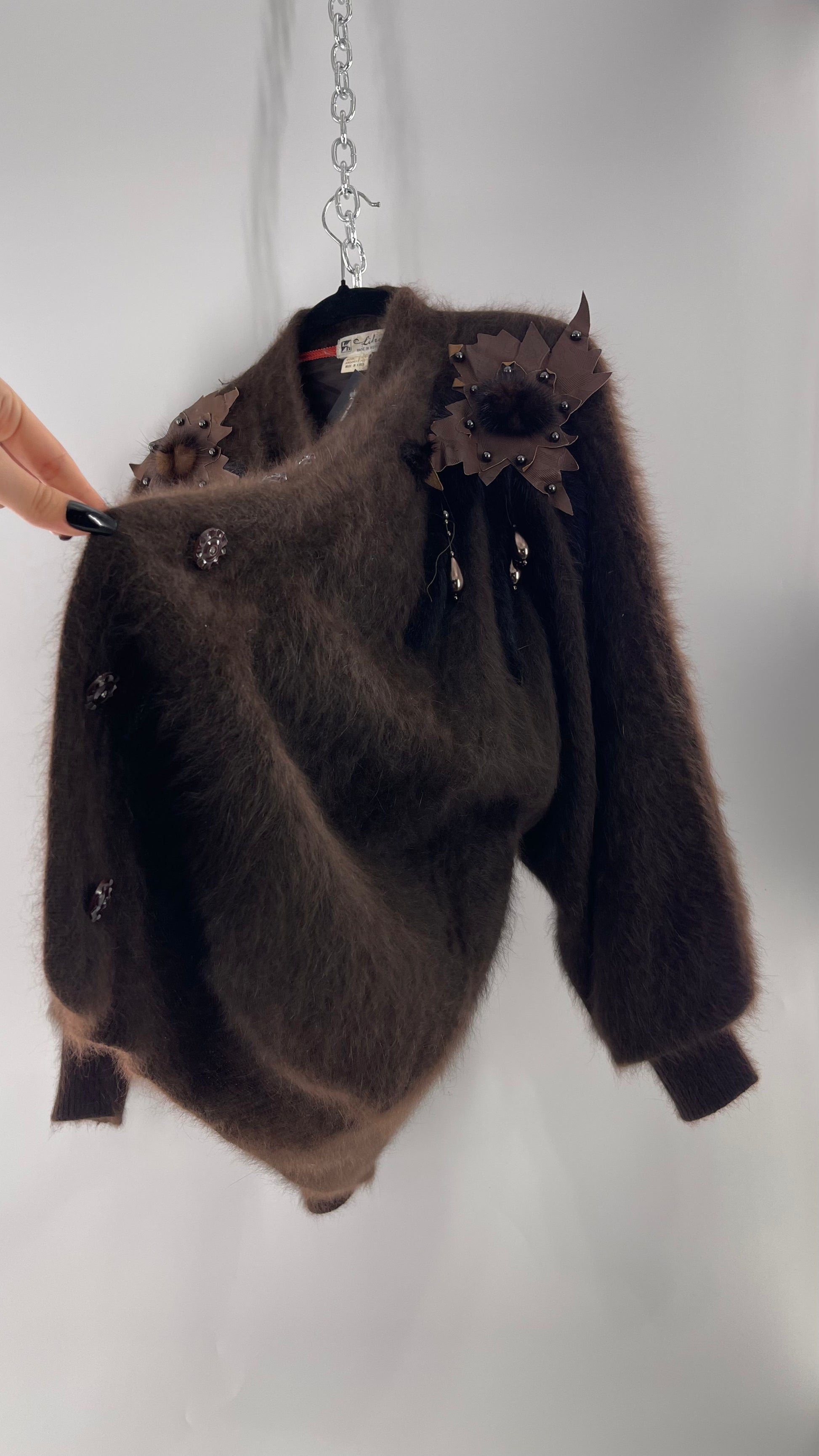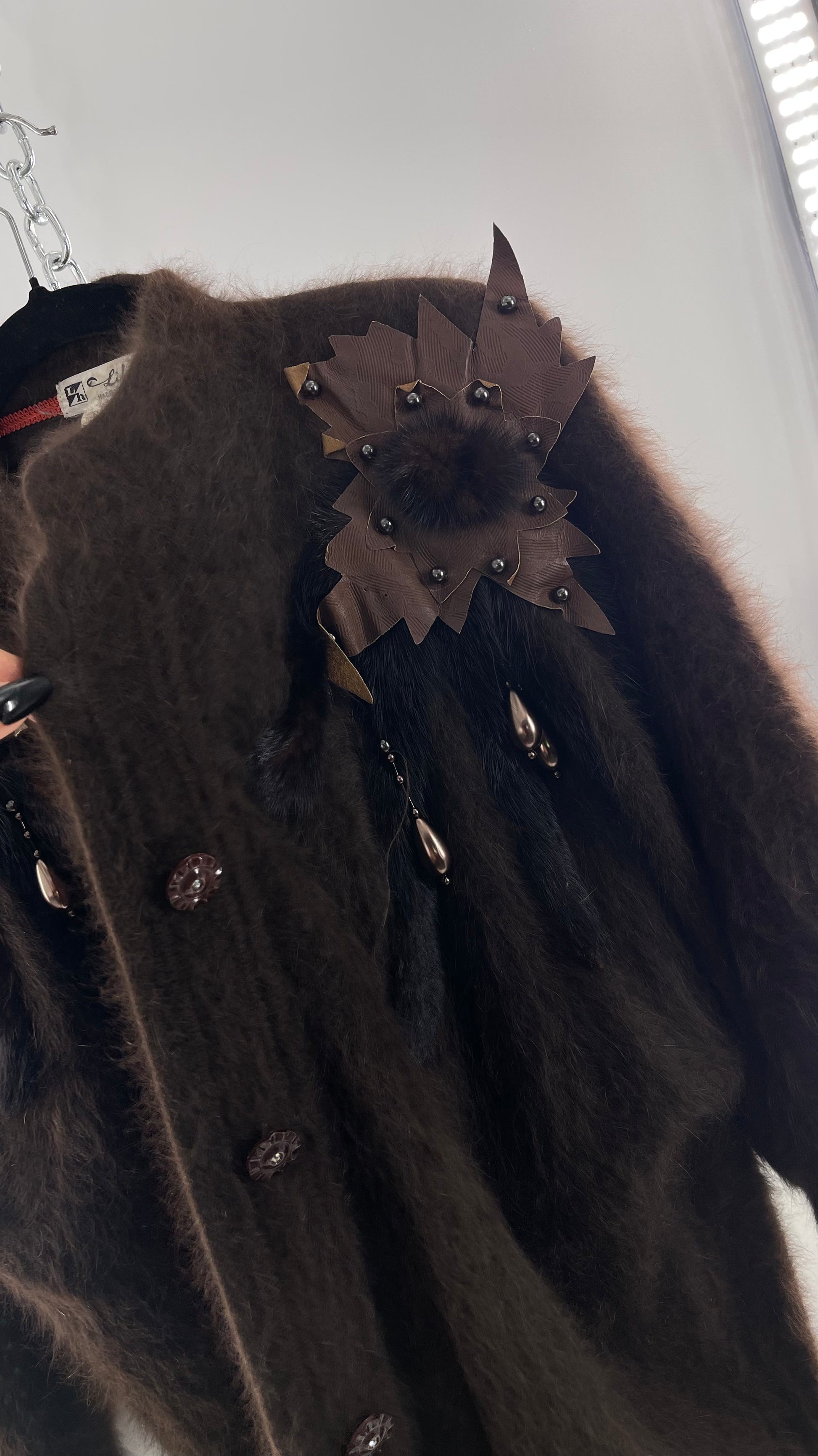 Liho Korean Vintage Brown Cardigan with Leather, Fur and Beaded Detailing 15% Wool 75% Angora (C)(Medium)