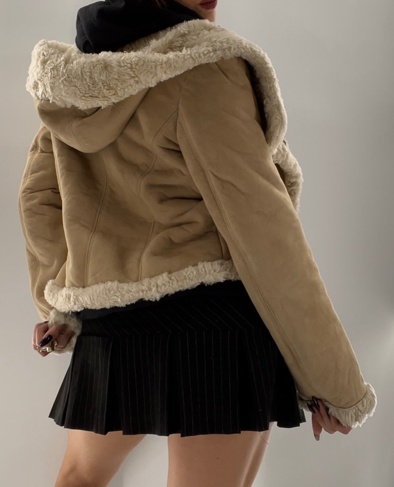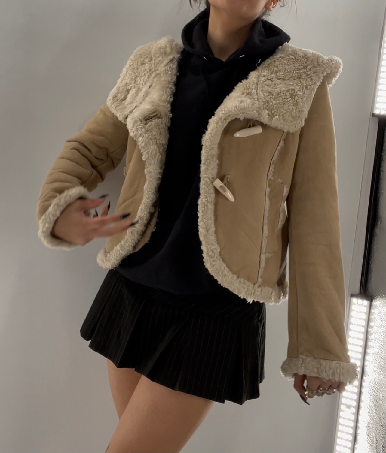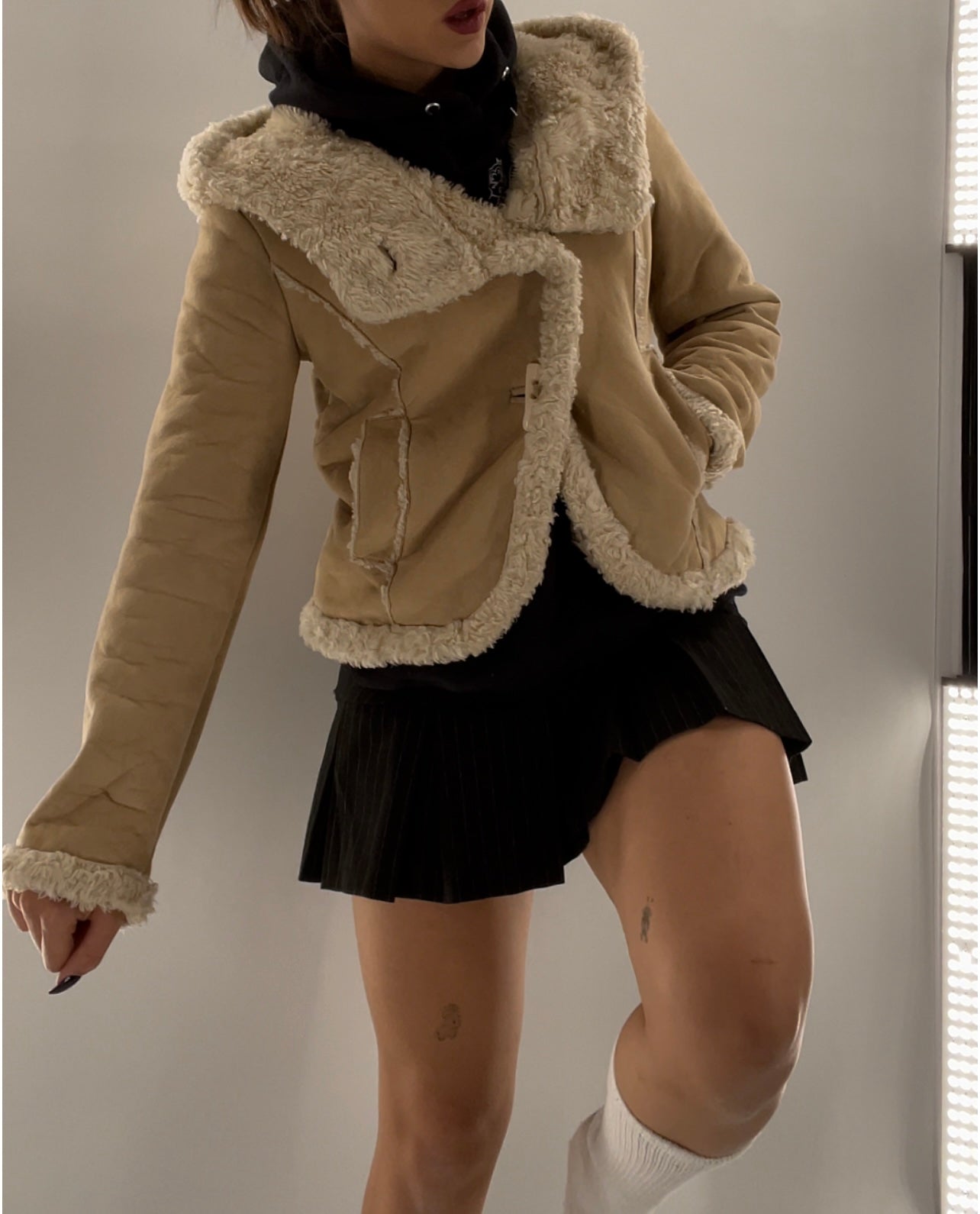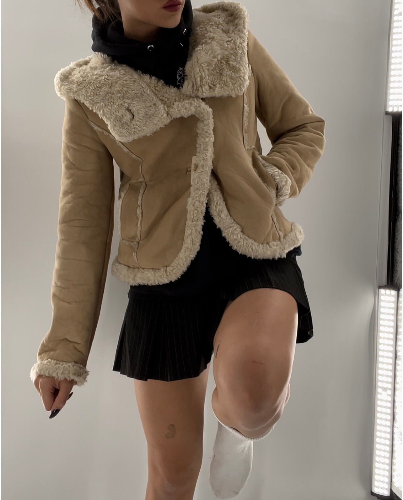 Xhilaration tan faux suede jacket with faux fur trim and imitation bone buttons