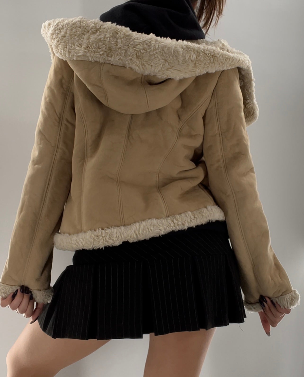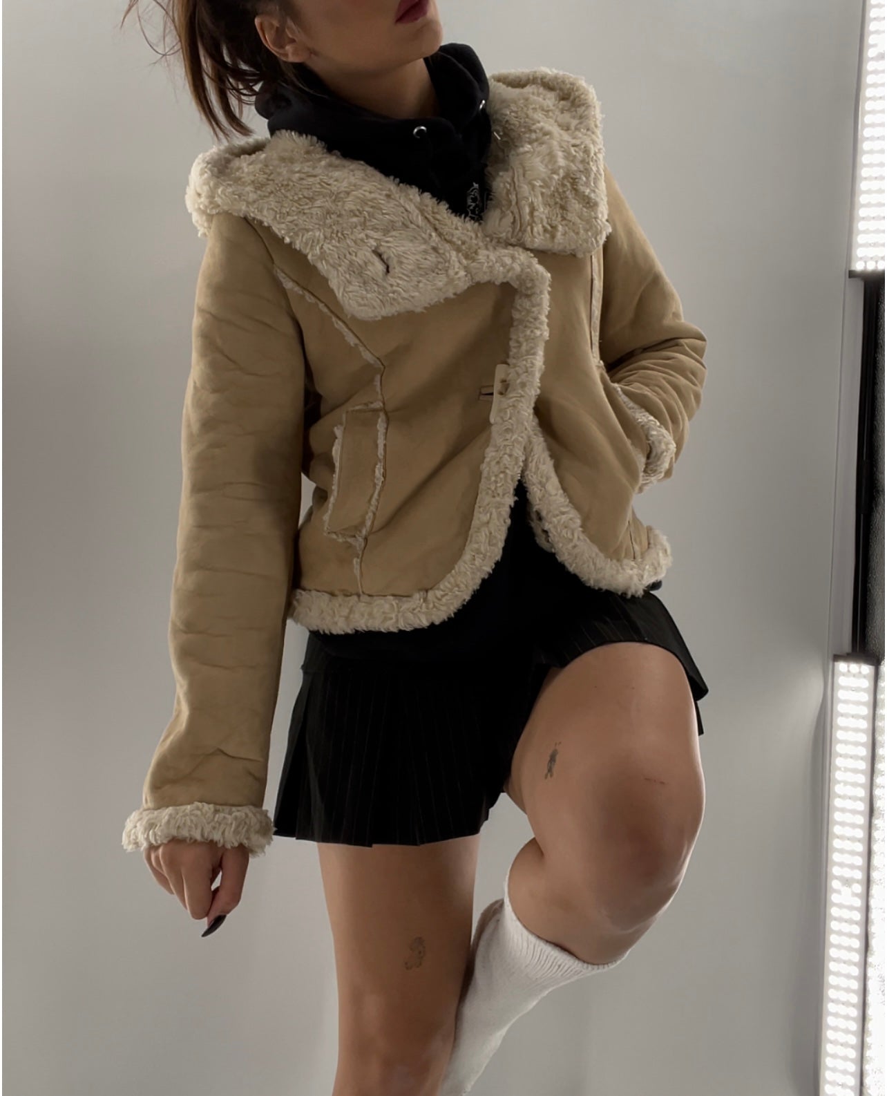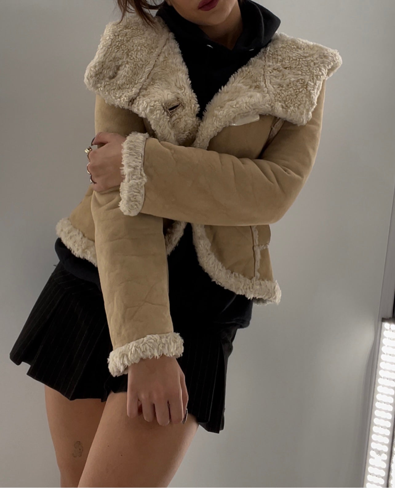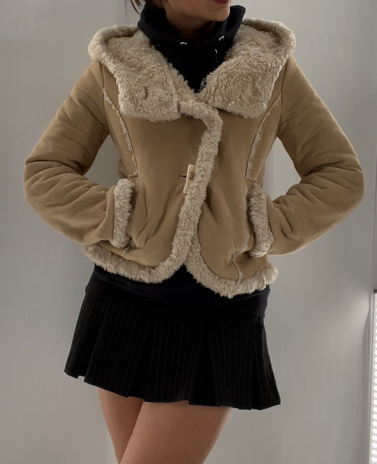Xhilaration tan faux suede jacket with faux fur trim and imitation bone buttons