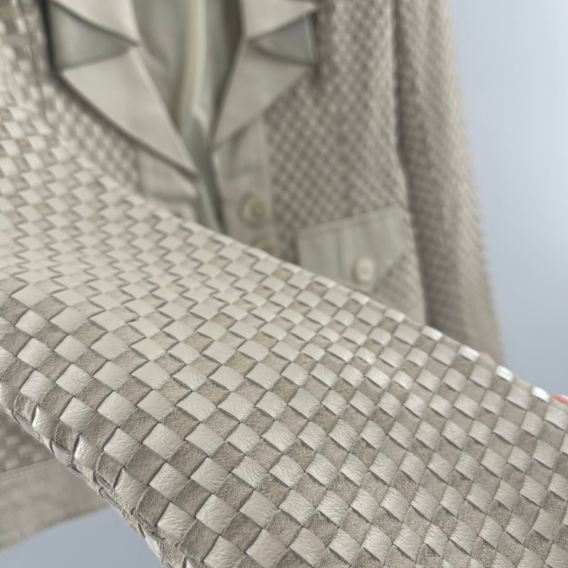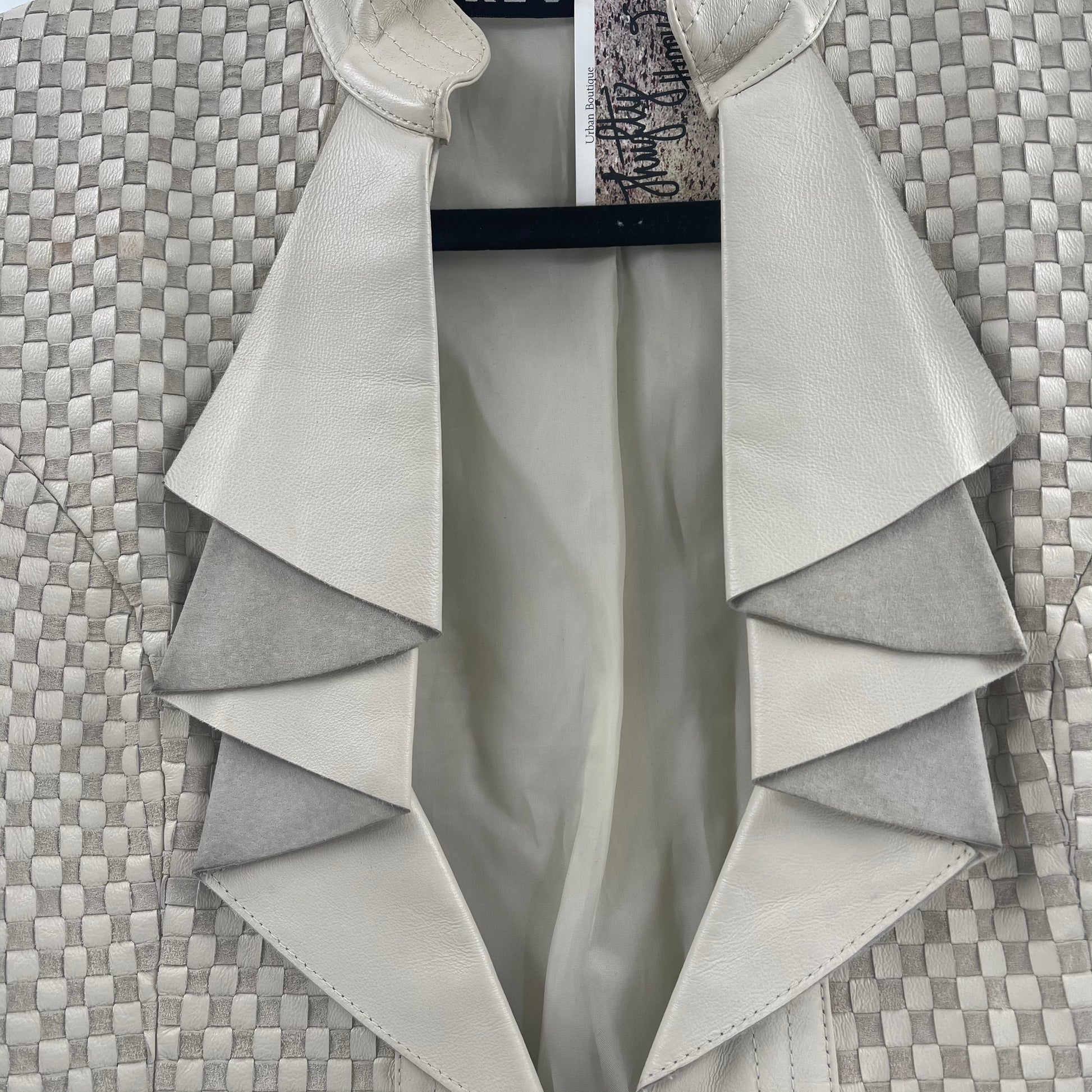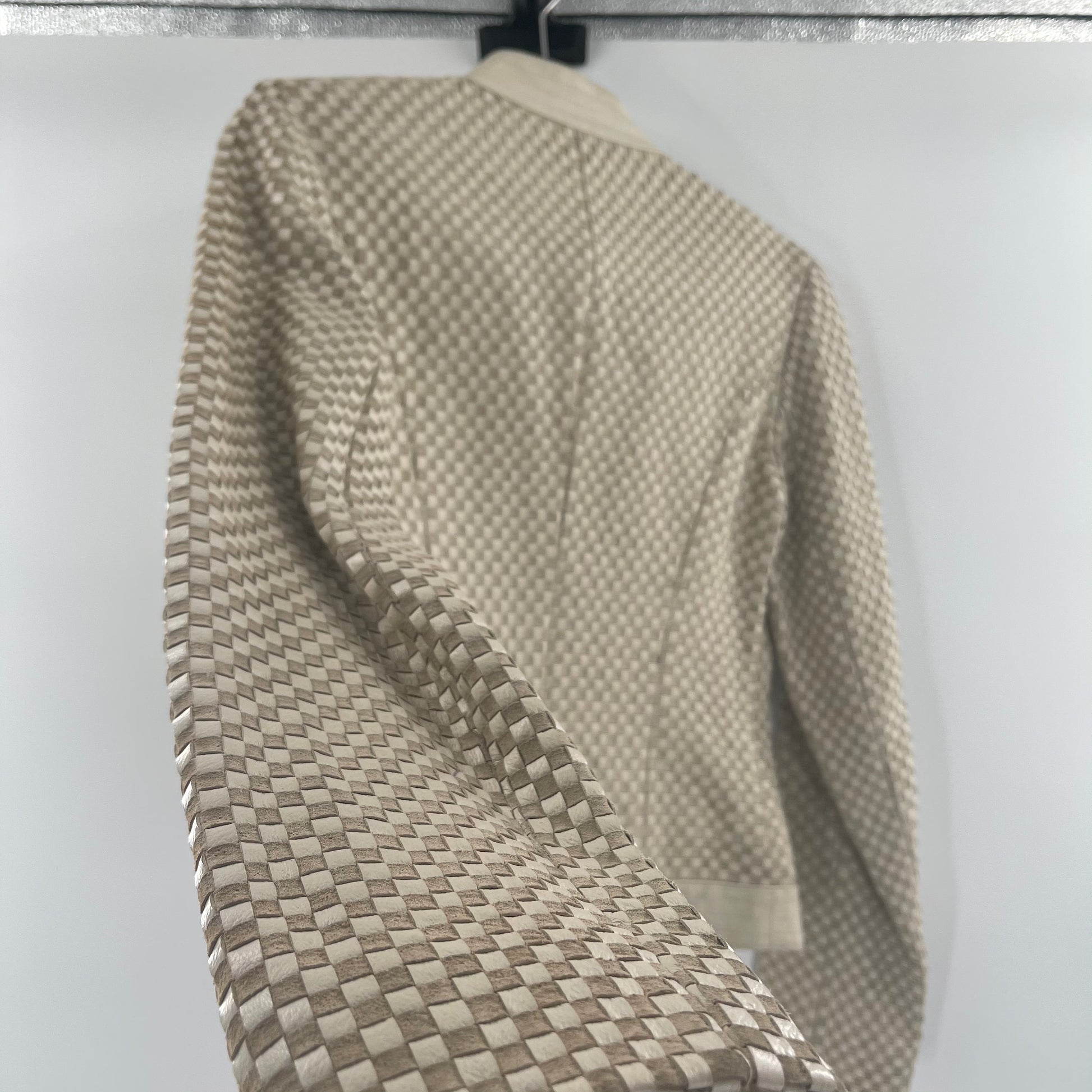 Vintage Revue beige leather blazer with suede/leather checkerprint pattern and ruffled lapel, NO SIZE WE ESTIMATE THAT ITS A MEDIUM