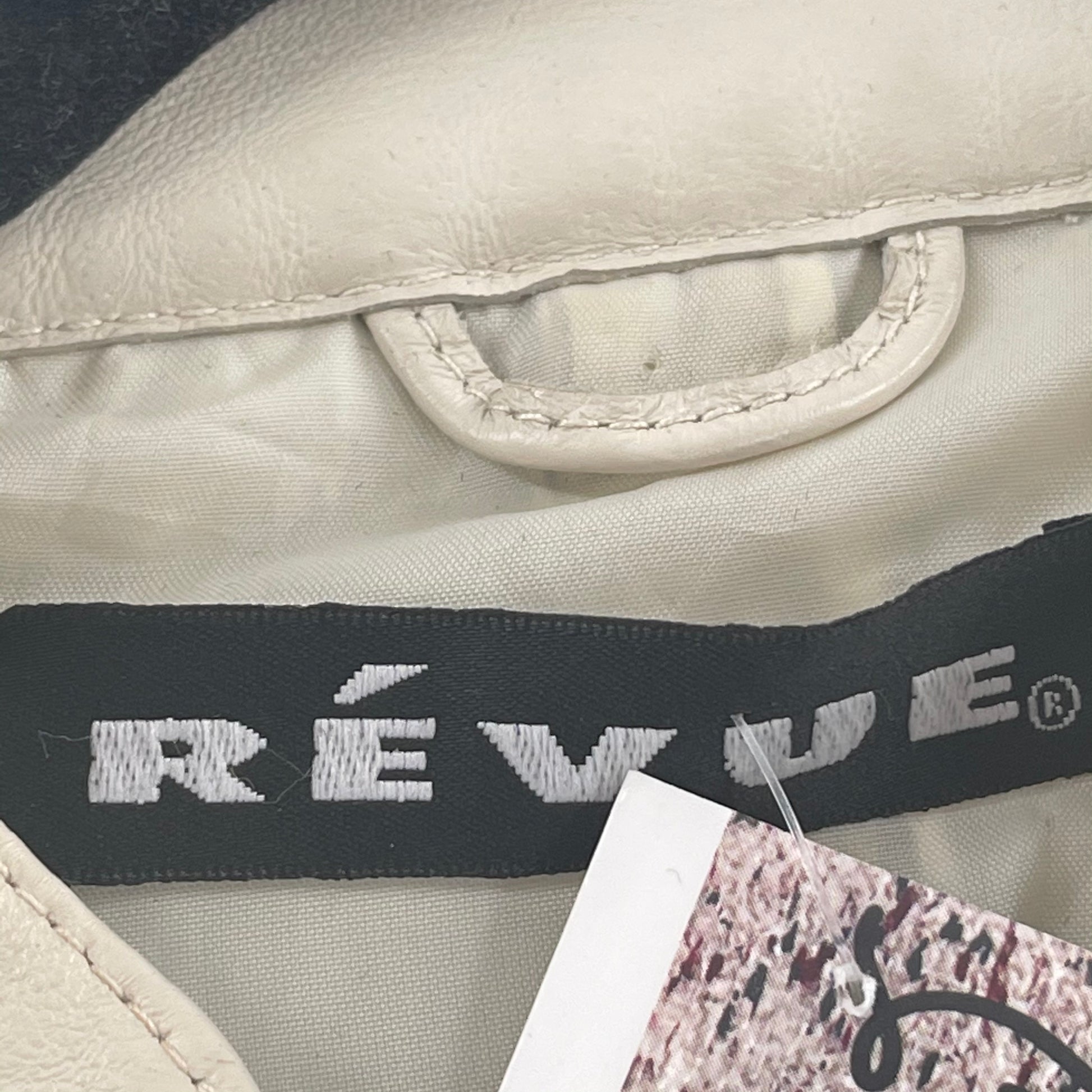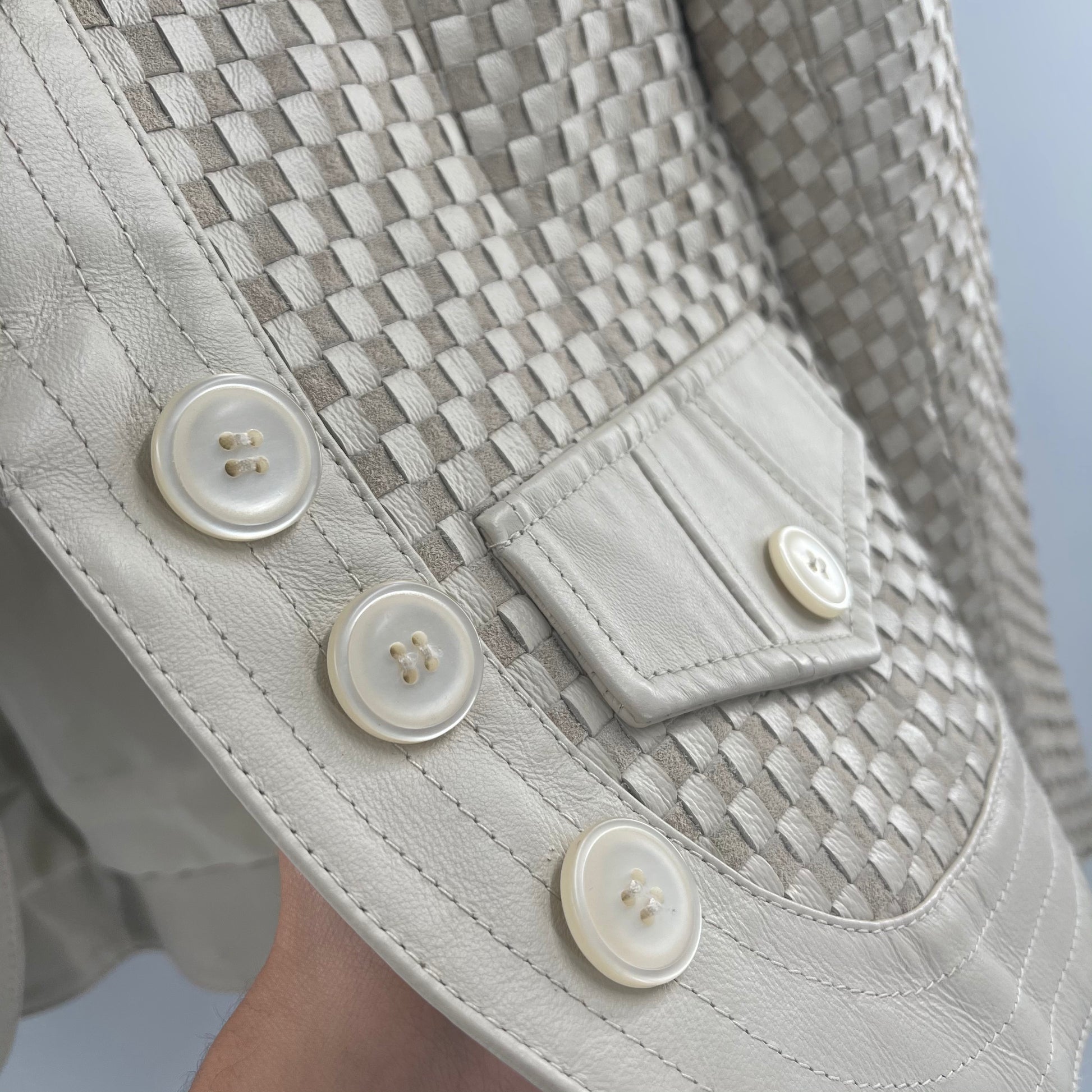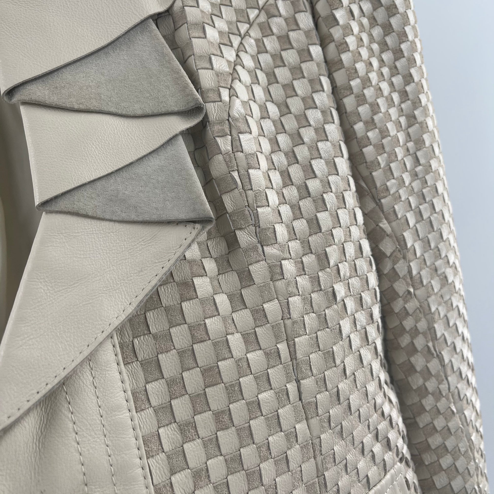 Vintage Revue beige leather blazer with suede/leather checkerprint pattern and ruffled lapel, NO SIZE WE ESTIMATE THAT ITS A MEDIUM