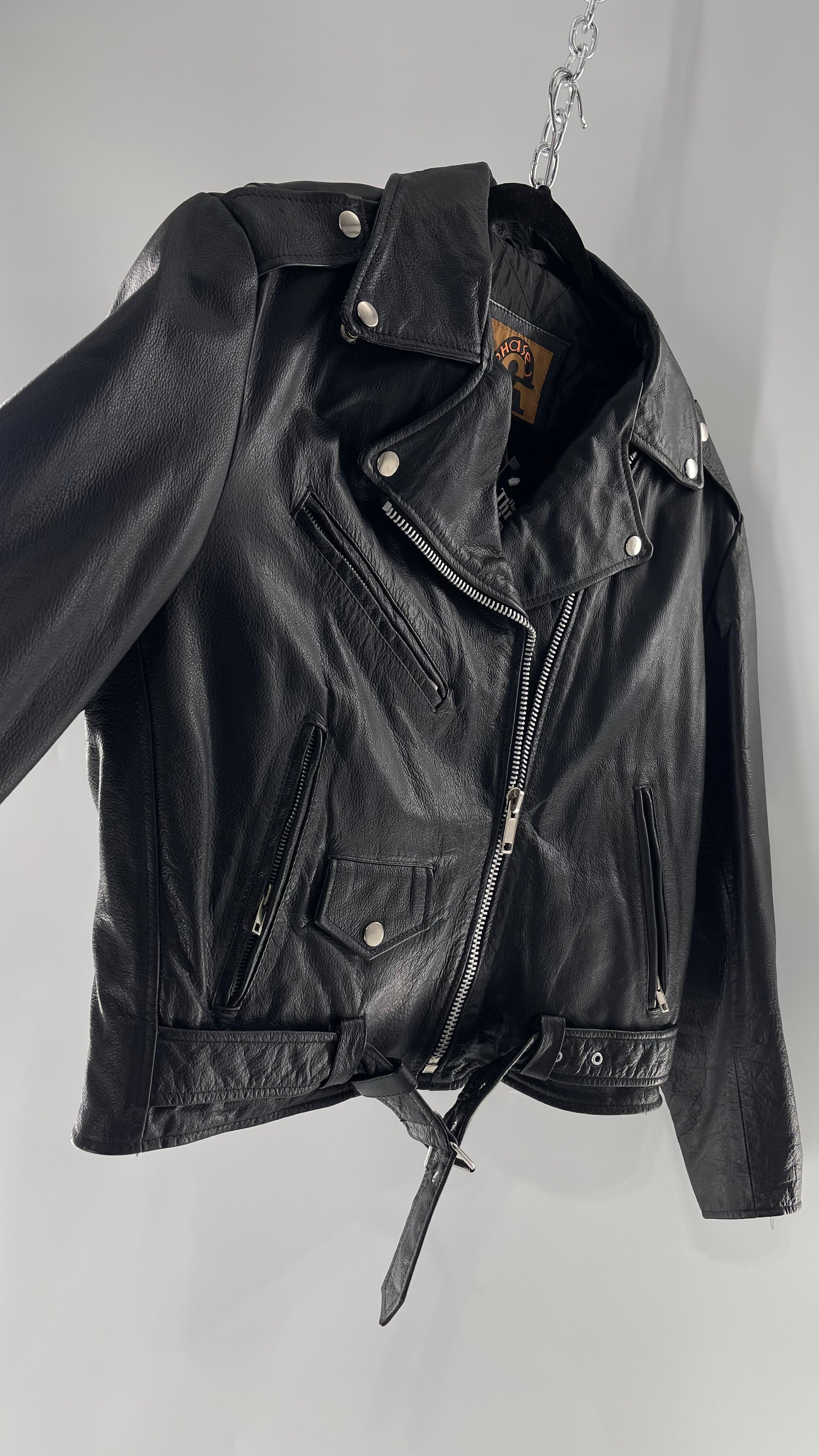 Vintage PHASE II Leather Motorcycle Jacket with Heavy Metal Detailing (Large)