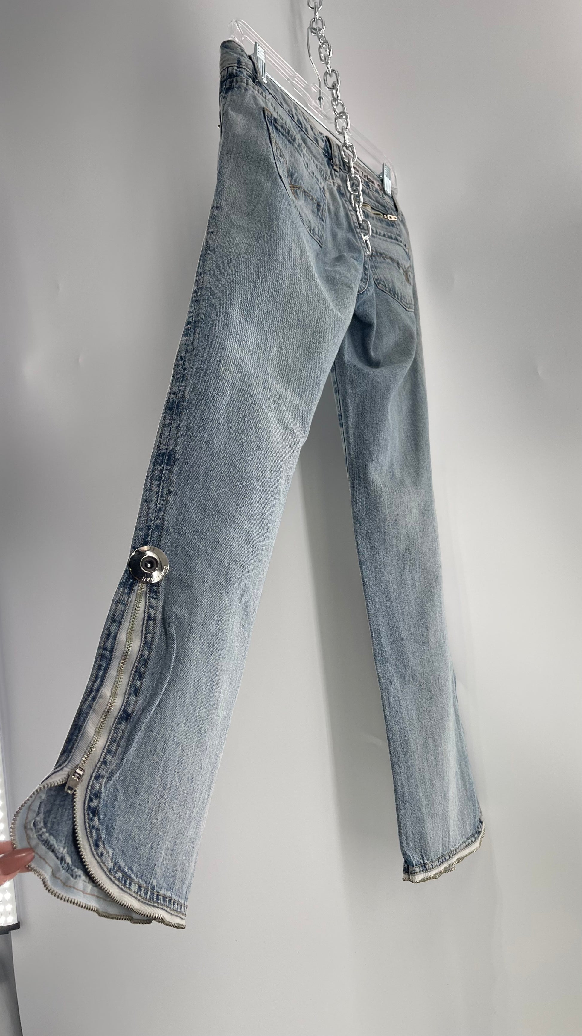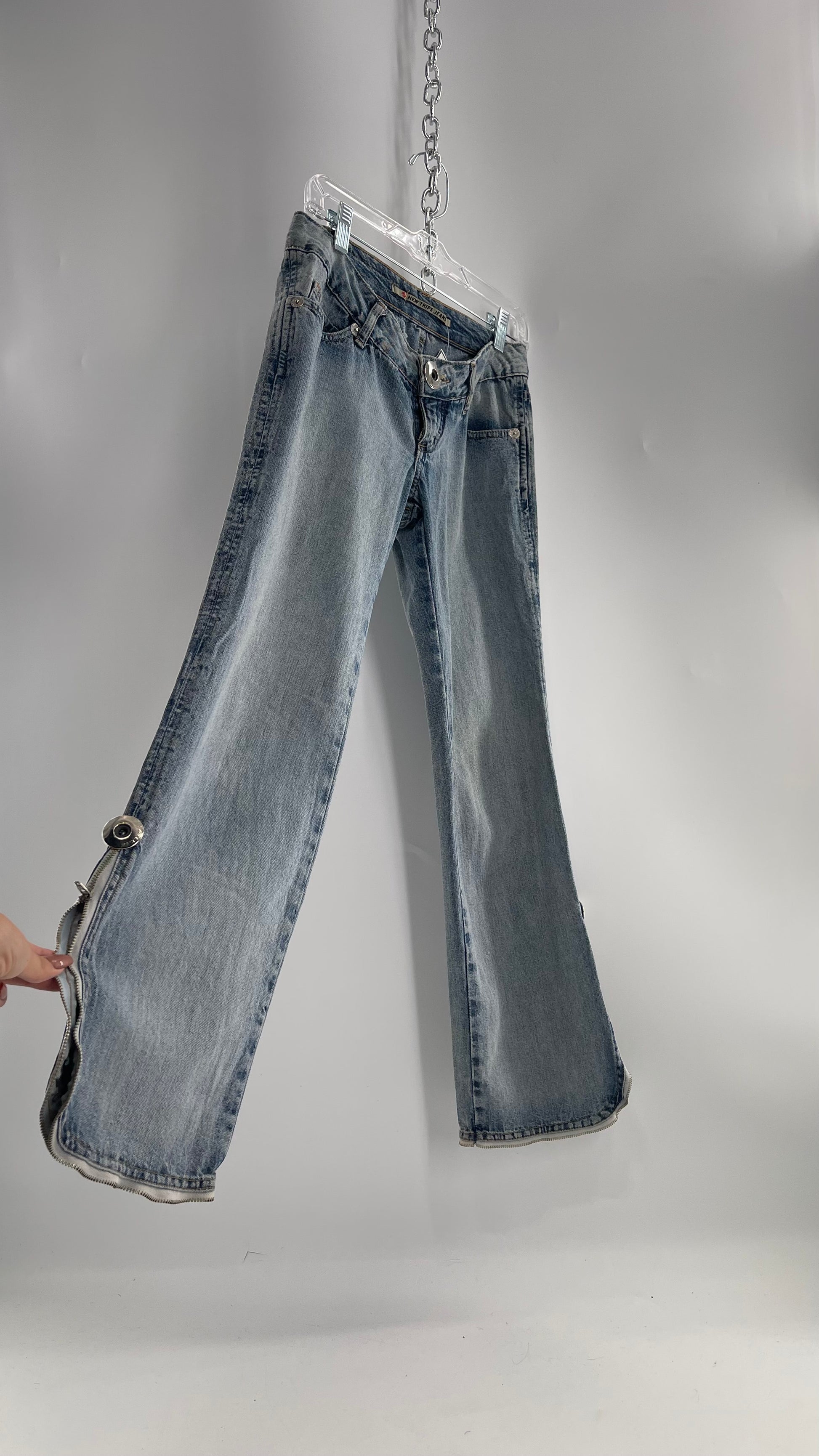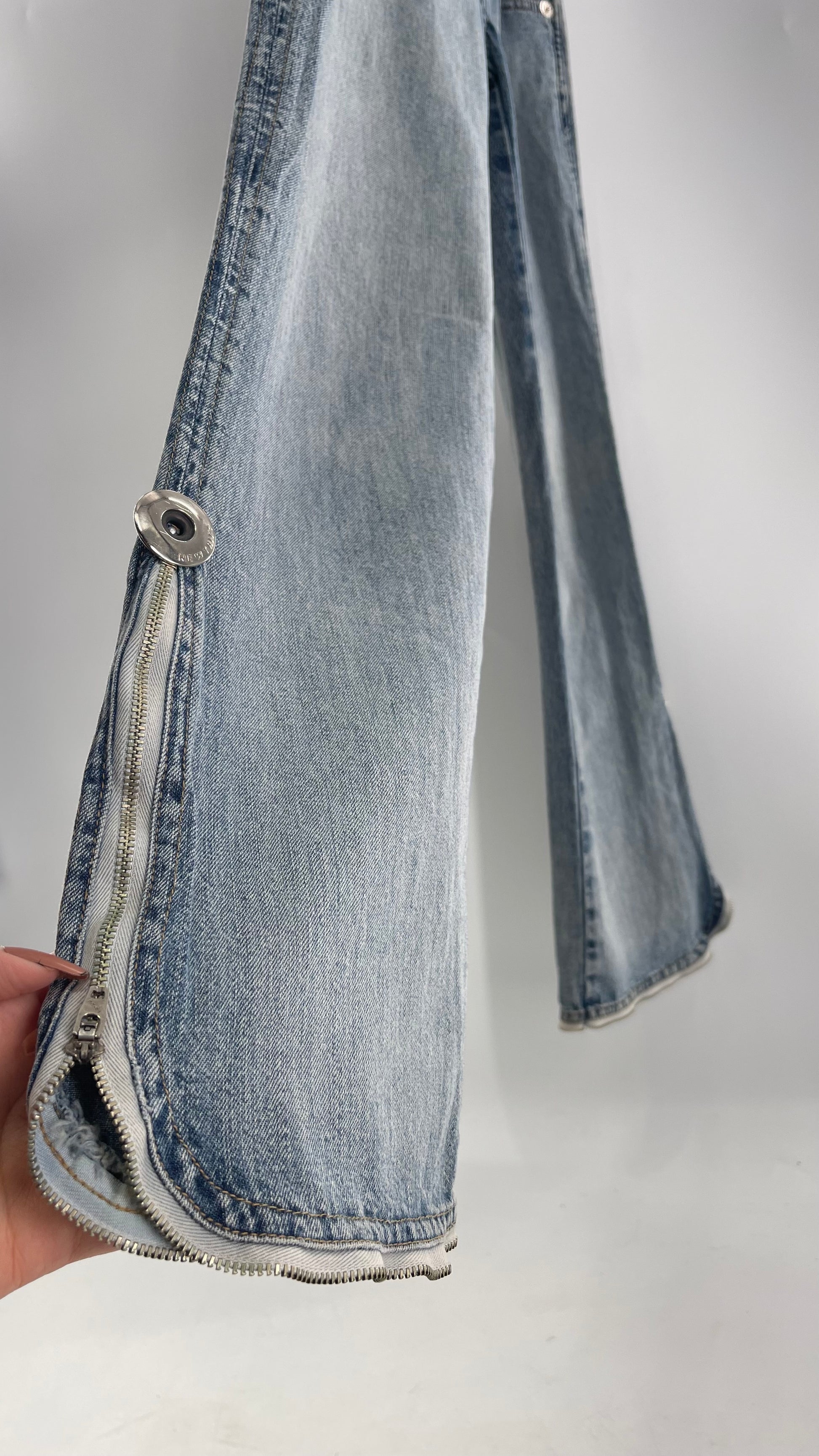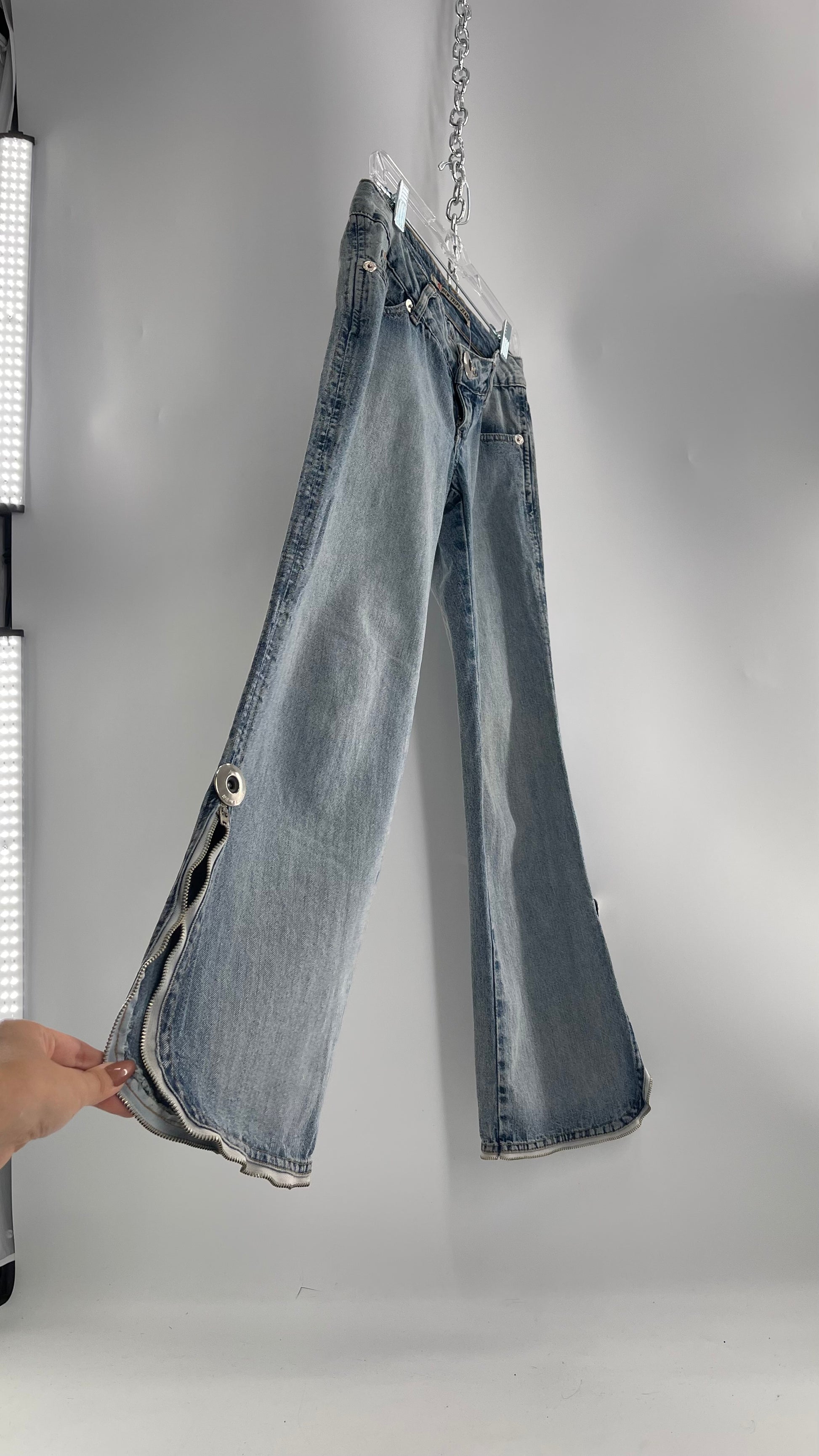 Vintage New Trips Light Wash Kick Flare Jeans with Zipper Hem Detail, V Waistline and Oversized Metal Buttons (40)