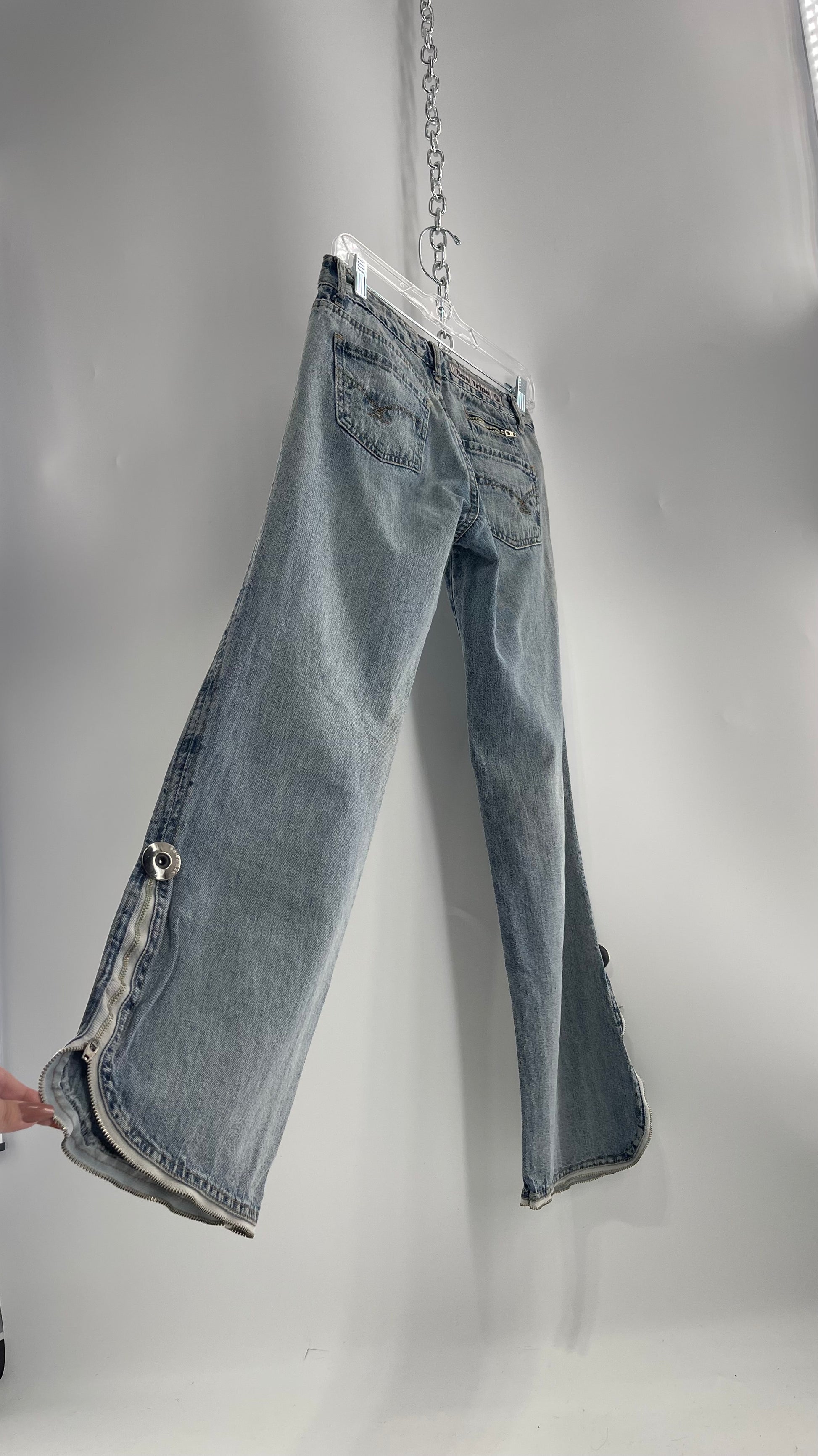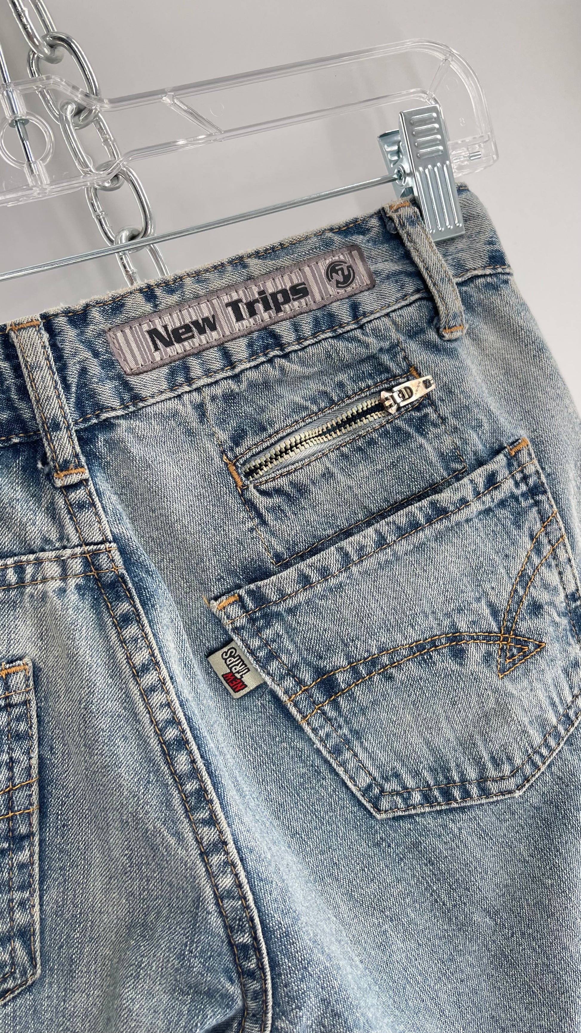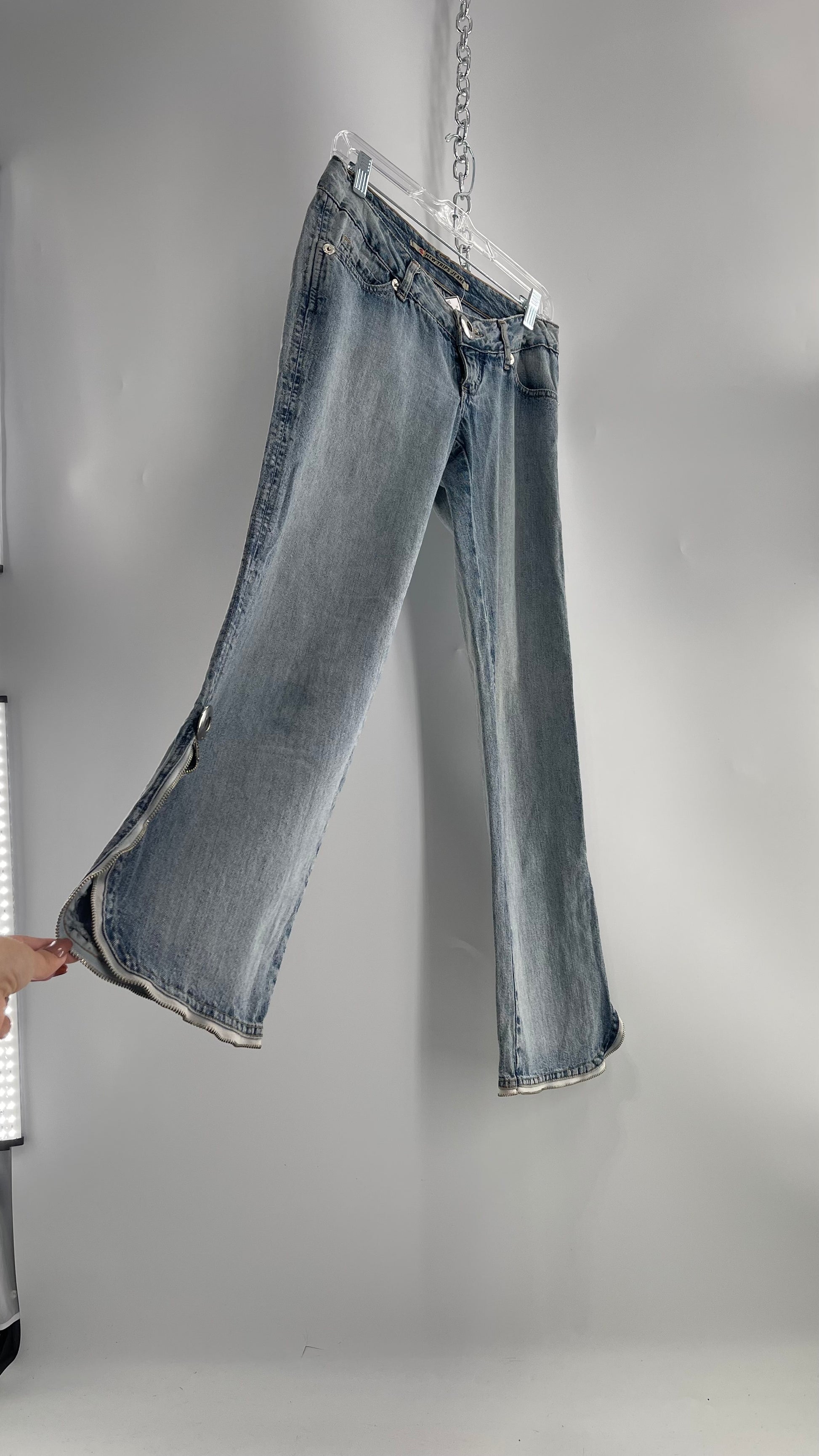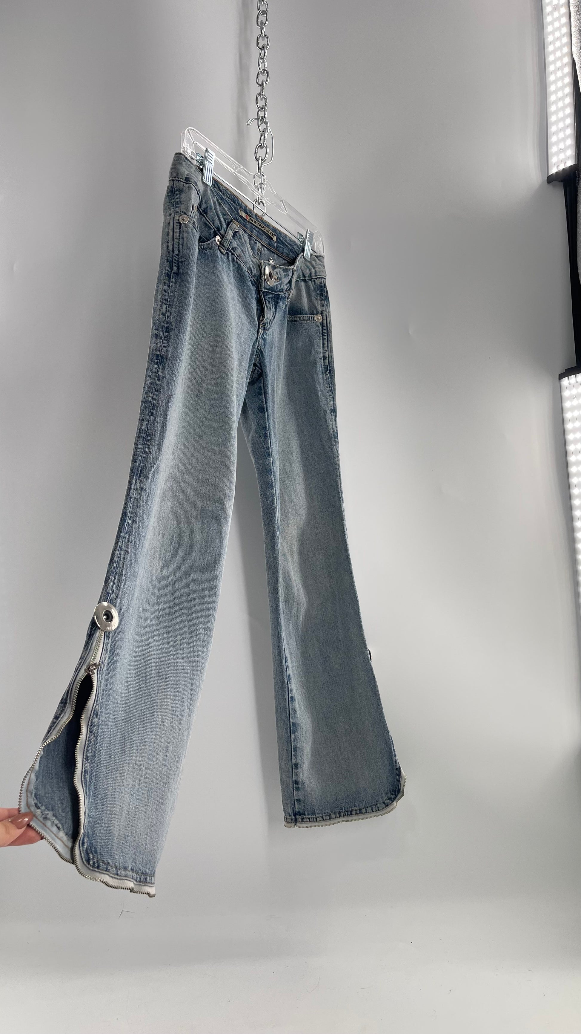 Vintage New Trips Light Wash Kick Flare Jeans with Zipper Hem Detail, V Waistline and Oversized Metal Buttons (40)