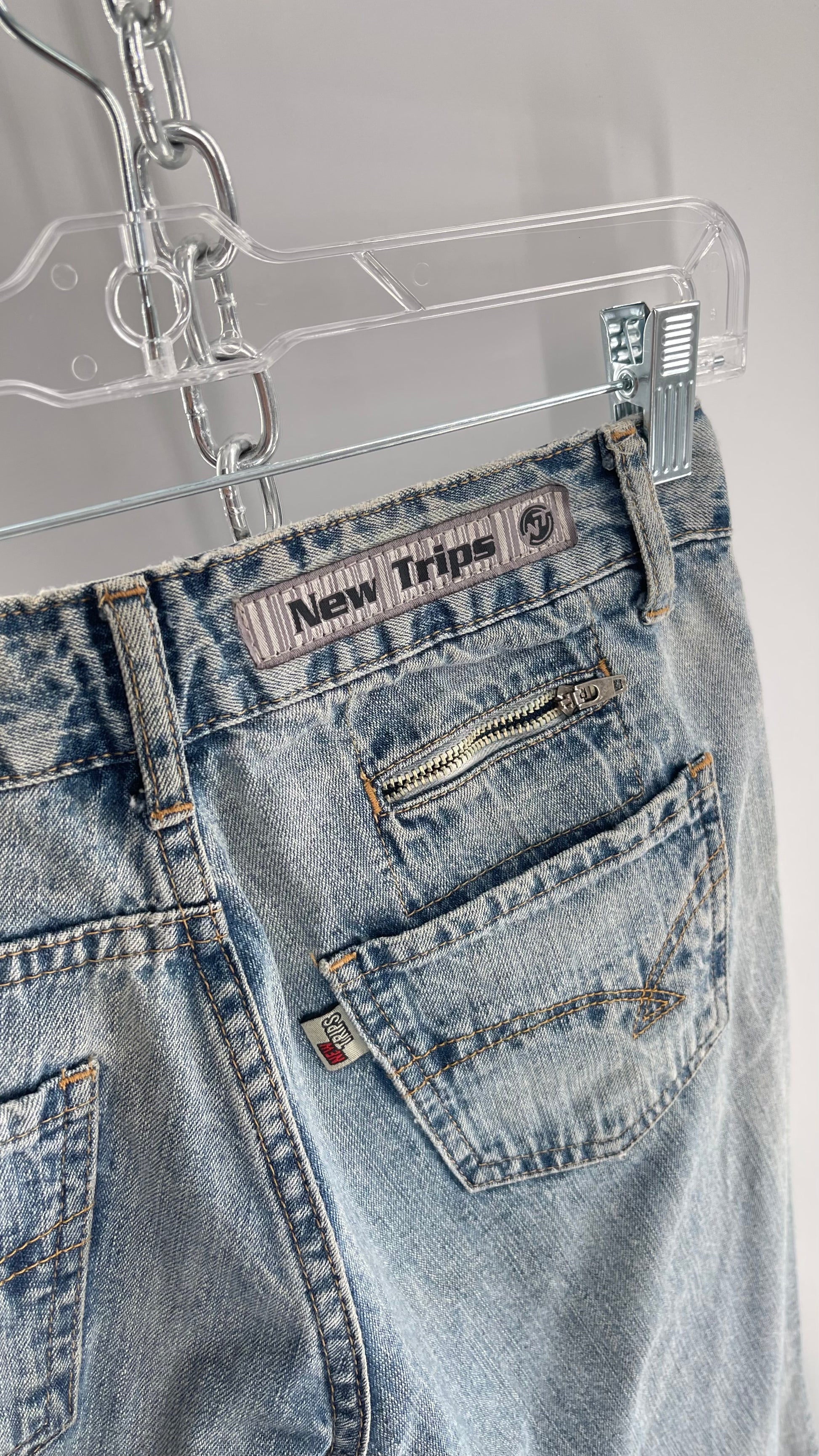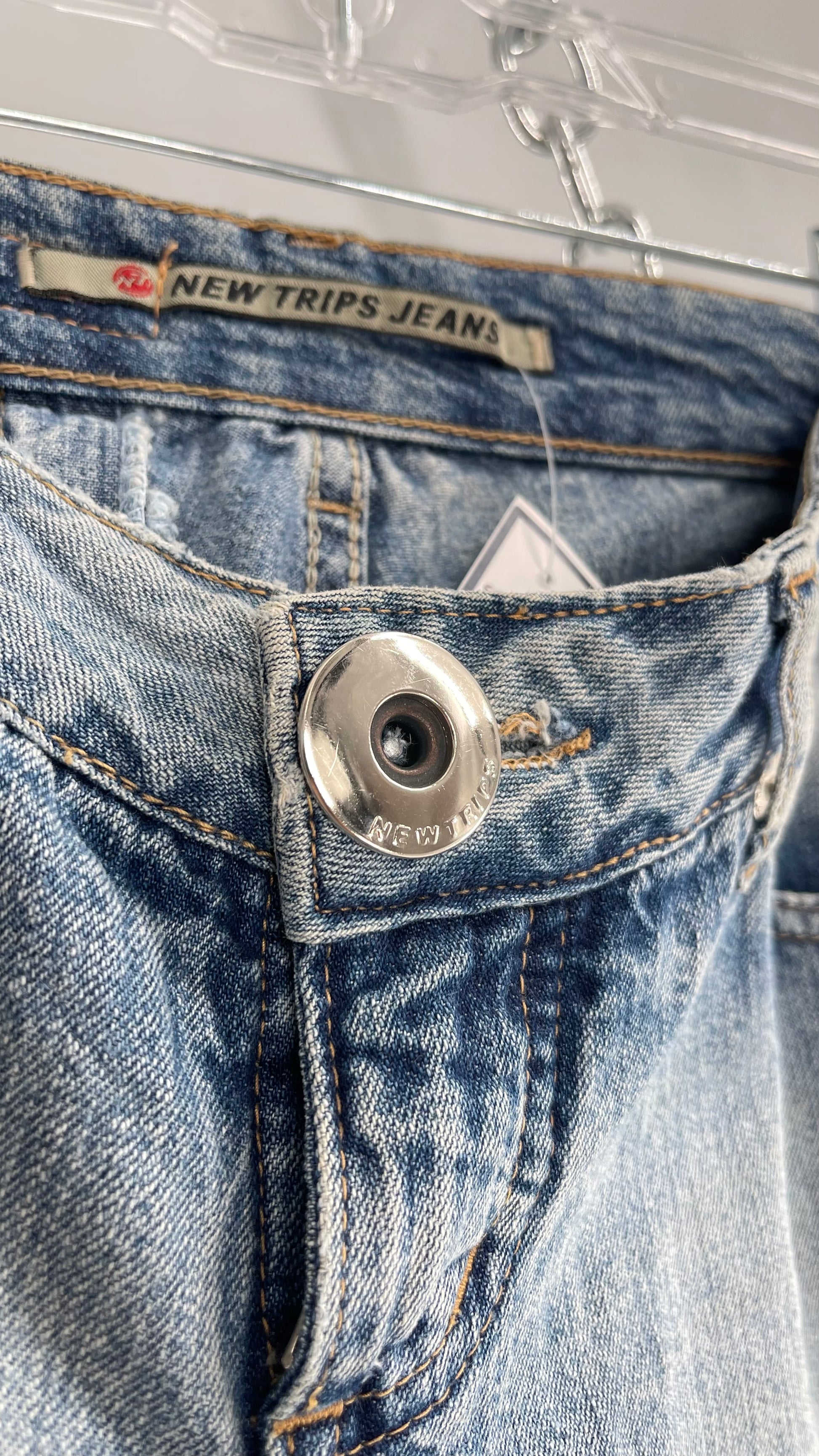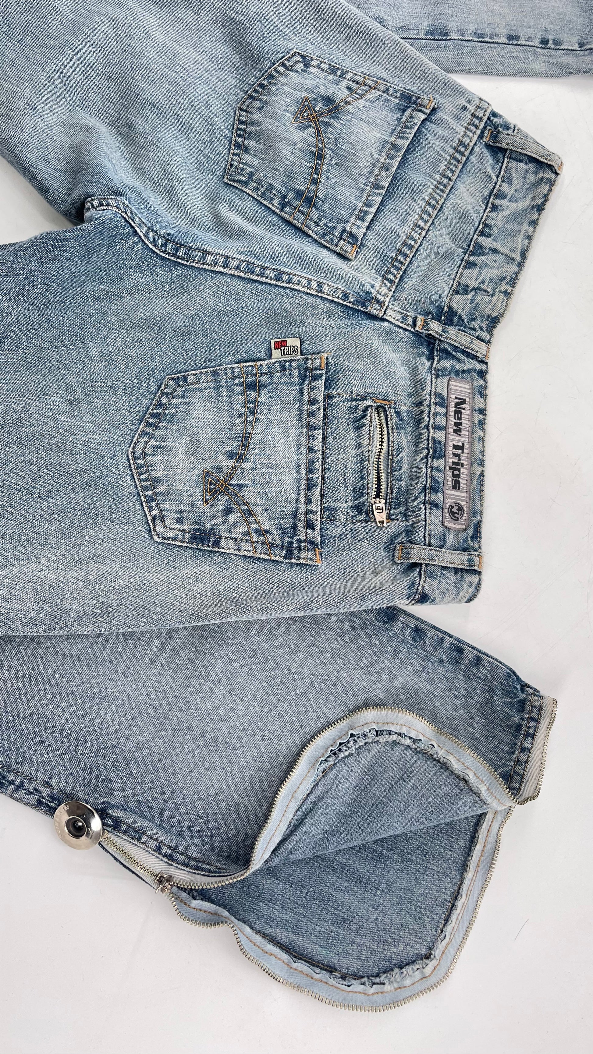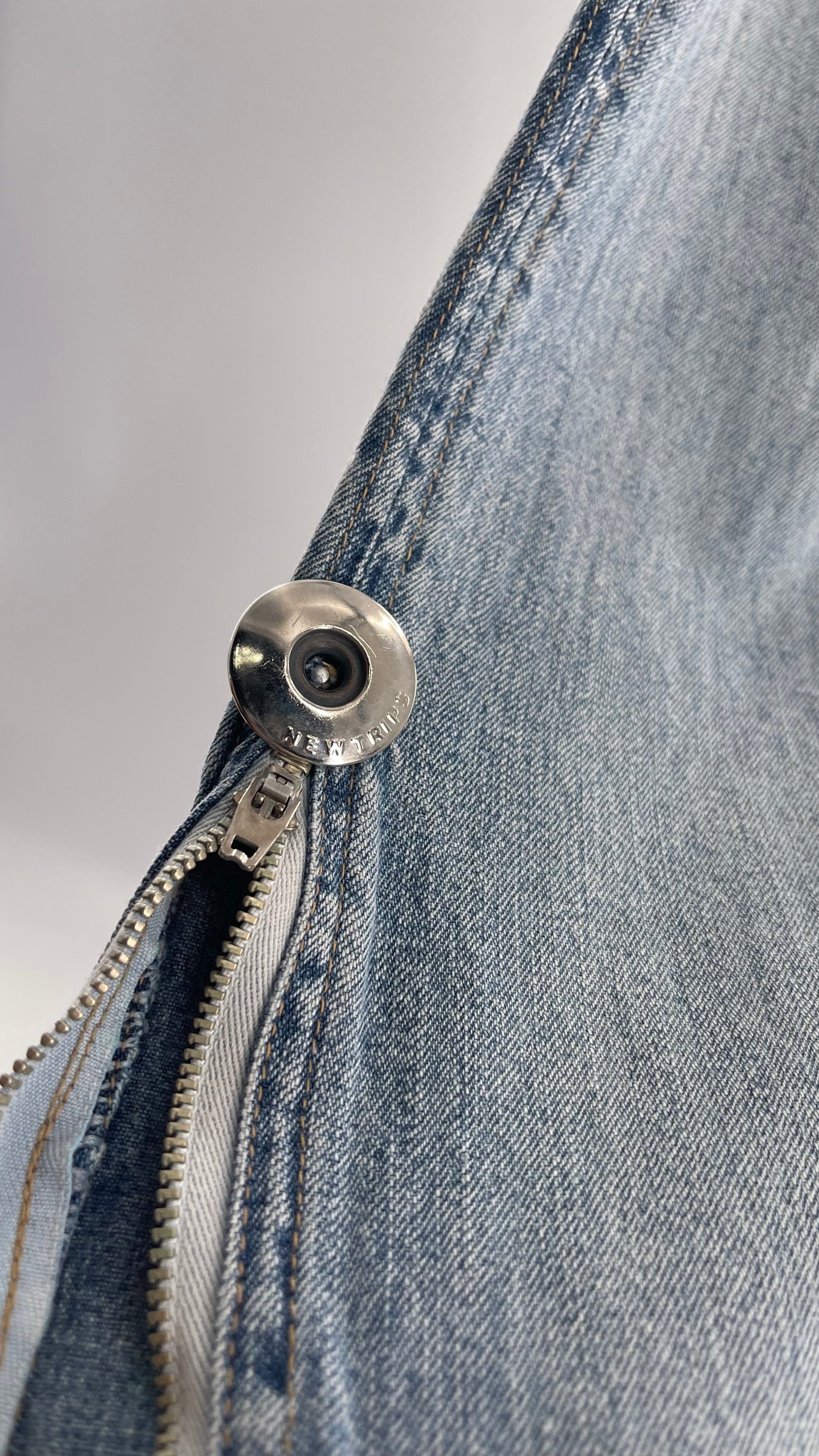 Vintage New Trips Light Wash Kick Flare Jeans with Zipper Hem Detail, V Waistline and Oversized Metal Buttons (40)