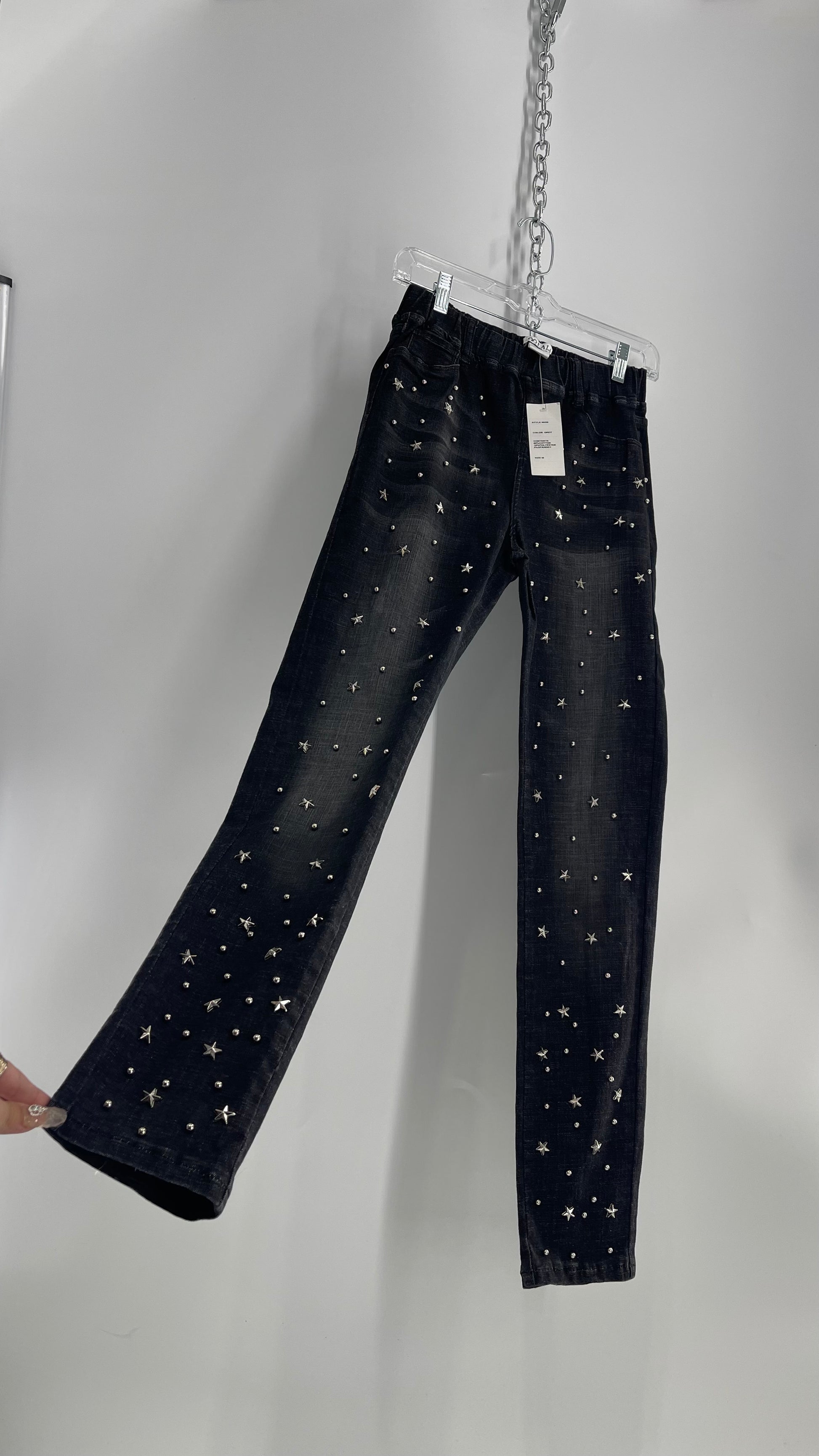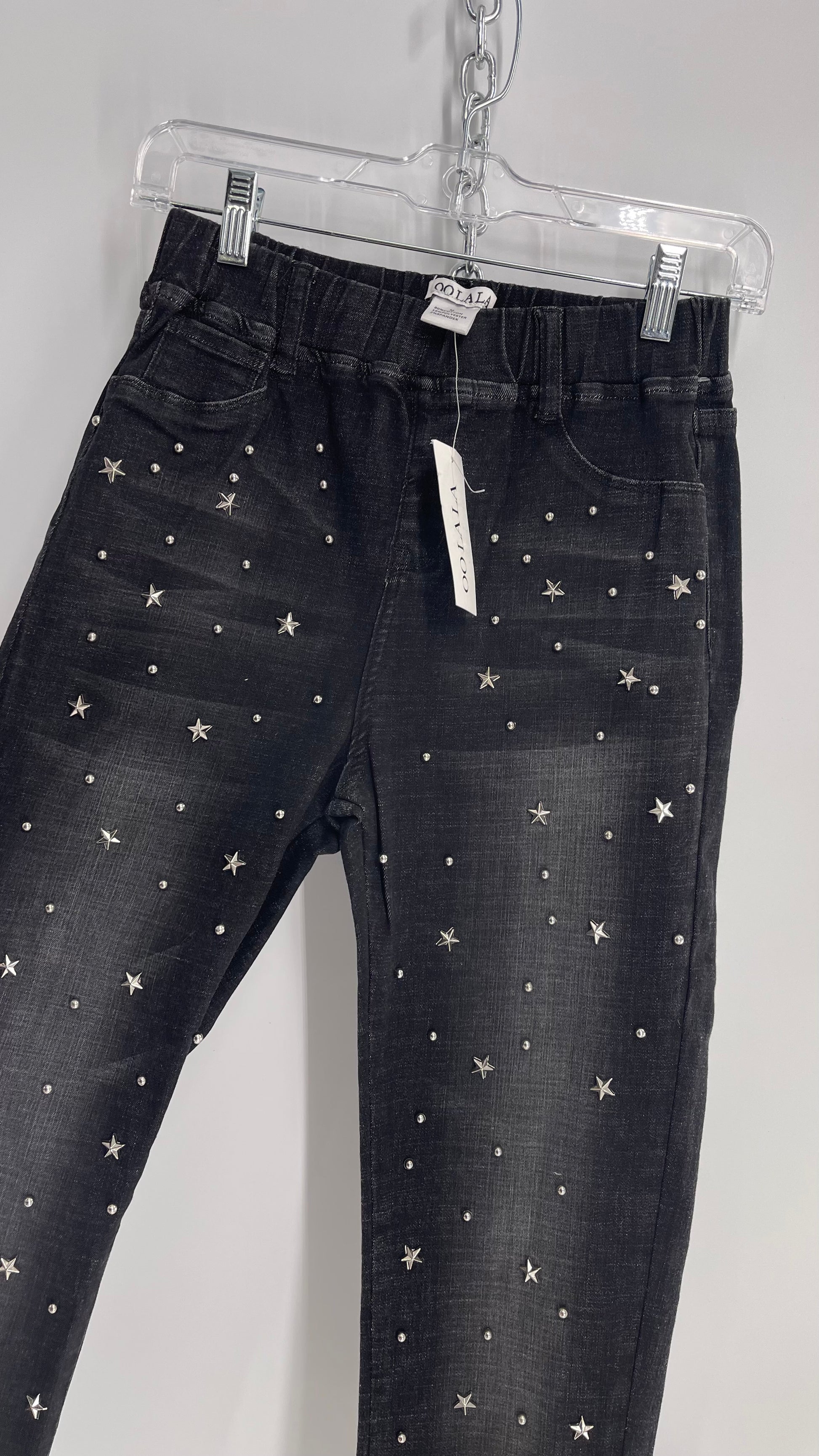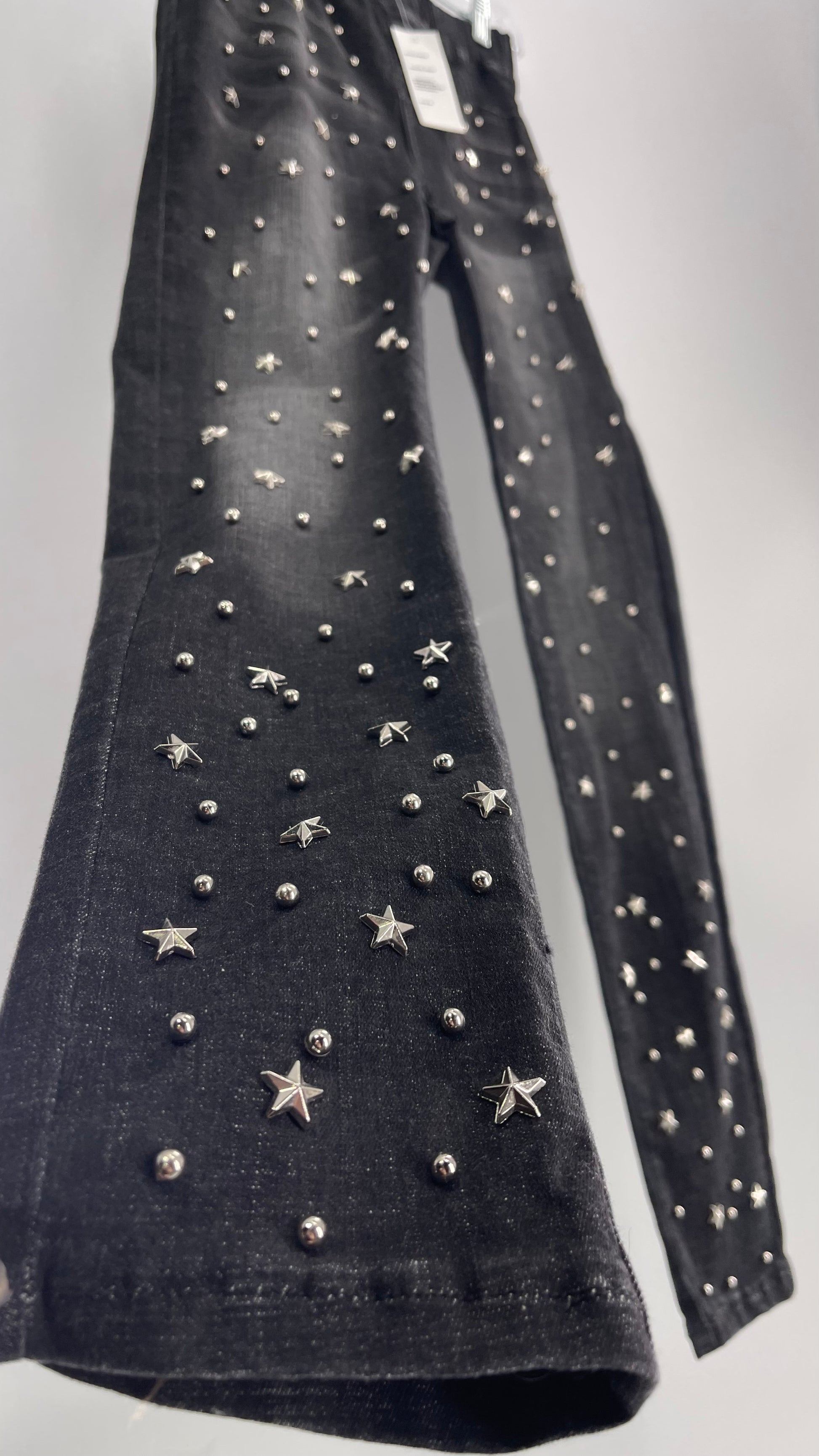 OOLALA dark grey faded denim straight legs with metal star and spherical studs, with tags attached