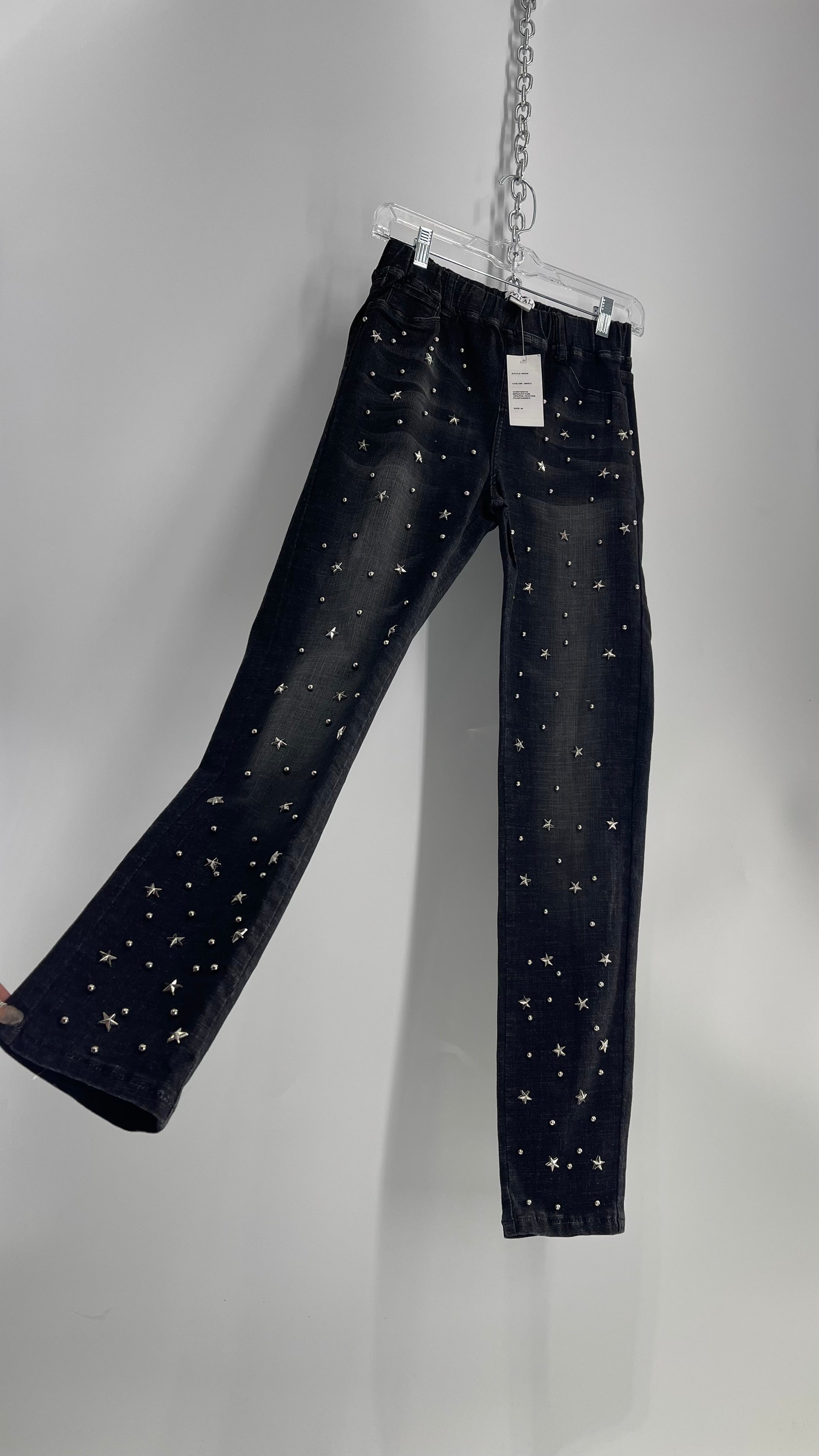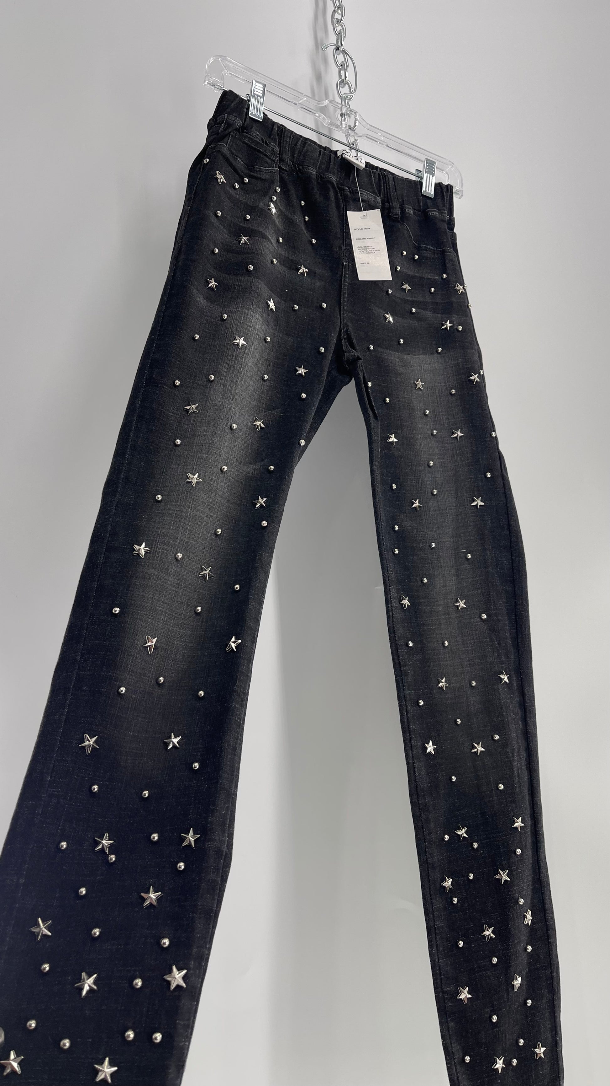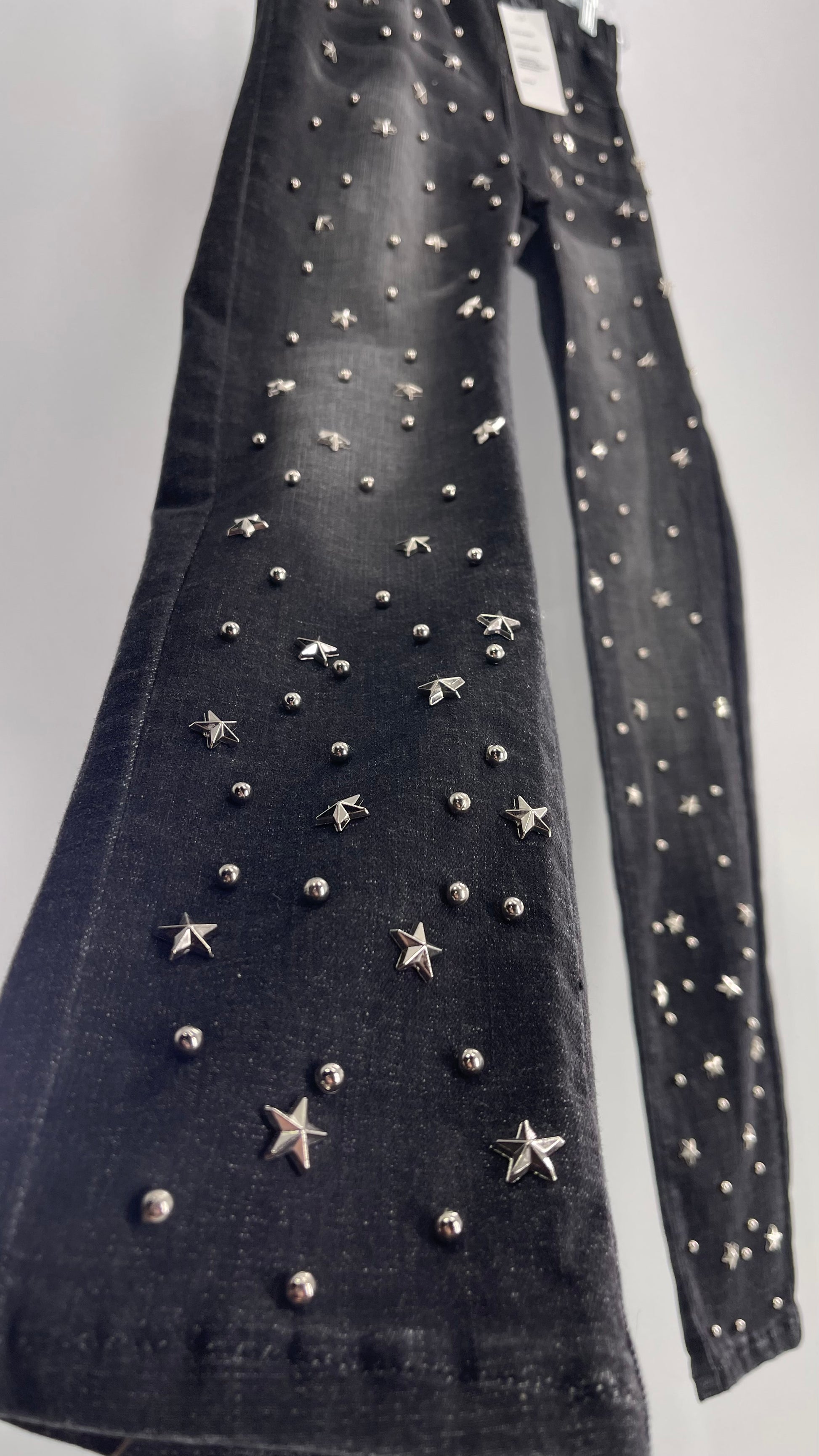 OOLALA dark grey faded denim straight legs with metal star and spherical studs, with tags attached